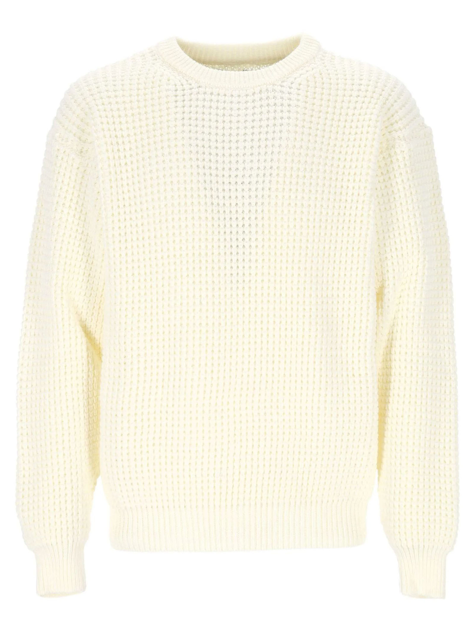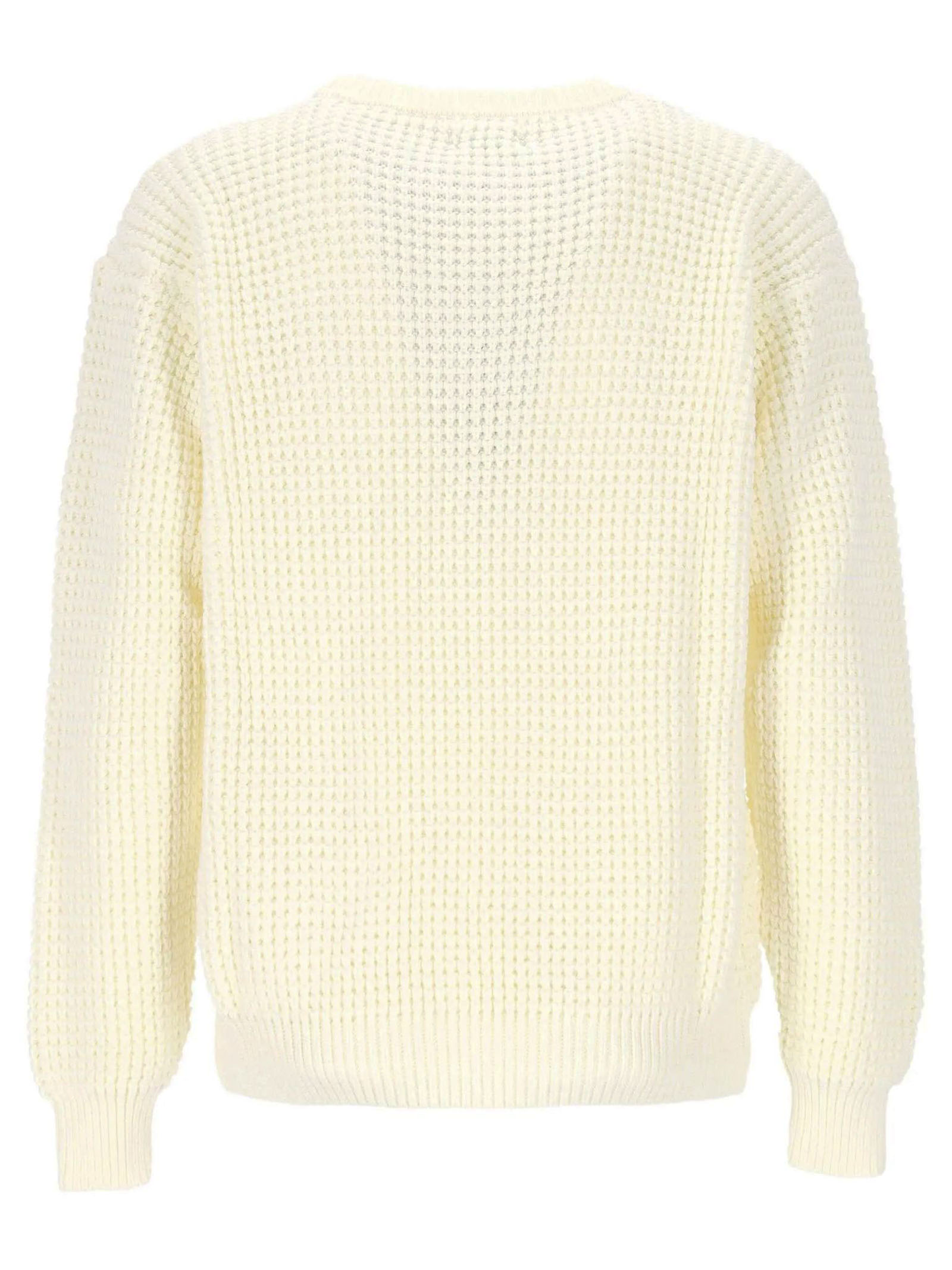 Maglione in misto cotone bianco sporco, lavorazione a nido d'ape, collo rotondo, maniche lunghe, orlo a costine, polsini a costine