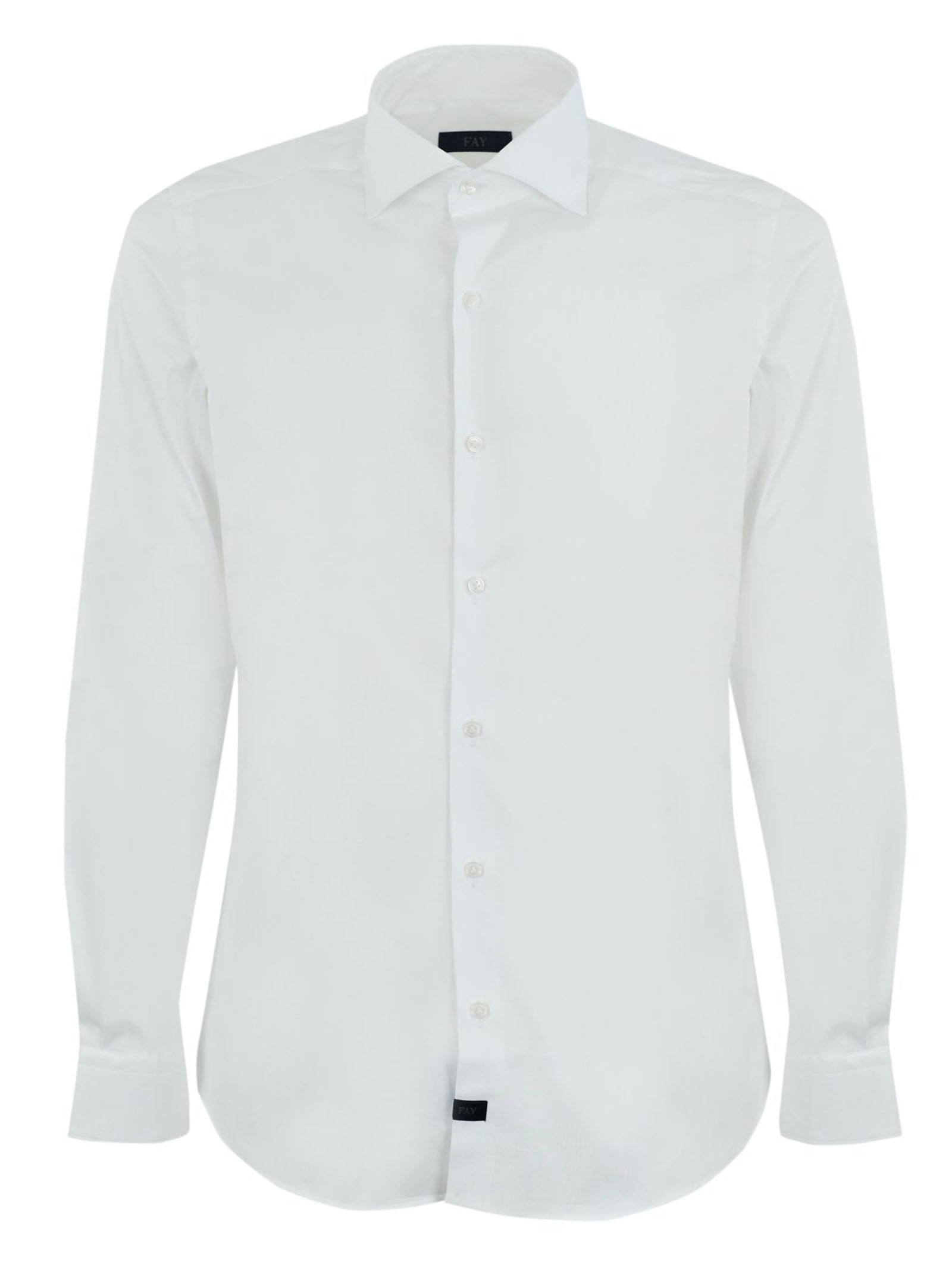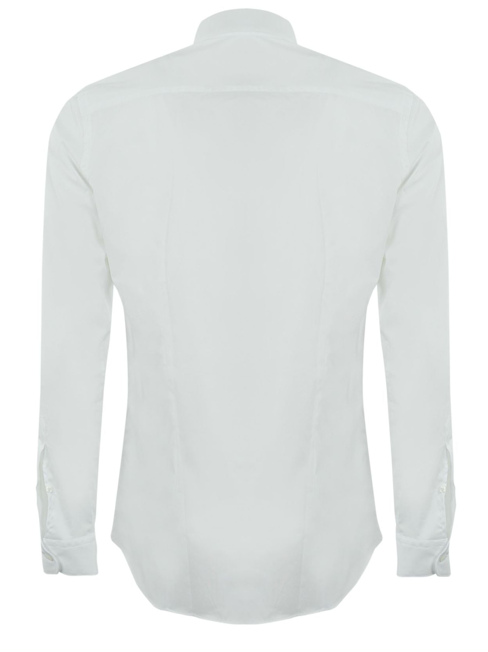 Camicia in cotone bianco con collo alla francese, chiusura con bottoni, pinces sul retro, etichetta logo sul fondo, orlo curvo, vestibilita' regolare