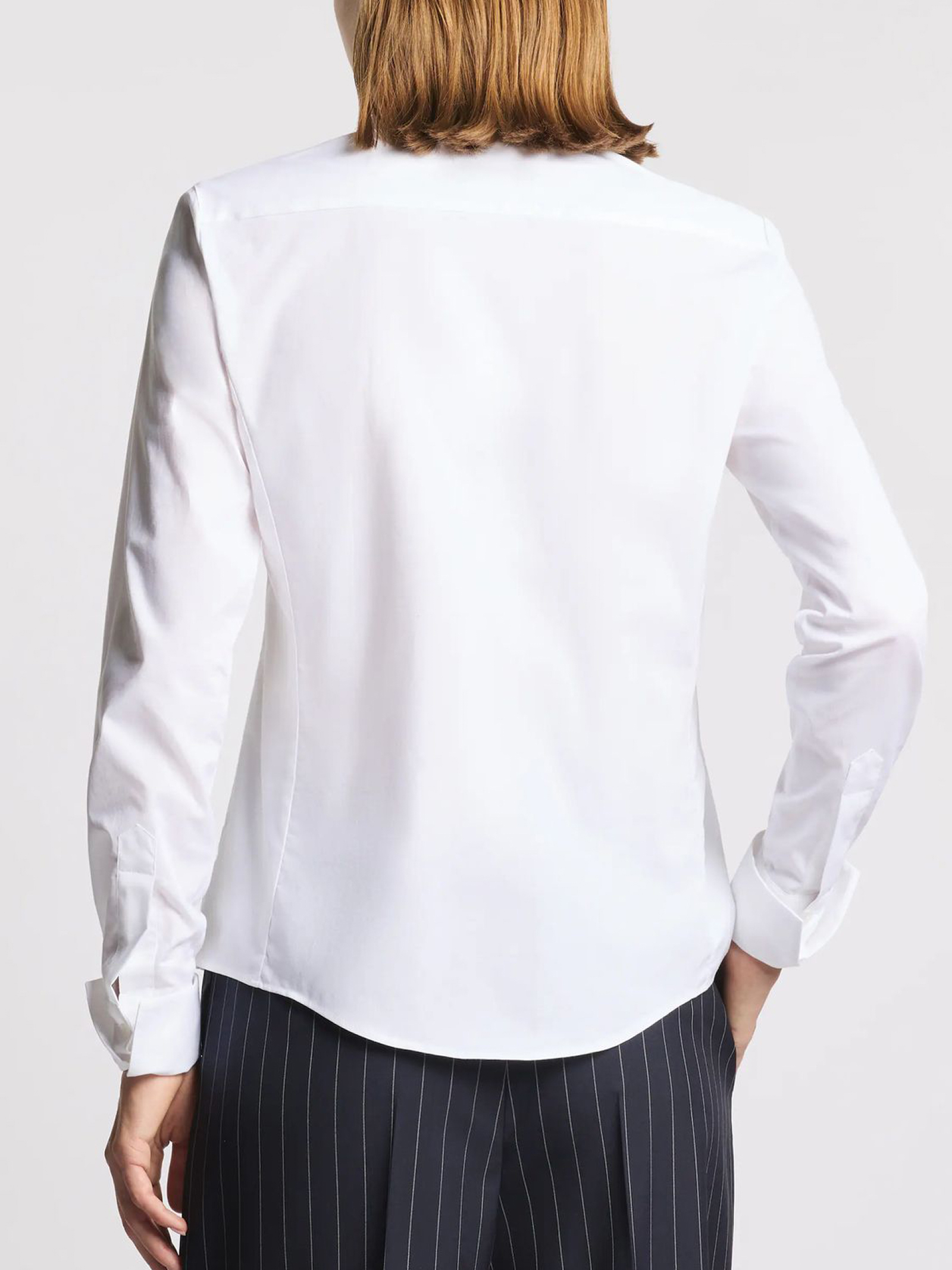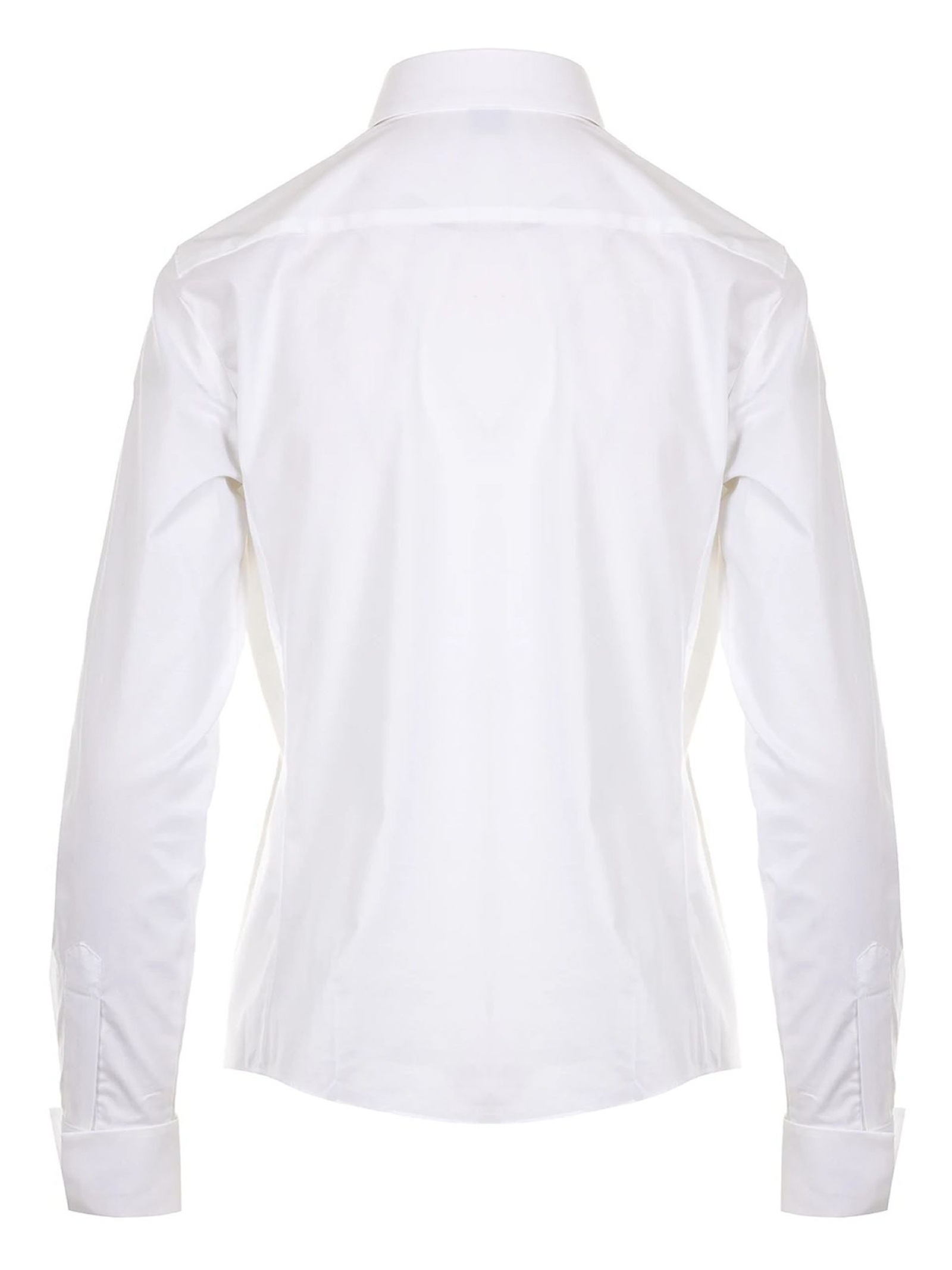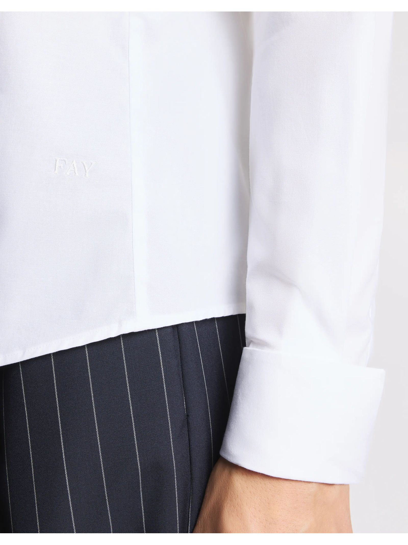 Camicia a manica lunga in popeline di cotone stretch, con allacciatura nascosta. Dotata di polsini risvoltabili e un fondo arrotondato, è arricchita dal ricamo Fay sul fondo