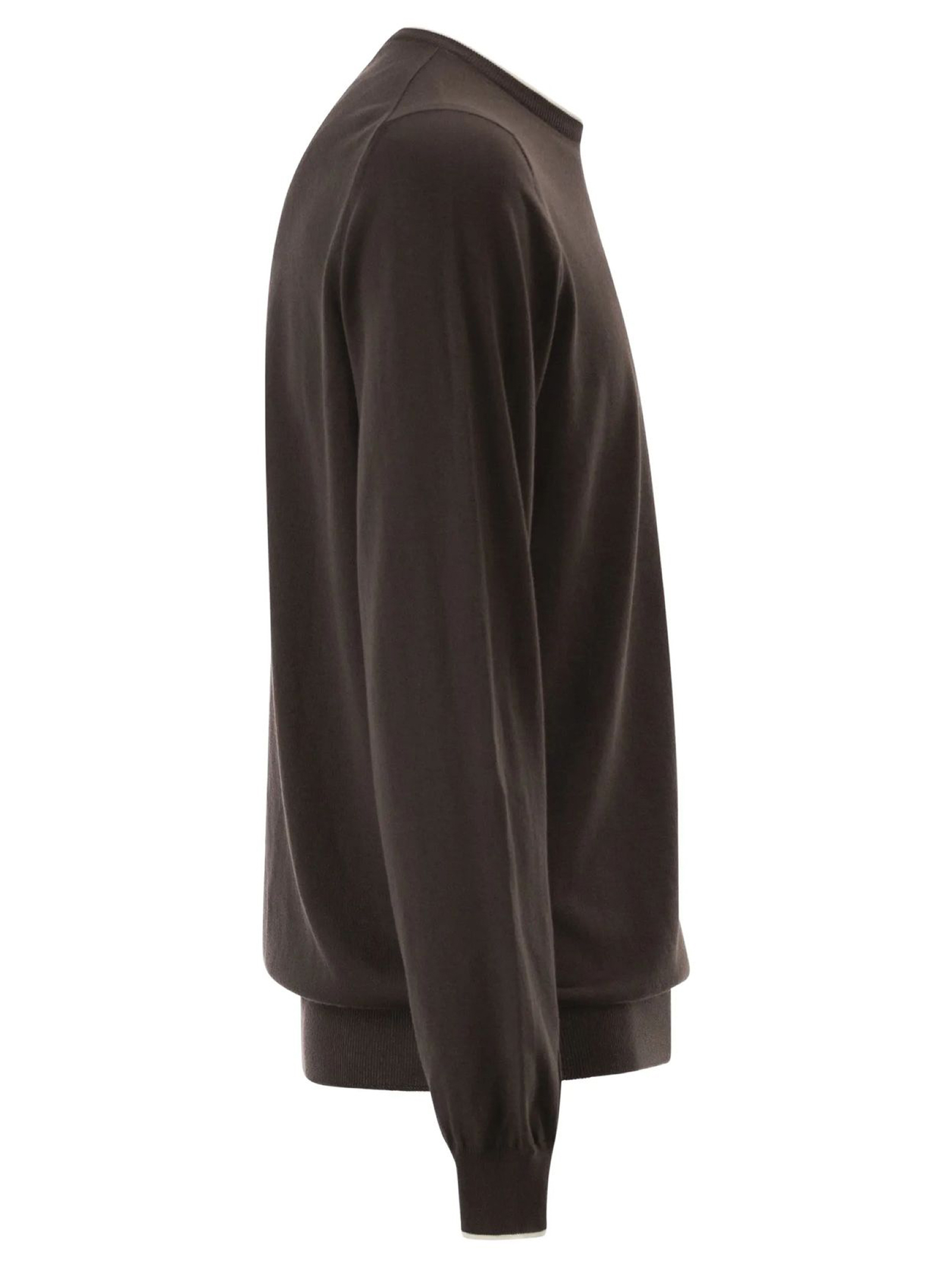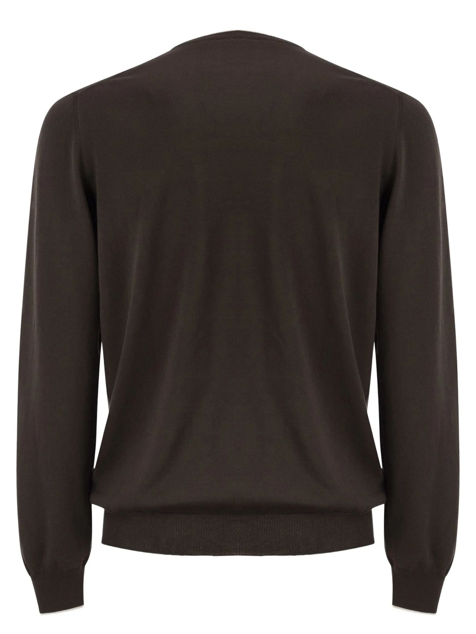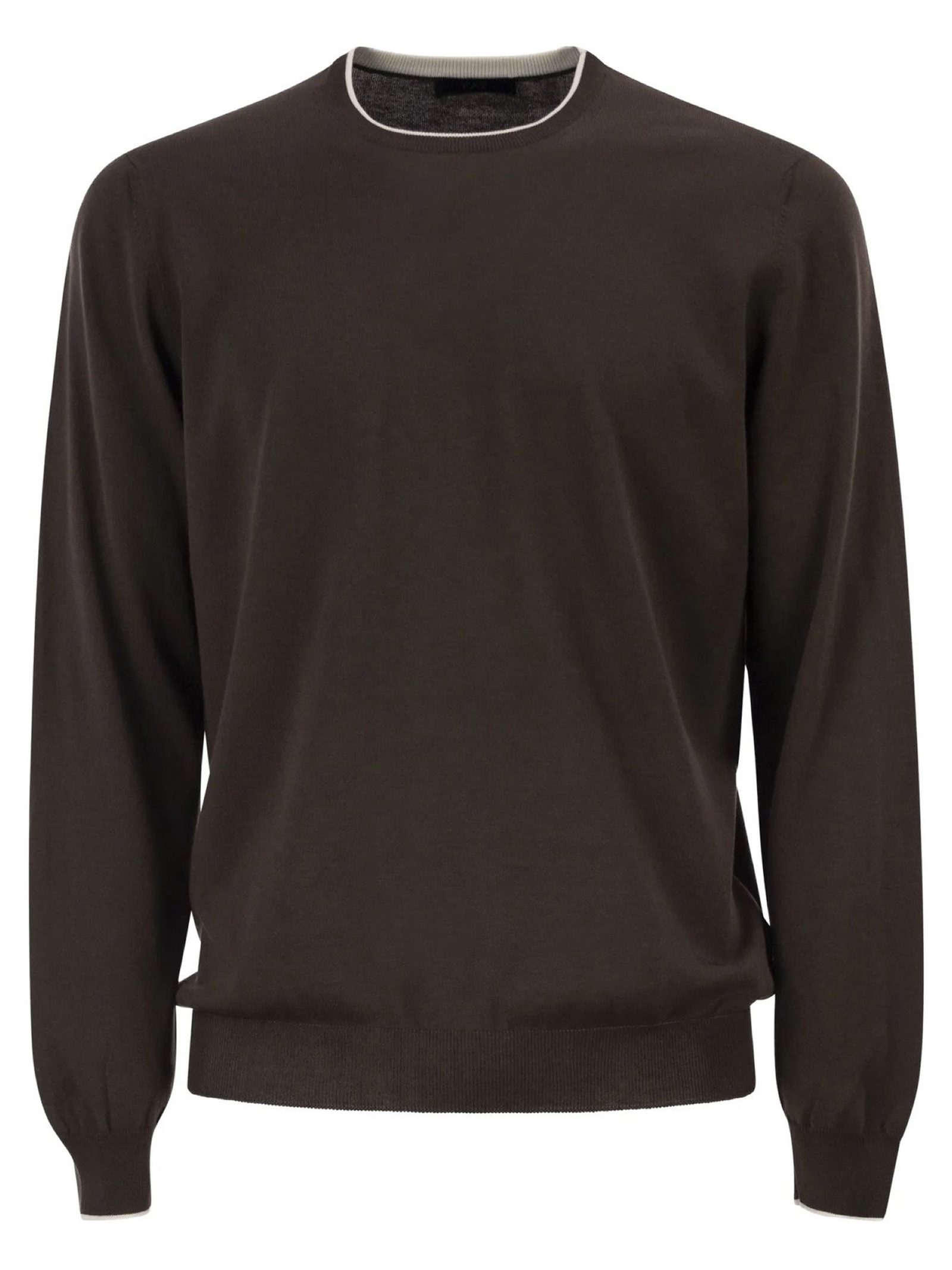 Pull girocollo in maglia rasata di cotone marrone, con profilo del collo e polsi a contrasto. Arricchito dal logo Fay ricamato sul fondo, è un evergreen casual dal gusto sobrio e raffinato