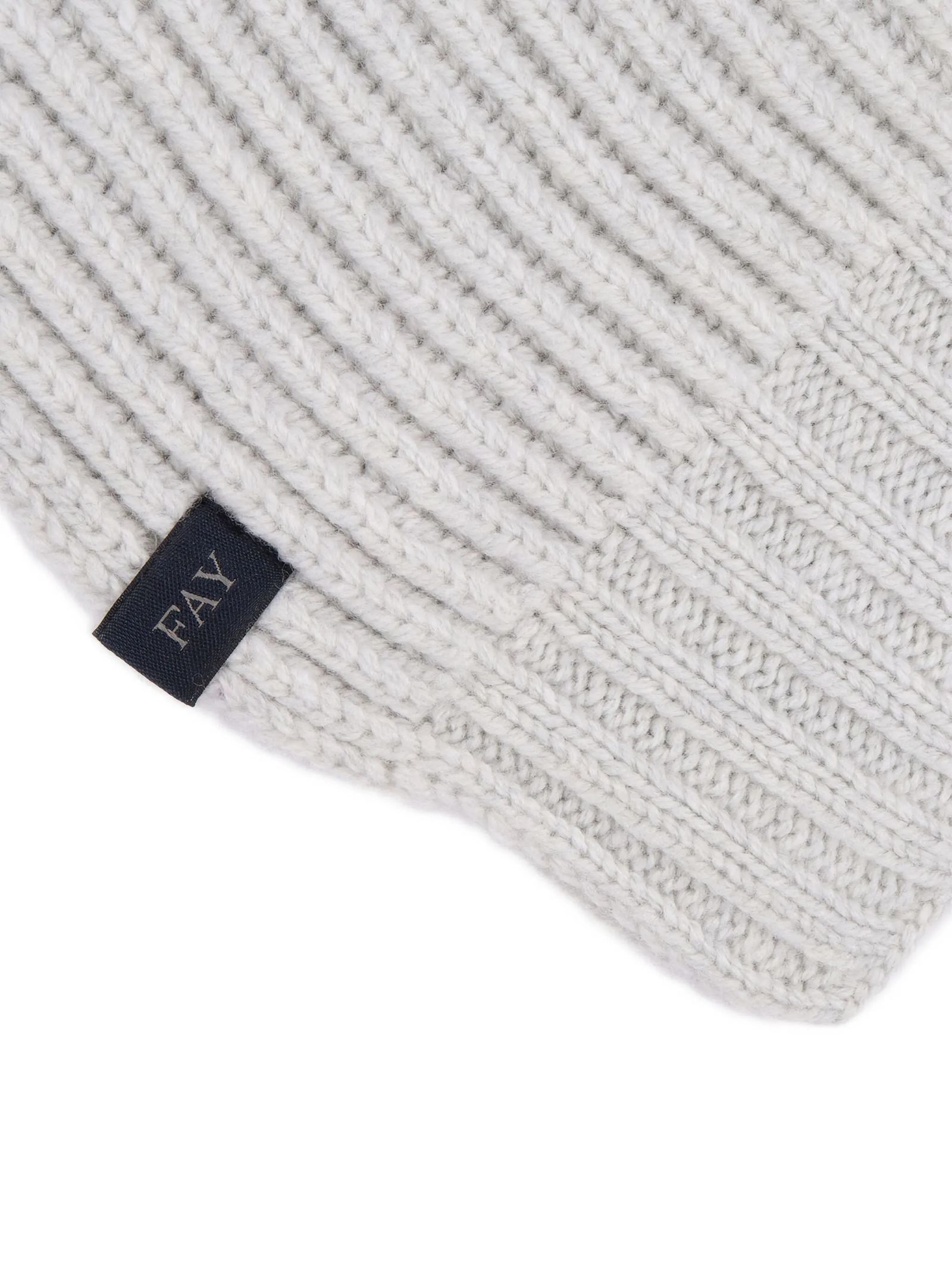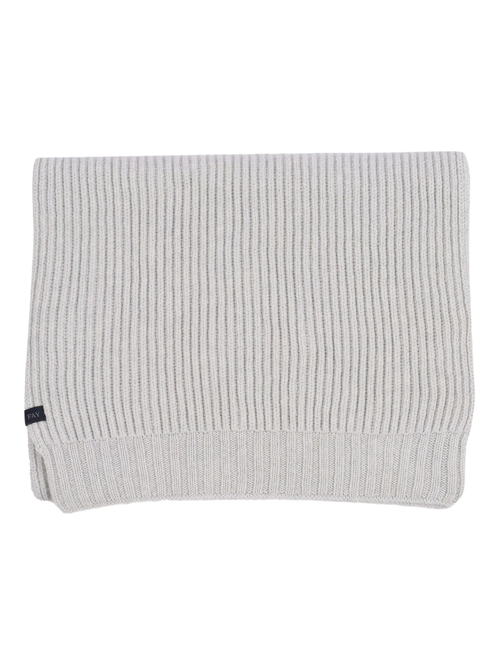 Sciarpa in lana a coste grigio, lavorazione in maglia a coste, etichetta del brand, forma rettangolare