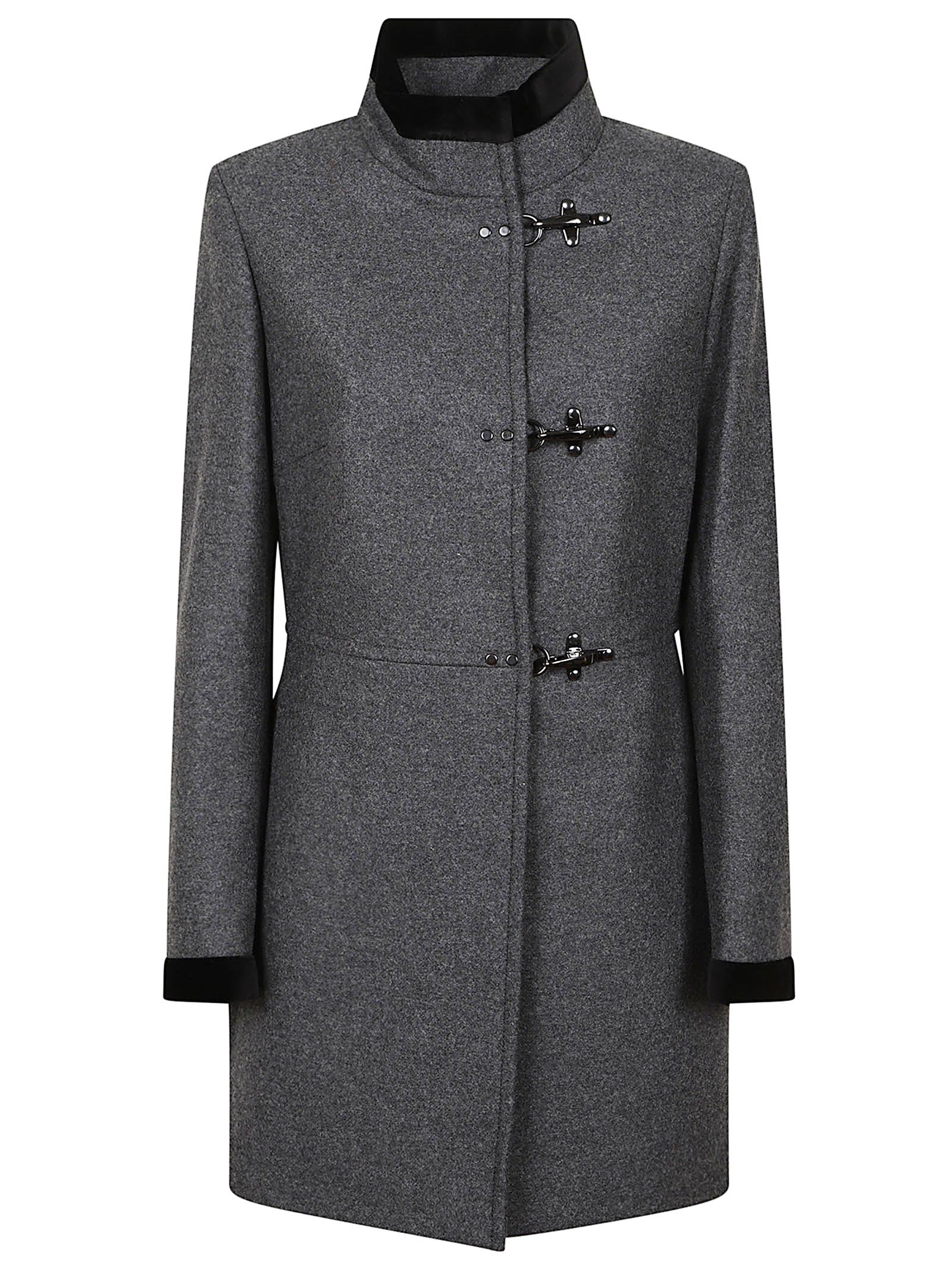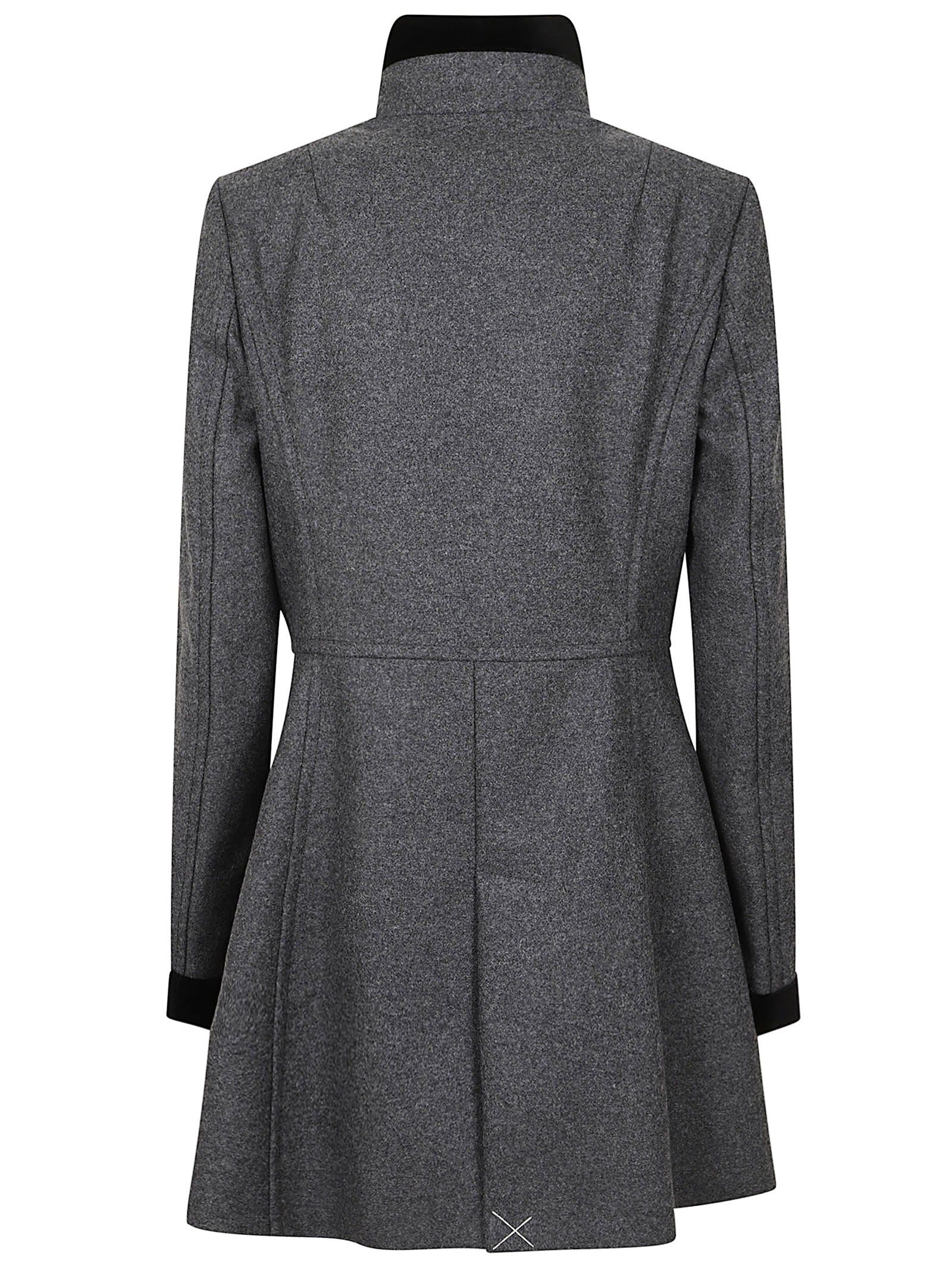Virginia Coat in Panno di Lana Grigio caratterizzato dalla cucitura che evidenzia il punto vita, dotato di un ampio collo avvolgente e morbidi profili in velluto, è impreziosito da una chiusura a tre ganci. Realizzato in morbido panno mélange misto lana, con tasche a filo, presenta un'etichetta interna con il nome del capo
