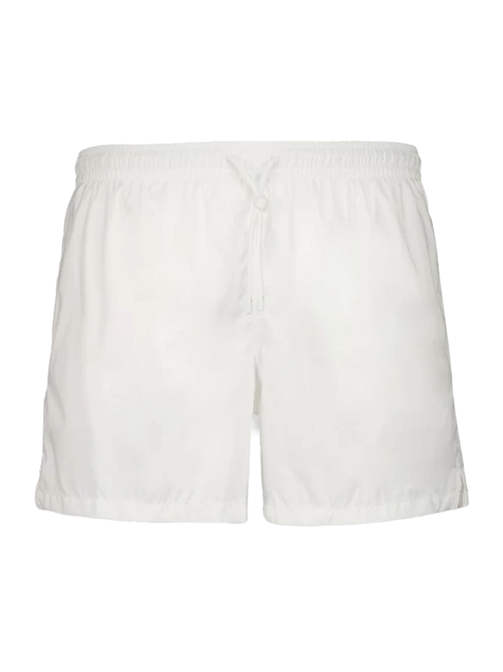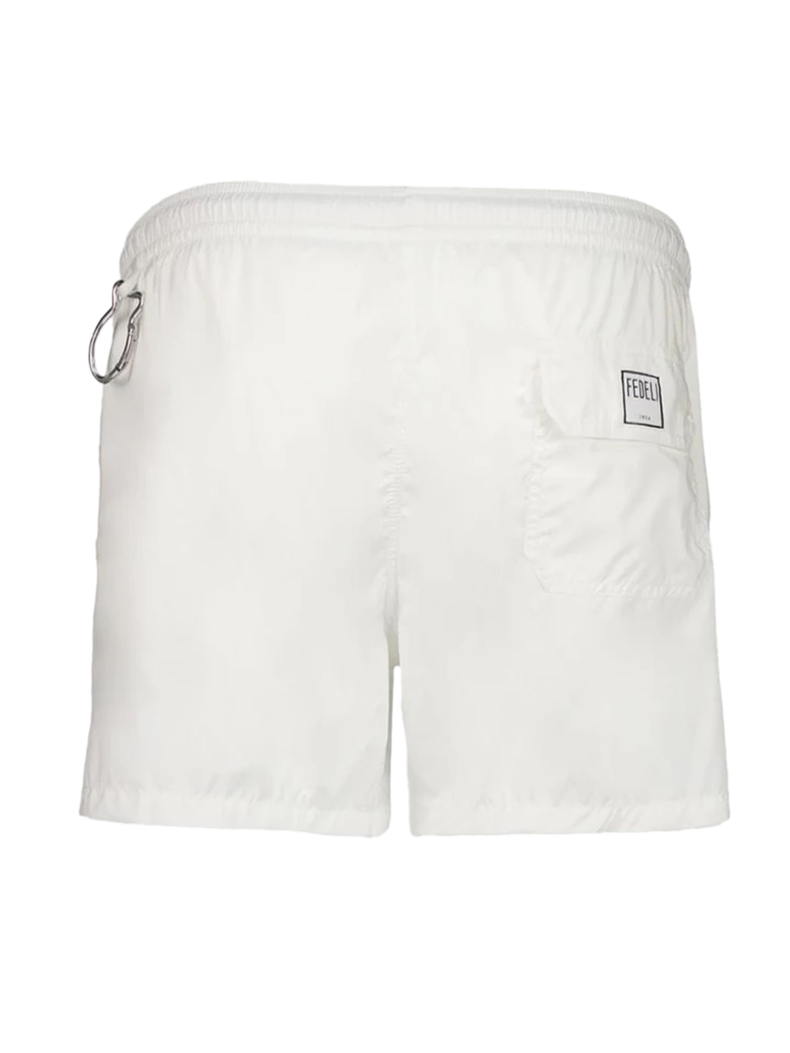 Costume da bagno Madeira bianco, poliestere leggero, cintura elastica con coulisse, cuciture a contrasto, logo del marchio ricamato sulla tasca posteriore