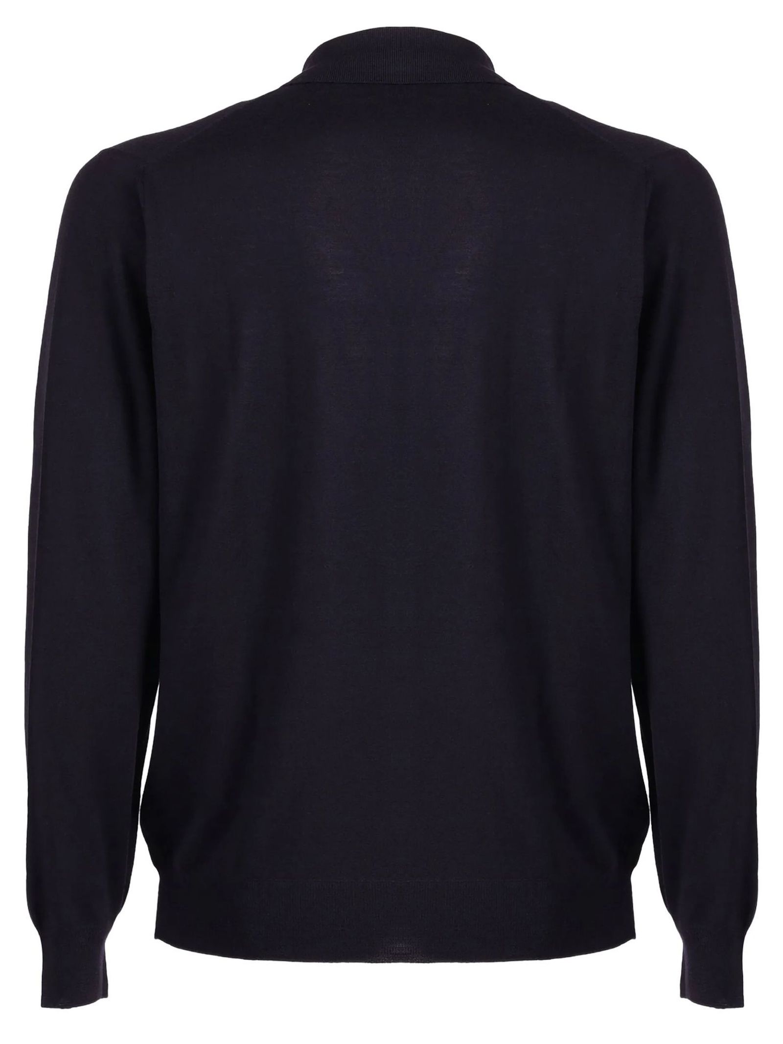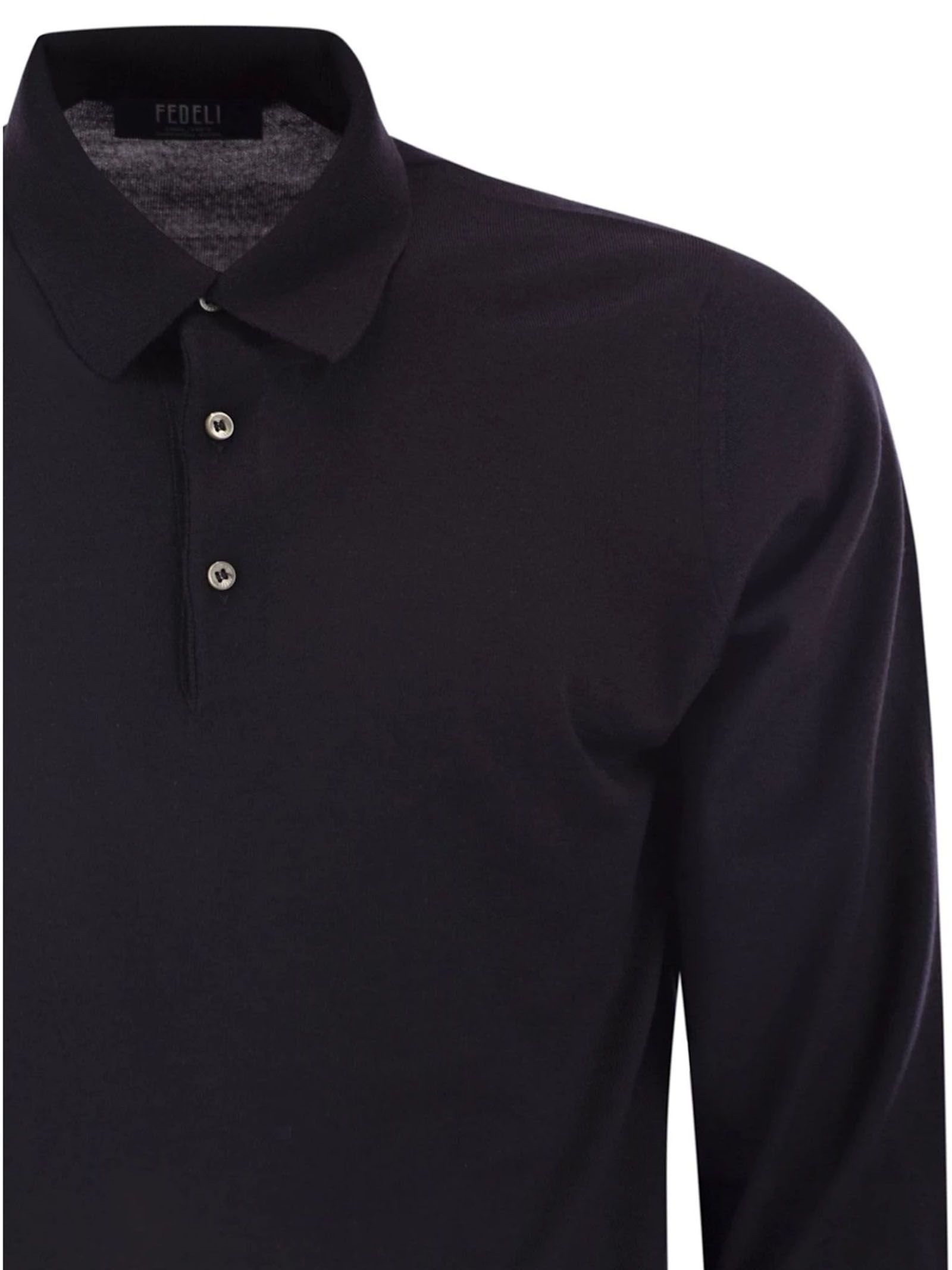 Polo in lana superfine blu scuro, colletto con chiusura bottoni, maniche lunghe, maglia rasata, 18 gauge