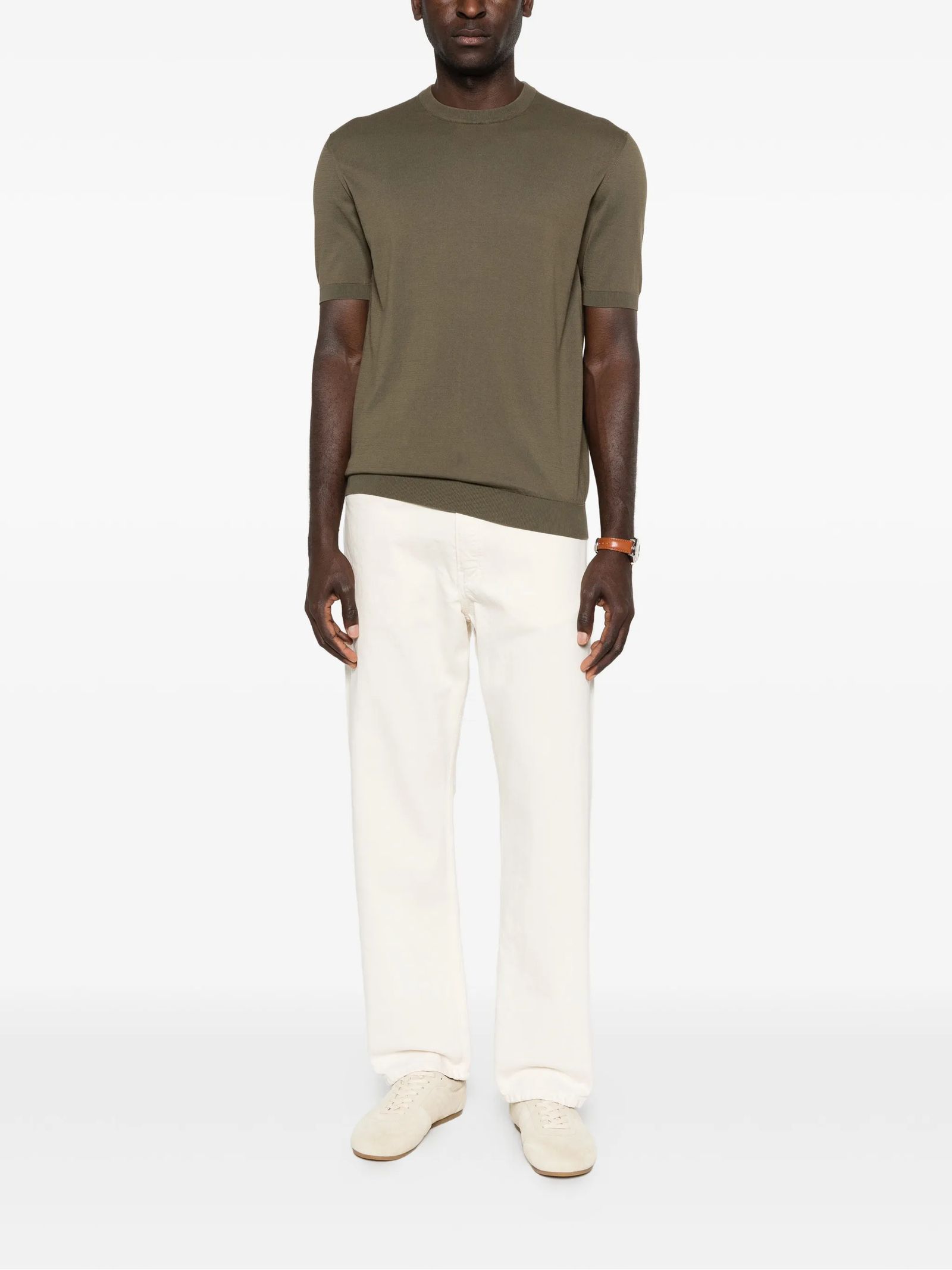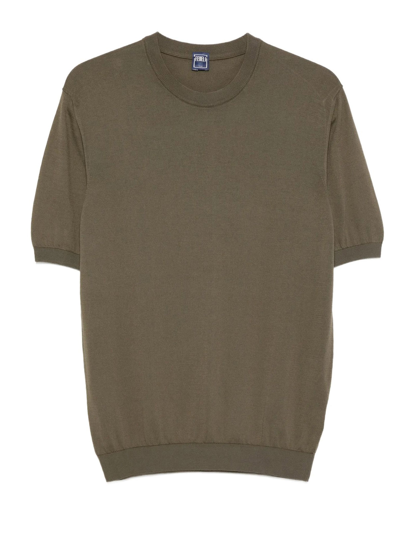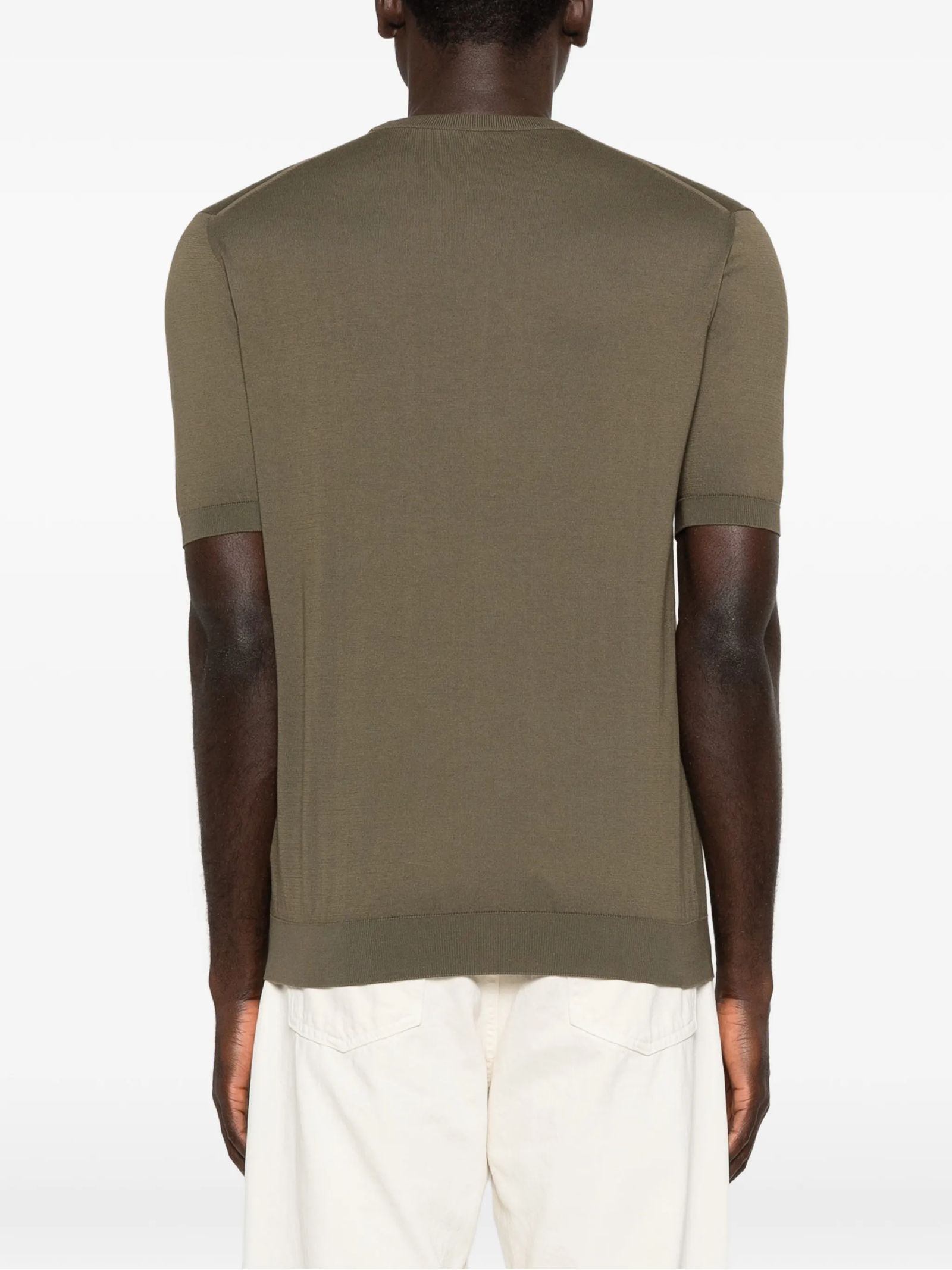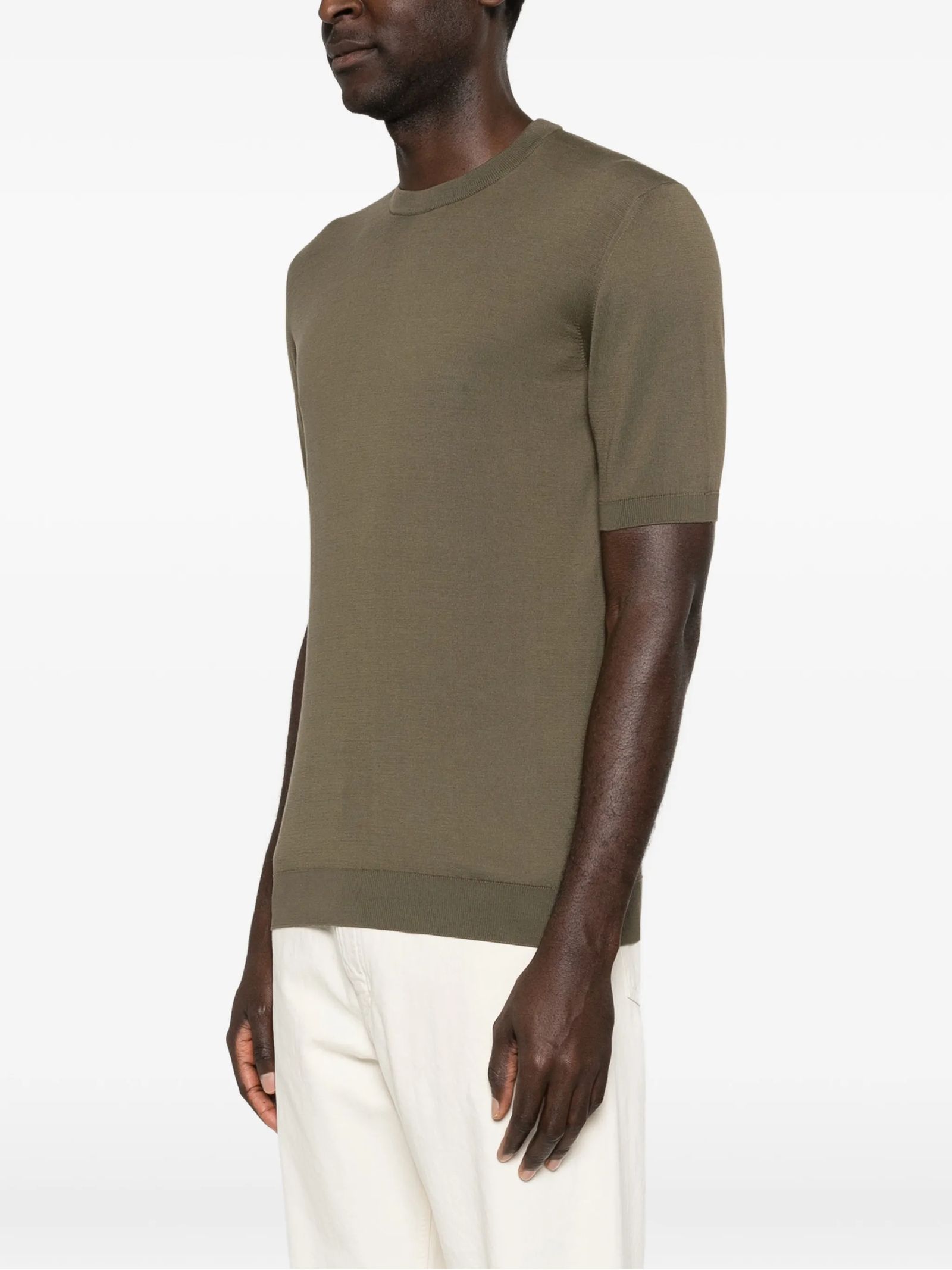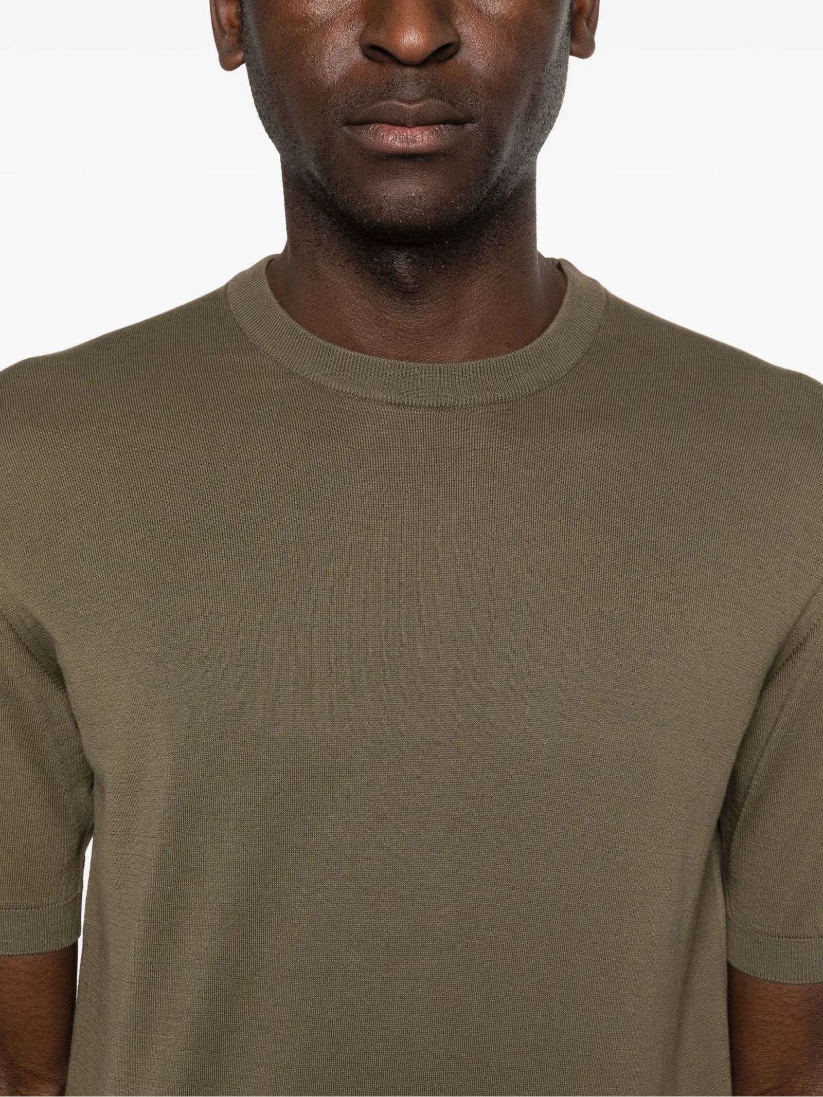T-shirt in cotone a maglia color verde oliva, con collo rotondo, maniche corte e orlo a costine