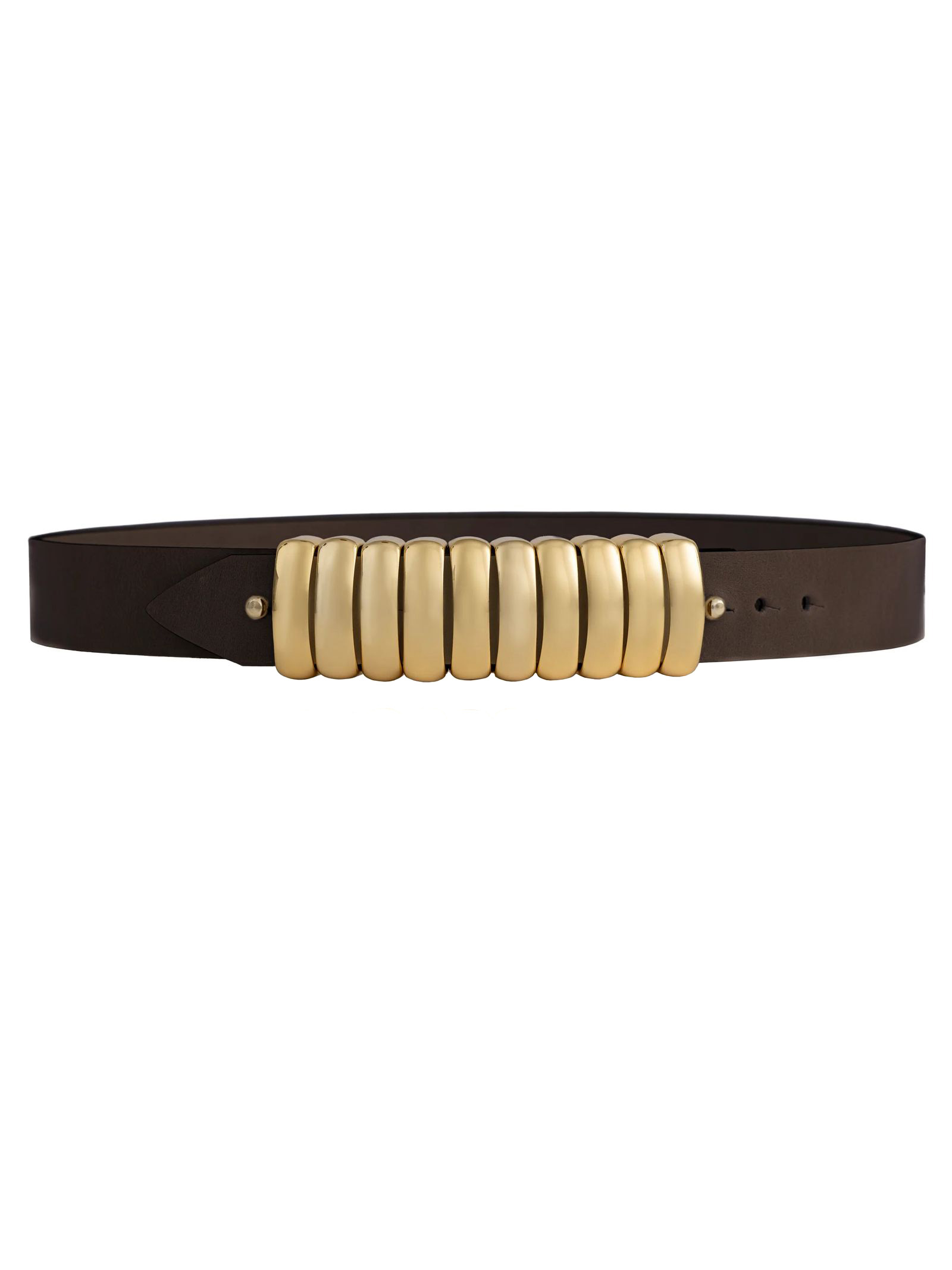 Cintura in vera pelle marrone, chiusura regolabile con anelli in metallo finitura oro, larghezza 3cm