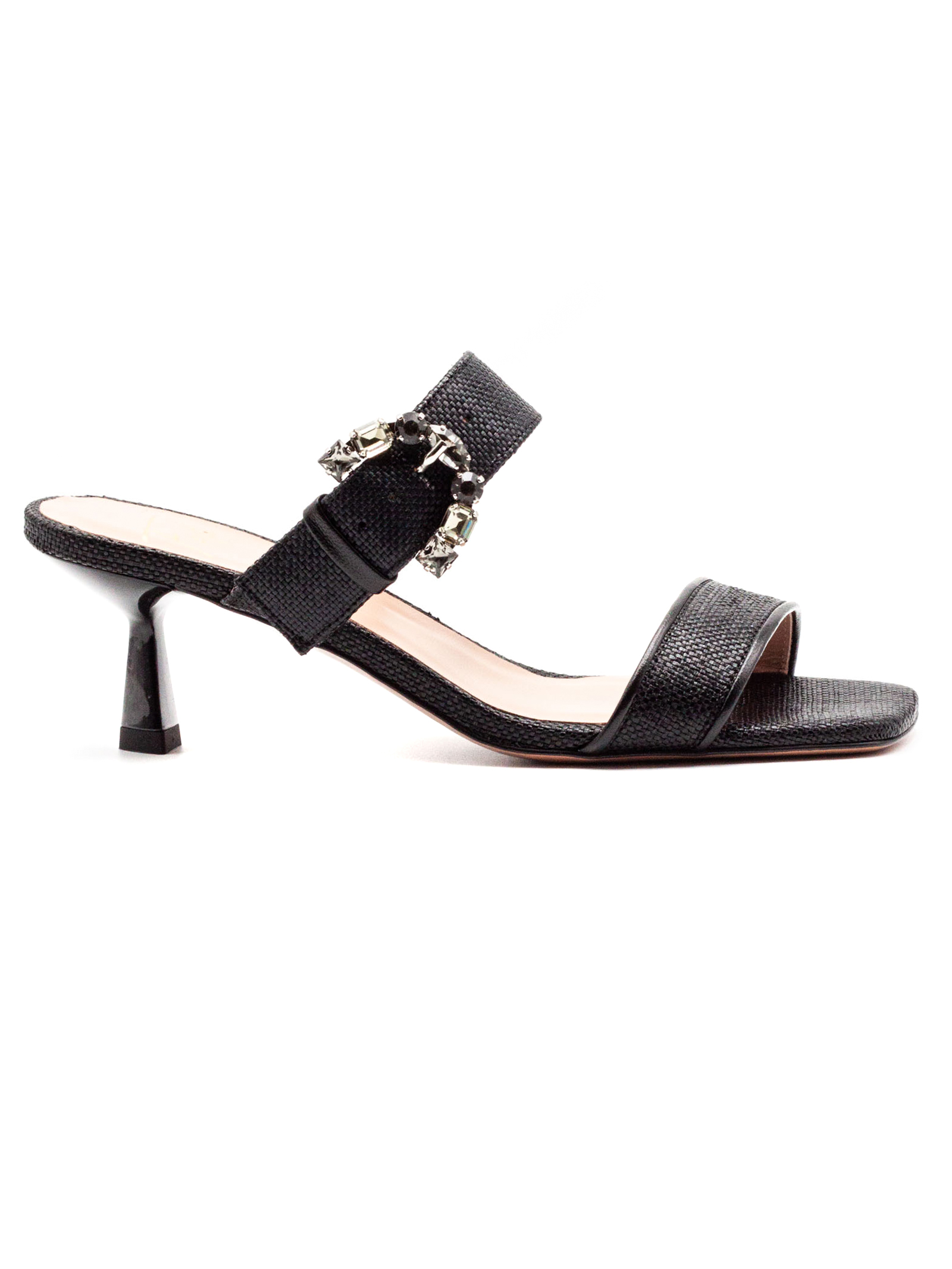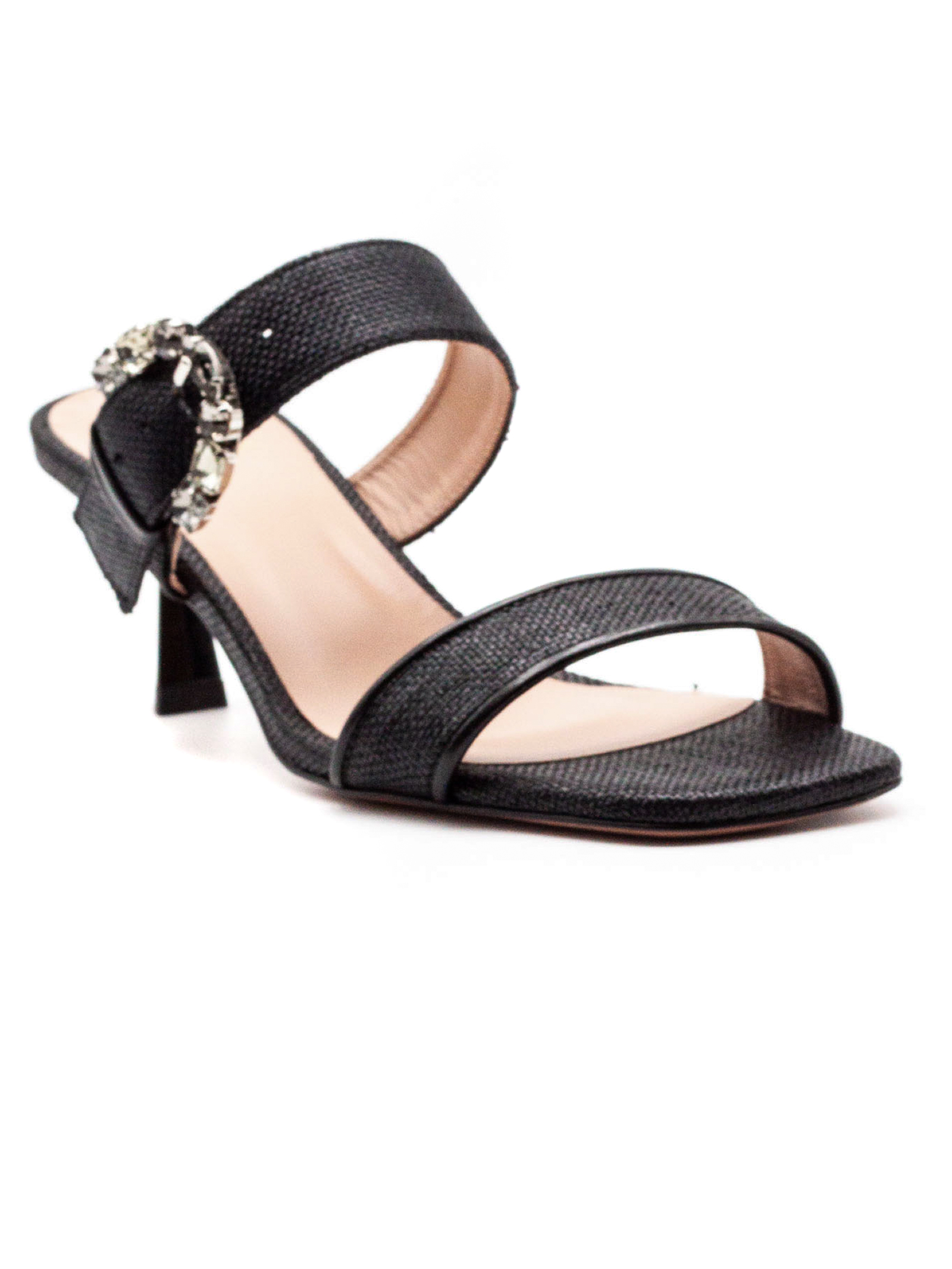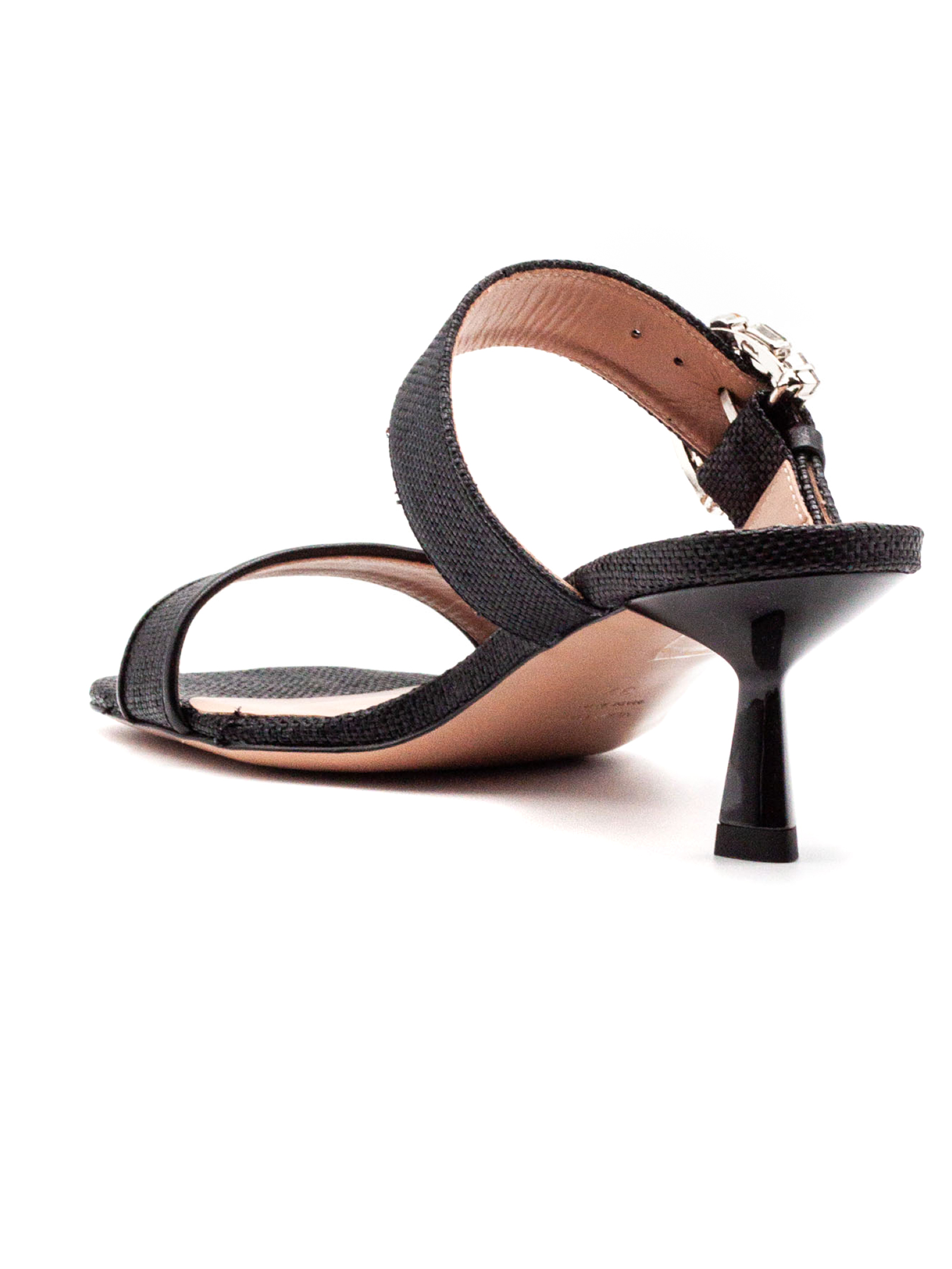 Sandalo Orienna in tessuto nero con dettaglio fibbia gioiello, punta aperta, dettagli in pelle color platino, suola in cuoio con logo, altezza tacco 4 cm