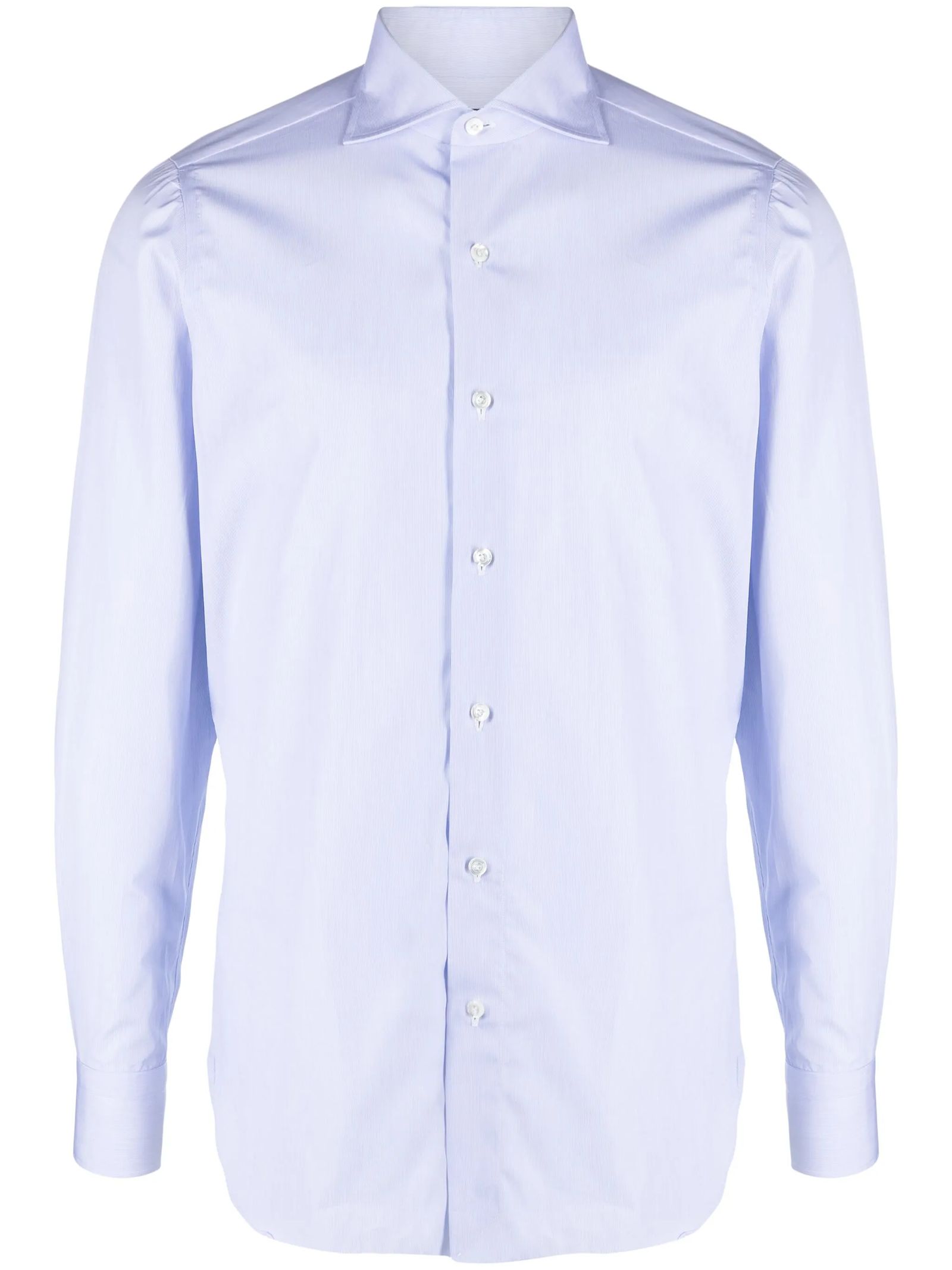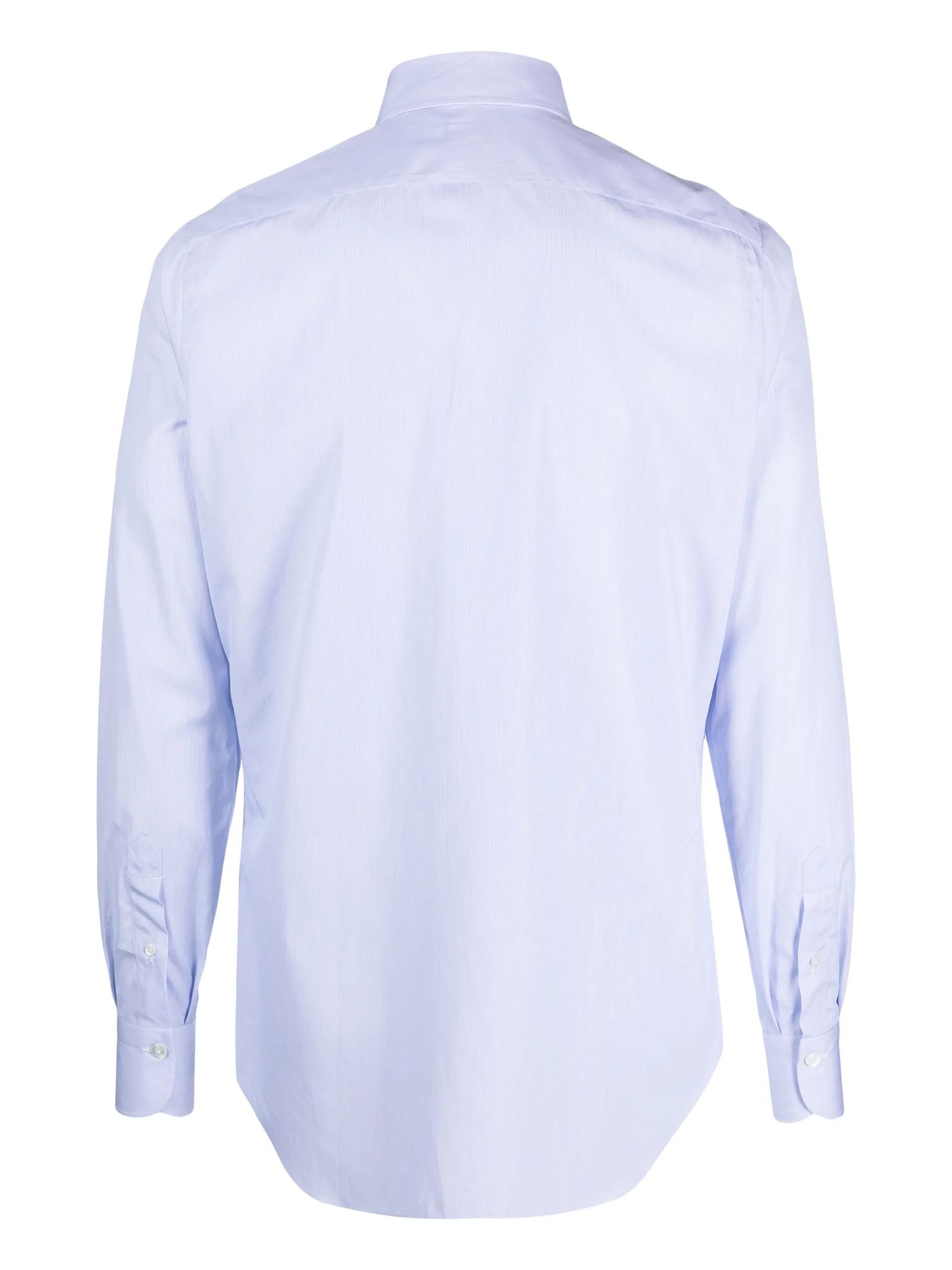 Camicia in cotone blu e bianco con mini righe, chiusura frontale con bottoni, colletto classico, maniche lunghe e orlo curvo