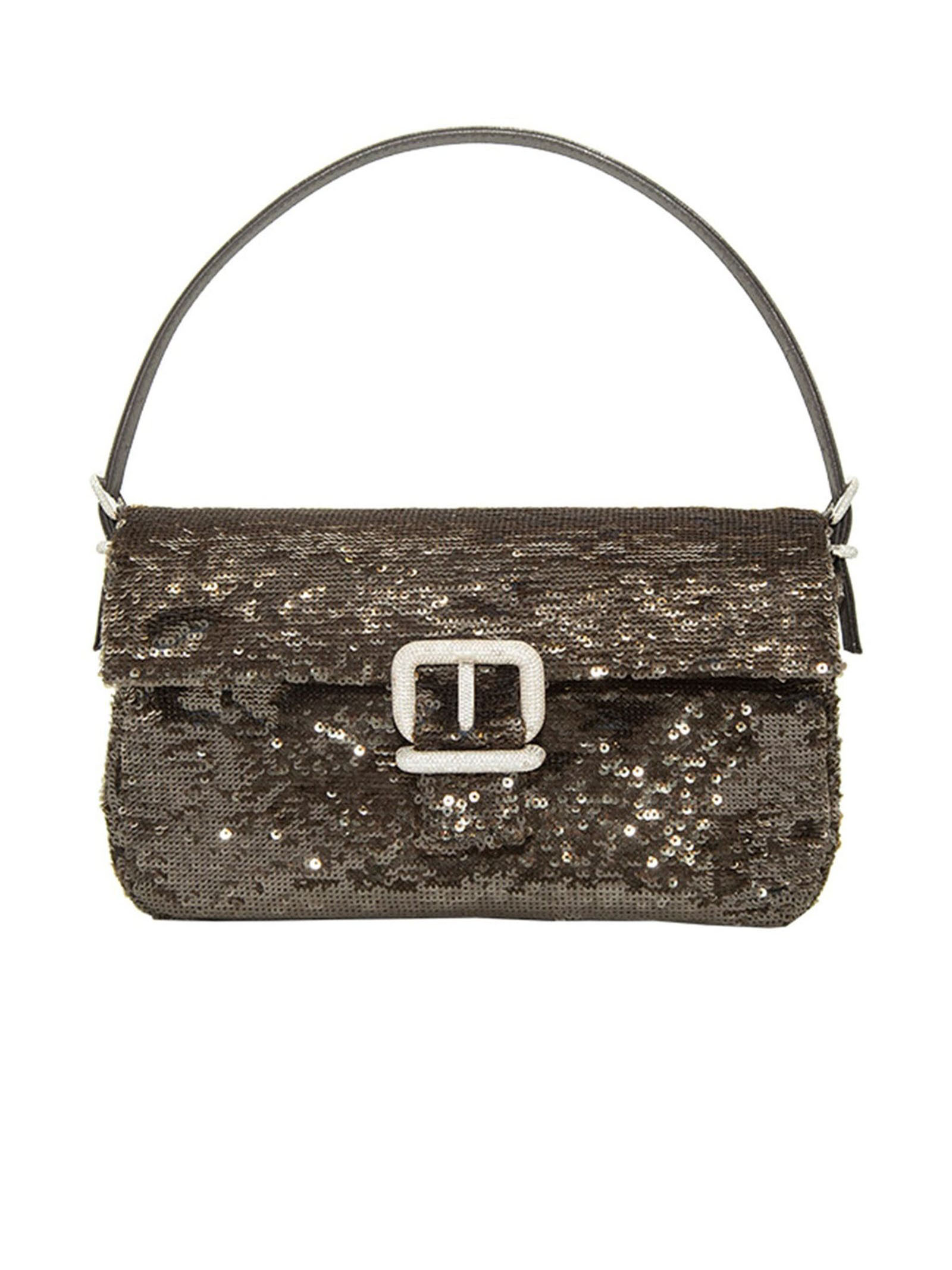 Borsa tote Habibi grigio, decorazione con paillettes, tracolla regolabile, pattina nella parte superiore, dettaglio con fibbia decorativa, chiusura magnetica, scomparto unico, placca interna con logo, tasca interna con zip, profondità 6 cm, larghezza 24 cm, altezza 15 cm