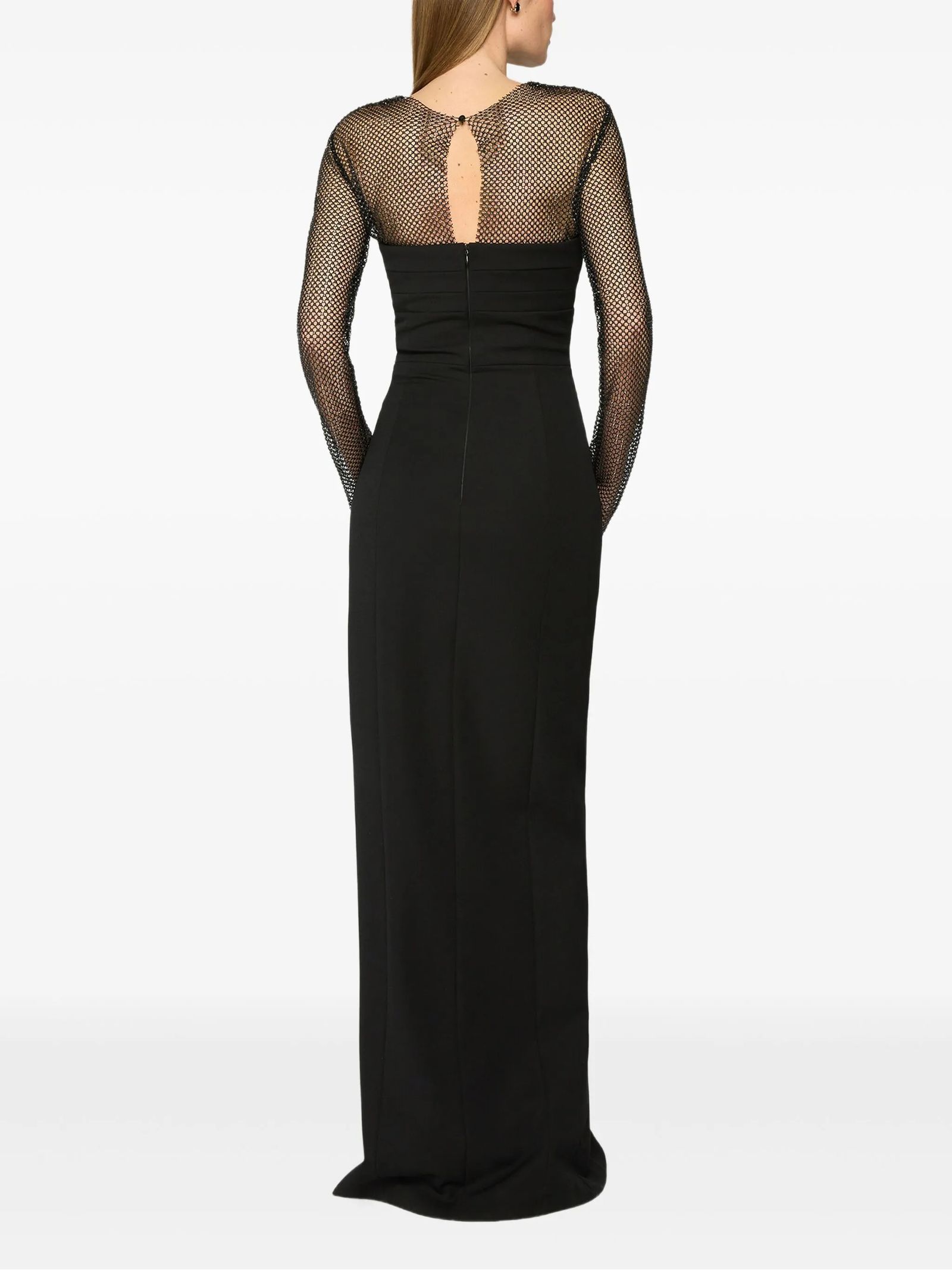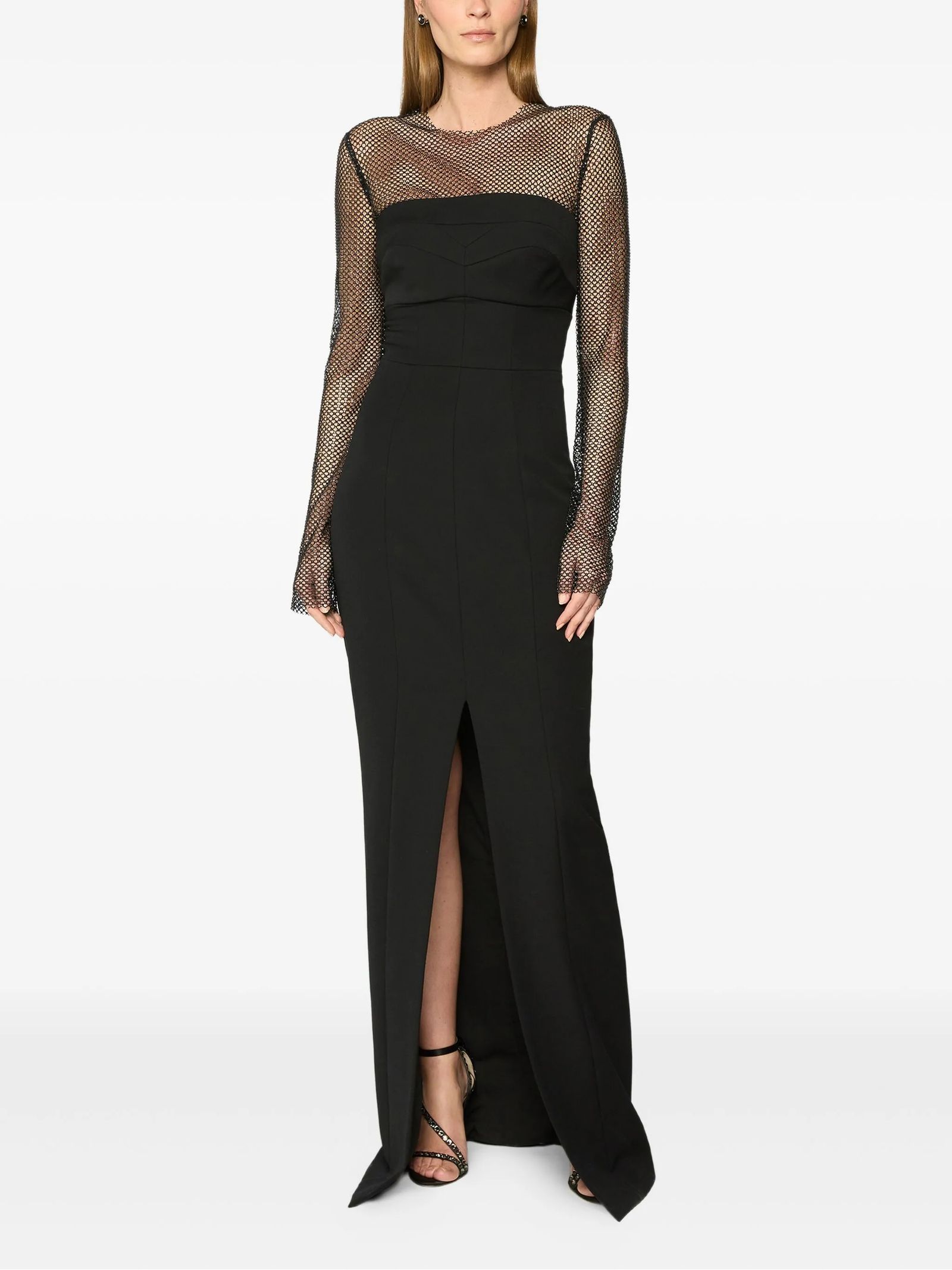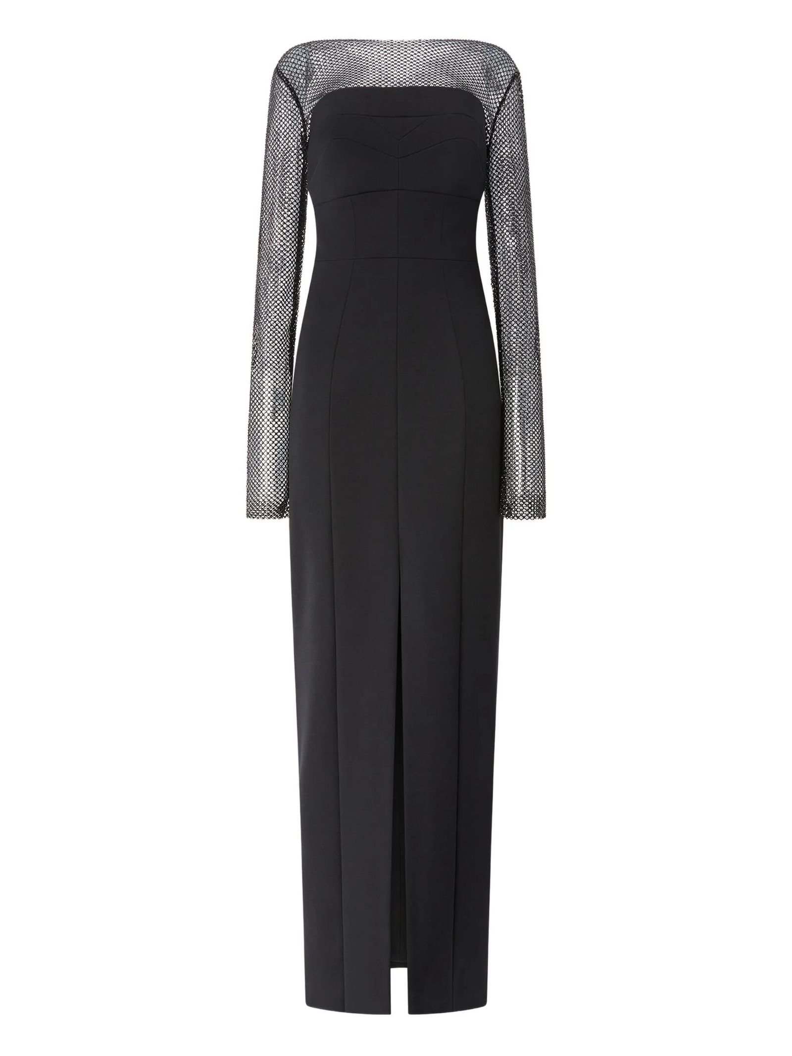 Abito lungo in cady con maniche in rete decorate in strass perle, linea aderente, top bustier che disegna maniche leggere, apertura posteriore, gonna dritta con spacco centrale
