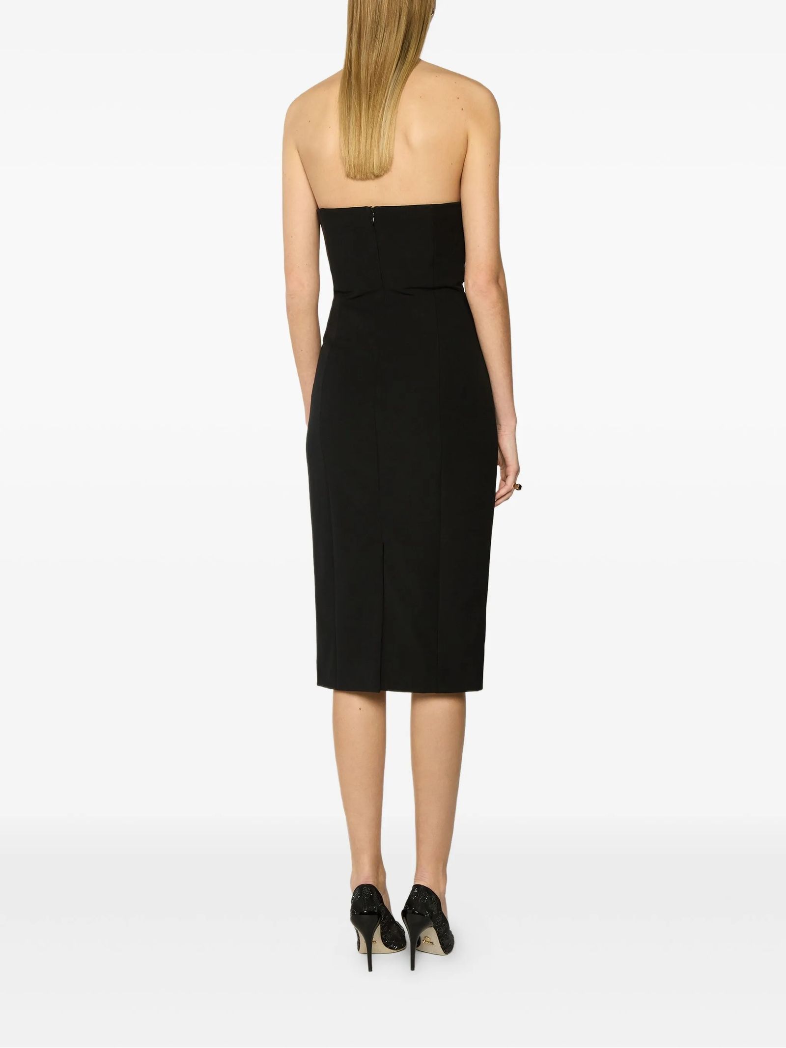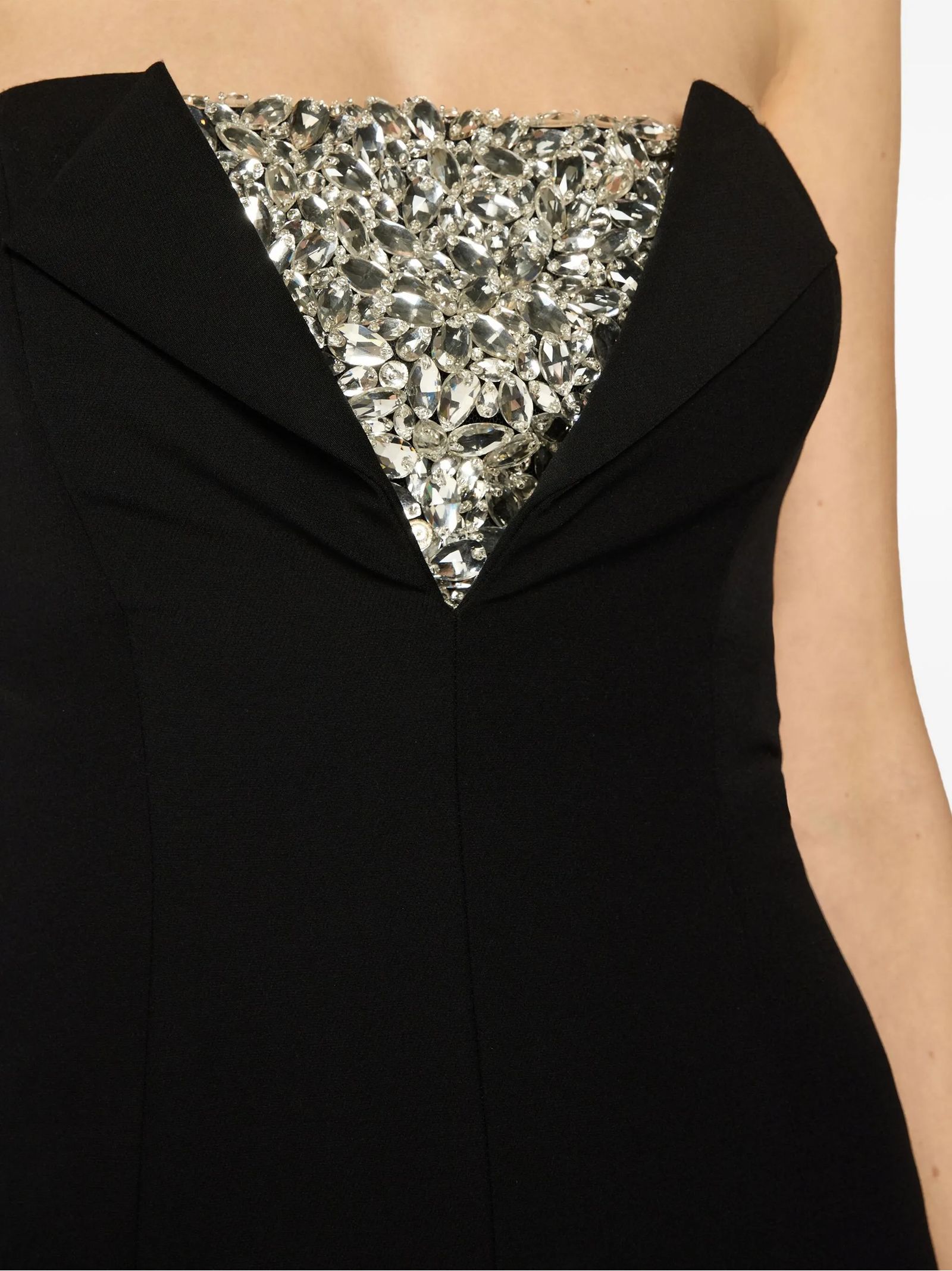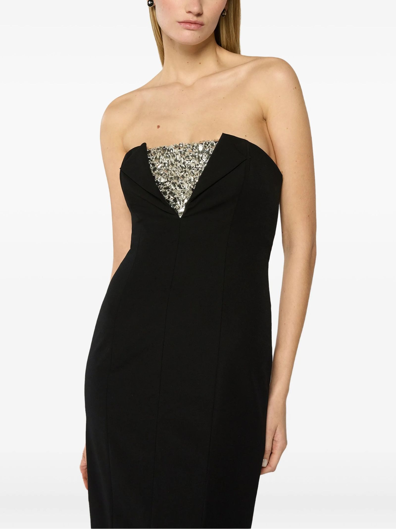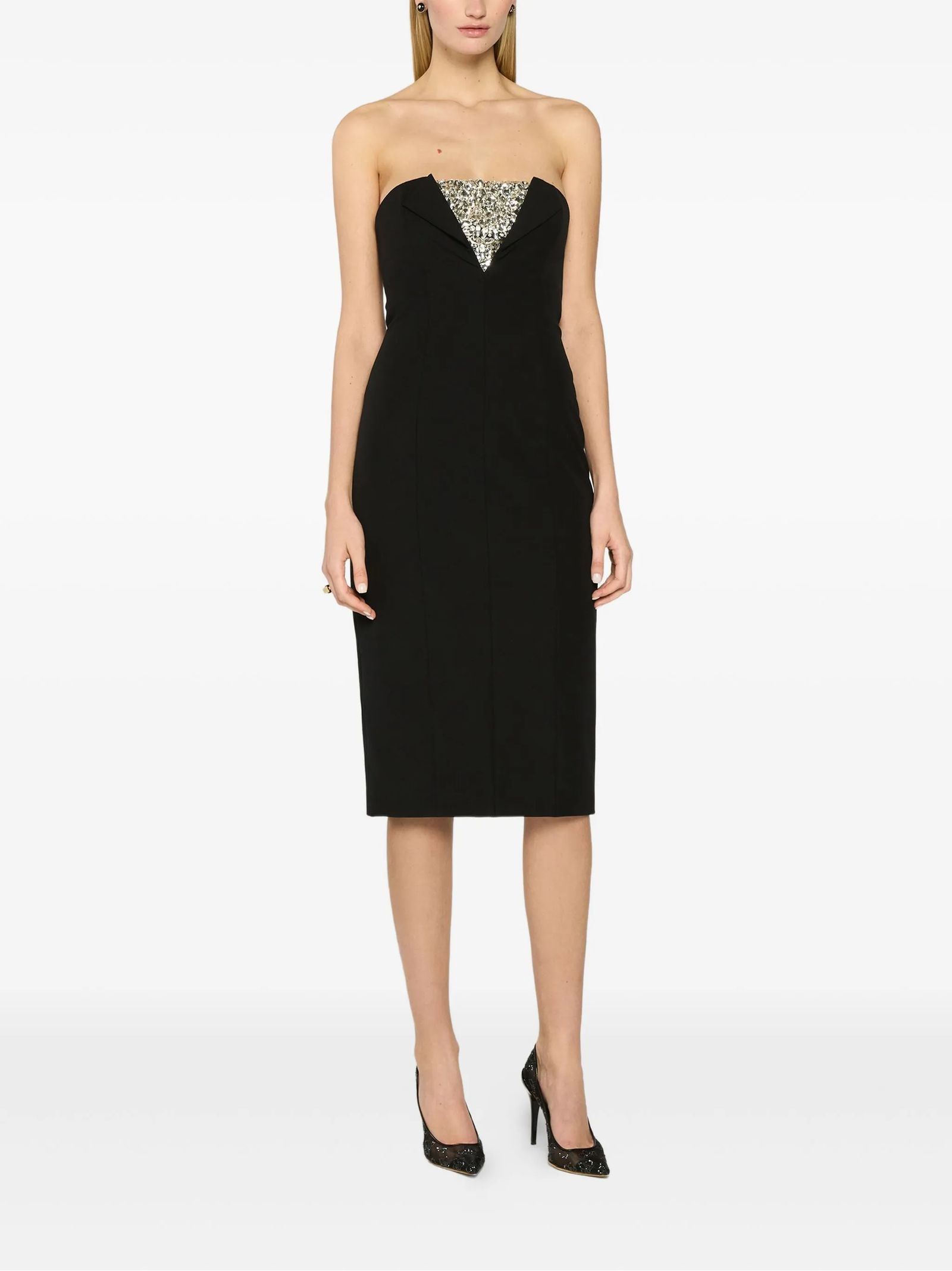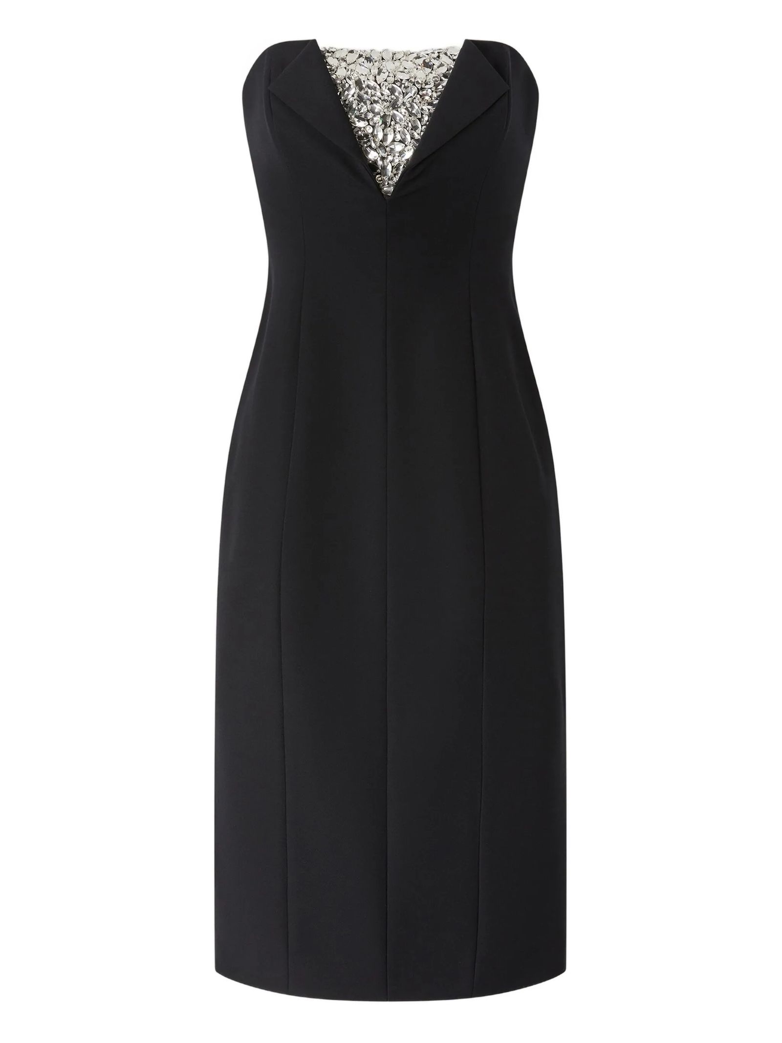 Abito tubino con ricamo di strass, senza spalline, scollatura a cuore arricchita da un ricamo di strass multiformi, linea aderente si allunga sotto il ginocchio