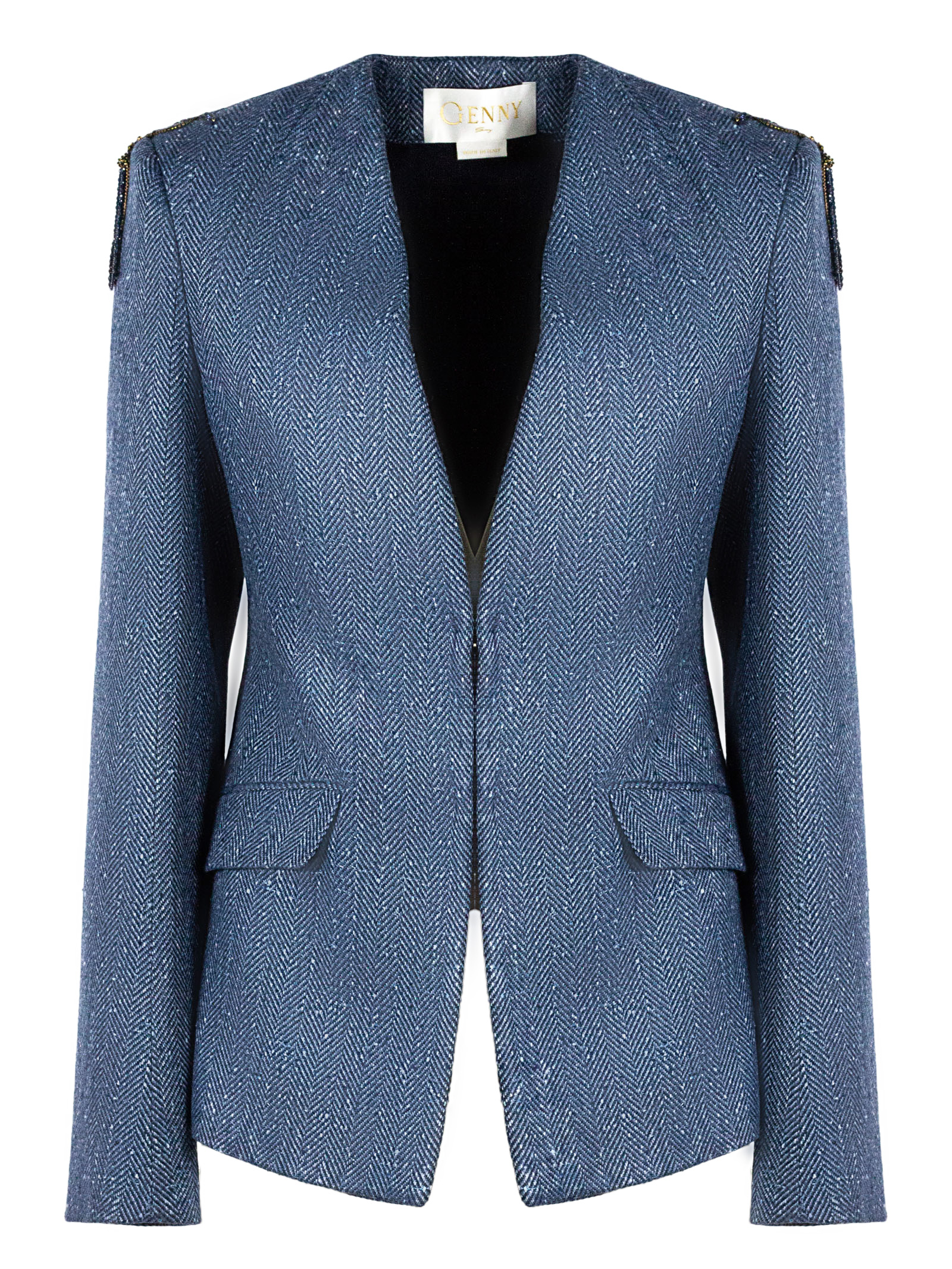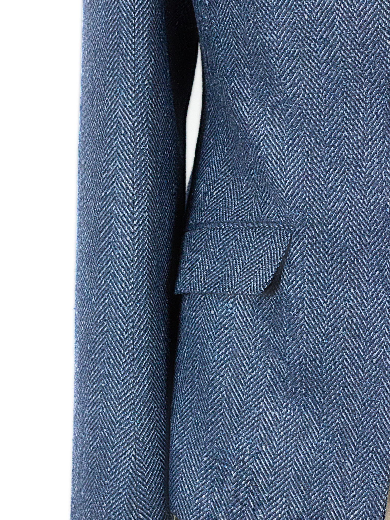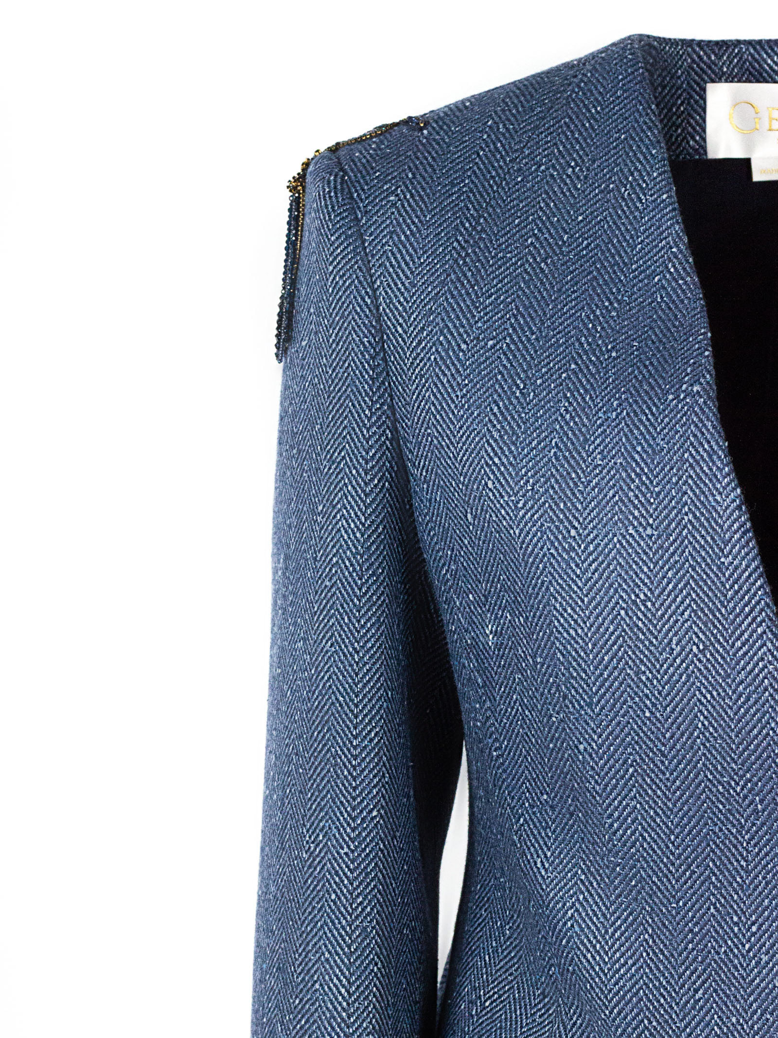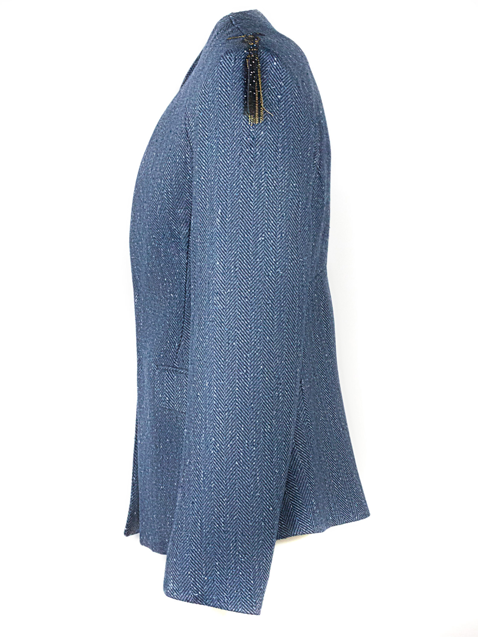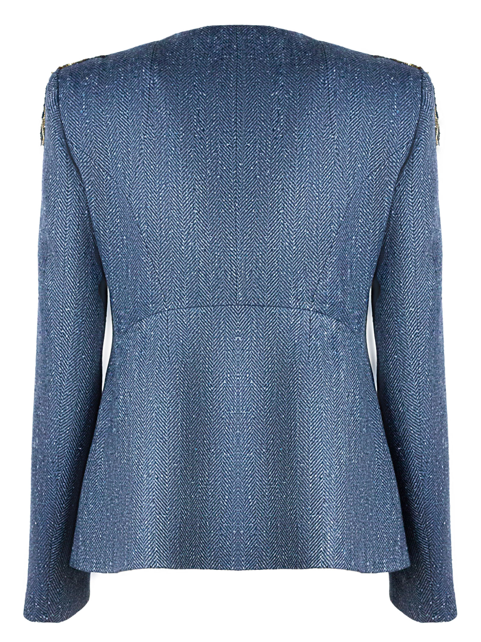 Blazer in misto lana blu con trama Herringbone, senza colletto, scollo a V, tasche laterali con patta, spalle rifinite con dettagli decorativi