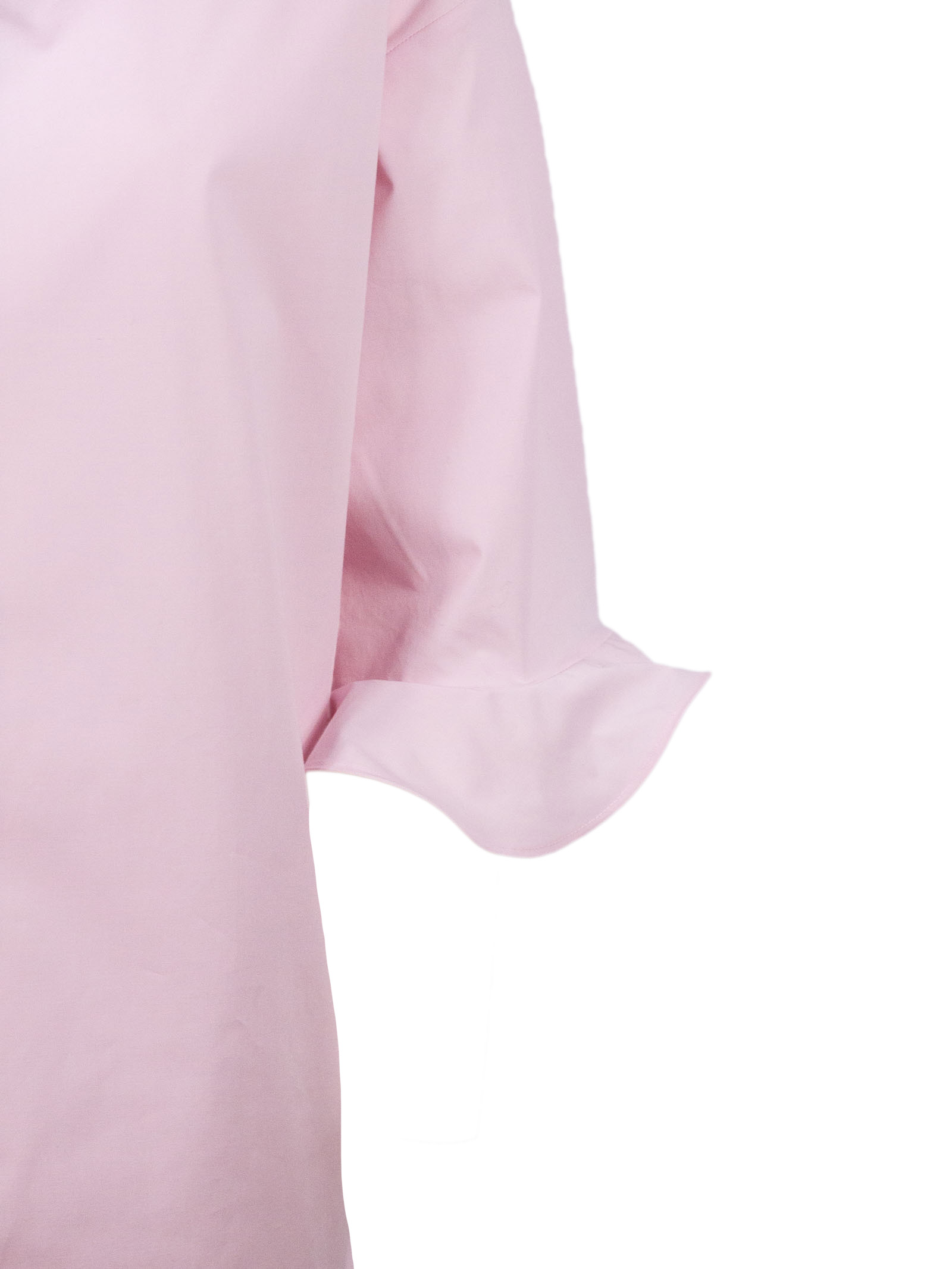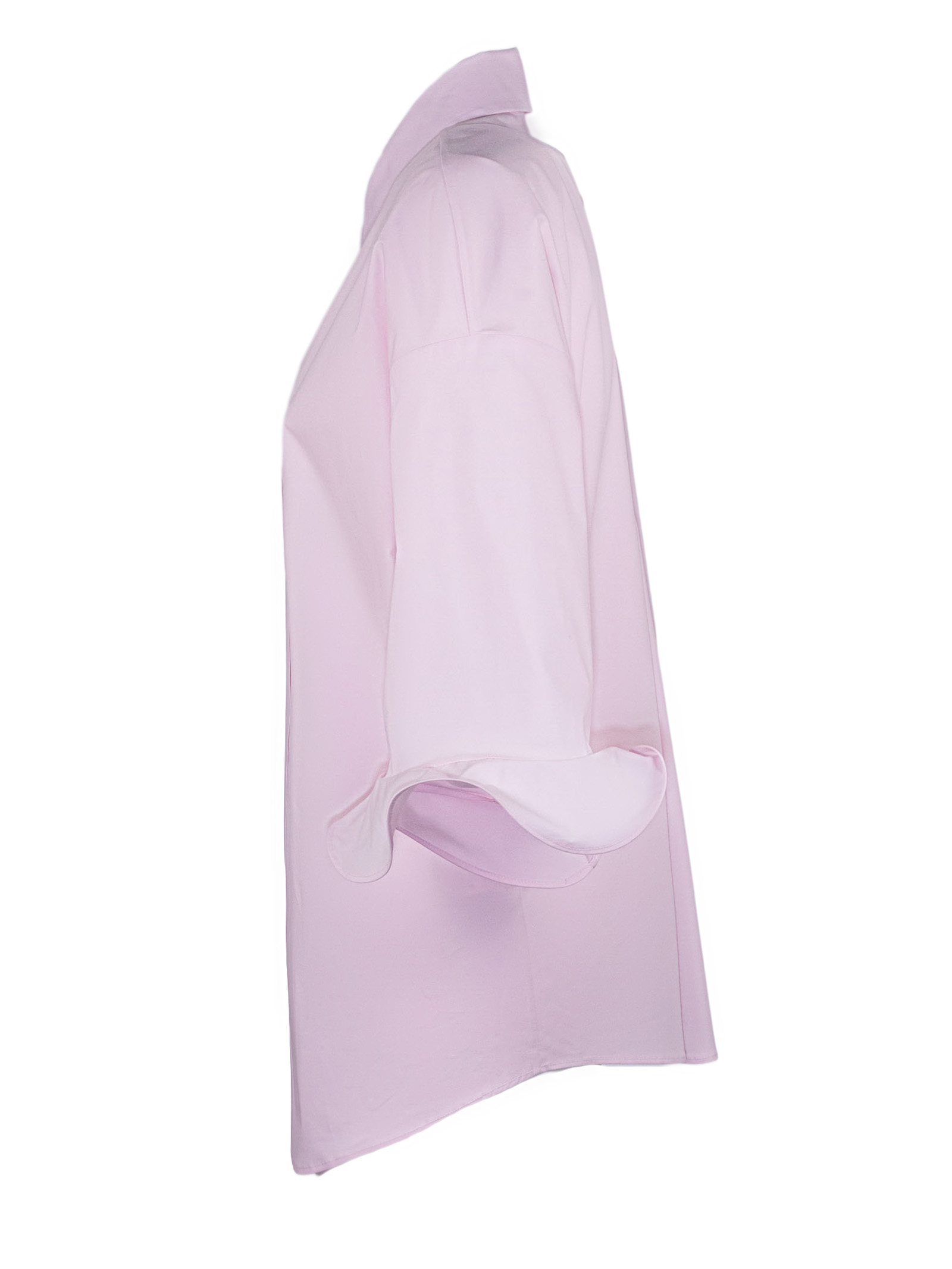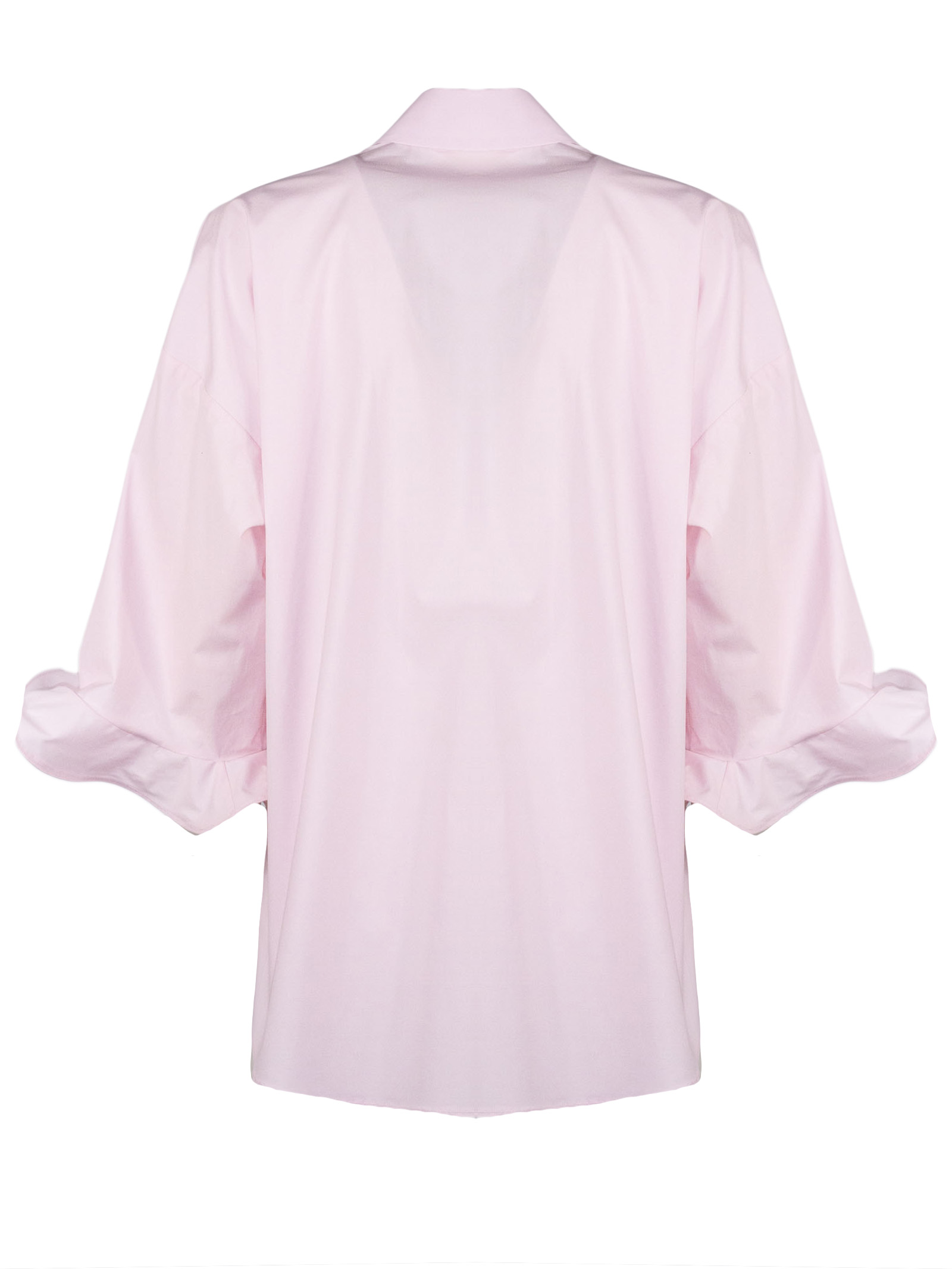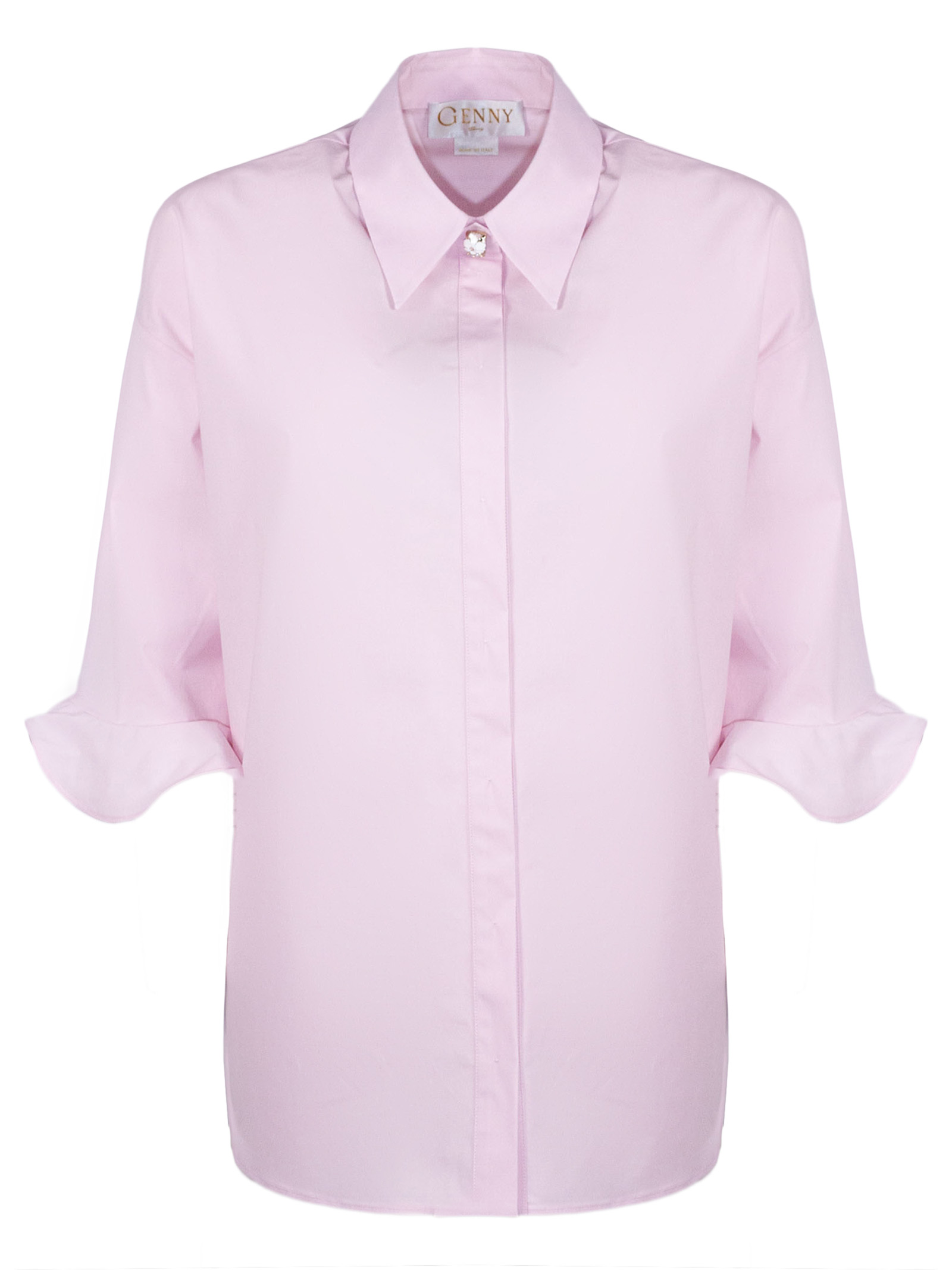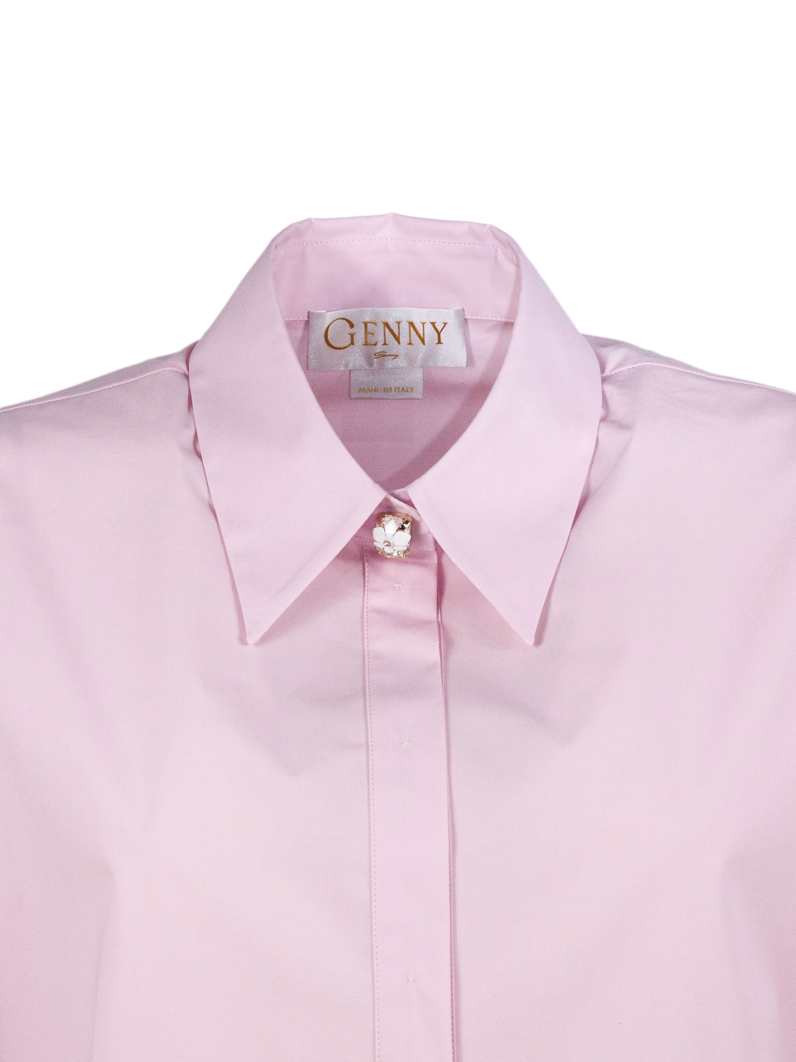 Camicia in popeline con maniche a tre quarti e fondo effetto volant, colletto classico è impreziosito da un bottone gioiello con orchidea, abbottonatura frontale nascosta