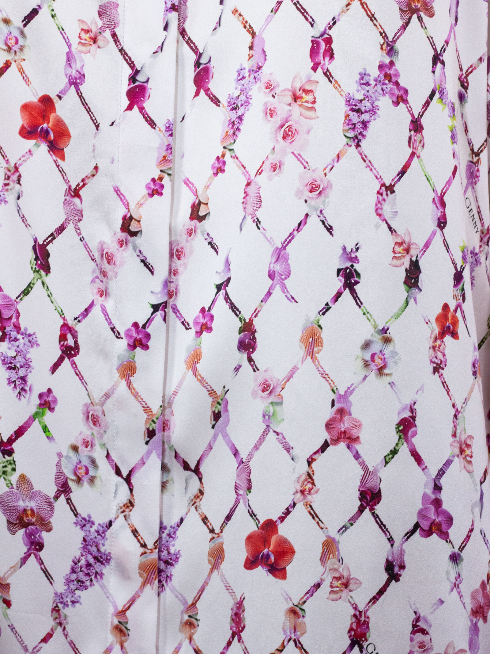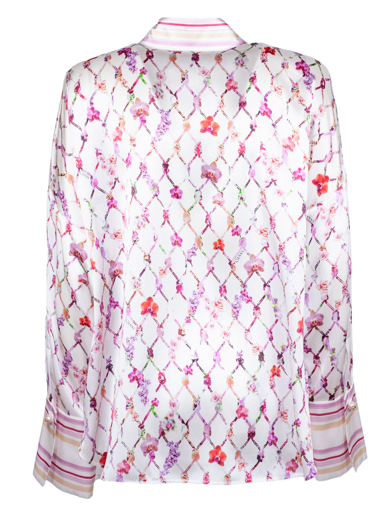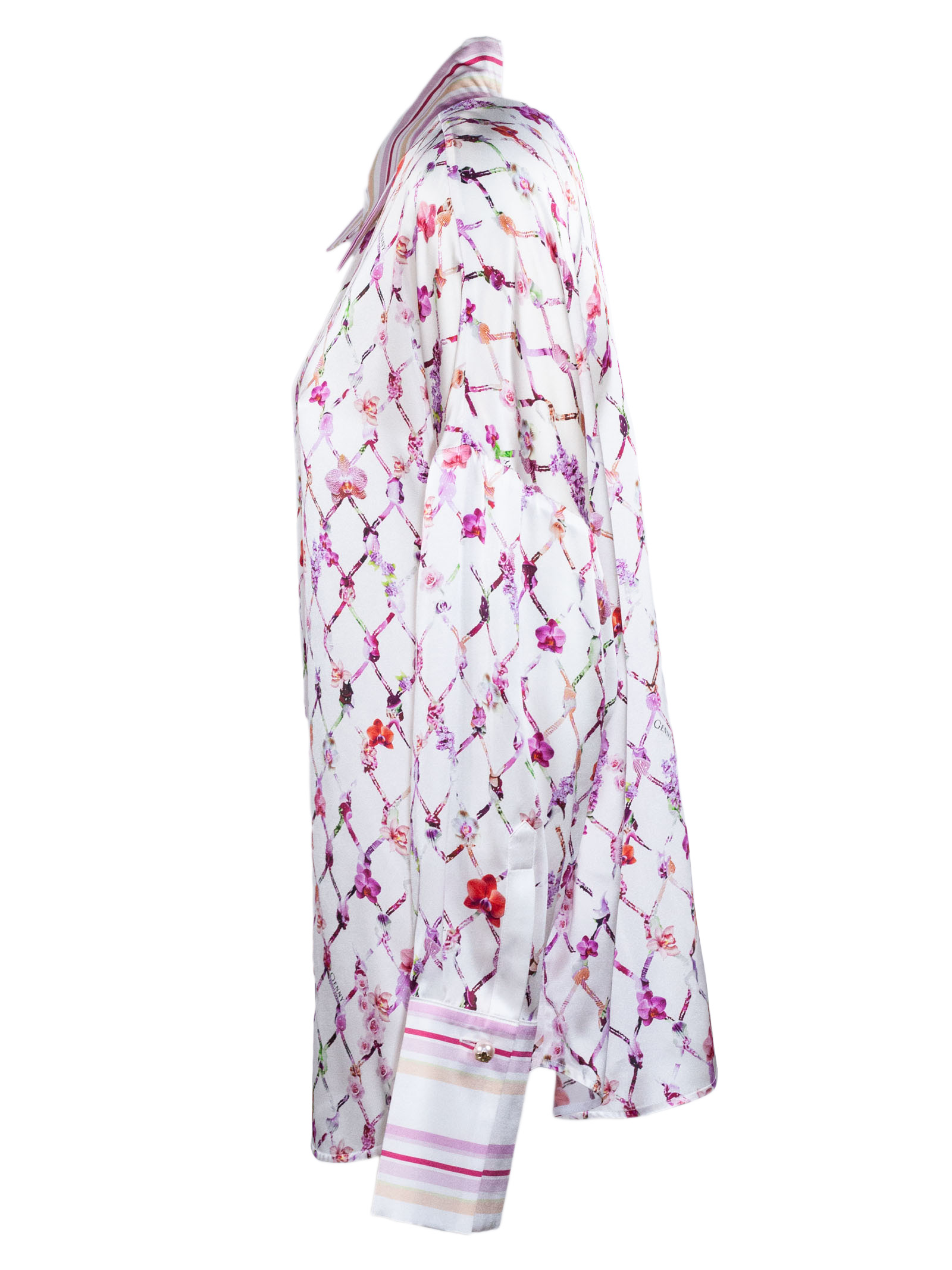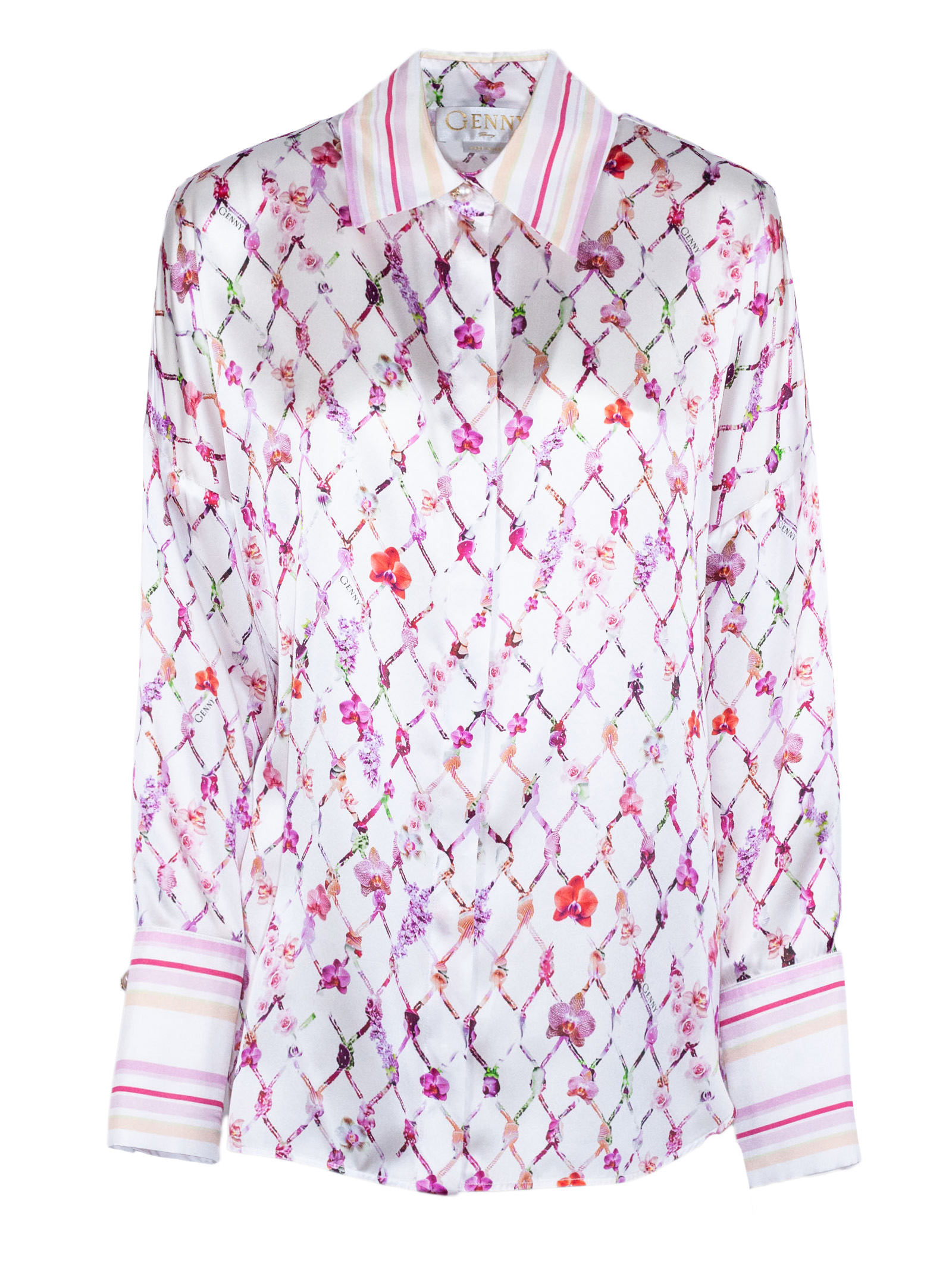 Camicia in seta, stampa floreale con motivo a rete, fondo bianco, colletto classico a righe, chiusura frontale con bottoni, maniche lunghe, polsini a righe, vestibilità fluida, finitura liscia e leggera