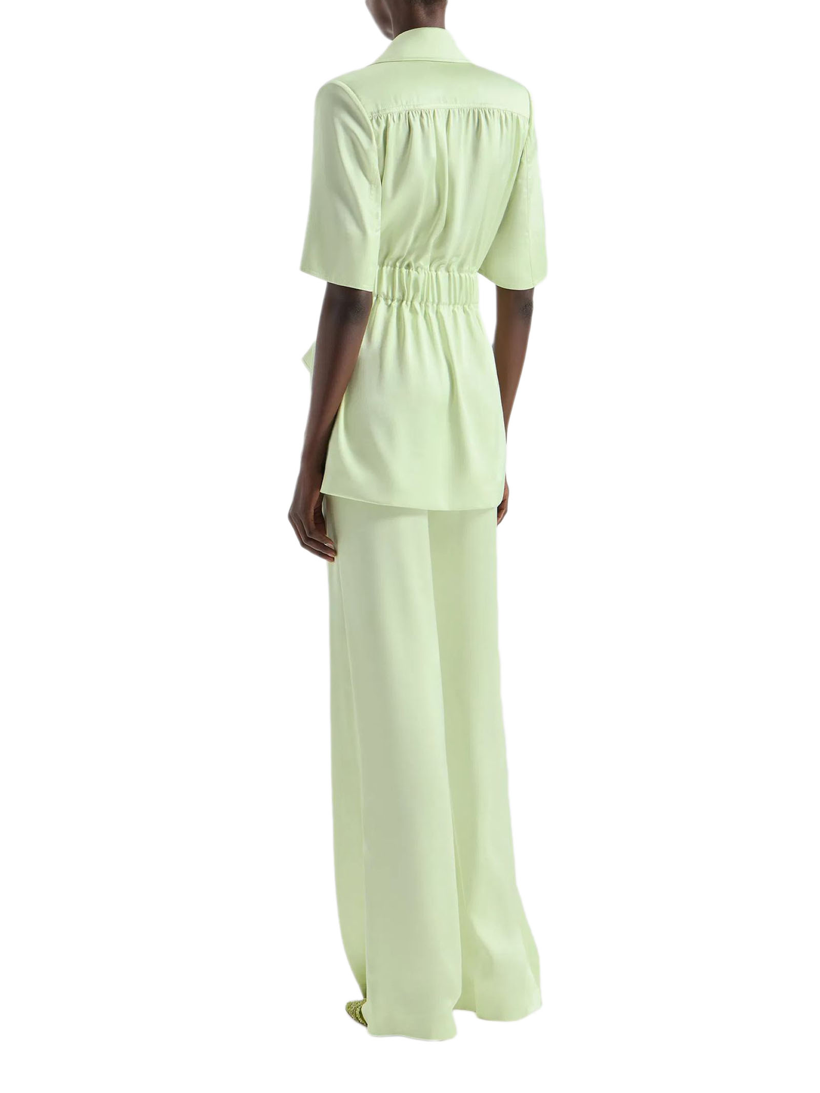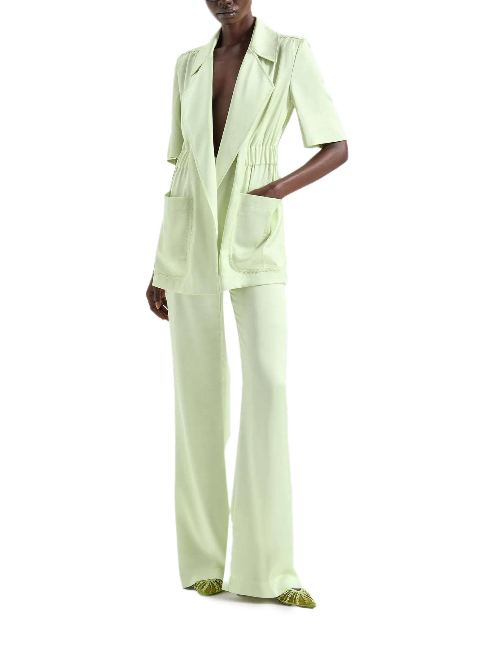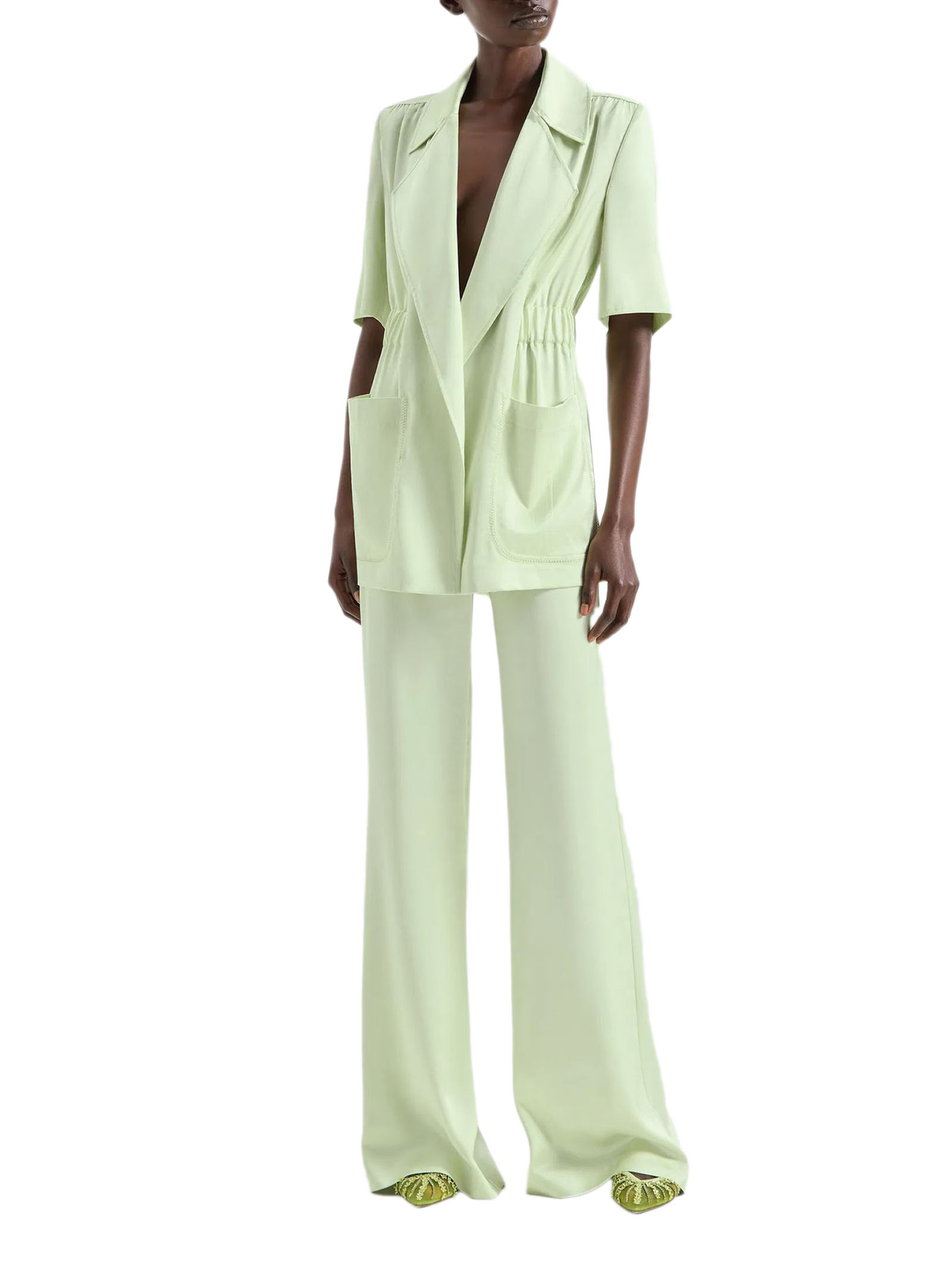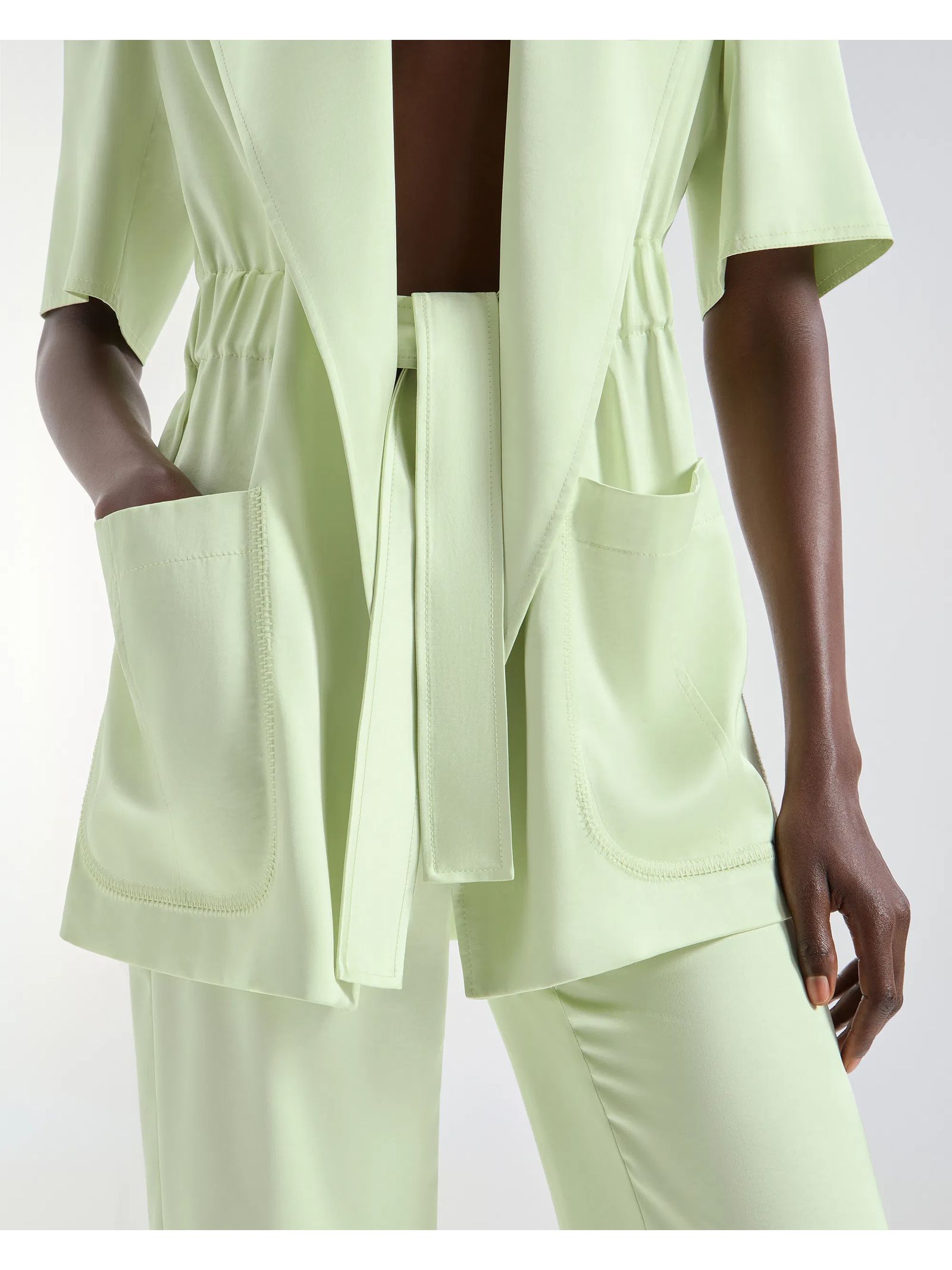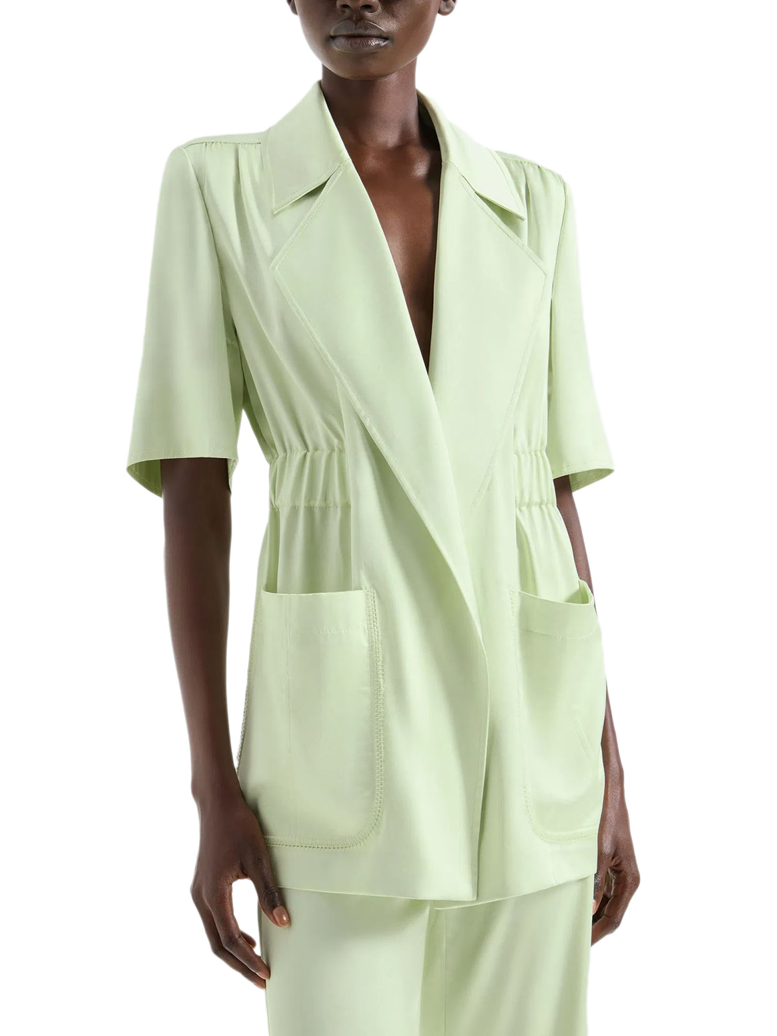 Giacca lunga in tessuto fluido leggero verde con maniche corte e collo a rever, caratterizzata da un arriccio in vita, cintura sul davanti, tasche sartoriali