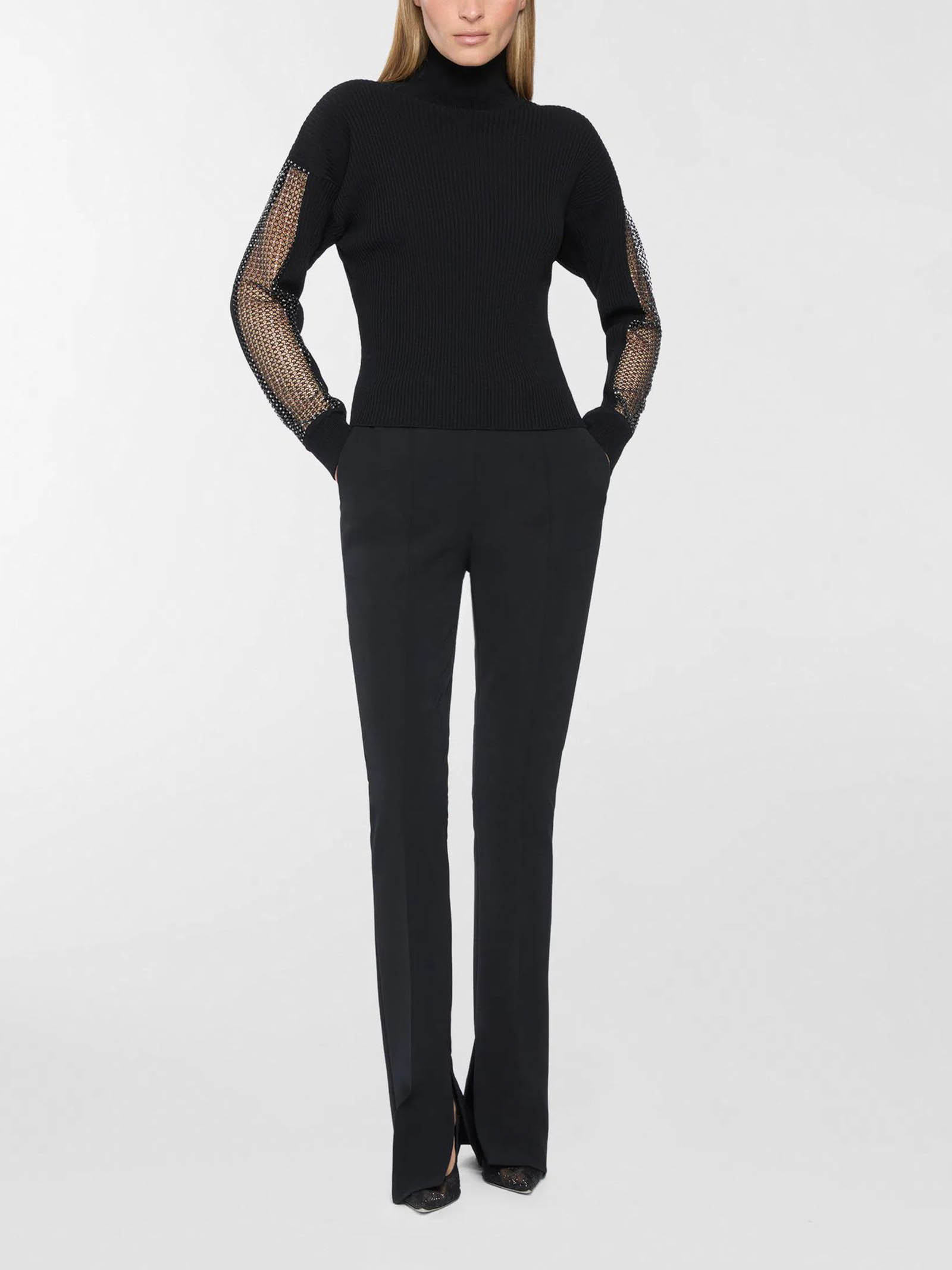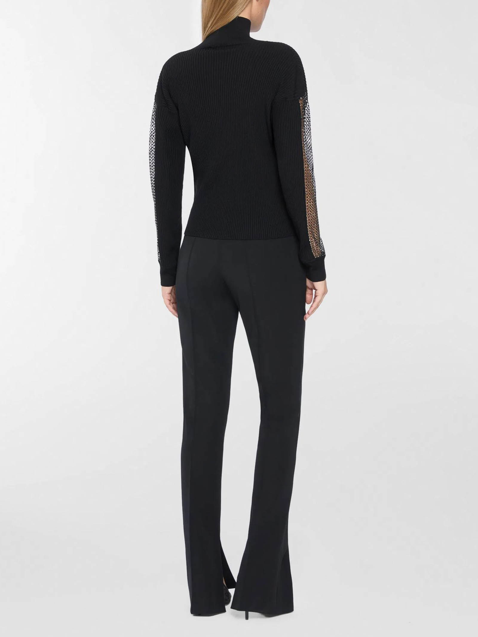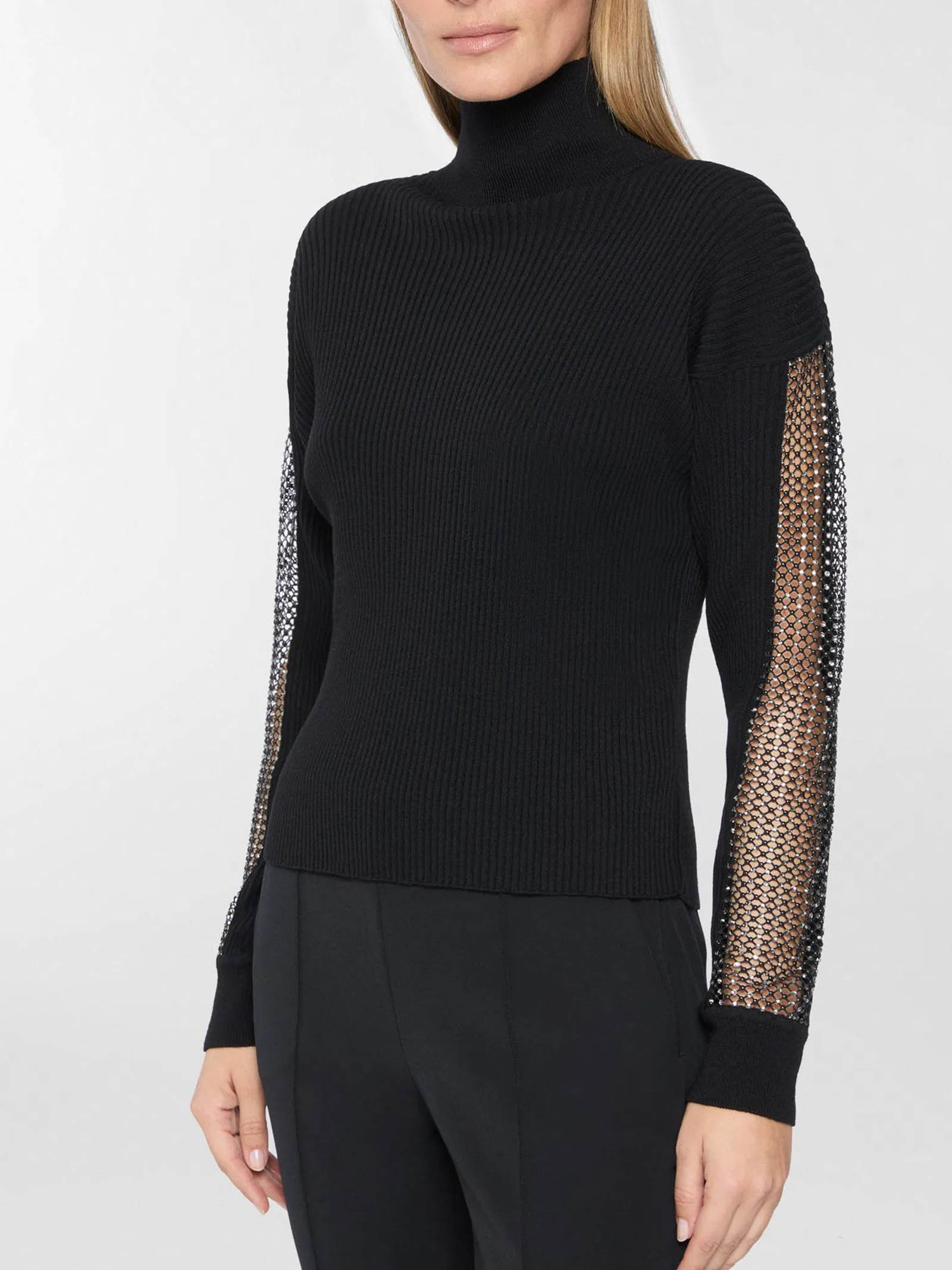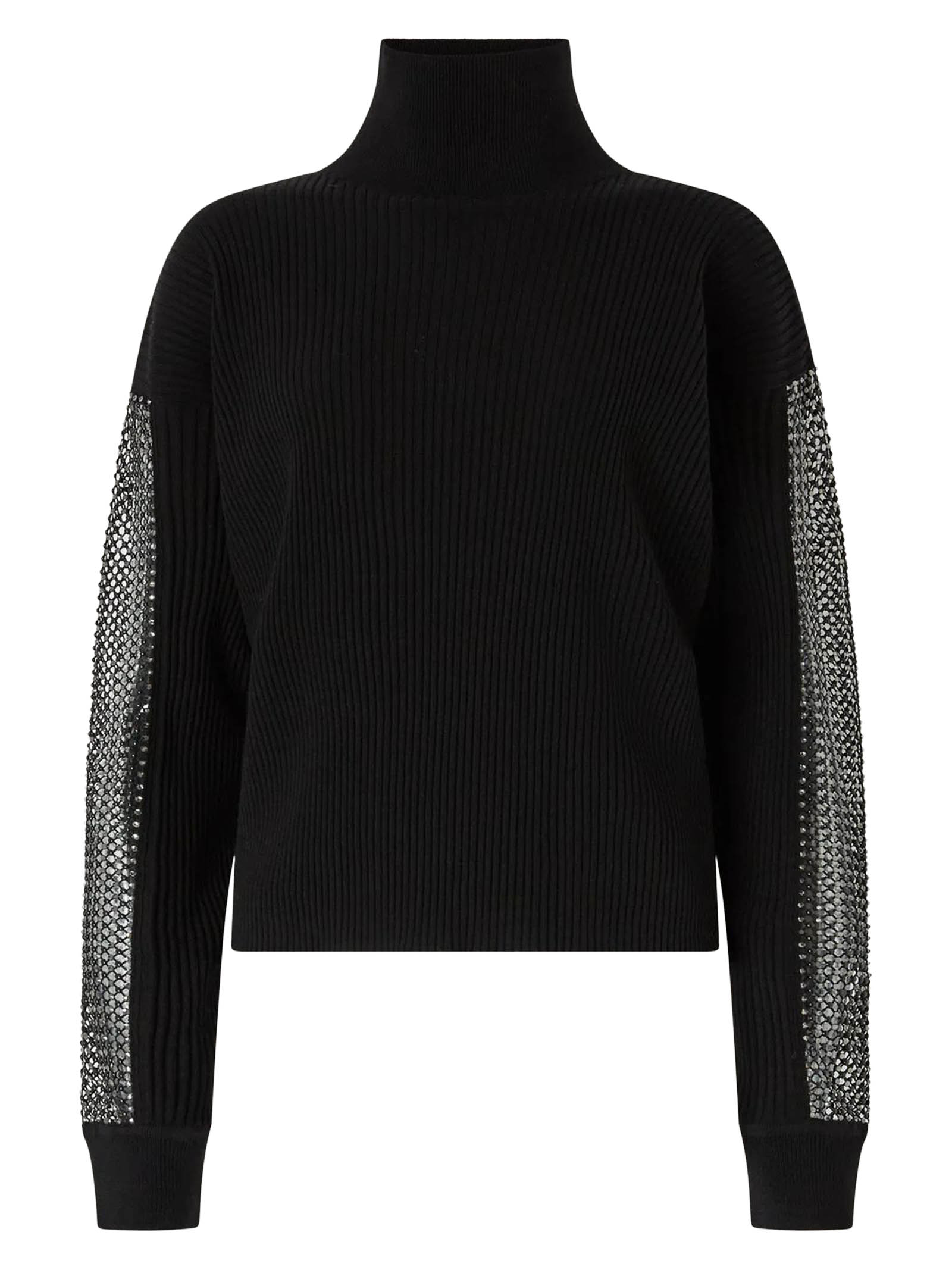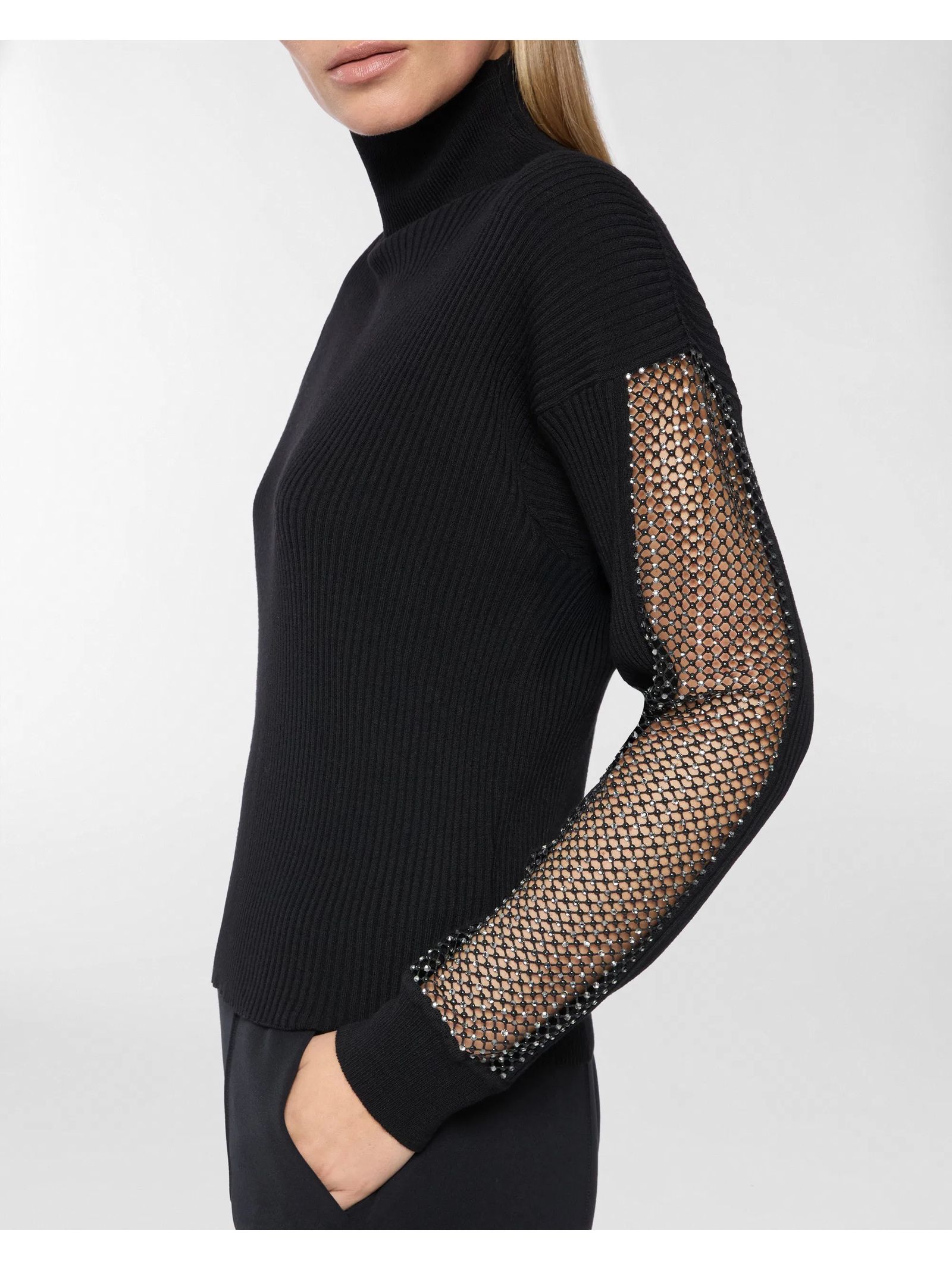 Lupetto in lana vergine con inserti in rete e strass, maniche lunghe realizzata in maglia di lana a costine, con vestibilità morbida e lunghezza ai fianchi. Le maniche sono arricchite da inserti in rete con strass perlati
