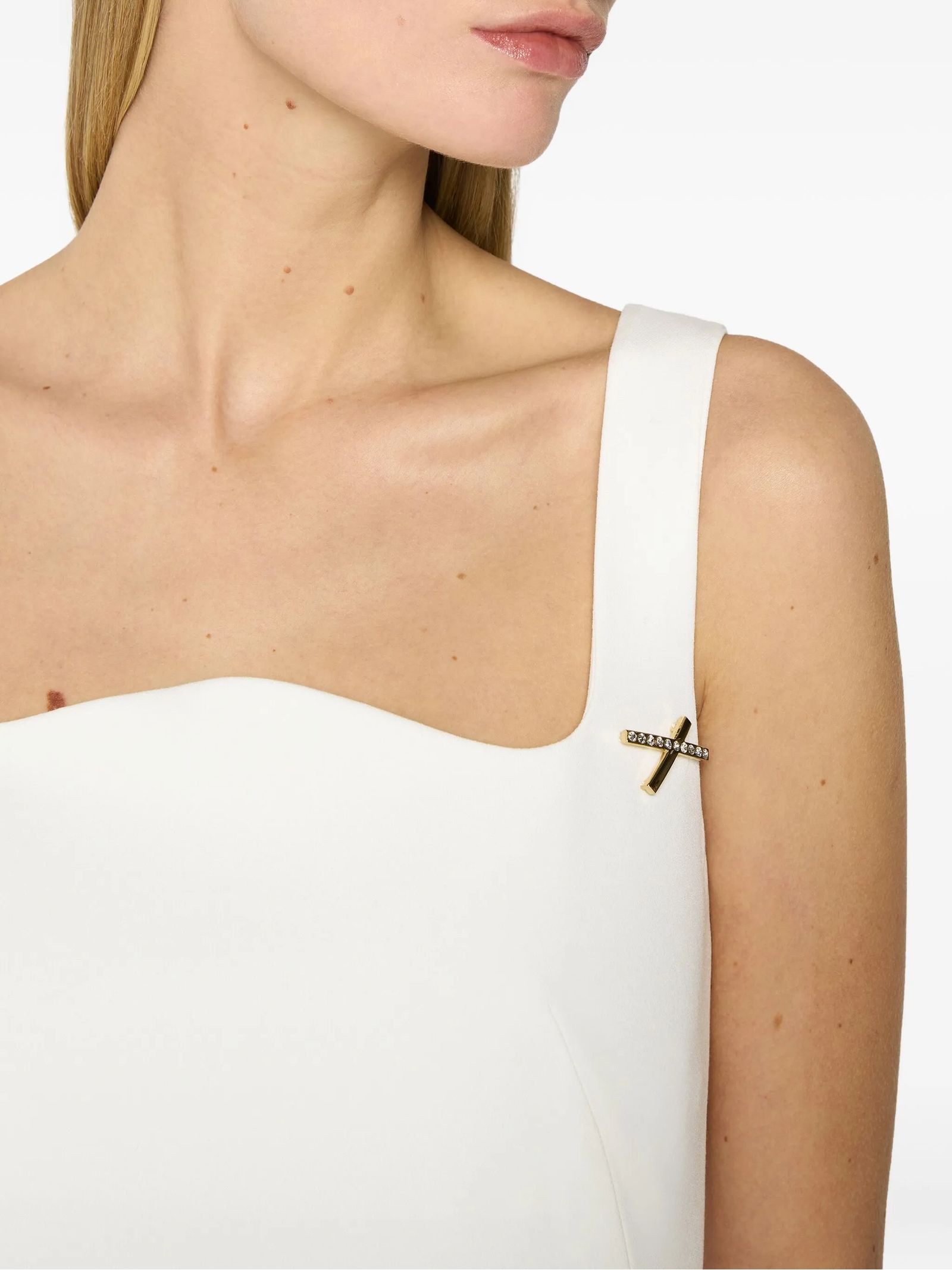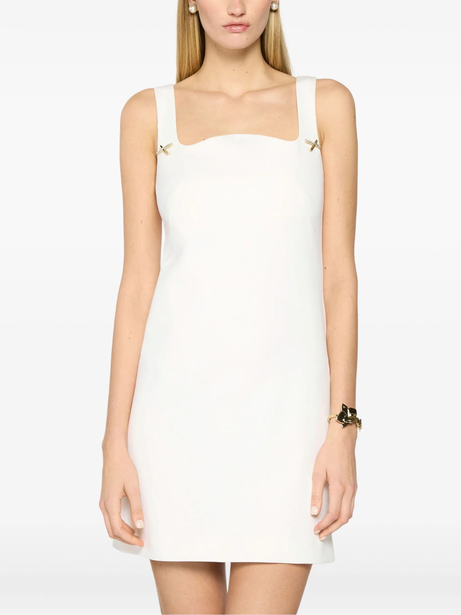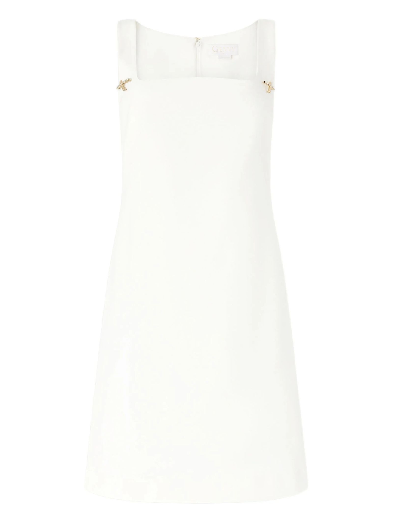 Miniabito con carré strutturato e dettaglio X, scollatura squadrata, senza maniche, decorazione in cristalli, orlo dritto