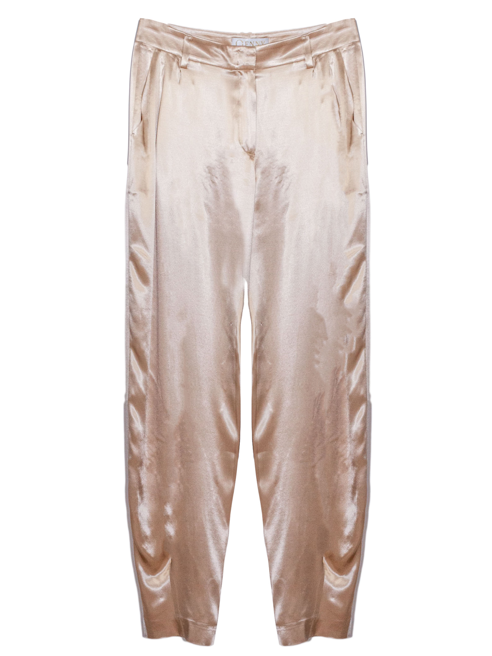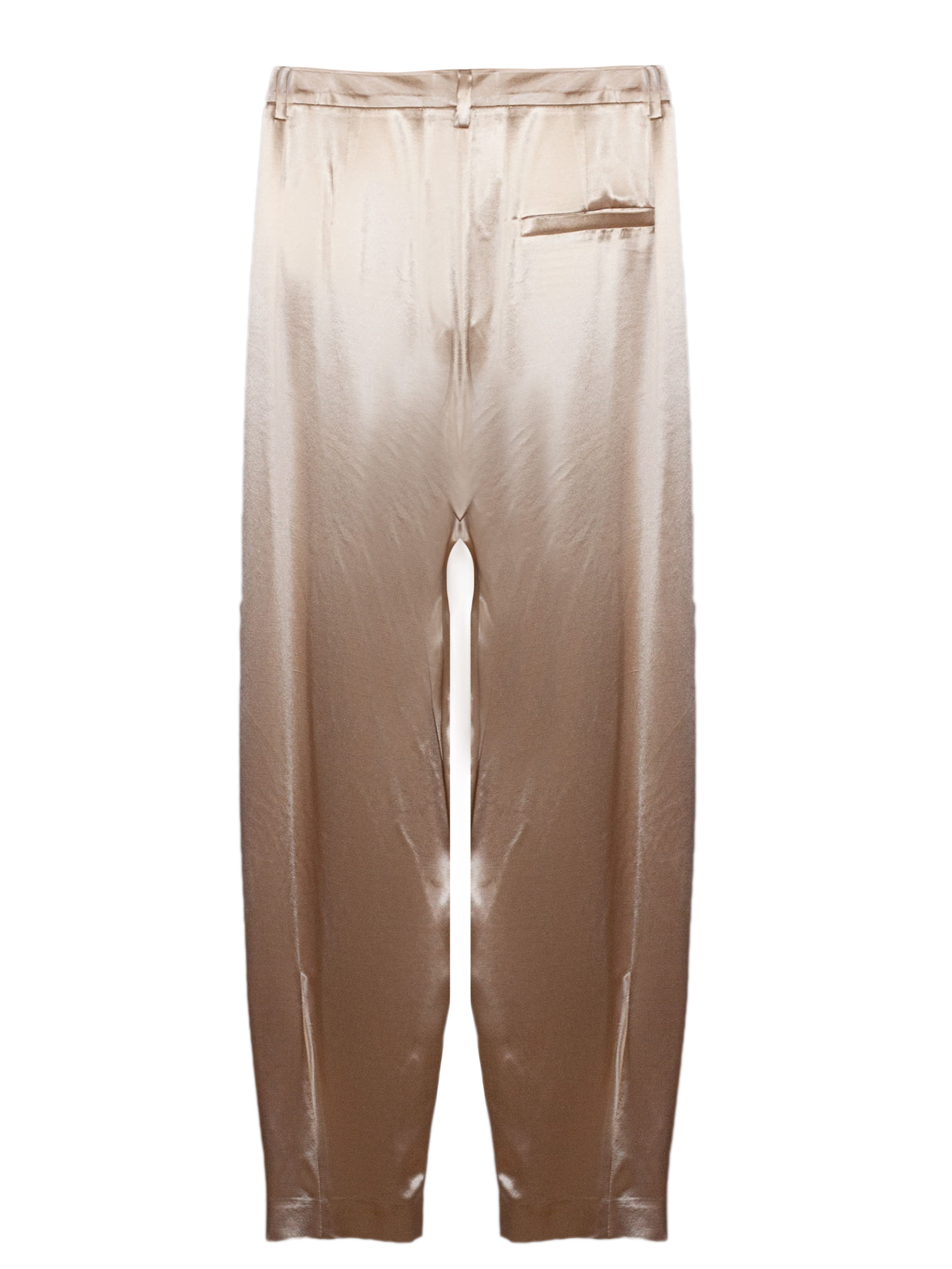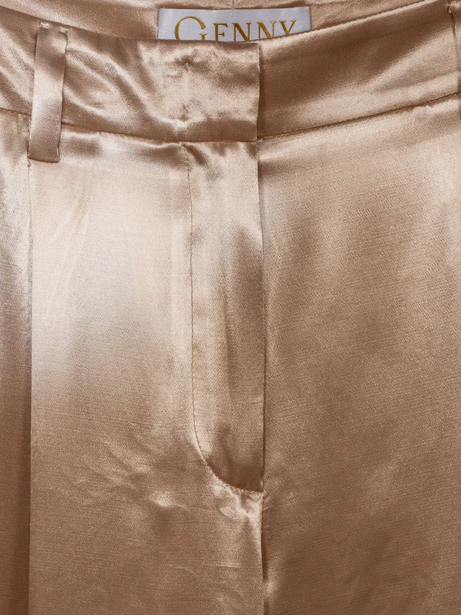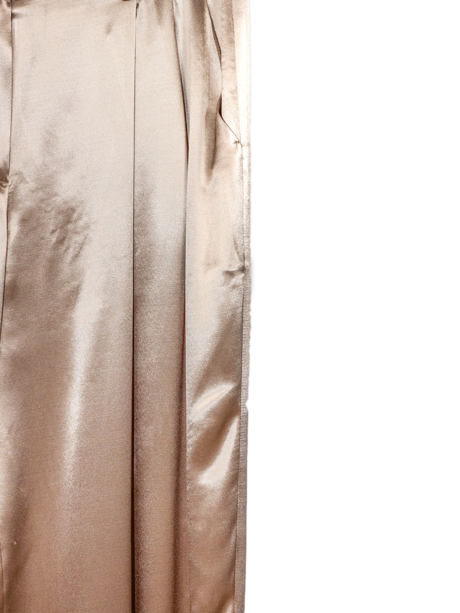 Pantalone in raso lucido, colore bronzo con passanti per cintura, chiusura con bottone e zip nascosta, tasca sul retro, tasche laterali, vestibilità morbida