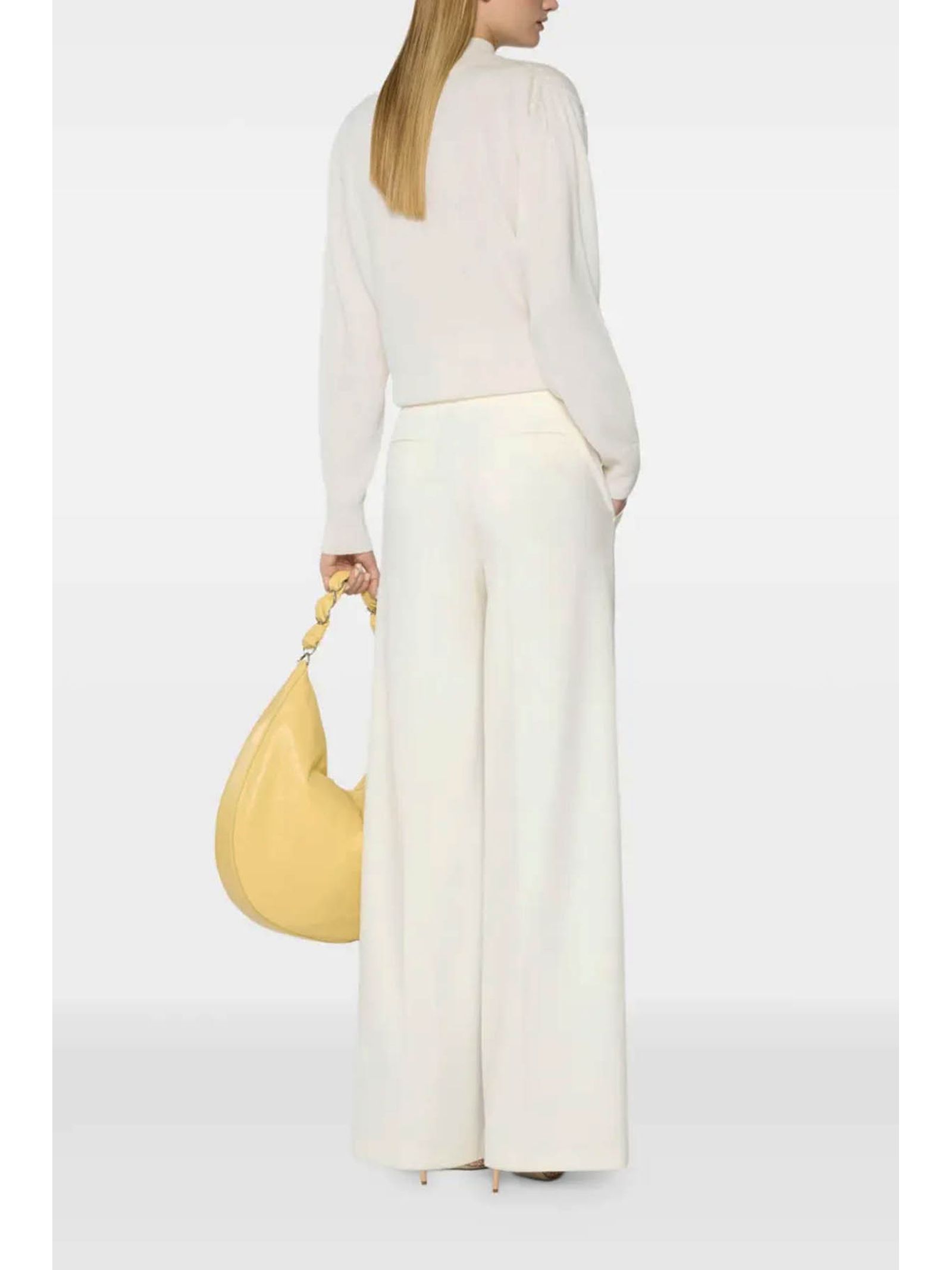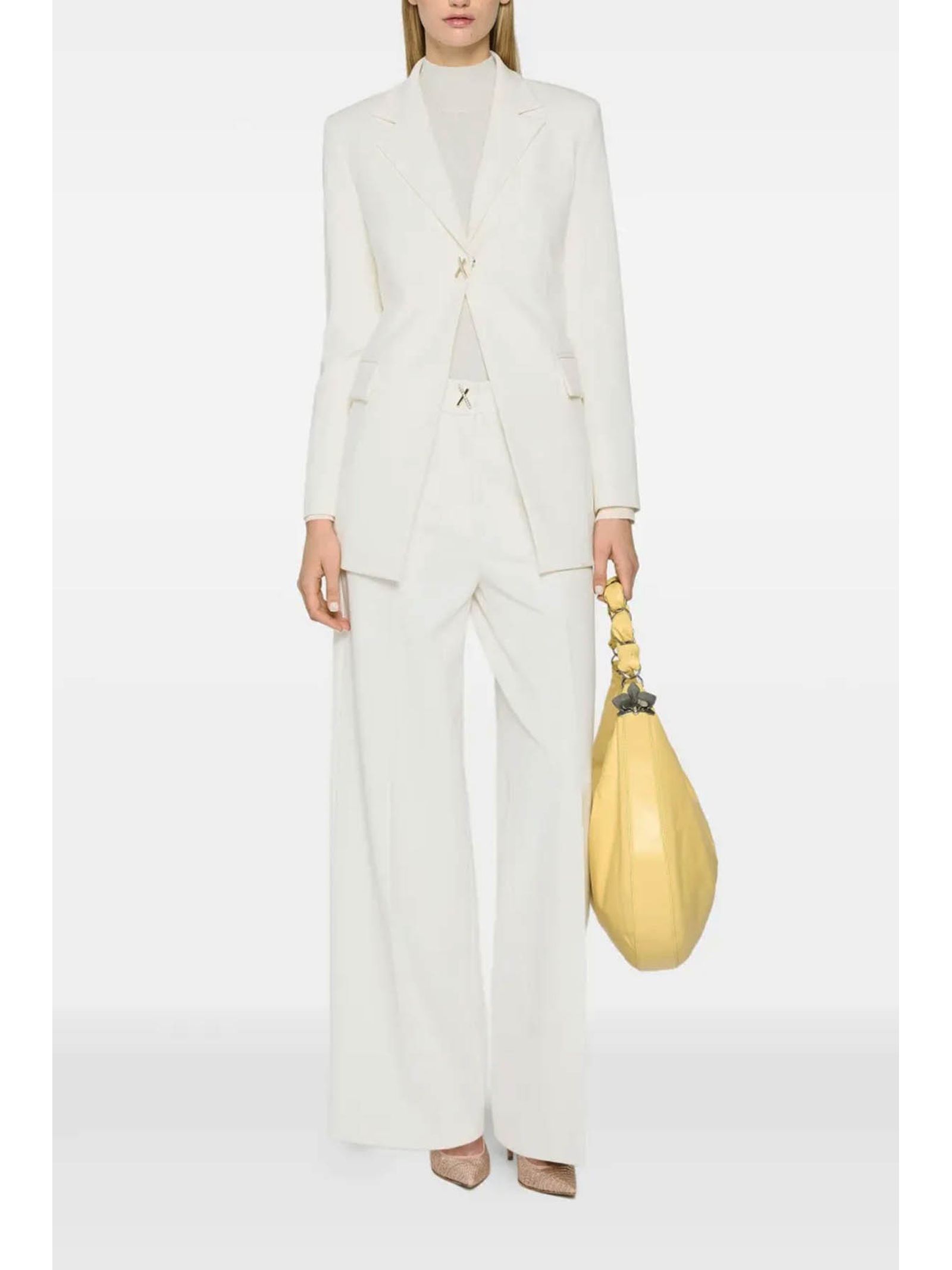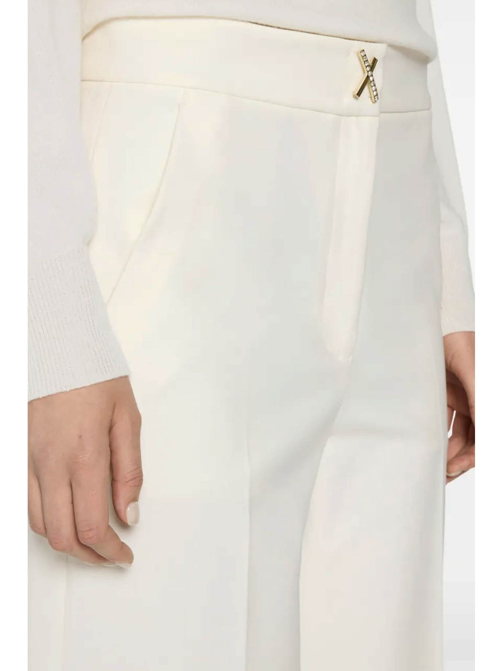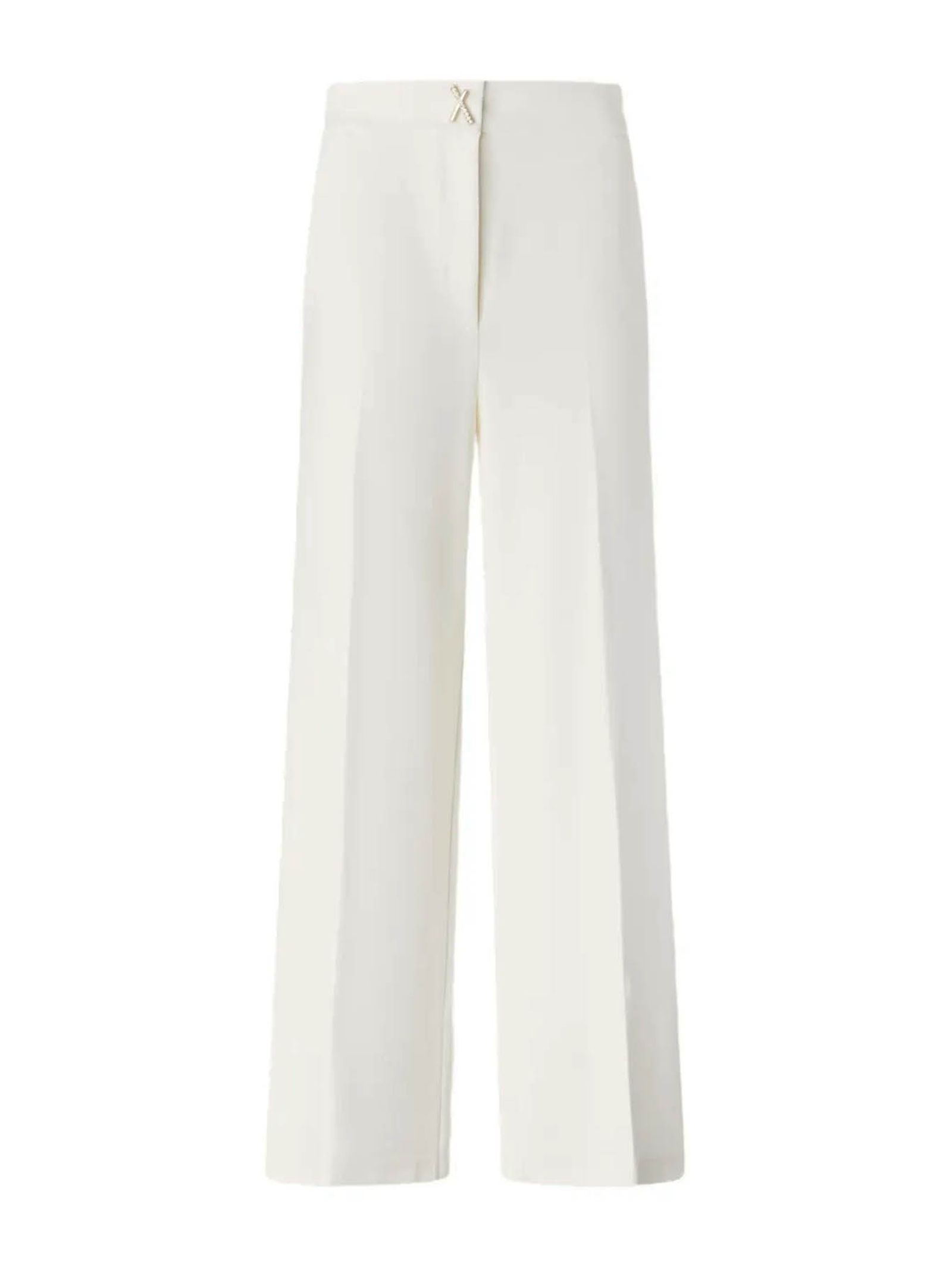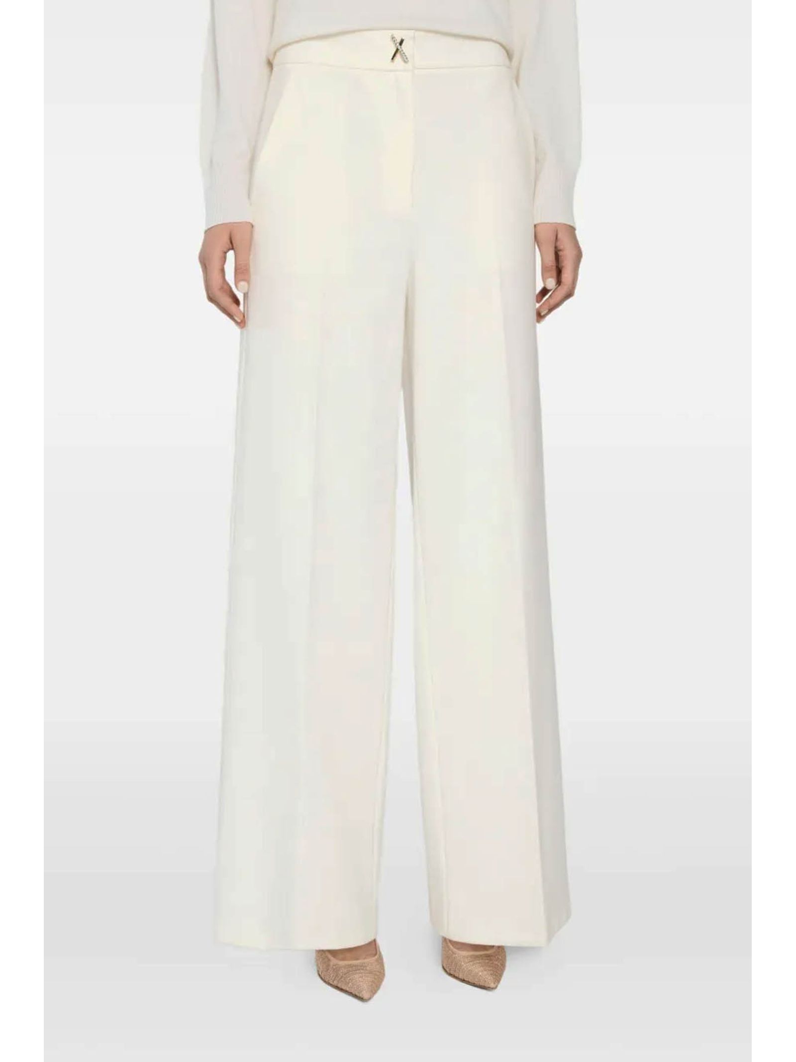 Pantalone sartoriale a palazzo in cady, punto vita regolare, tasche alla francese, chiusura con gancini nascosti e una placchetta a forma di "X