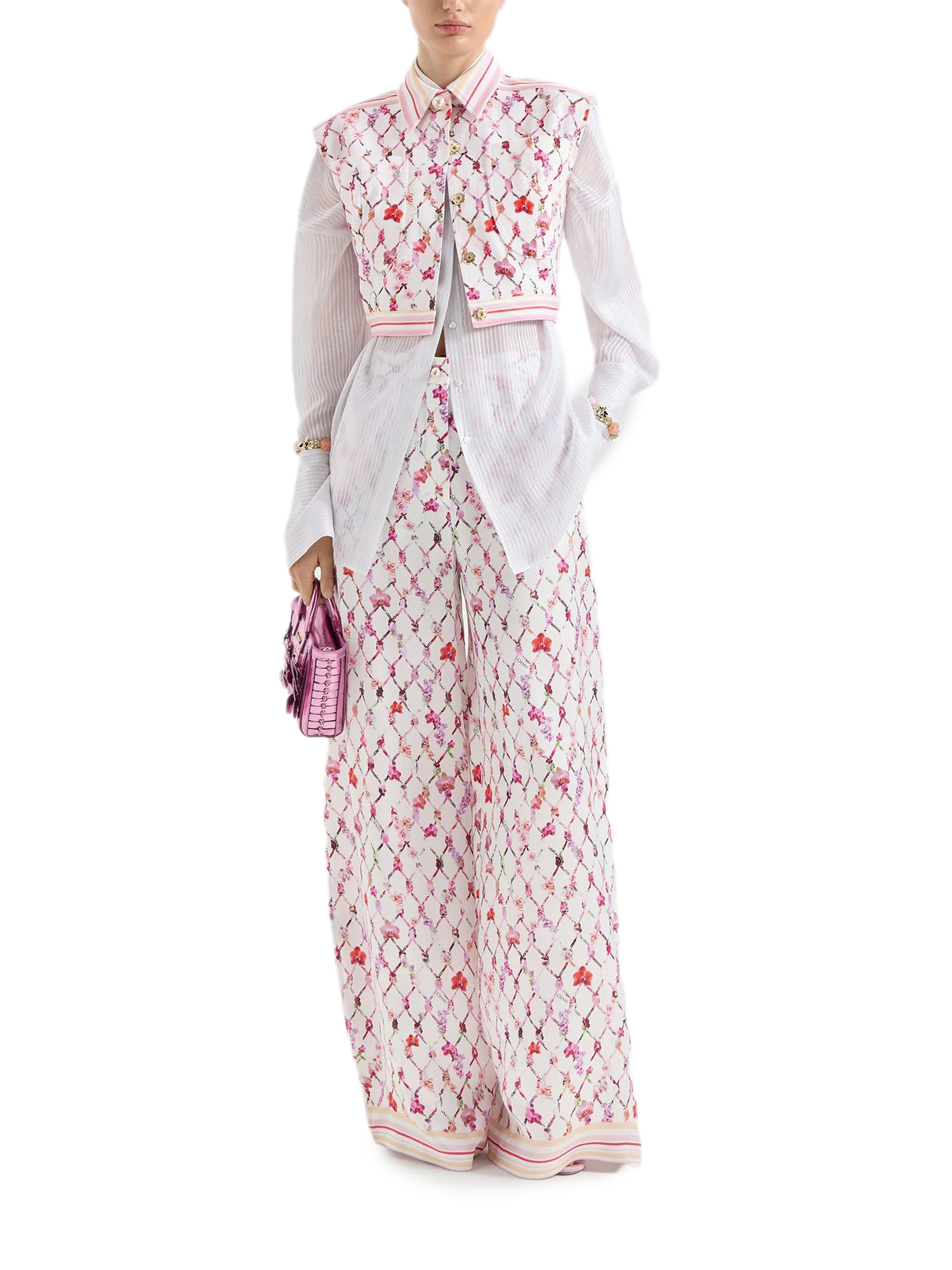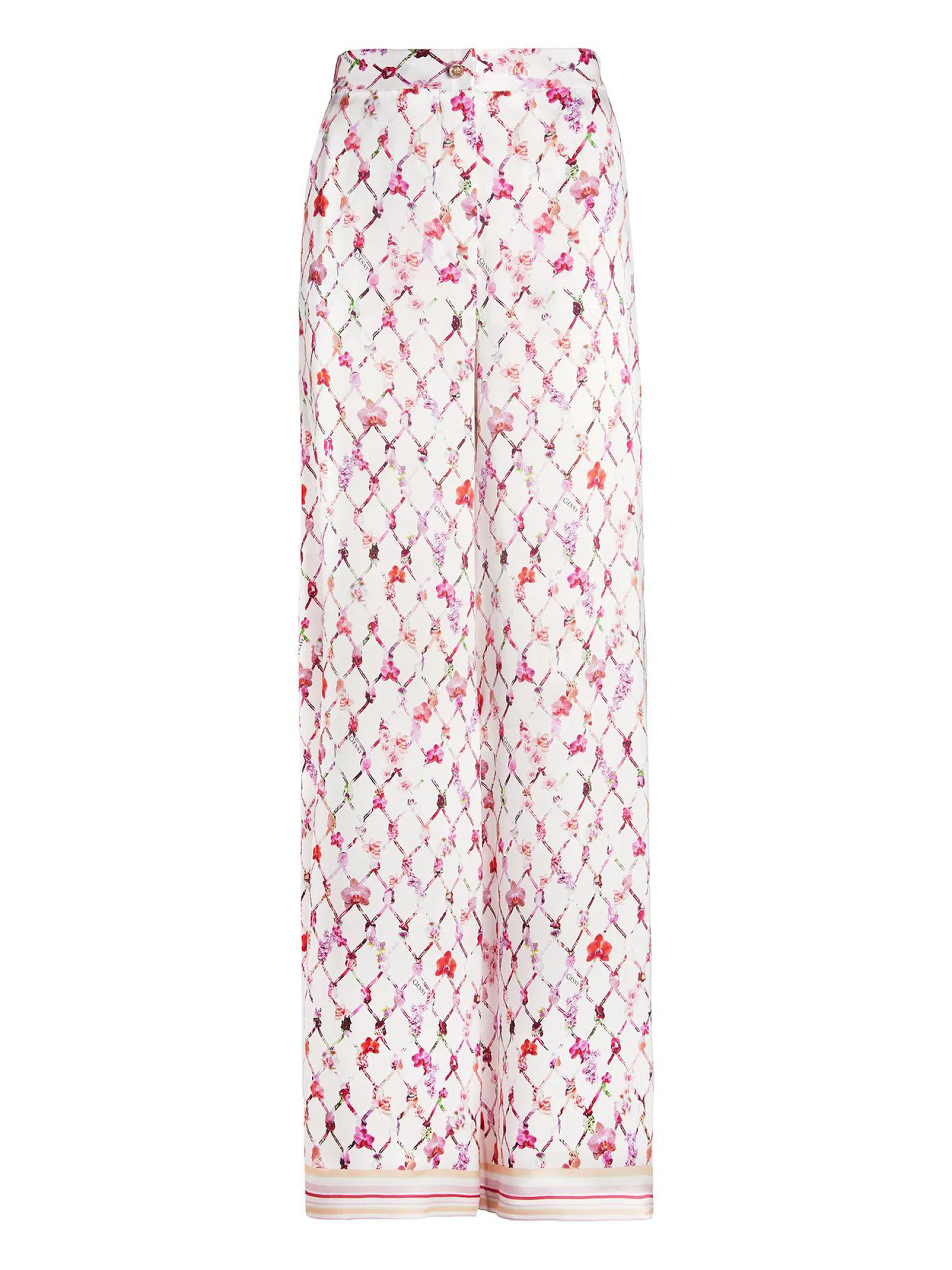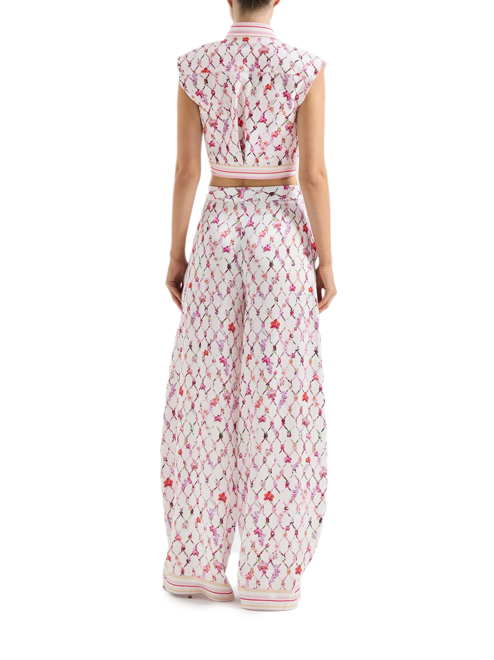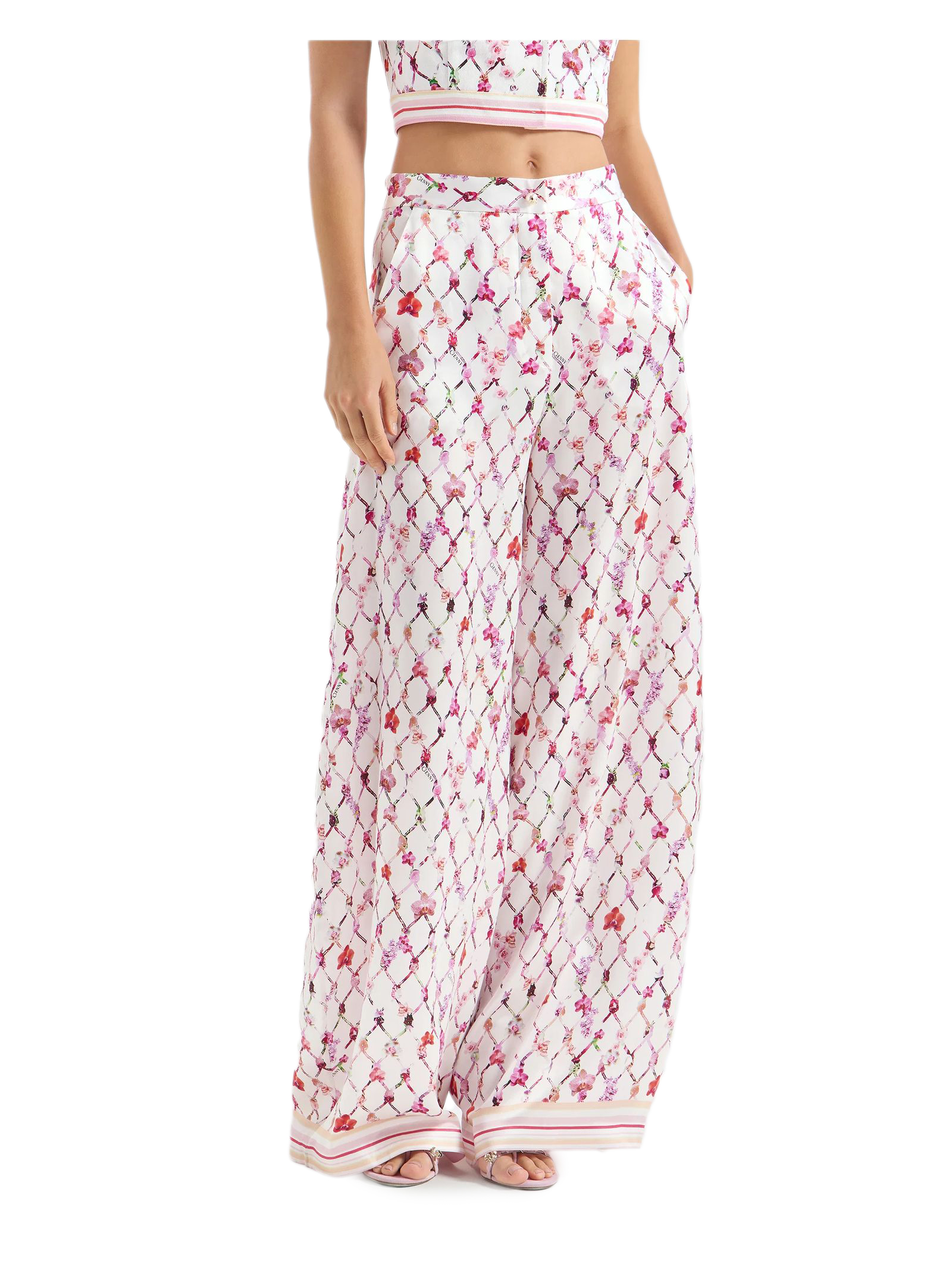 Pantaloni a zampa d'elefante in raso di seta a vita alta, con l'iconica stampa a nappine della Maison reinterpretata in chiave floreale con le orchidee, motivo distintivo di Genny