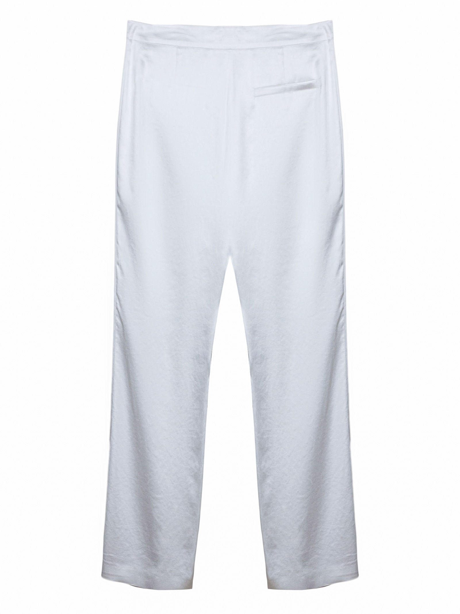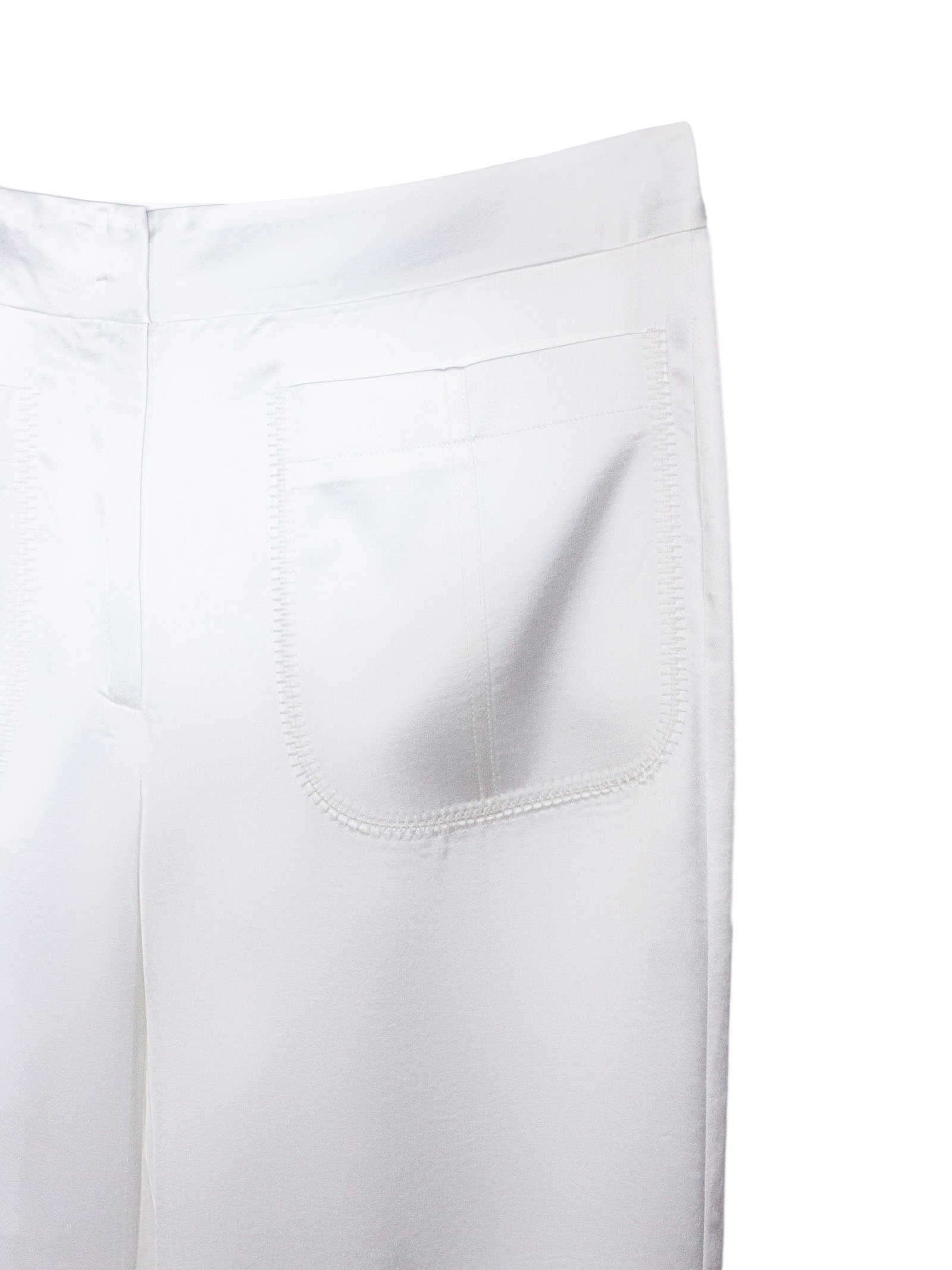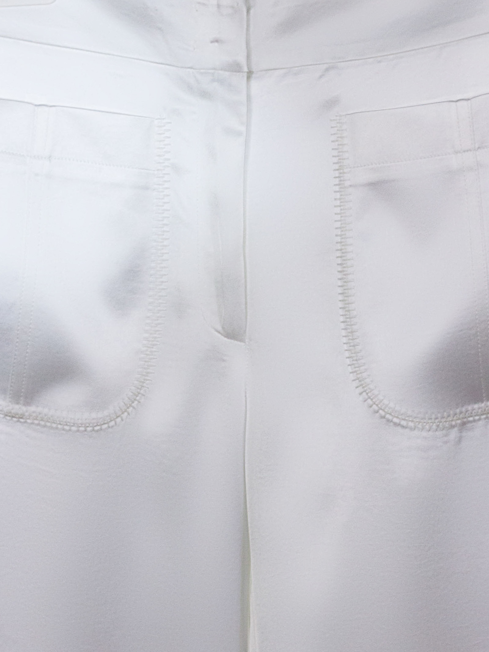 Pantaloni in tessuto fluido bianco a vita media dalla linea dritta, tasche applicate, ricamo con effetto impuntura