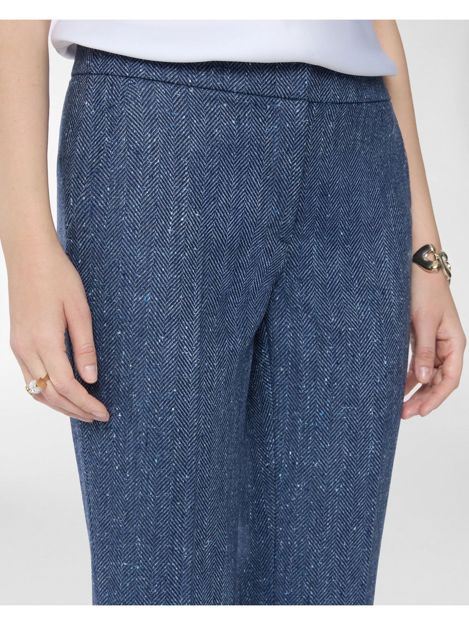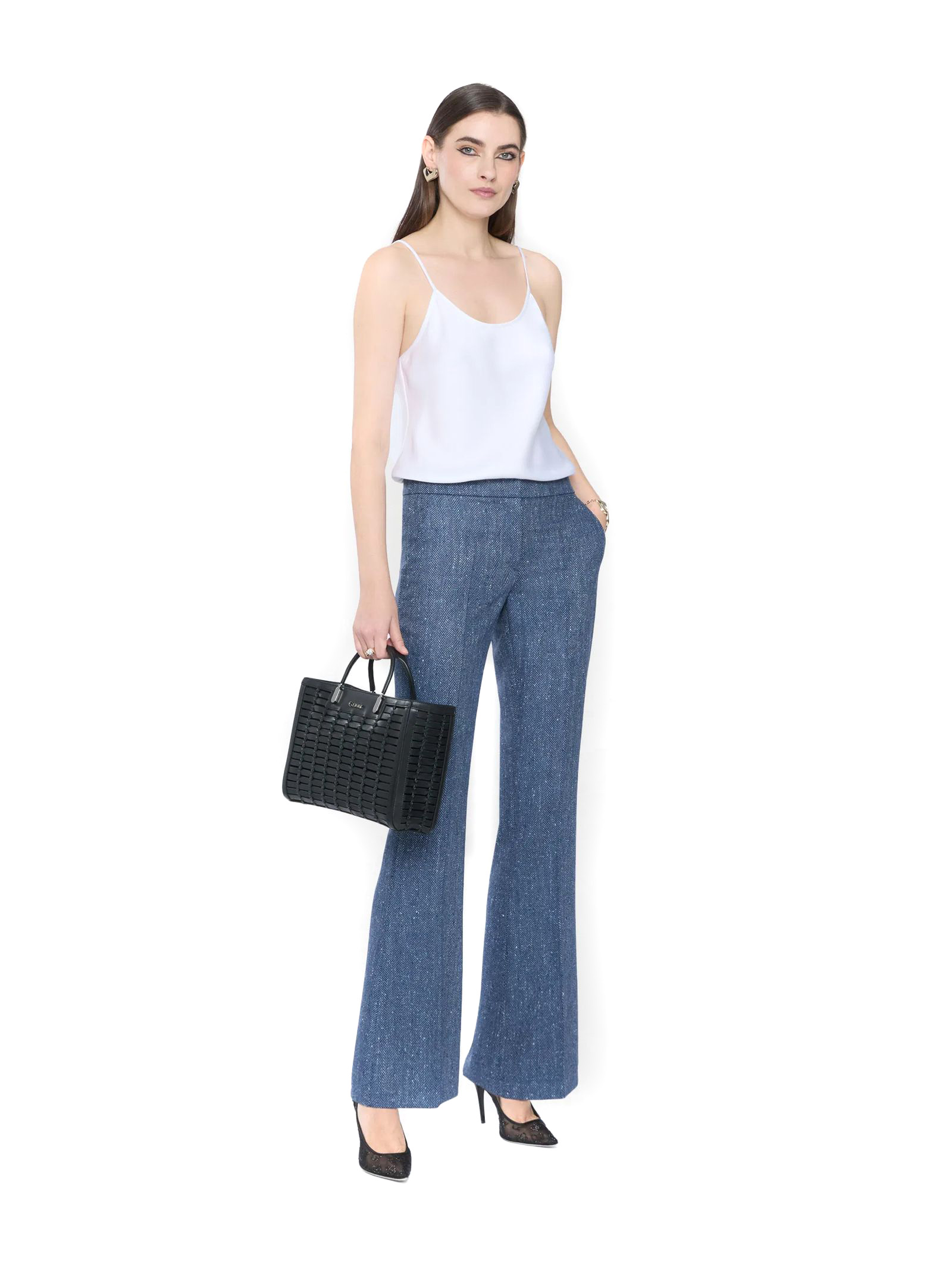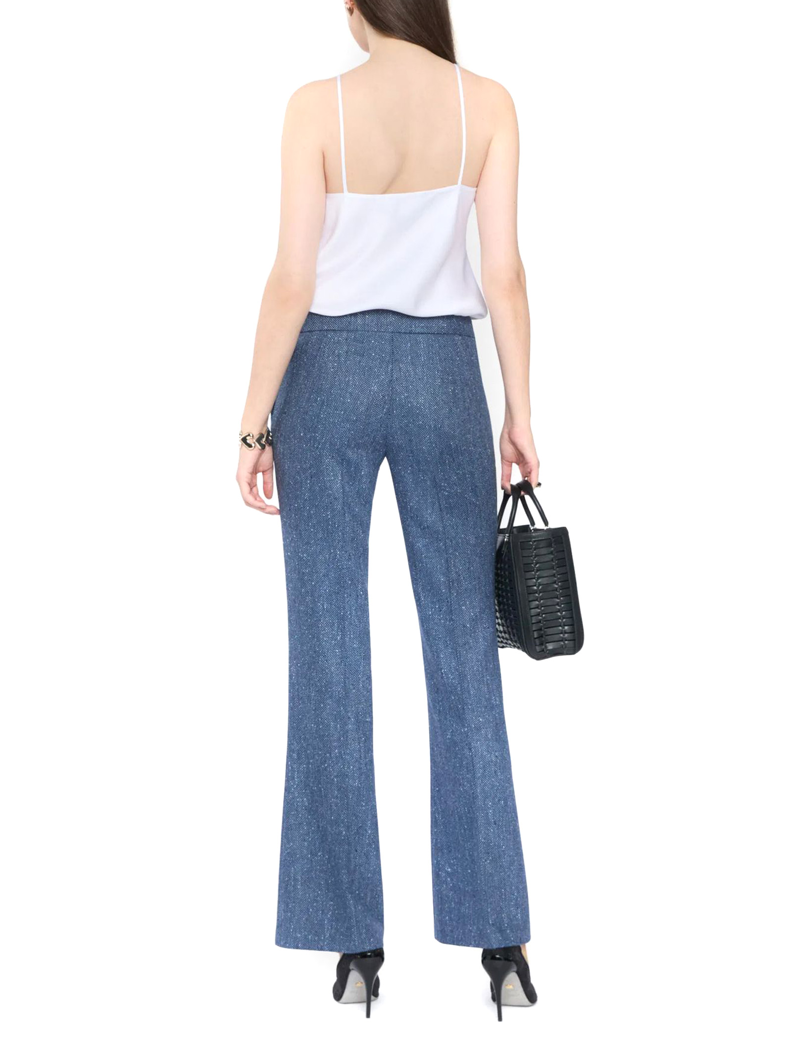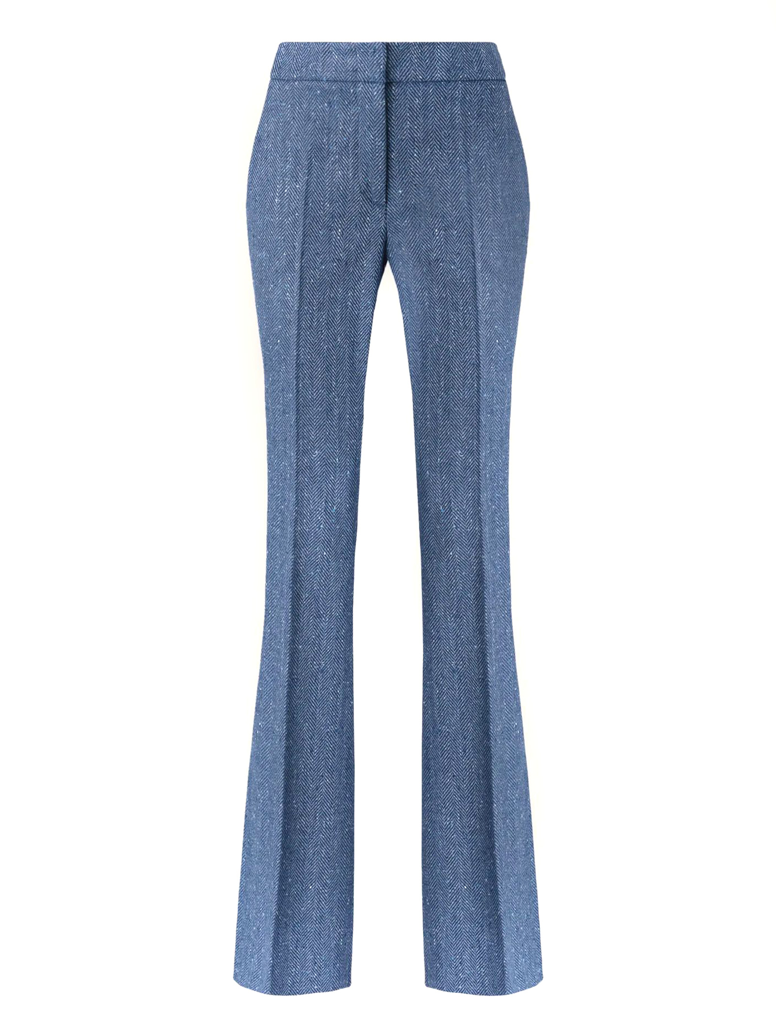 Pantaloni lunghi a gamba dritta, caratterizzati da una vestibilità slim nella parte superiore che si allarga delicatamente verso l'orlo, vita alta e tasche laterali a filetto completano un capo dalla silhouette raffinata e contemporanea.