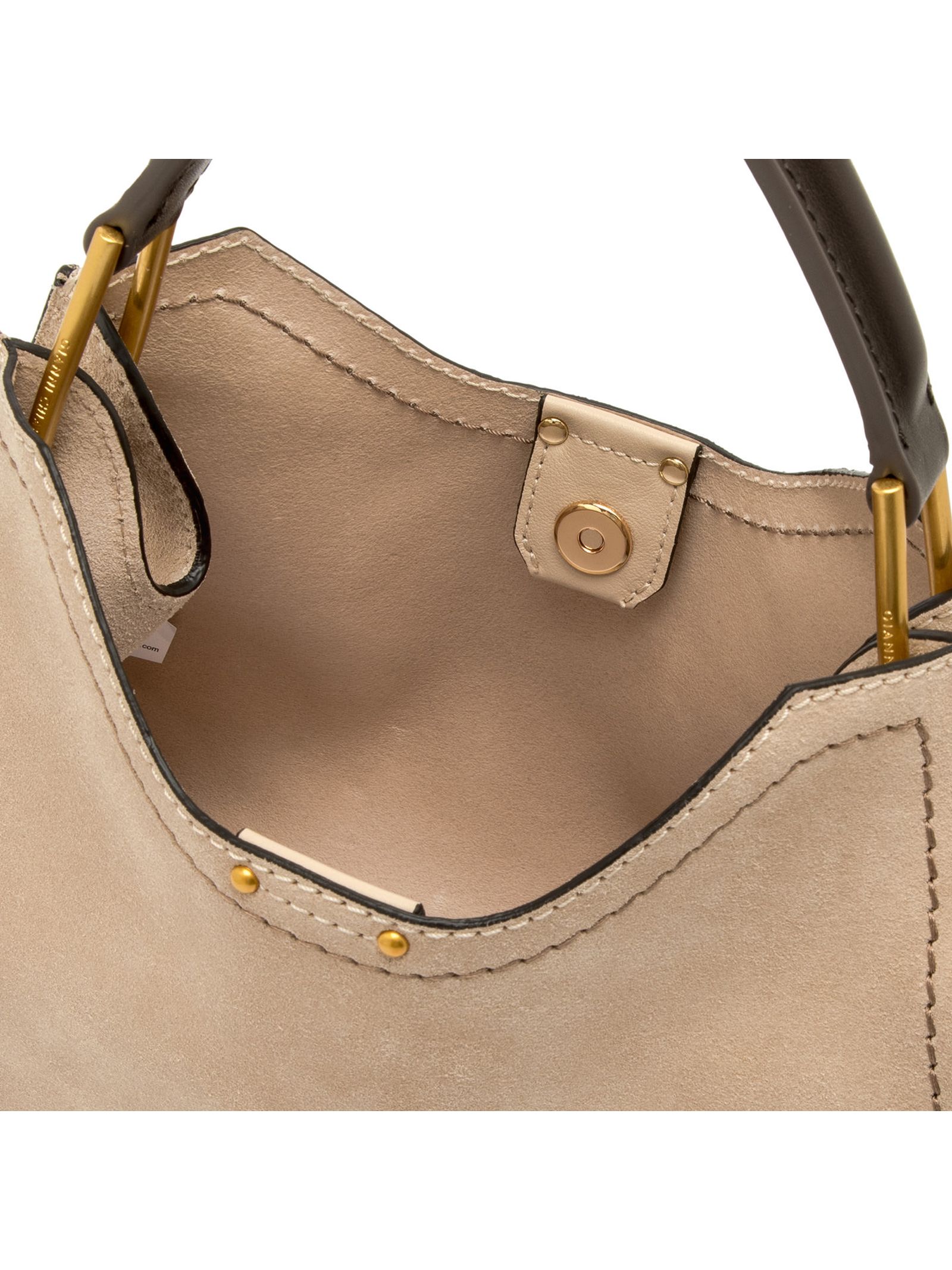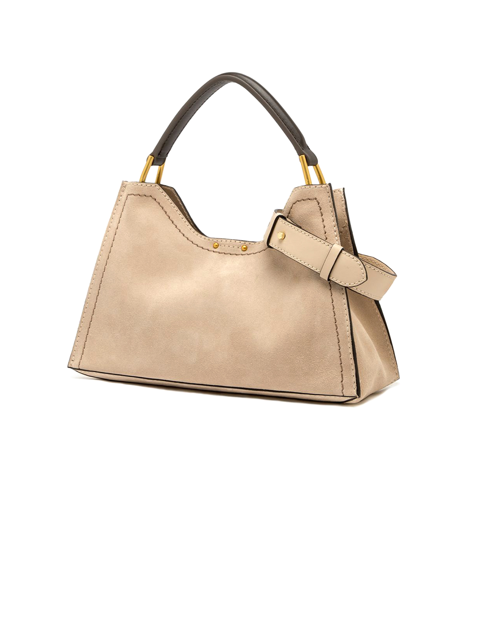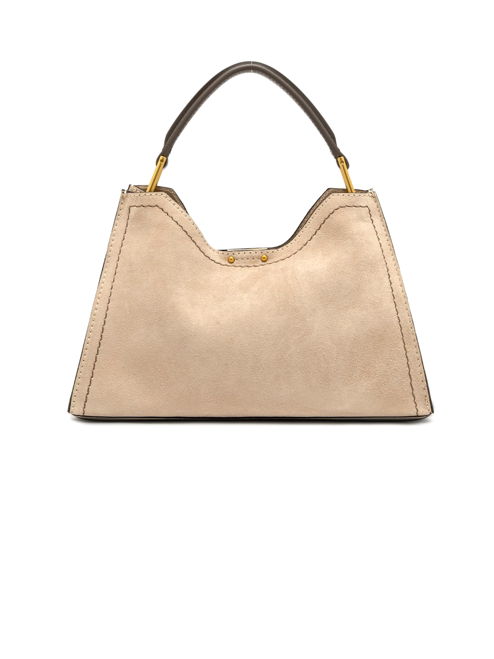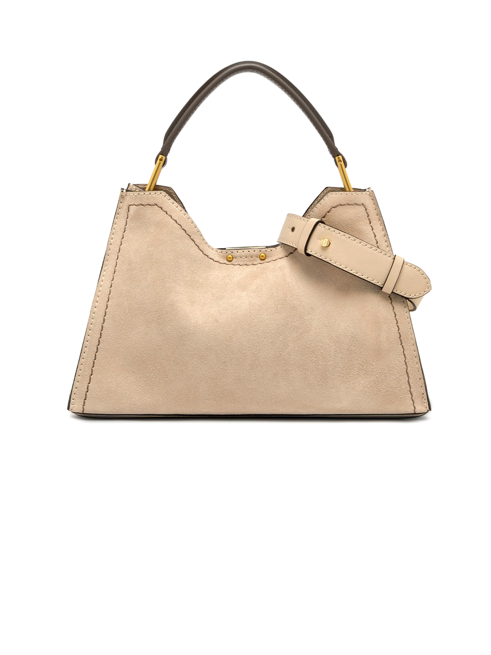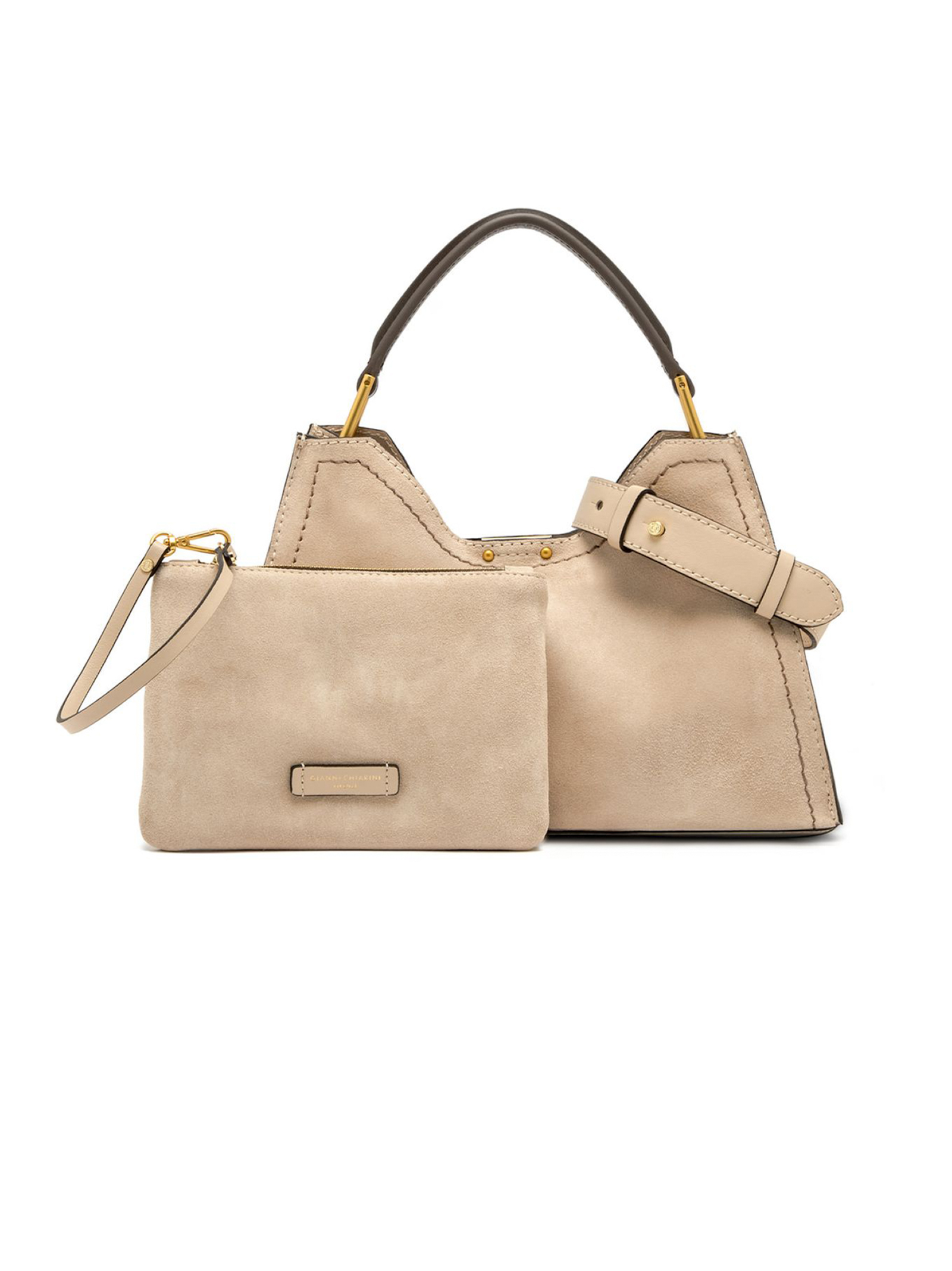 Aurora bag in morbida pelle scamosciata beige, dettagli in metallo e impunture a contrasto, tracolla in pelle regolabile e removibile, pratica pochette con chiusura a zip, chiusura superiore con magnete, dimensioni: 32x22x11 cm