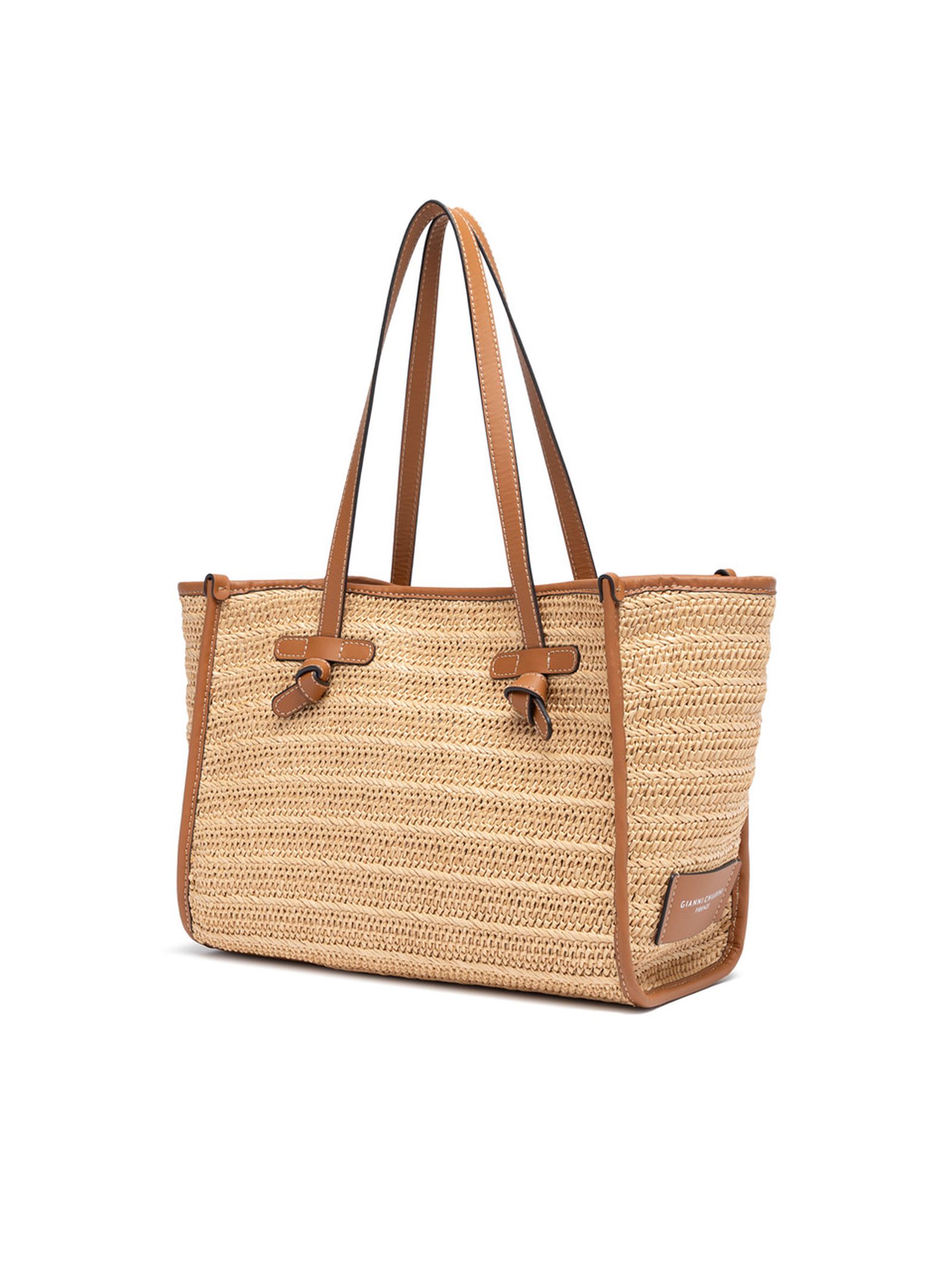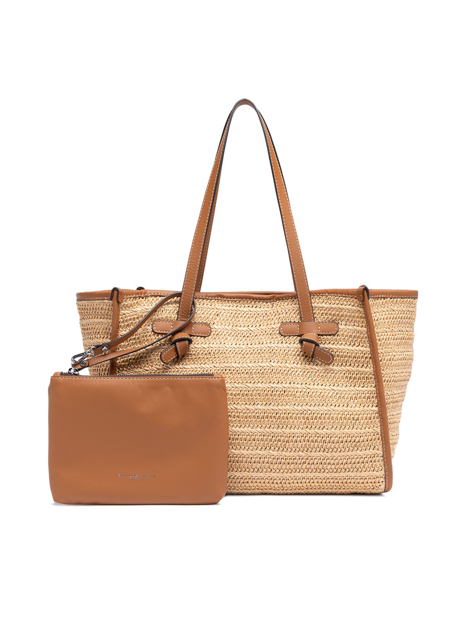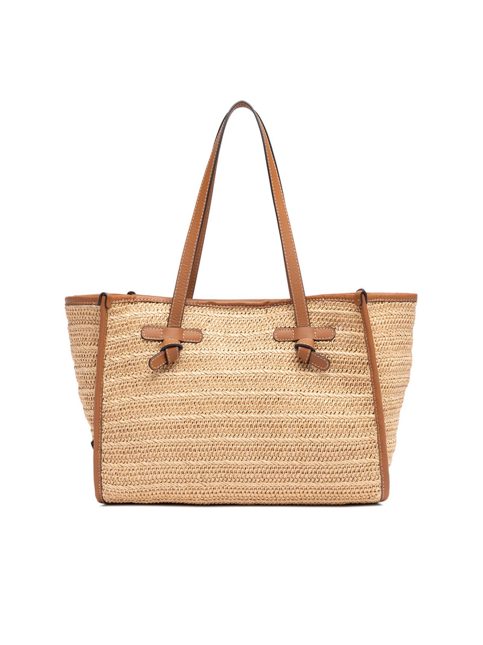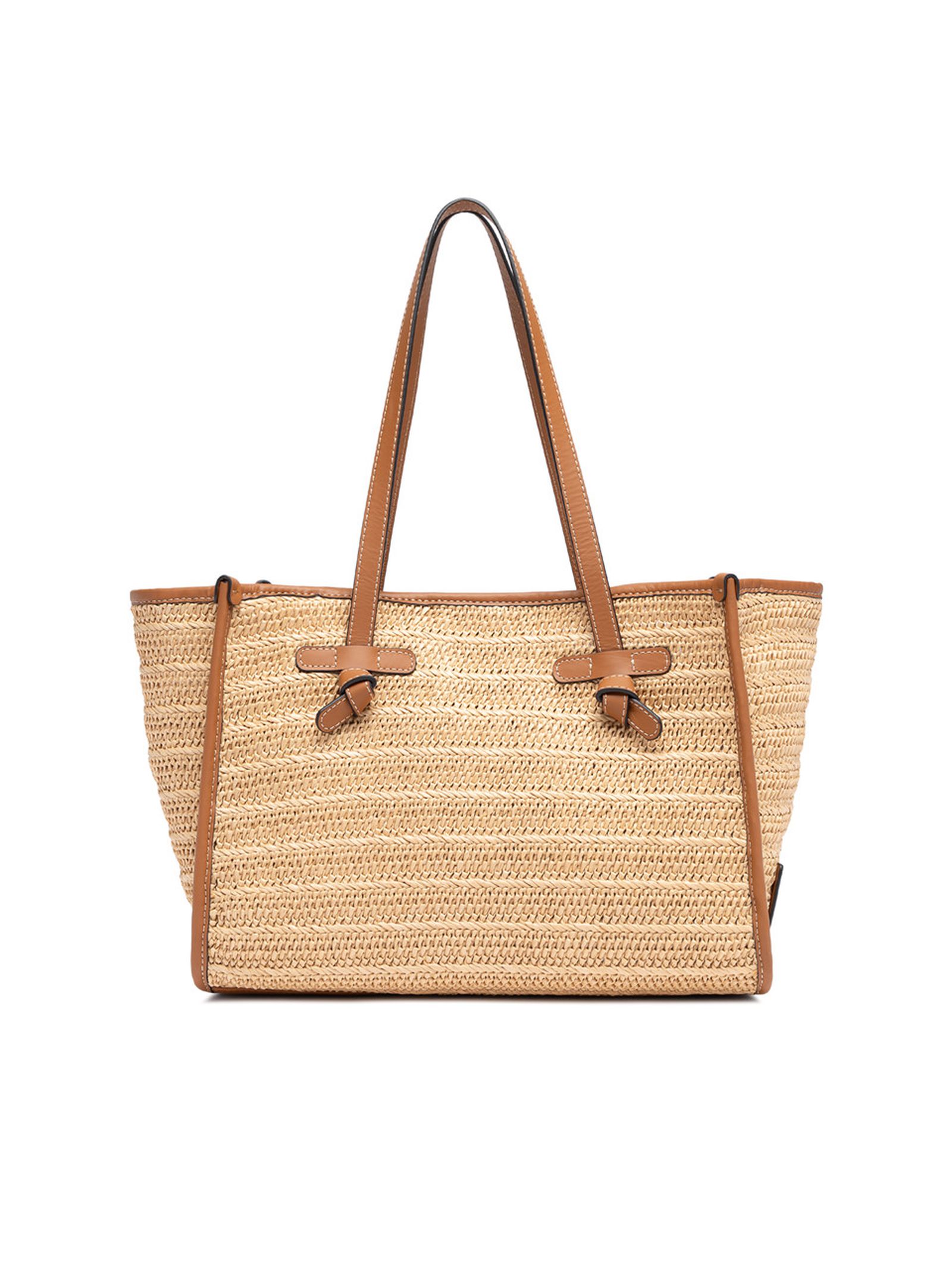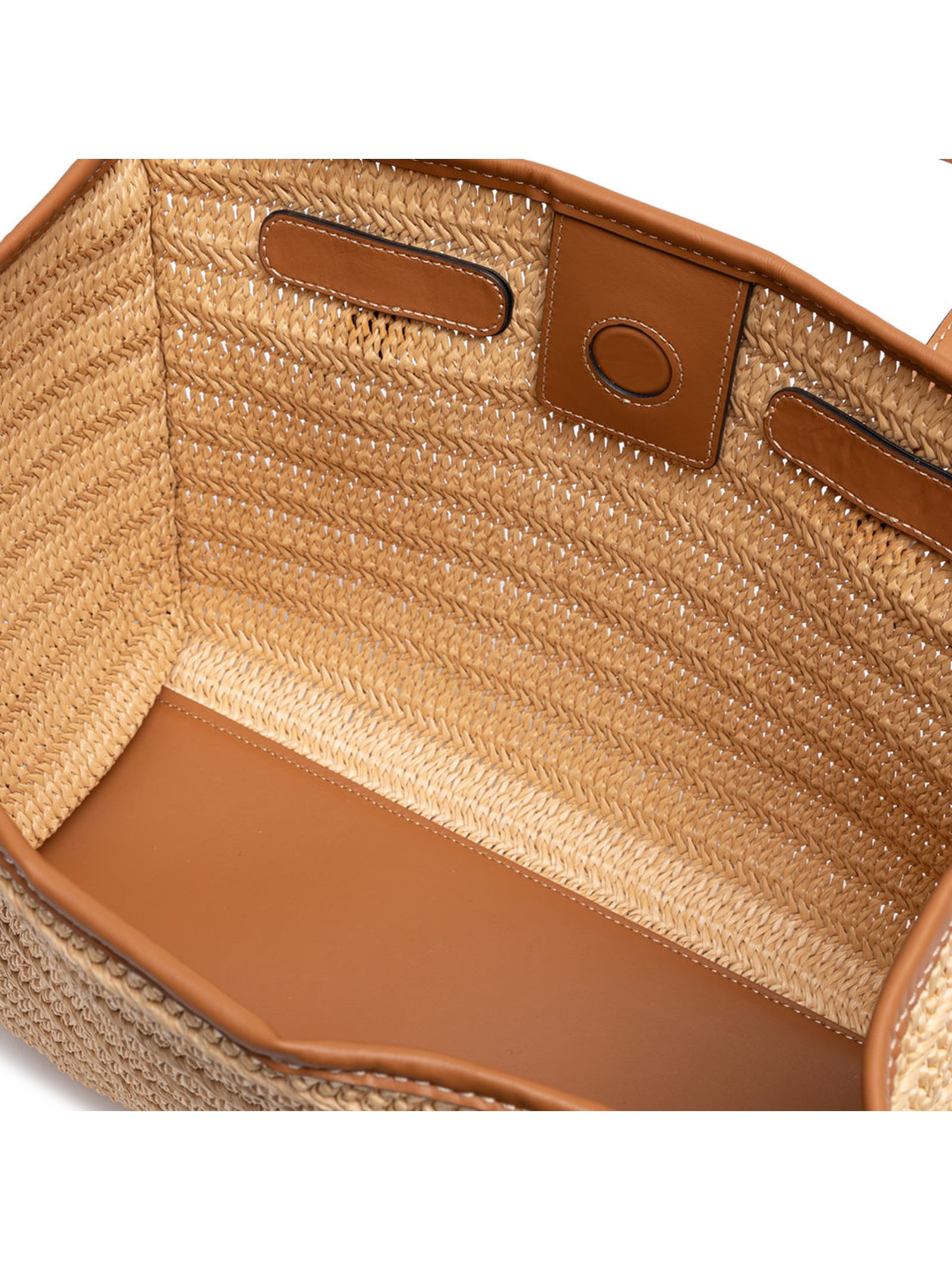 Borsa shopping in rafia effetto paglia beige, rifiniture in pelle e manici tono su tono, sfoderata, tasca interna con zip, Dimensioni: 33x25x13 cm