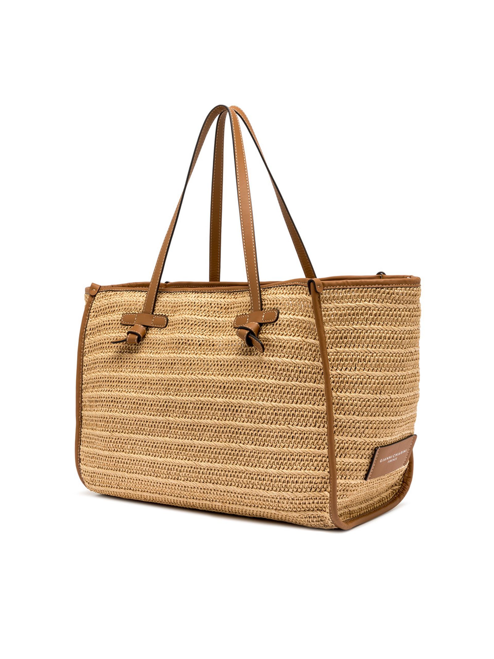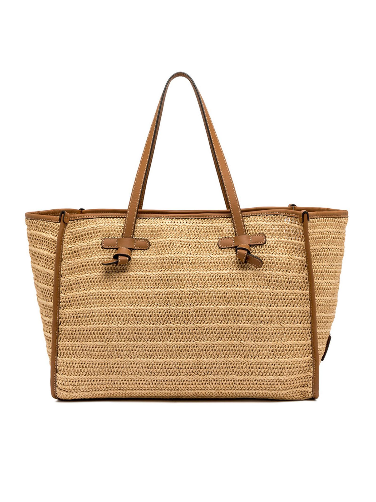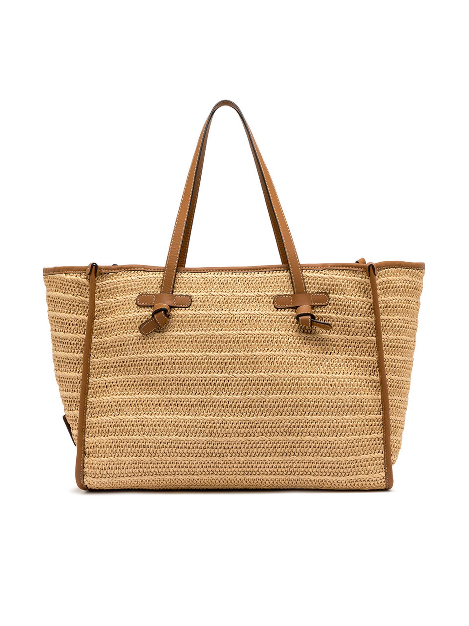 Borsa shopping in rafia effetto paglia beige, rifiniture in pelle e manici tono su tono, sfoderata, tasca interna con zip, Dimensioni: 33x25x13 cm