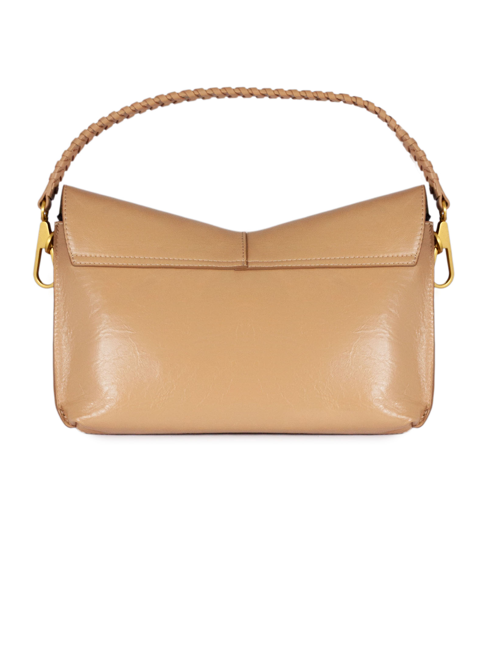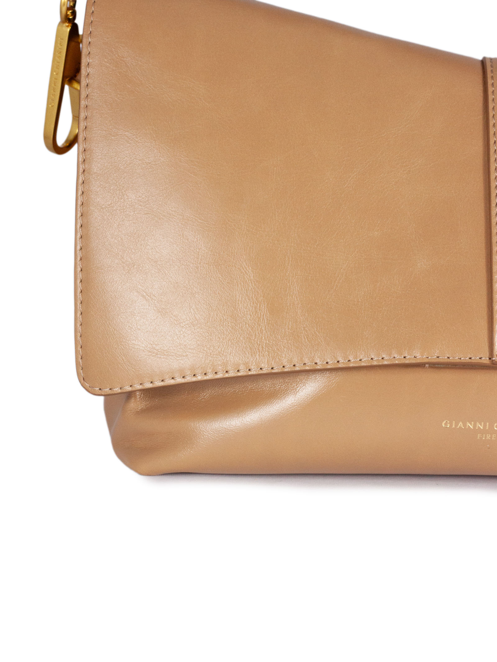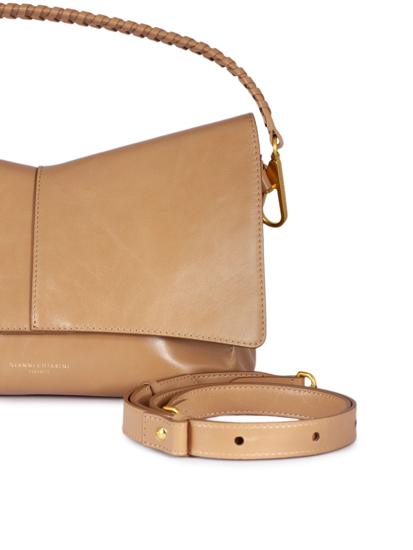 Diva in pelle cerata effetto stropicciato, beige, forma squadrata, chiusura con patta e bottone magnetico, pratico spallotto e tracolla in pelle, dettagli insellatura della patta, dimensioni: 29x23x11 cm
