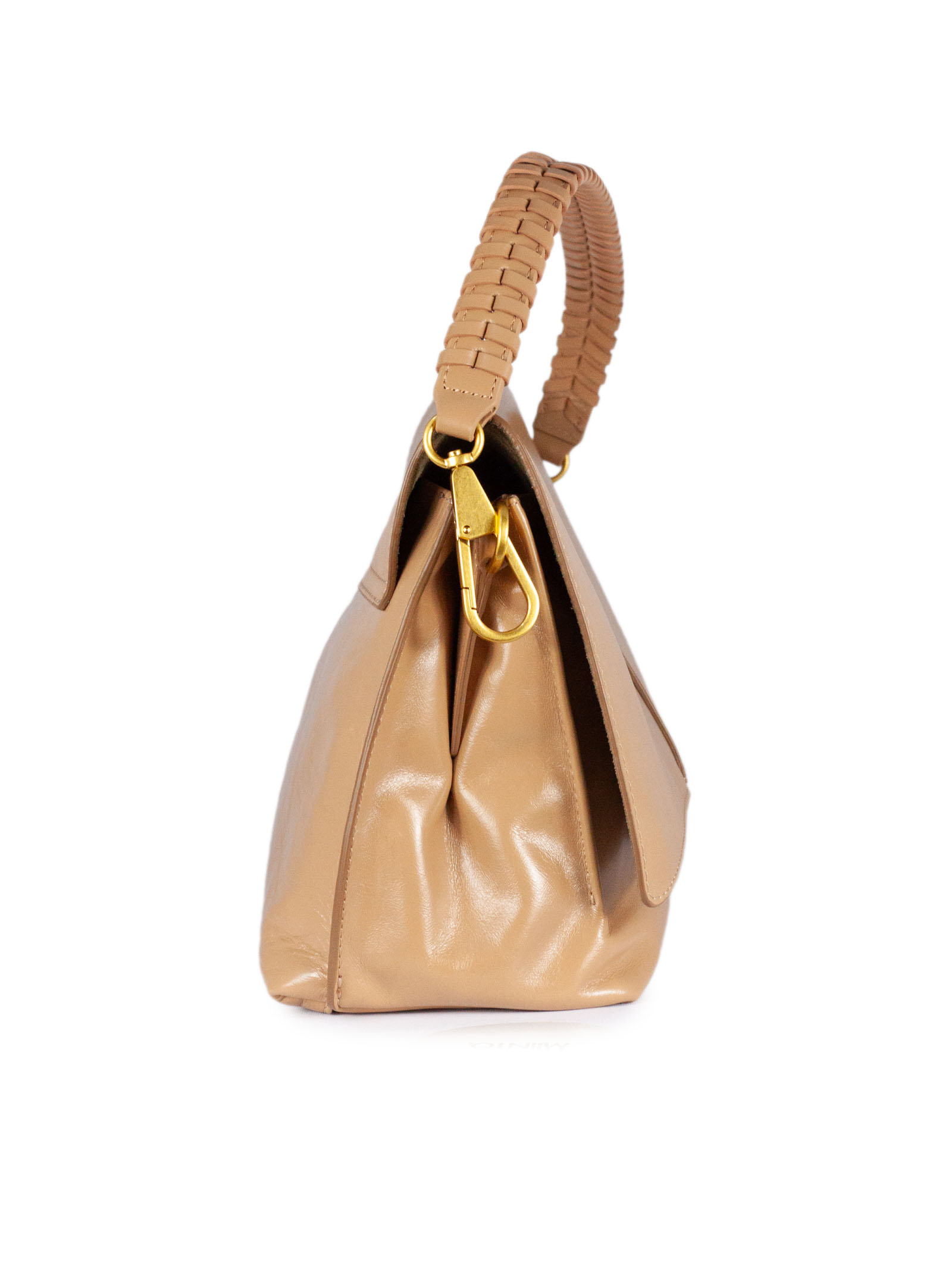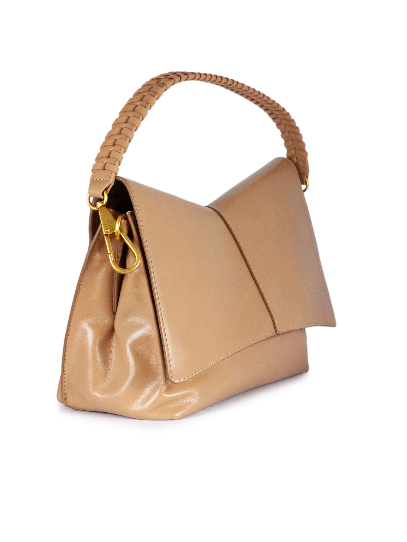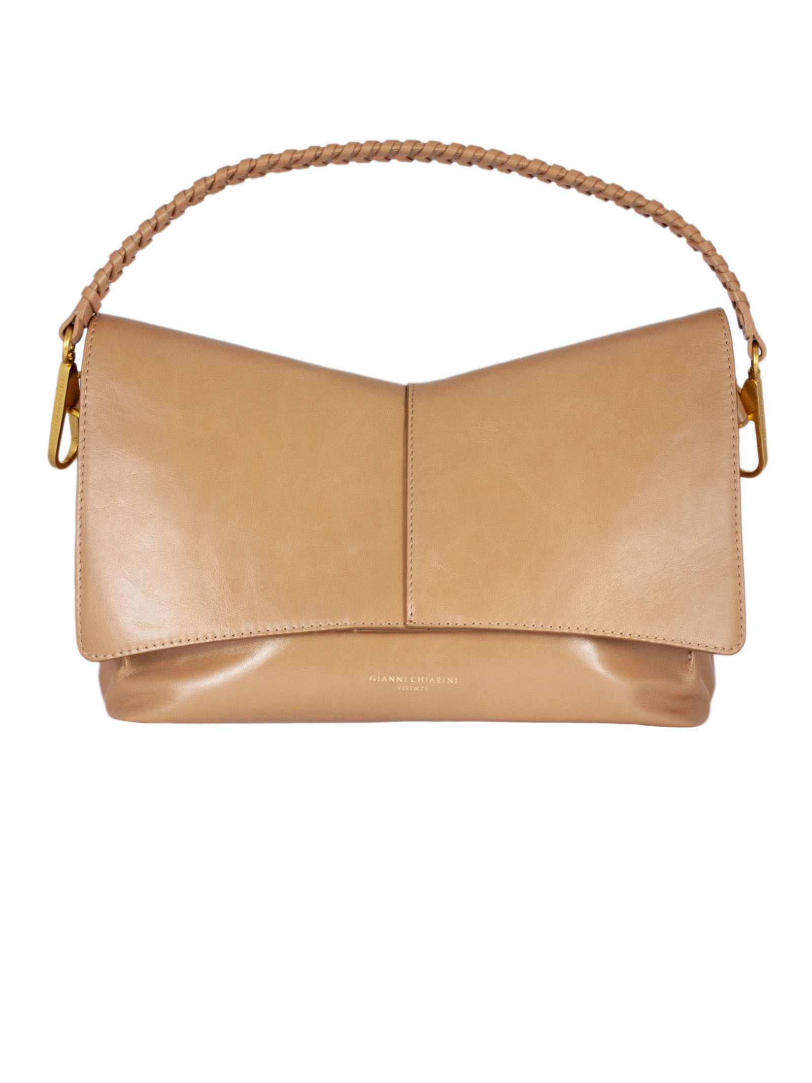 Diva in pelle cerata effetto stropicciato, beige, forma squadrata, chiusura con patta e bottone magnetico, pratico spallotto e tracolla in pelle, dettagli insellatura della patta, dimensioni: 29x23x11 cm