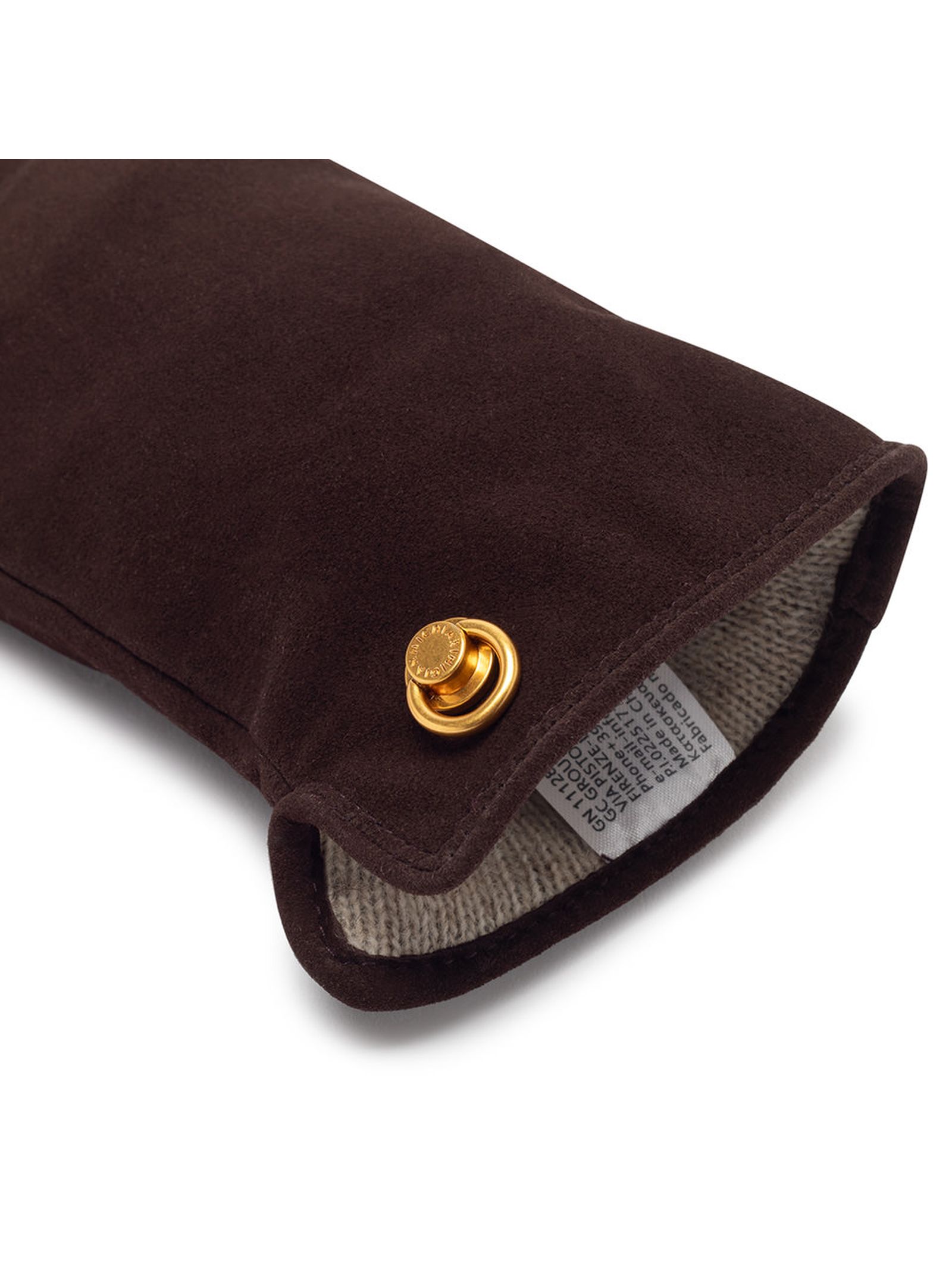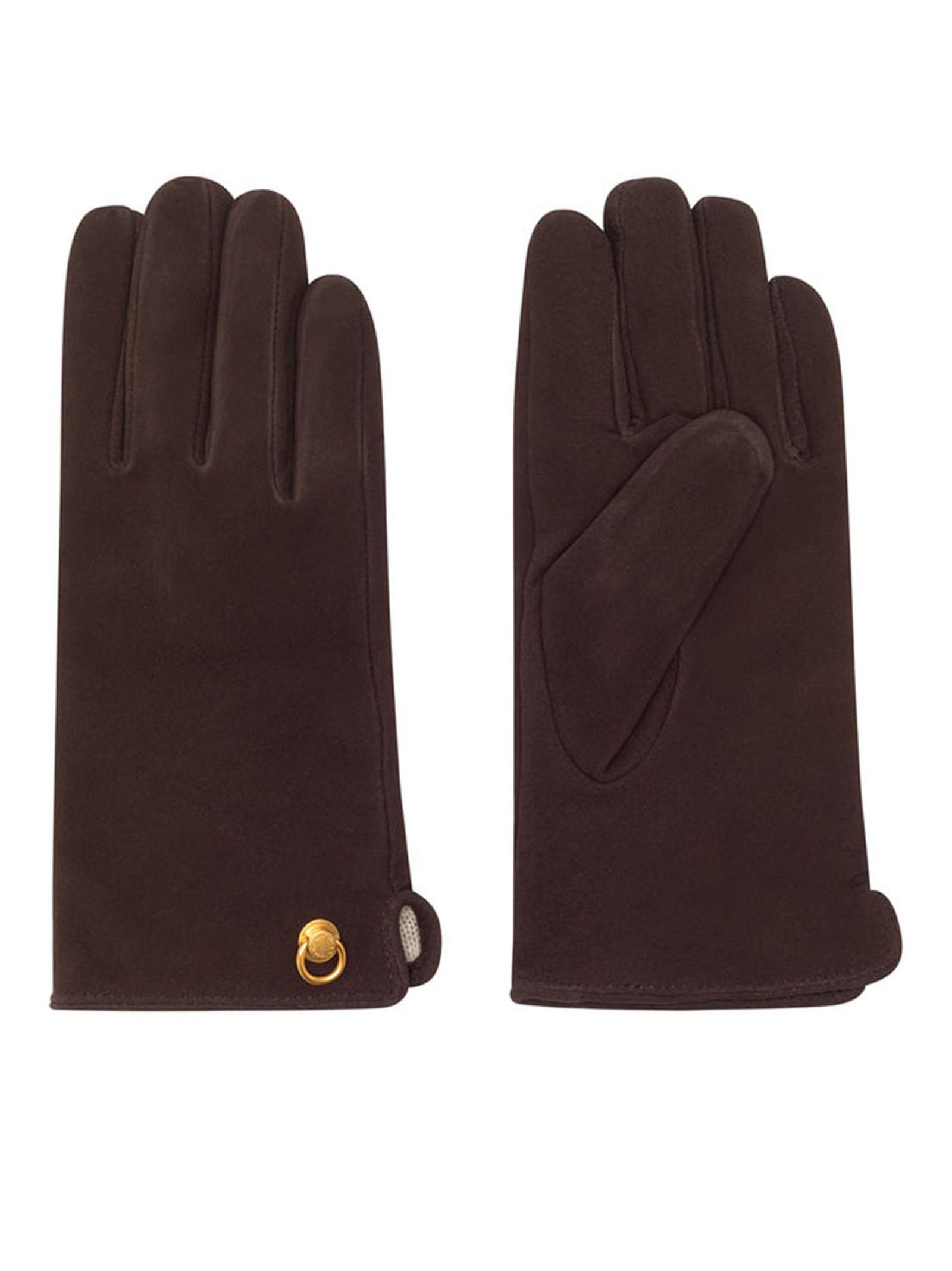 Guanti in morbido camoscio marrone scuro, foderati con soffice lana, anellino color oro e rivetto logato