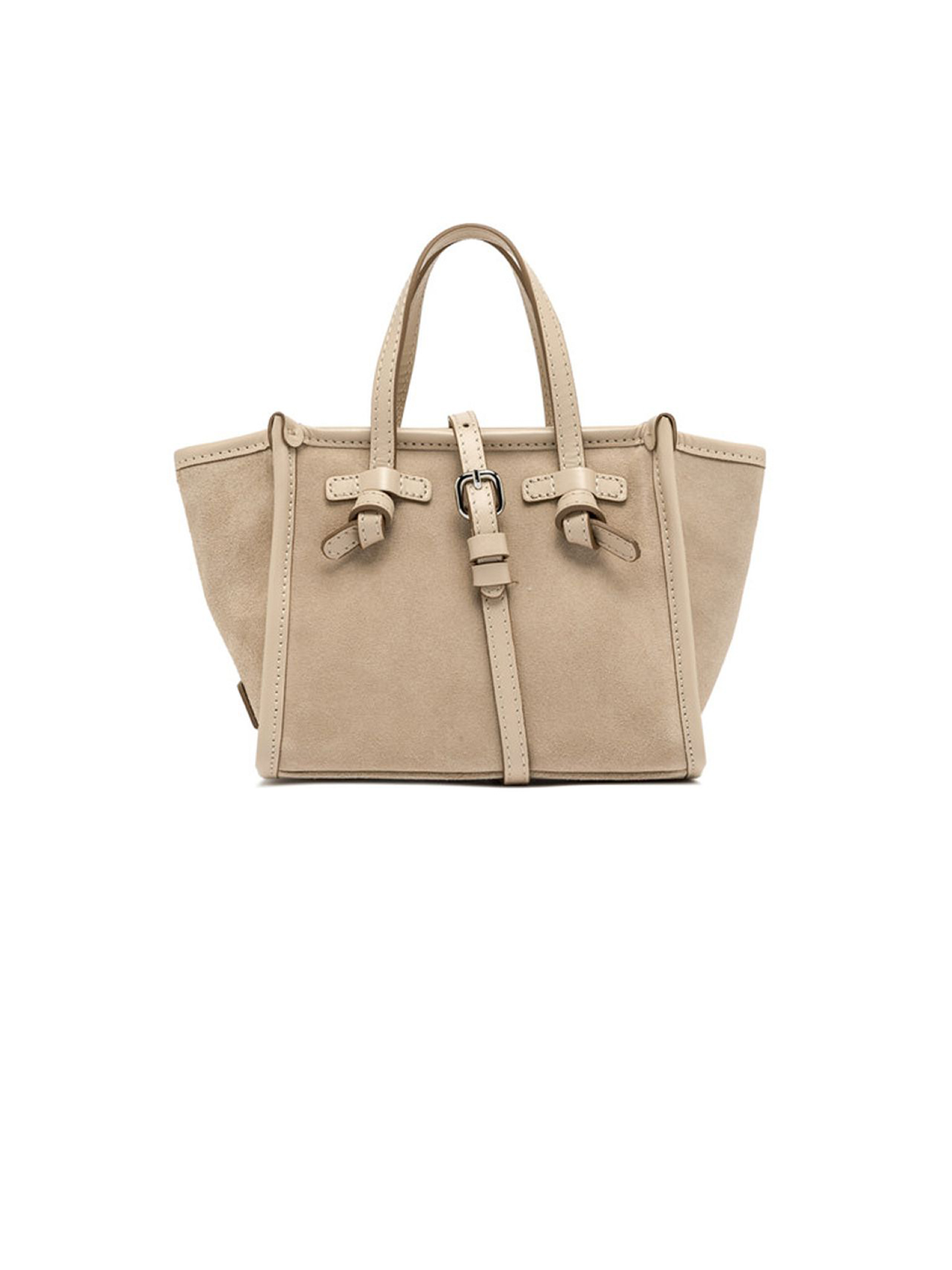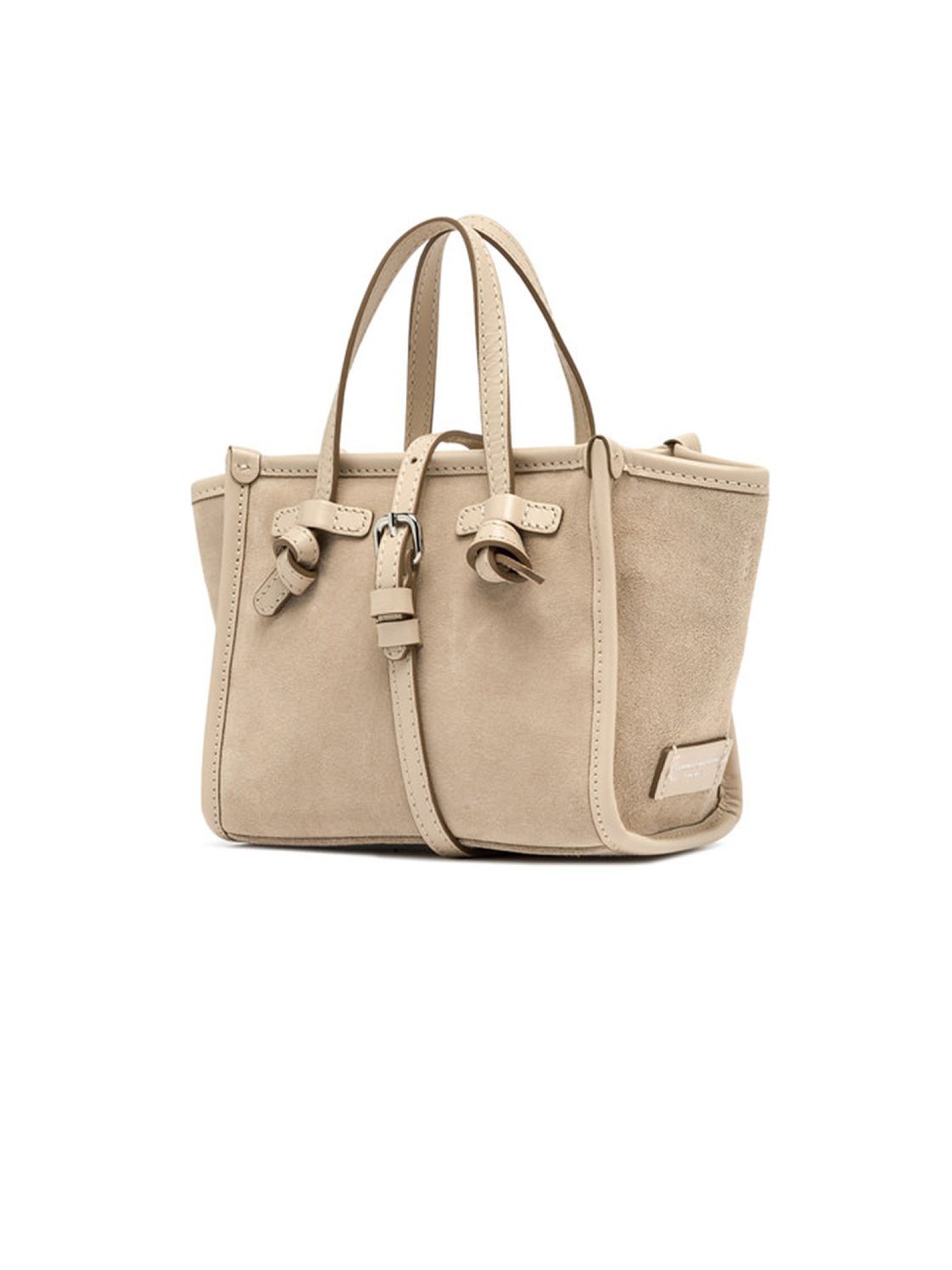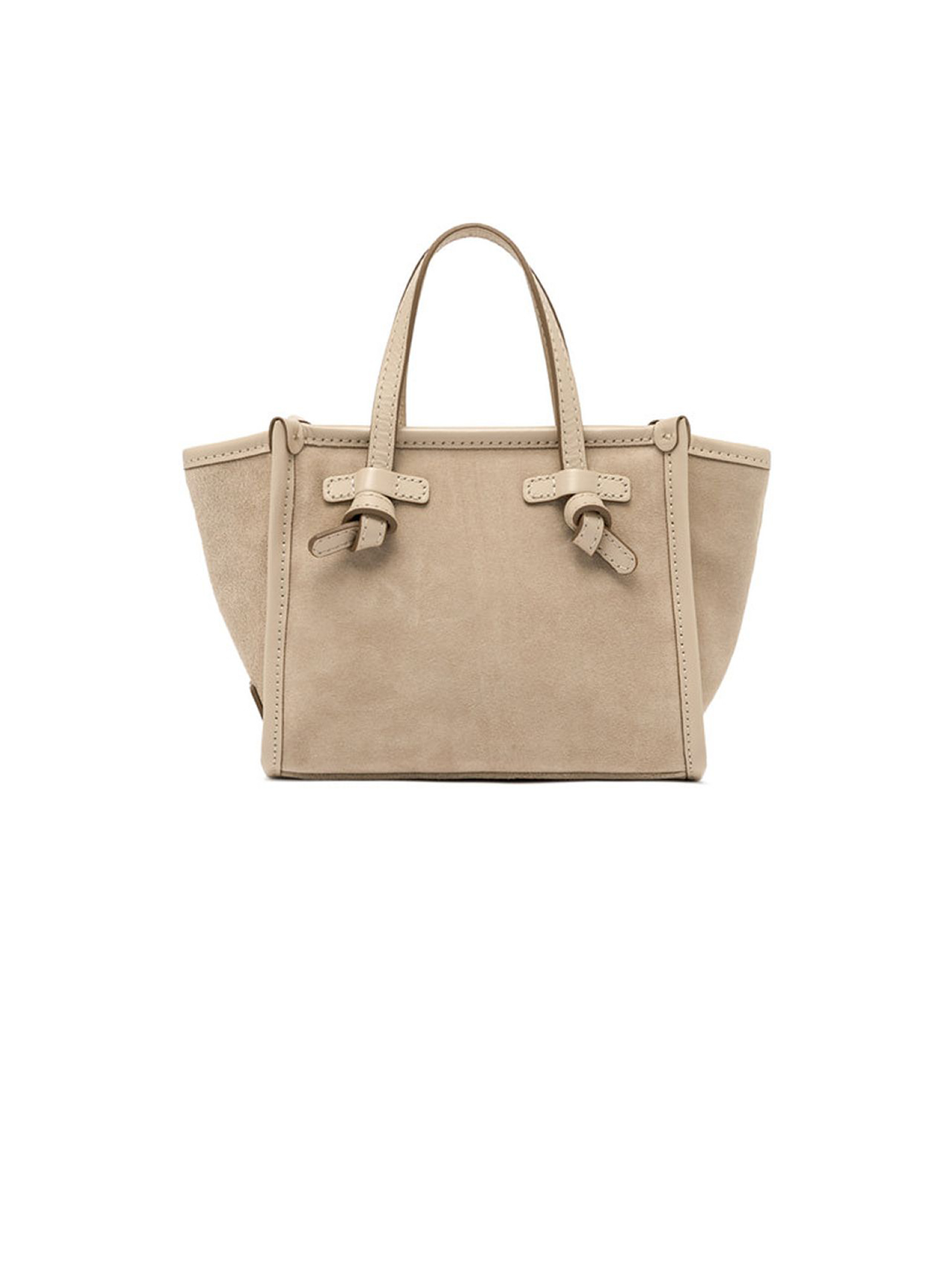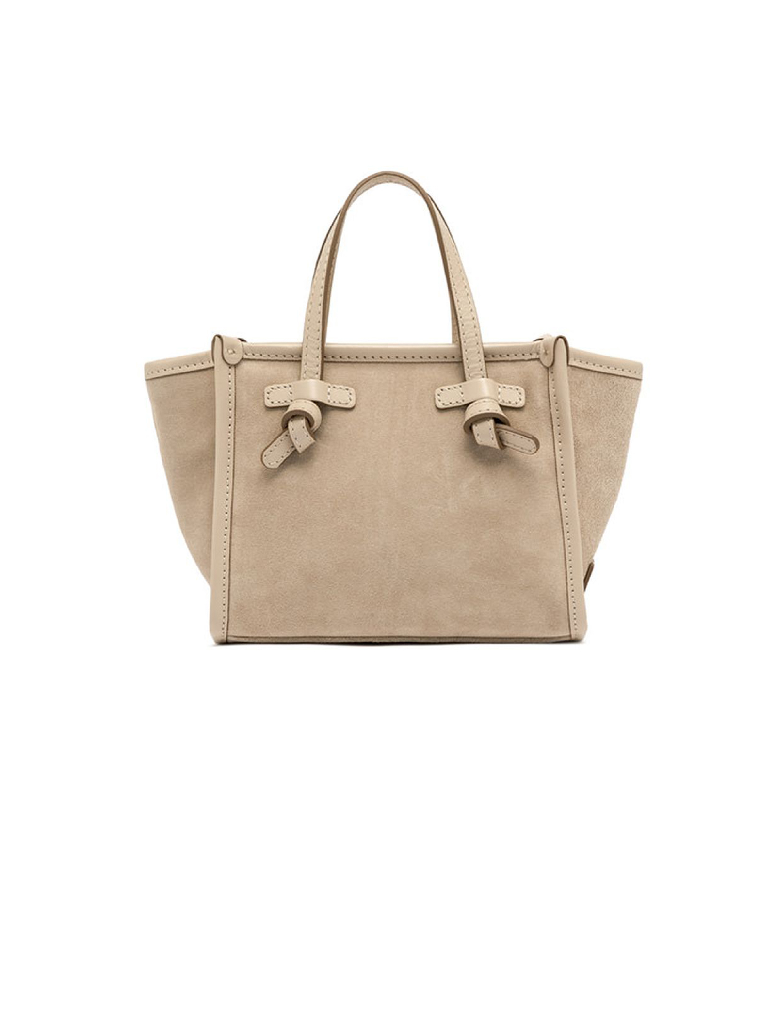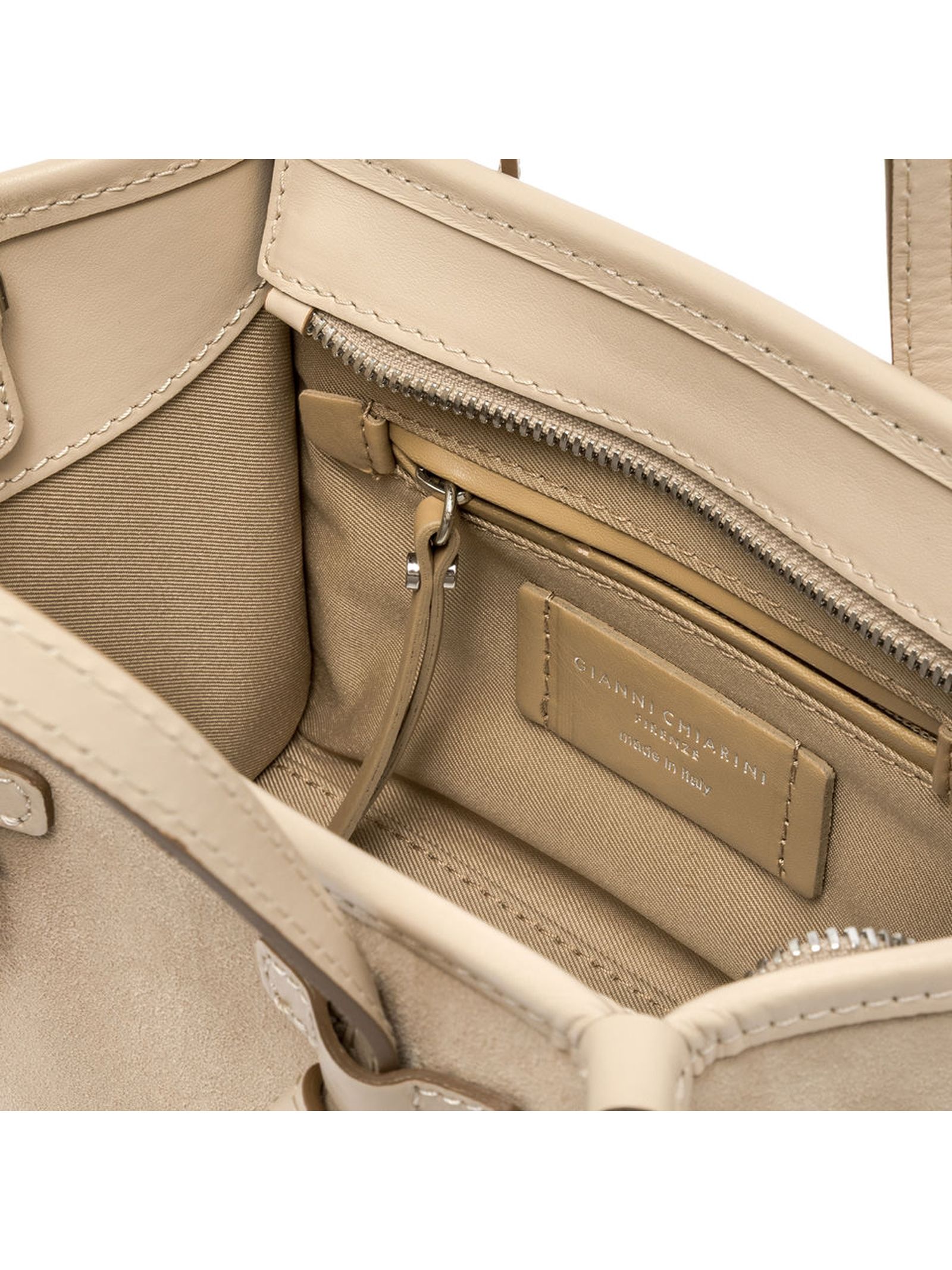 Miss Marcella in pelle scamosciata beige, finiture in pelle liscia, tracolla in tono, Dimensioni: 19x15x10 cm
