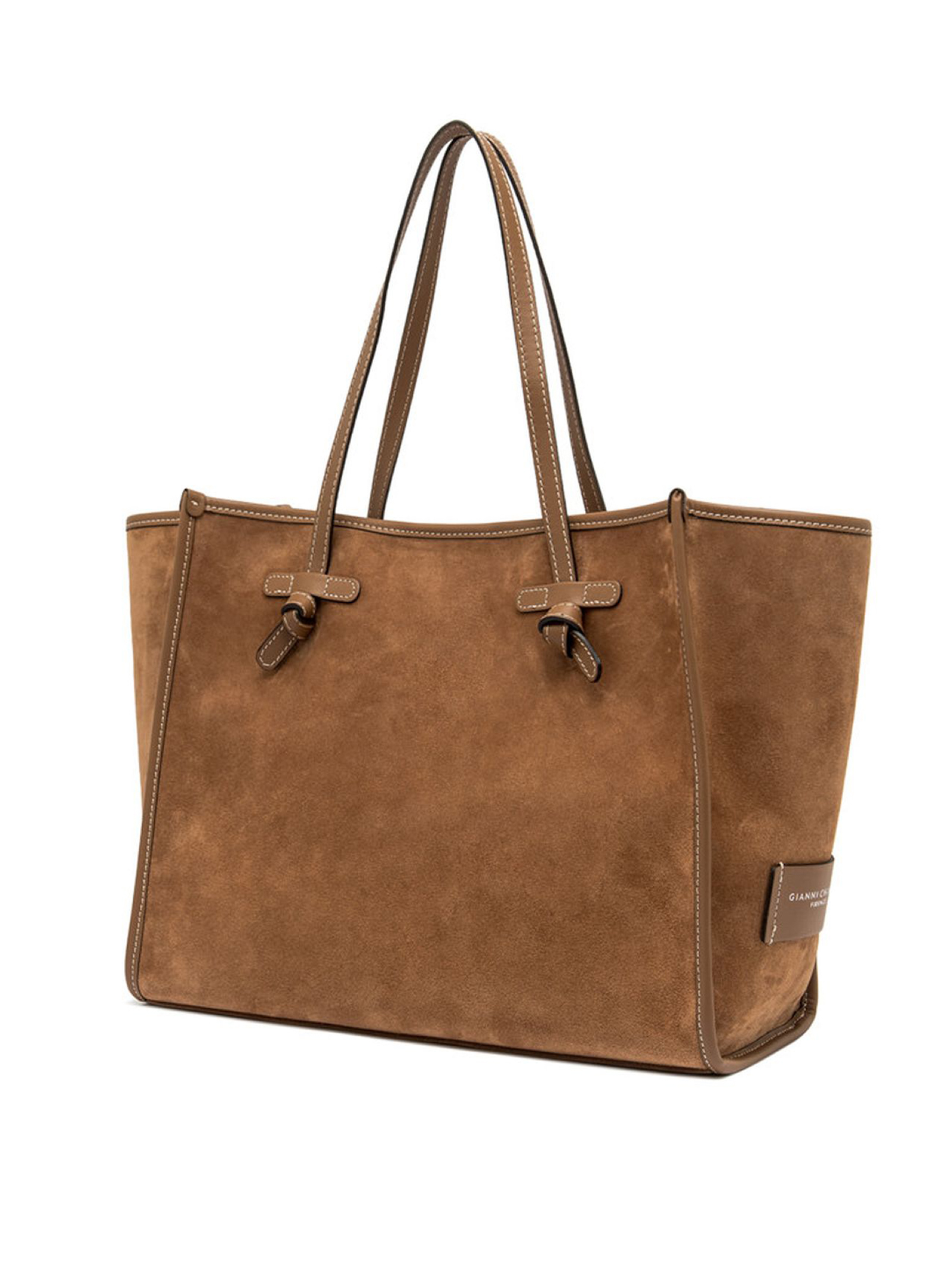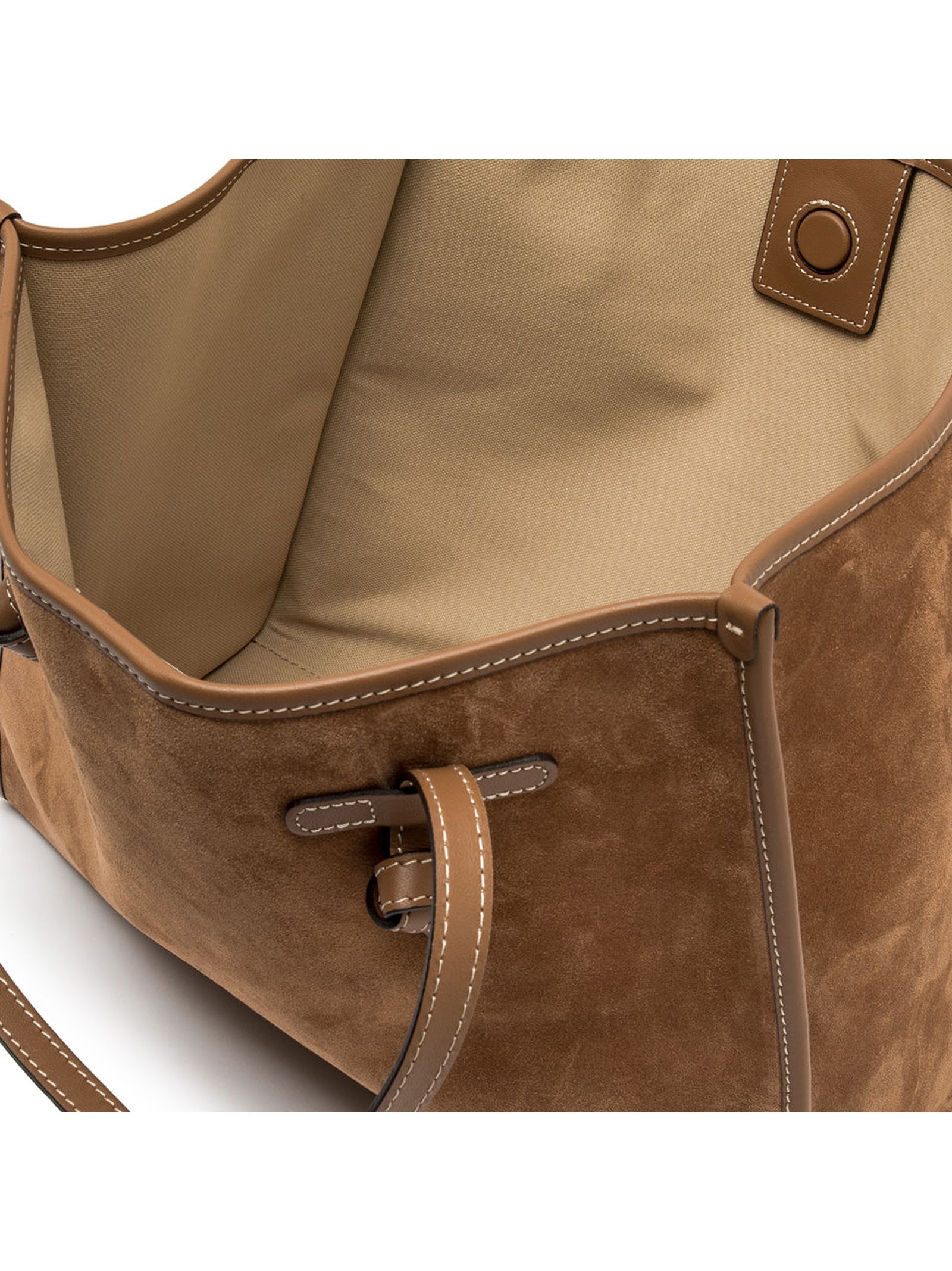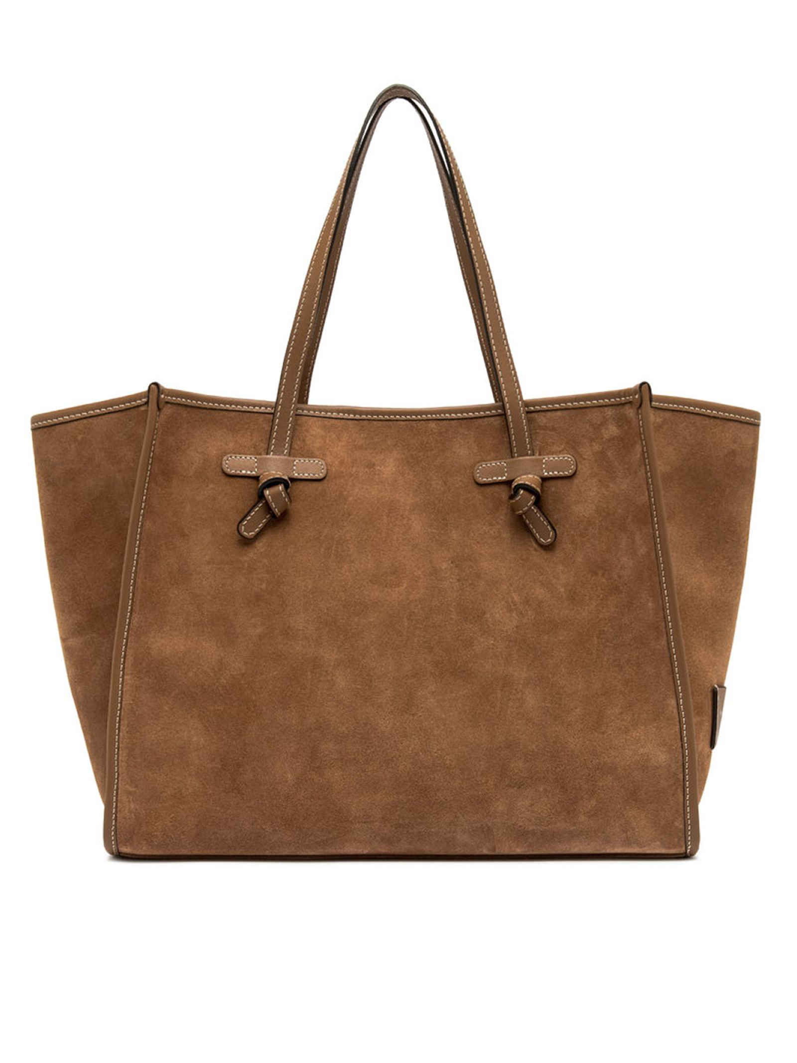 Shopping Marcella in morbida pelle scamosciata marrone dotata di manici in pelle e di una pratica chiusura tramite magnete, fodera interna, pochette coordinata in pelle, tono su tono con le rifiniture, Dimensioni: 38x31x16 cm