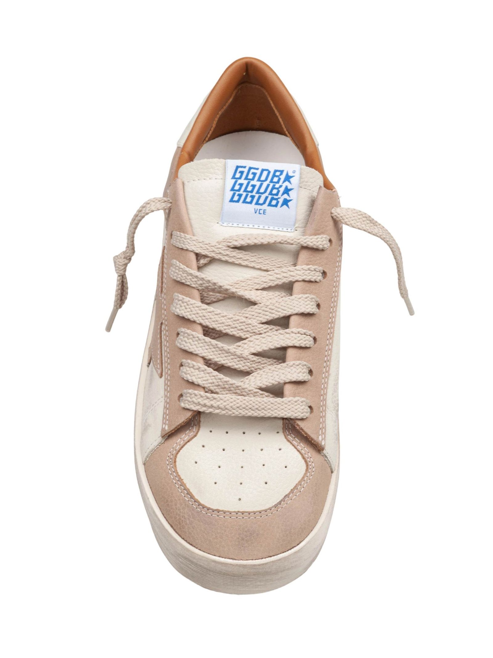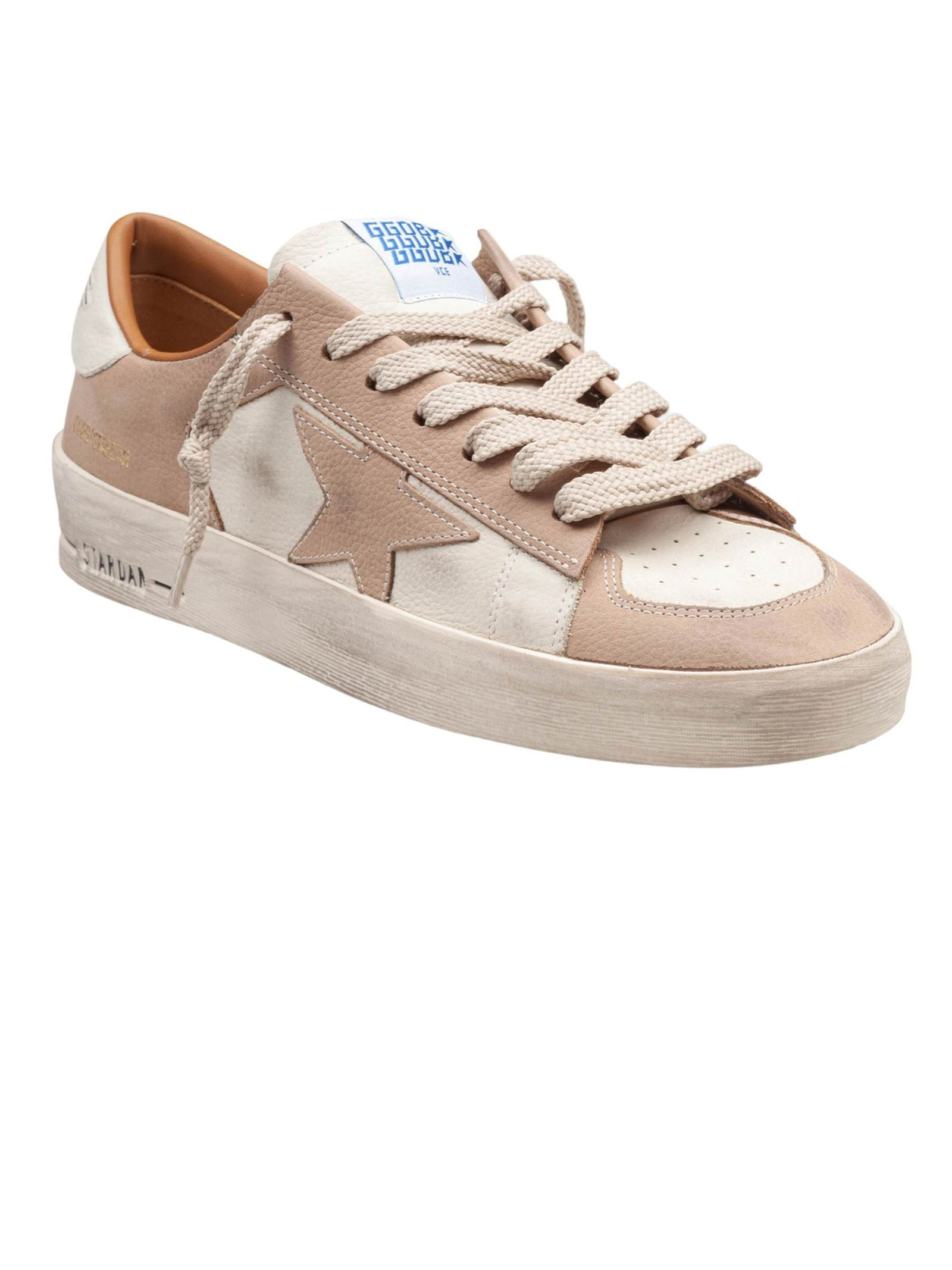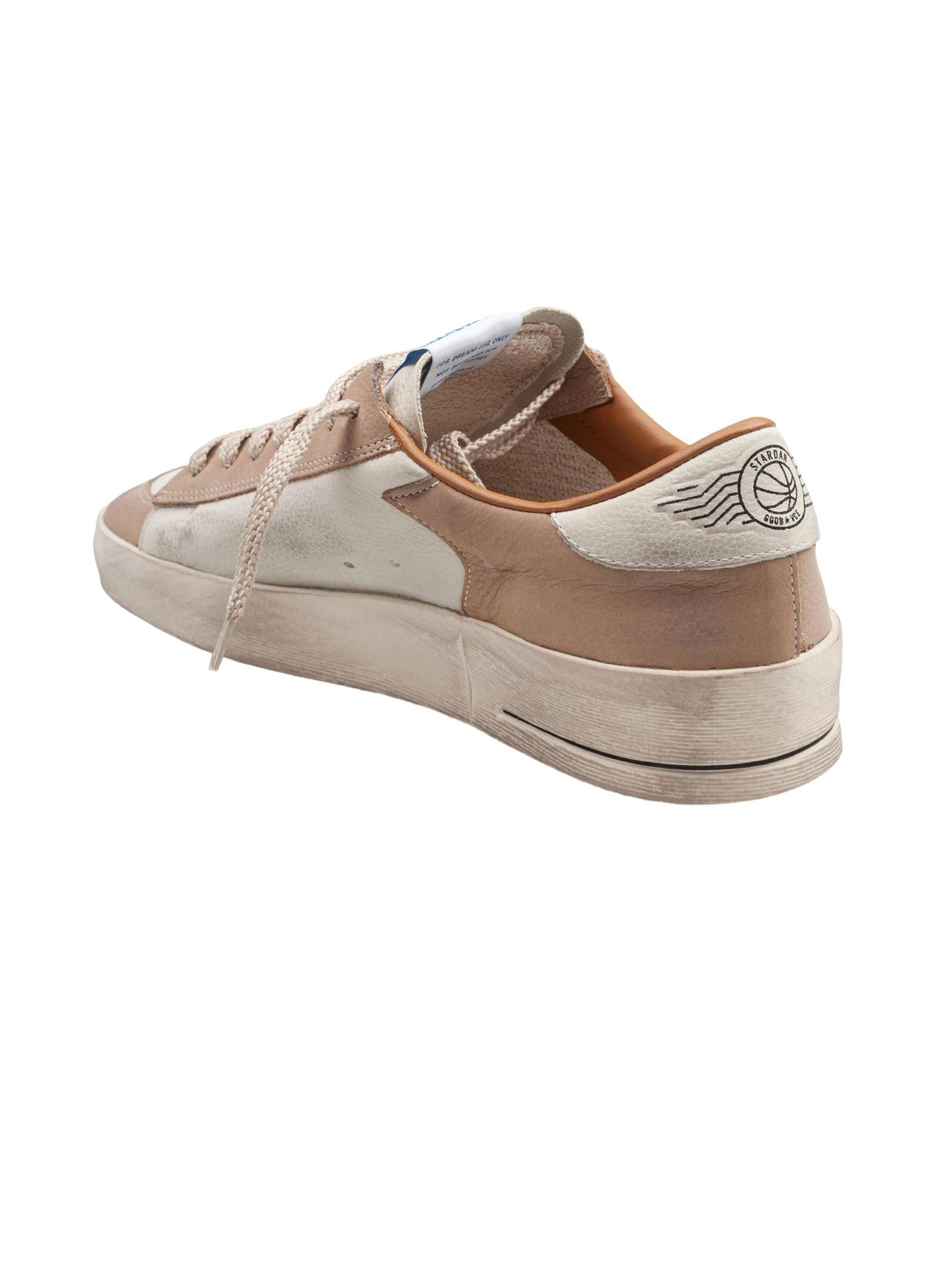 Sneaker Stardan in pelle bianco sporco e beige con stella in pelle beige e talloncino bianco, Inserto asimmetrico in pelle, Lacci color beige, Trattamento vintage