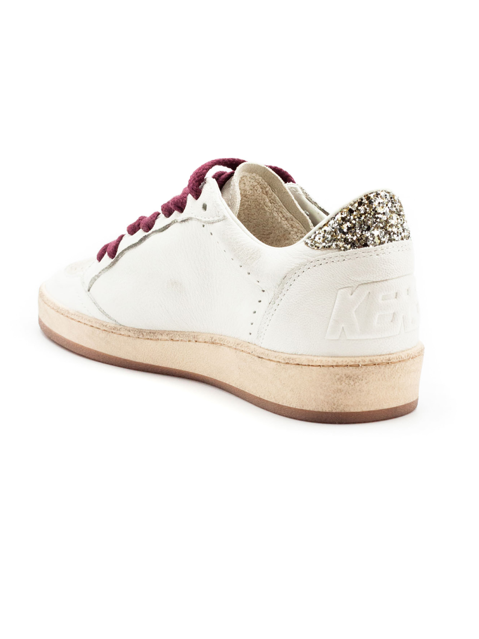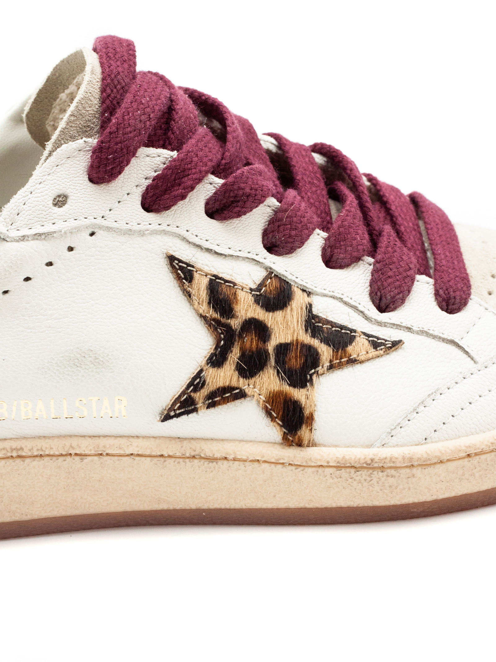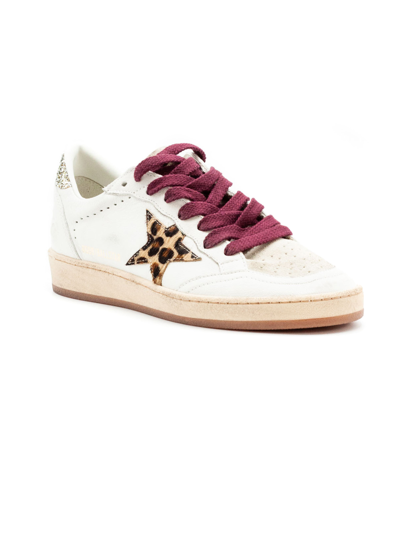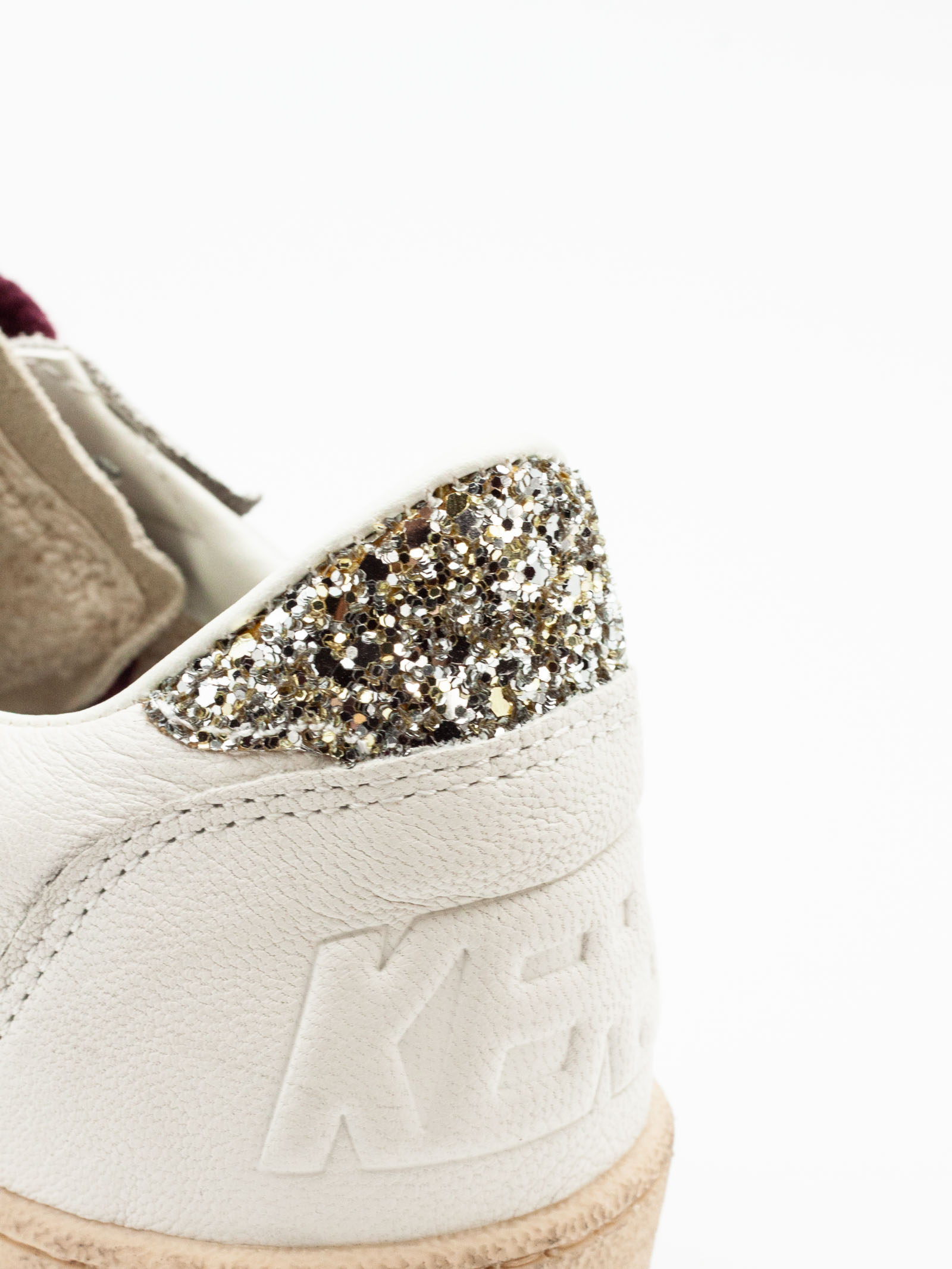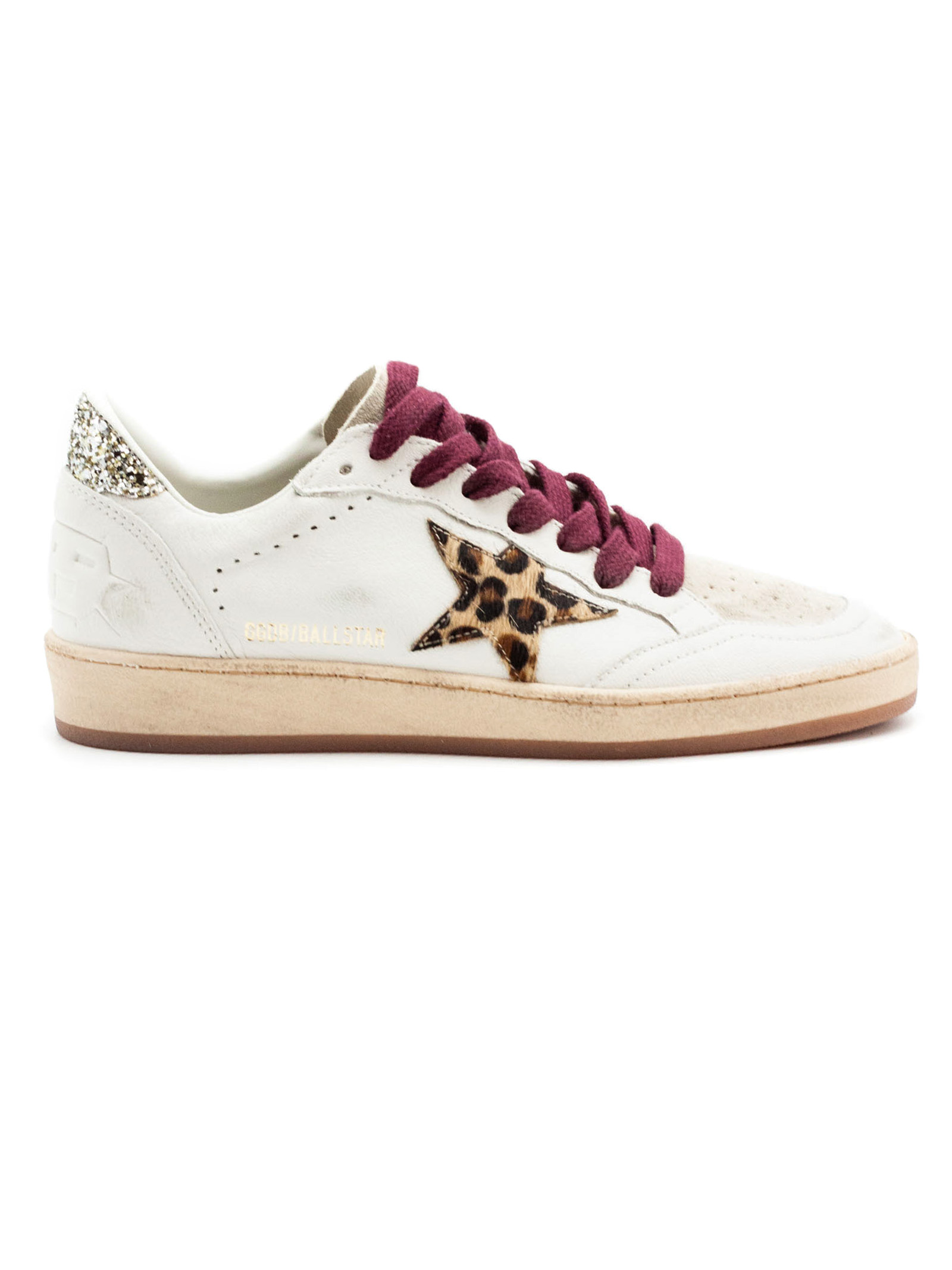 Sneakers in pelle bianco, tacco glitter, inserti in pelle scamosciata, applicazione con stampa animalier, suola in gomma