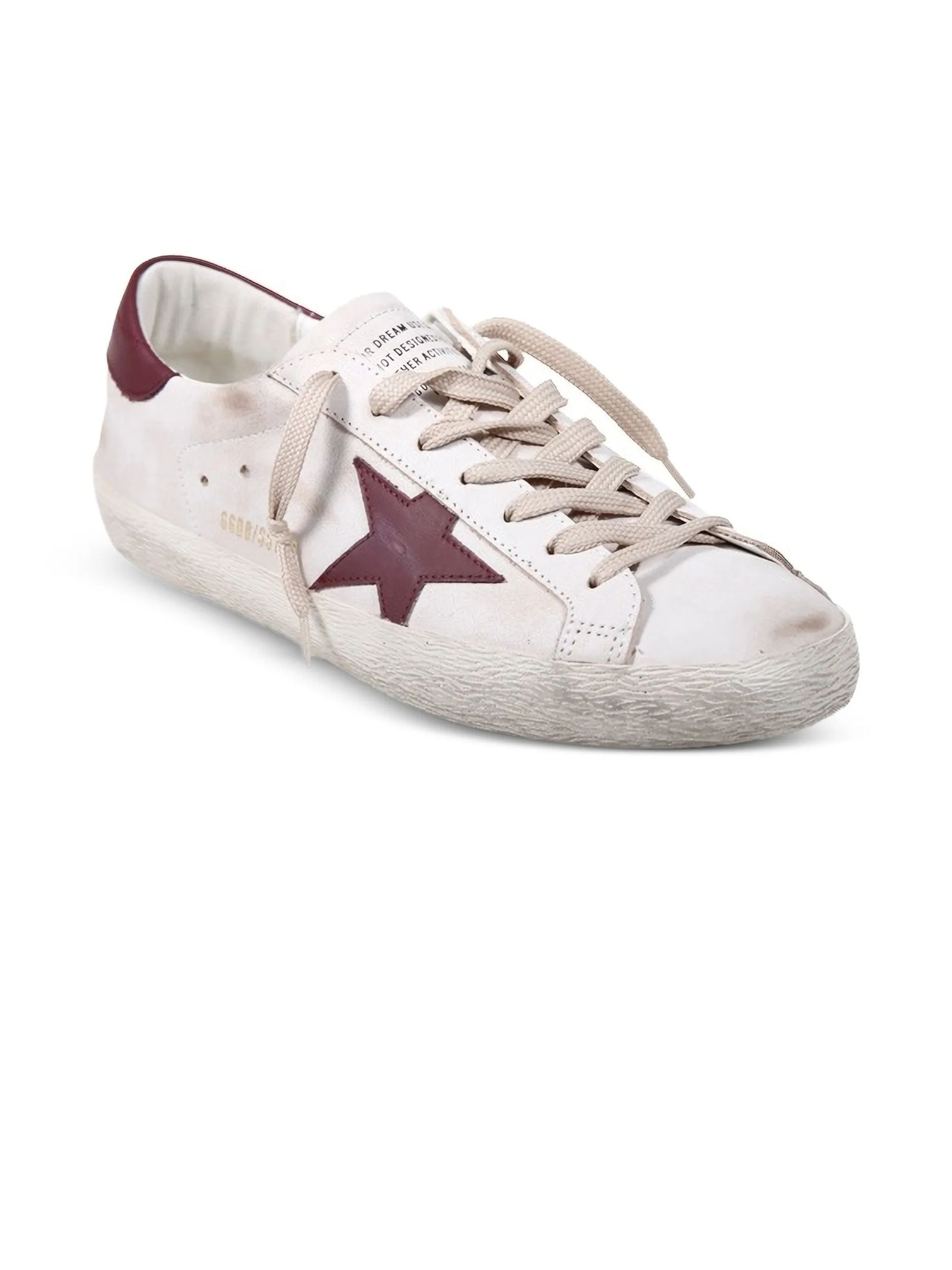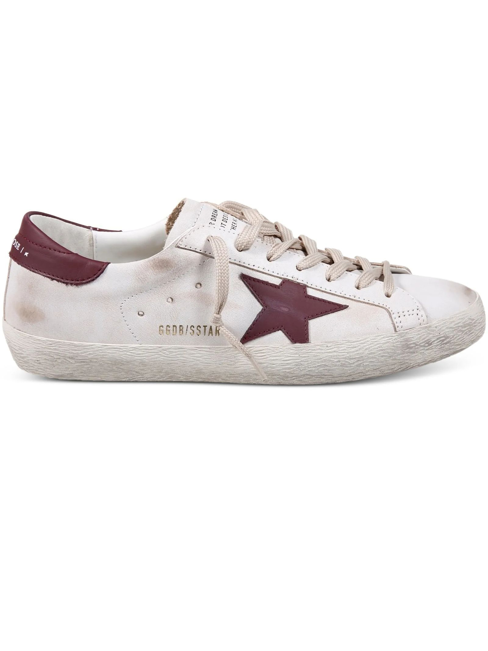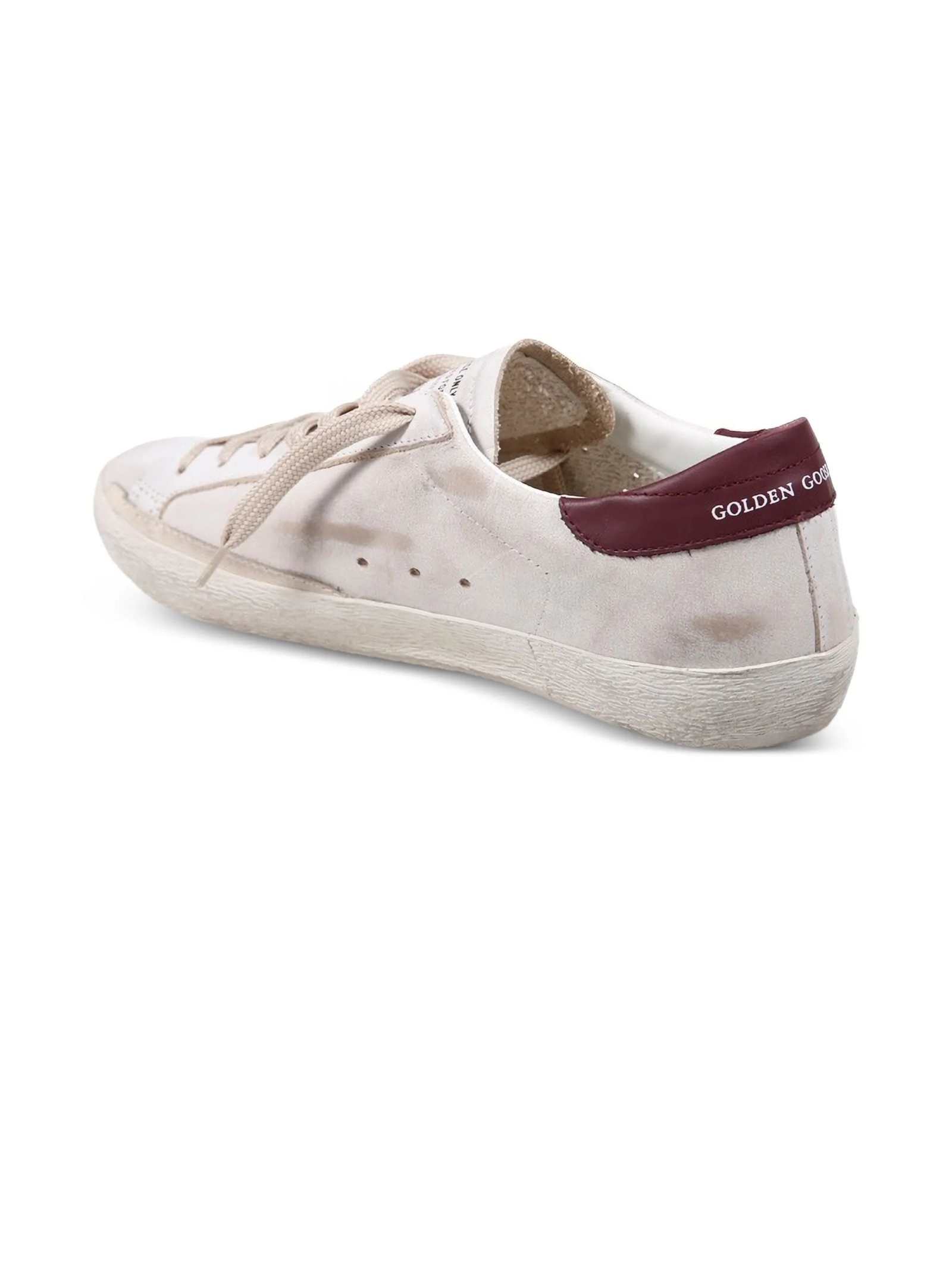 Sneakers Super Star in pelle bianca e bordeuax, dettaglio tallone stampa coccodrillo, punta tonda, chiusura frontale con lacci, applicazione con logo sulla linguetta, soletta con logo, caratteristica applicazione laterale a stella, rinforzo nel tallone a contrasto, effetto vissuto, suola piatta in gomma