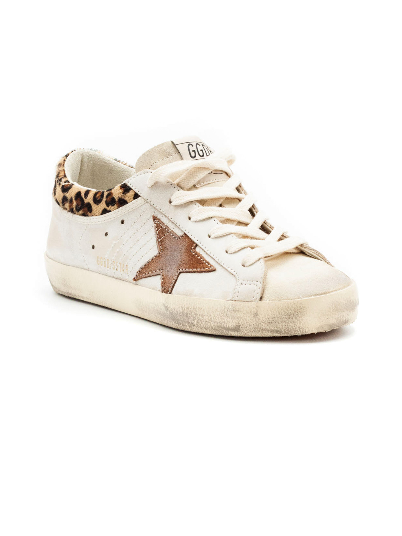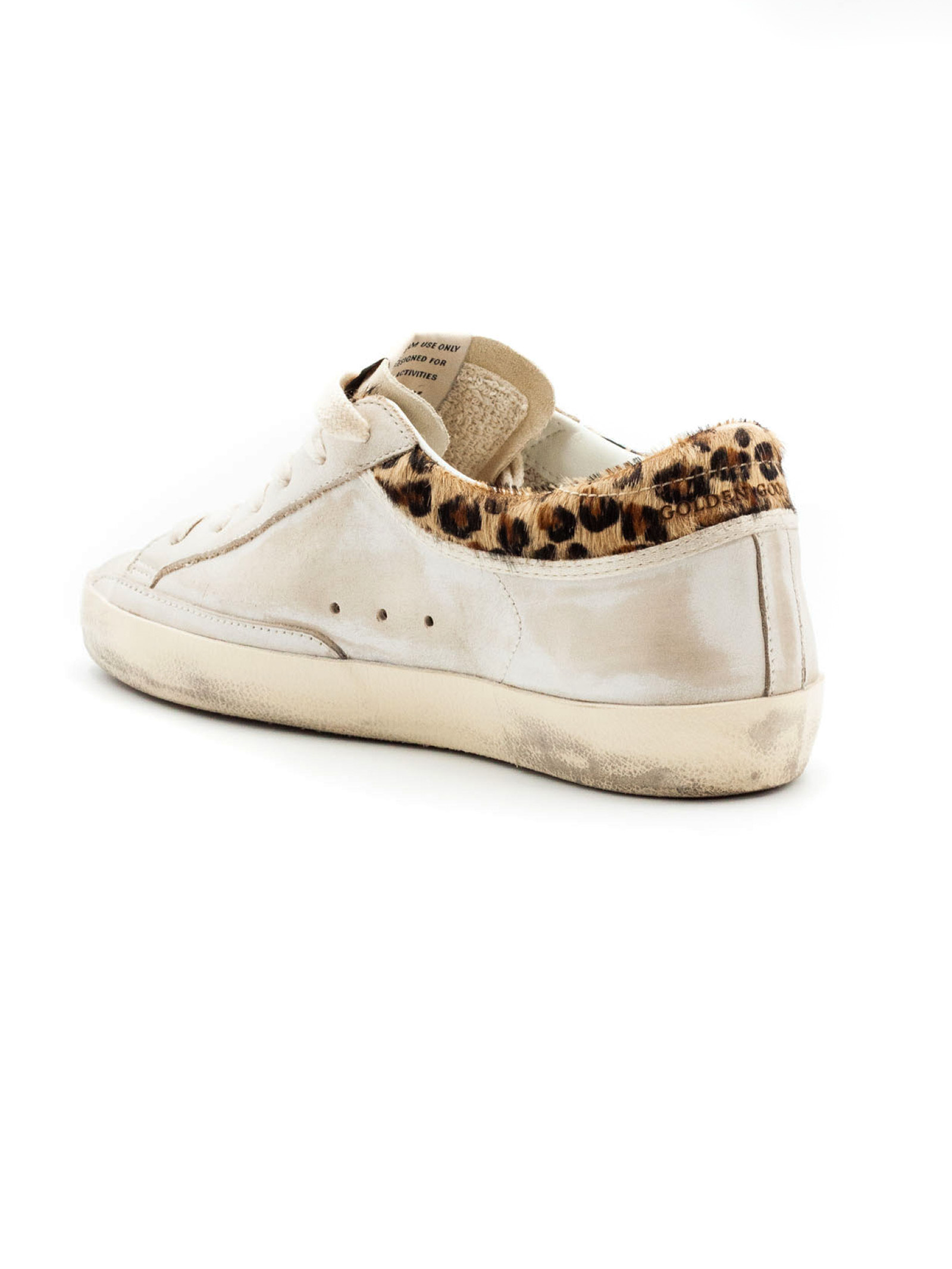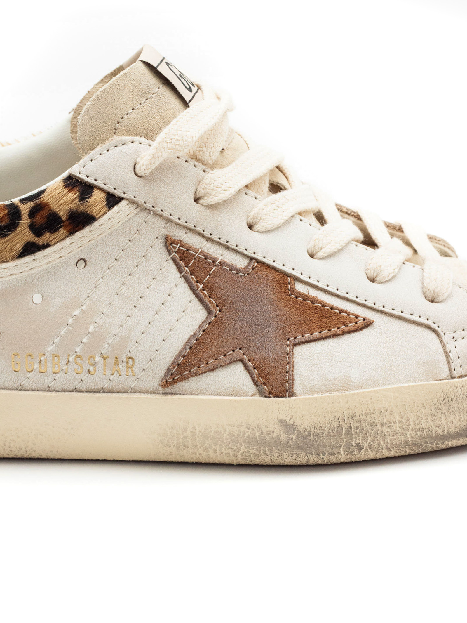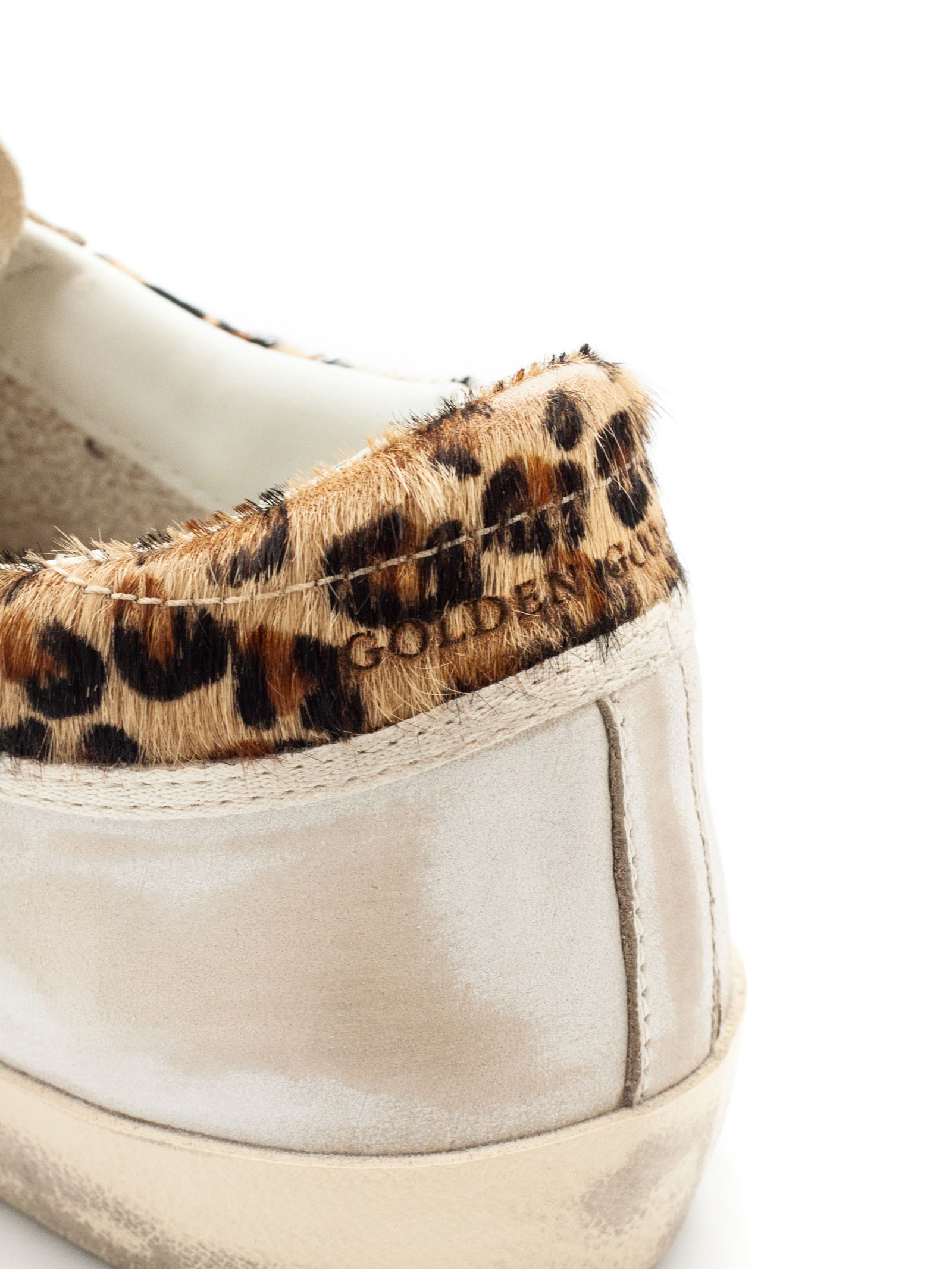 Sneakers Super-Star in pelle bianca, tacco a pony, stella marrone, stampa leopardata, chiusura con lacci, punta tonda