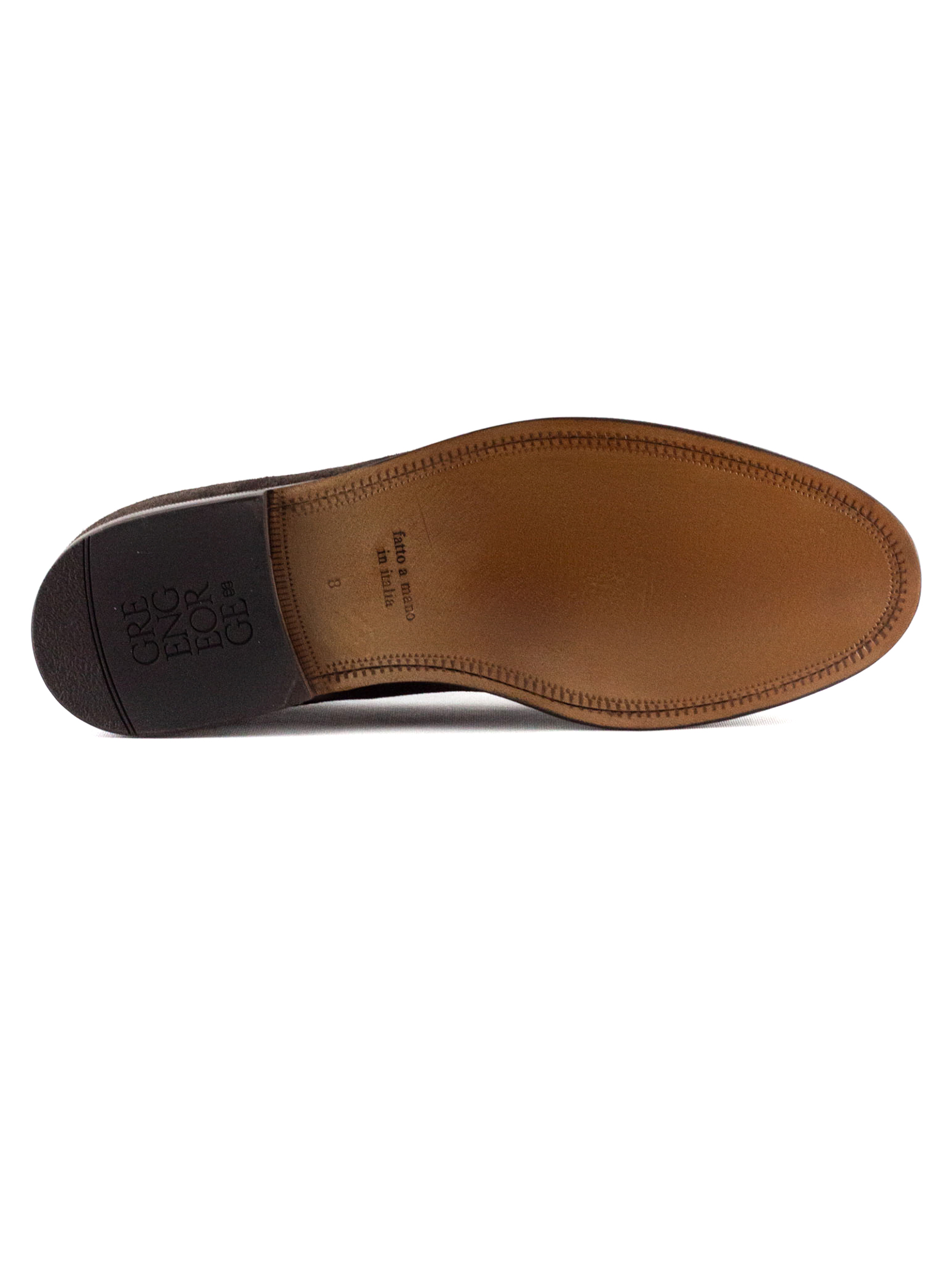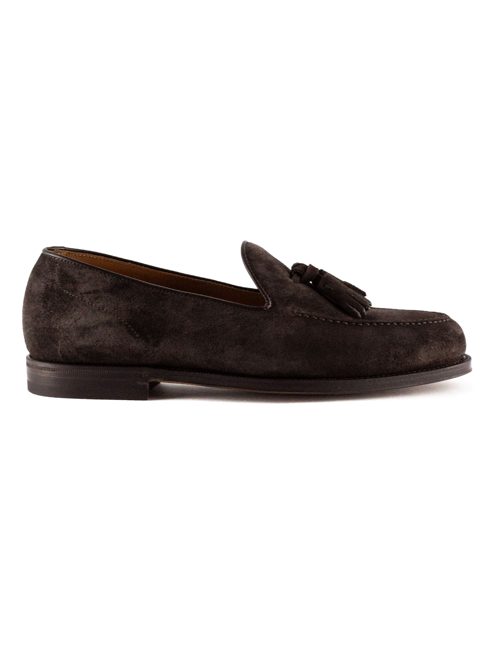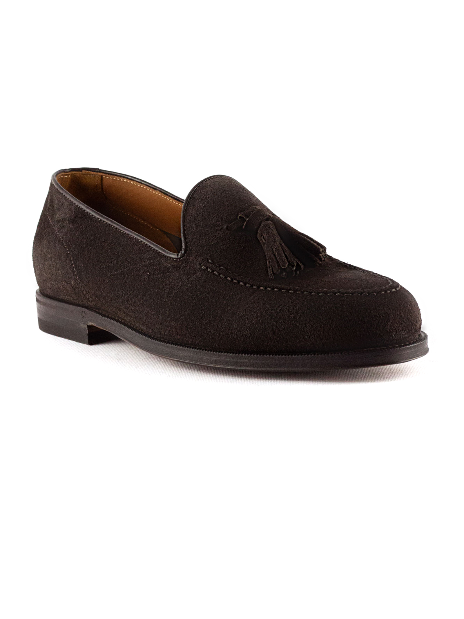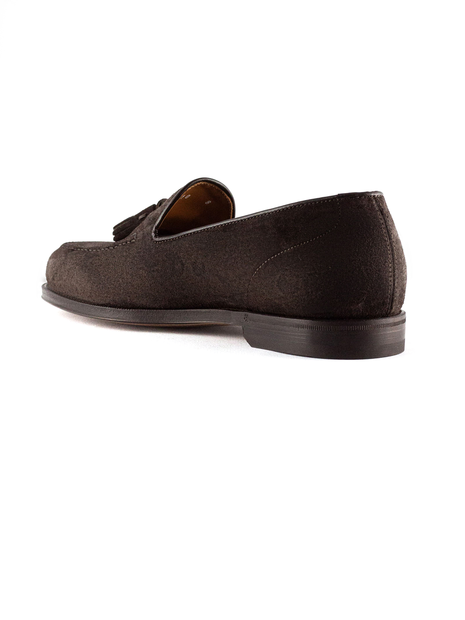 Mocassino in camoscio testa di moro con nappine, light, cuciture a vista, suola in cuoio con logo