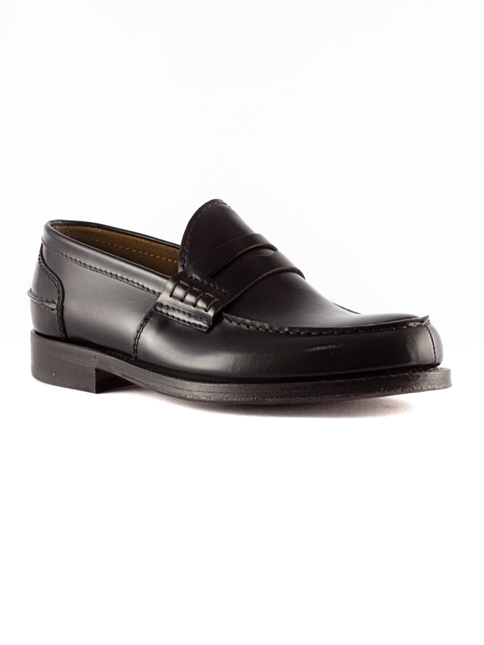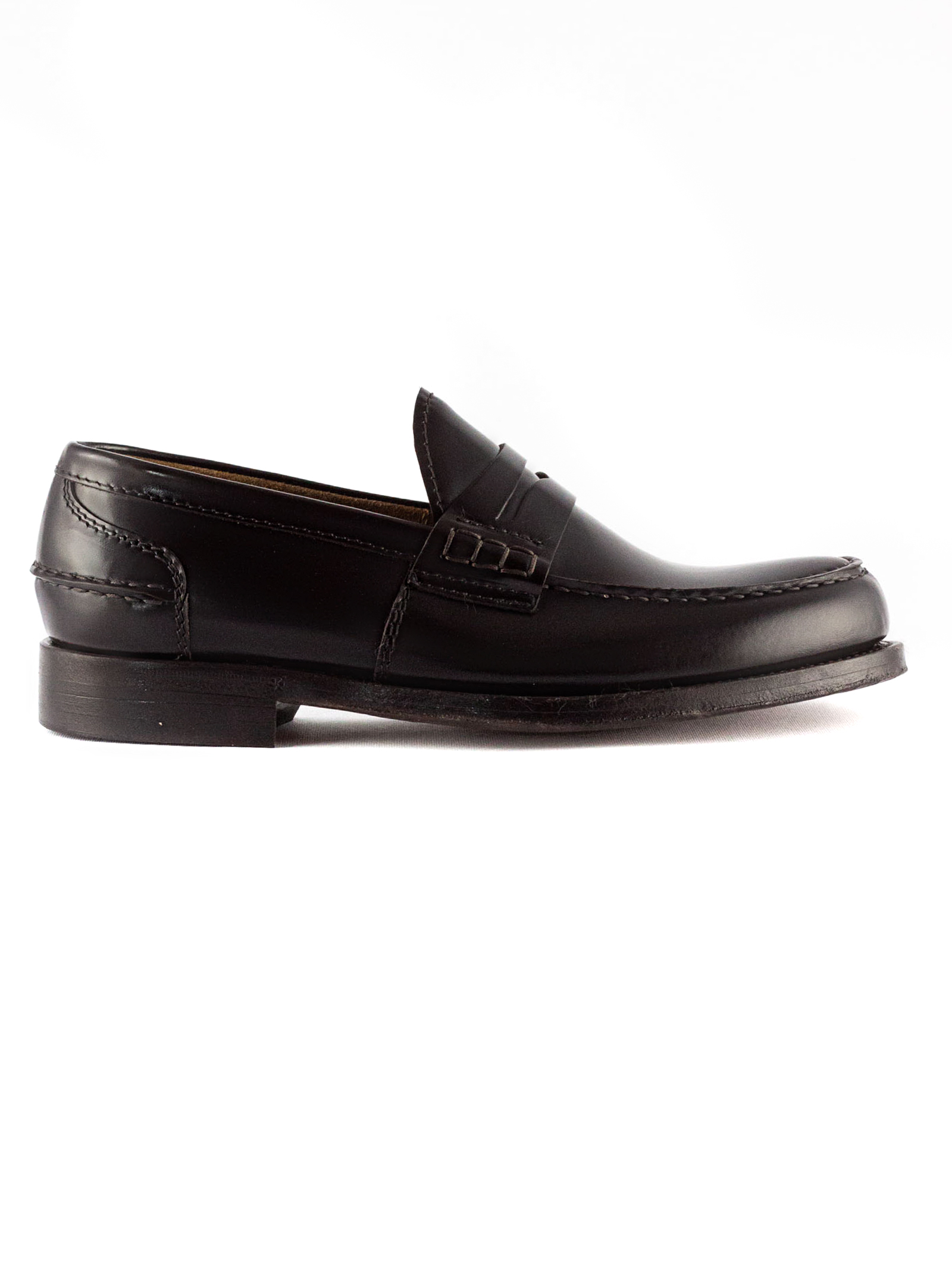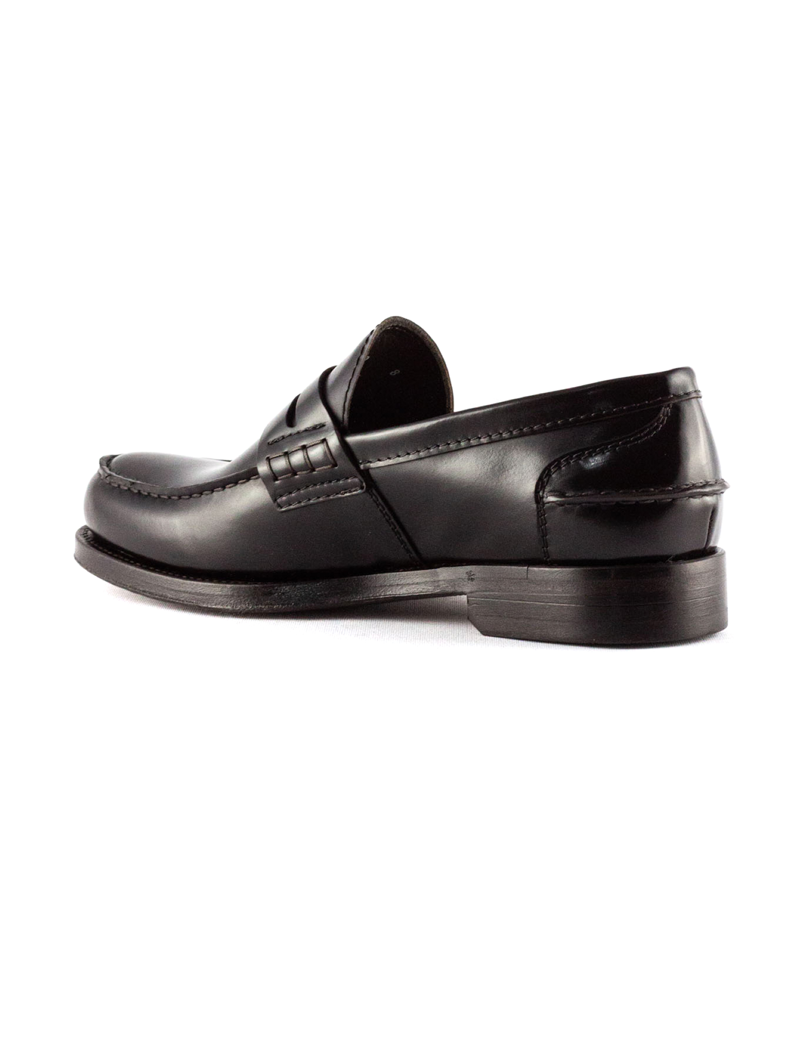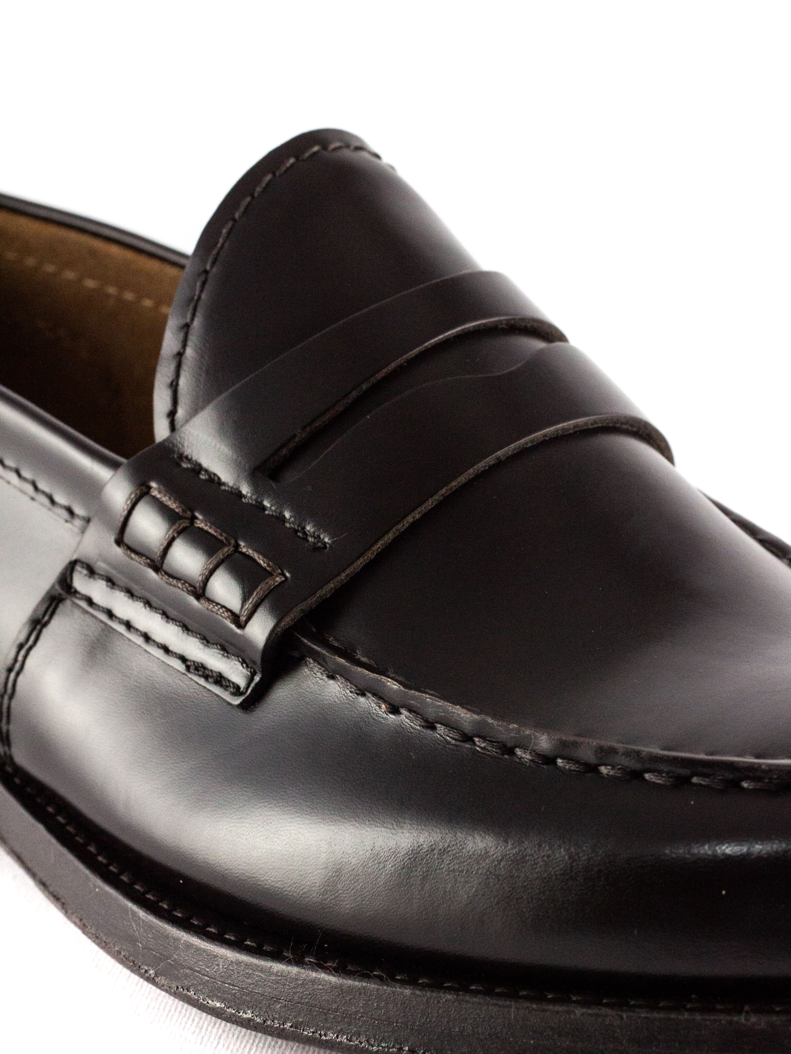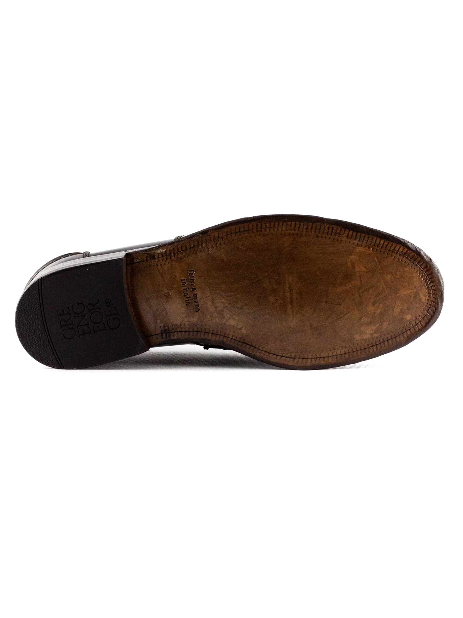 Mocassino in pelle lucida testa di moro con mascherina, cuciture a vista, suola in cuoio con logo