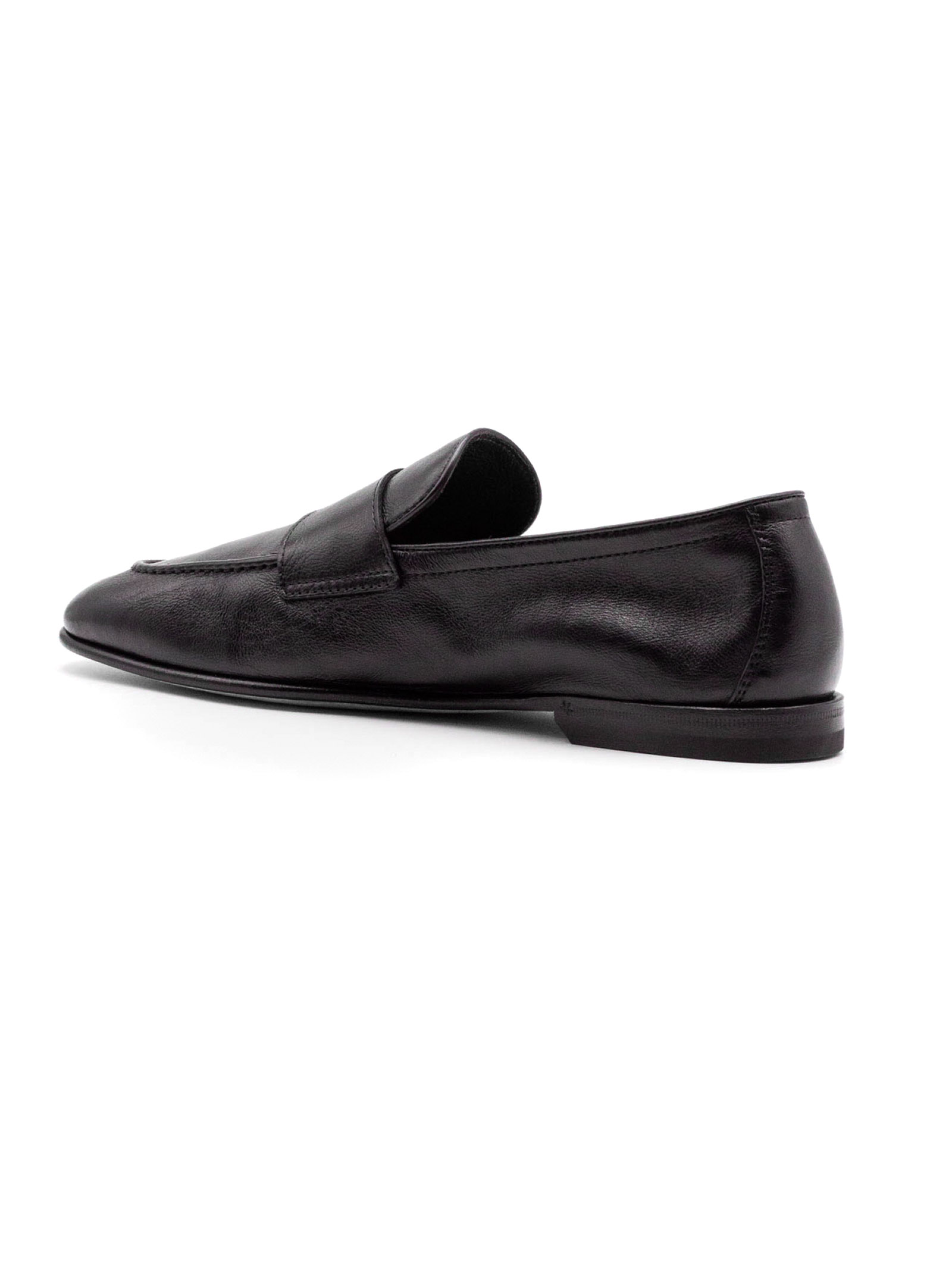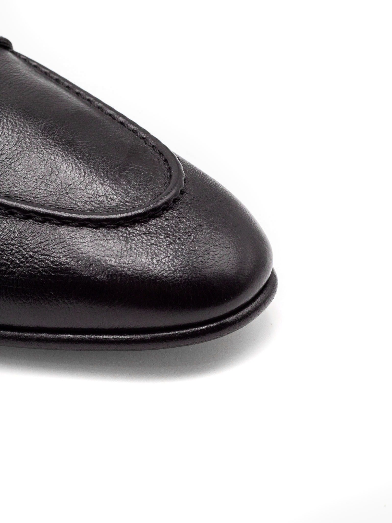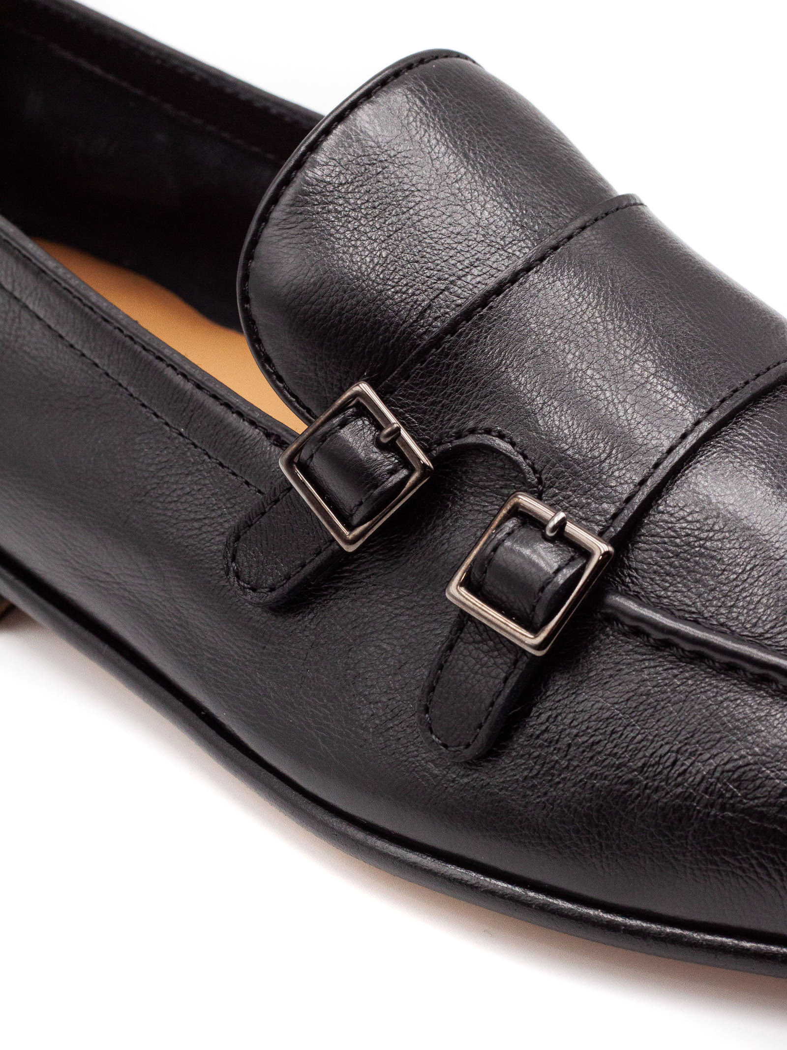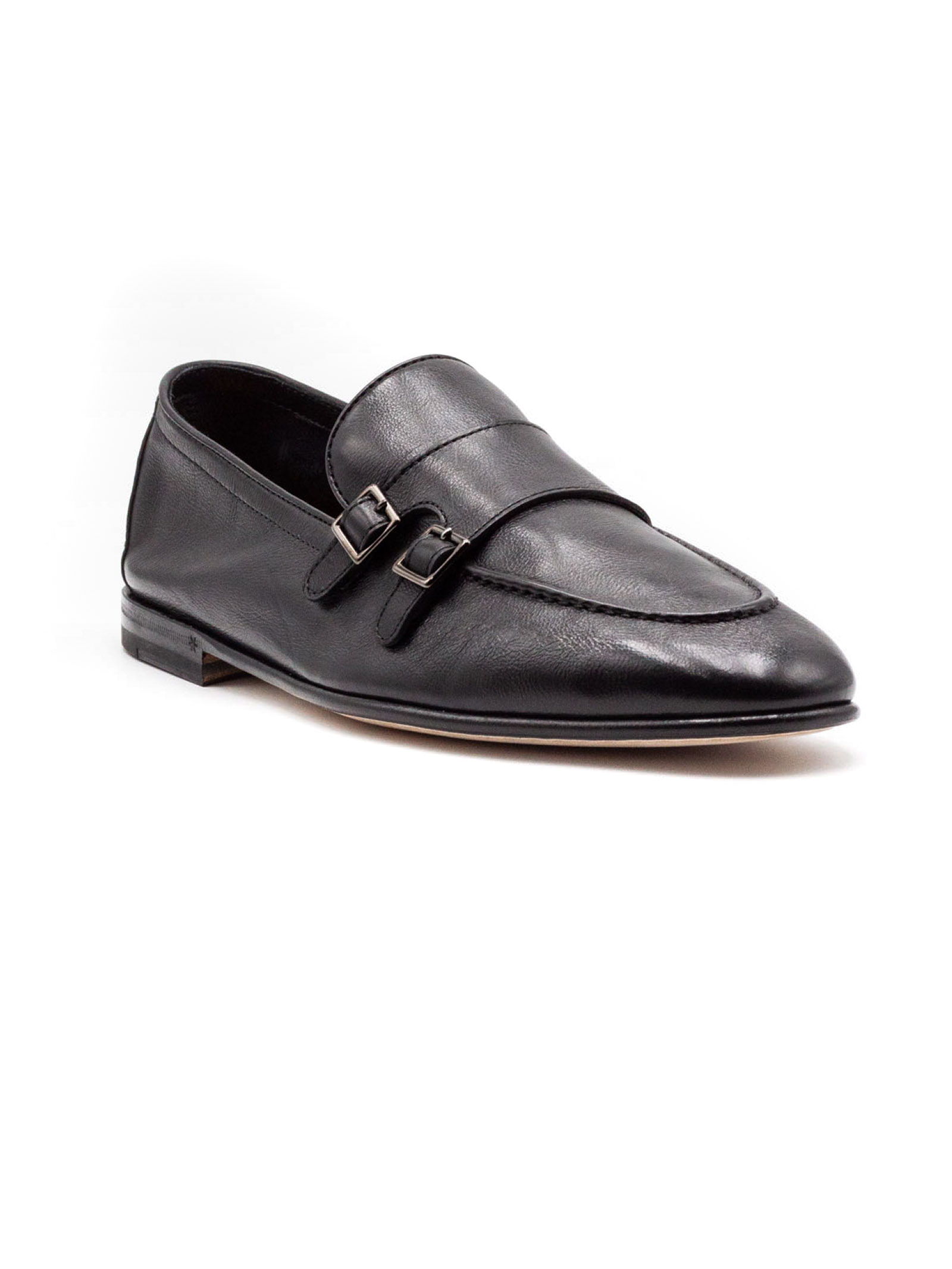 Mocassino in pelle nero, super leggero, super flessibile, doppia fibbia in metallo color argento, suola in cuoio con logo