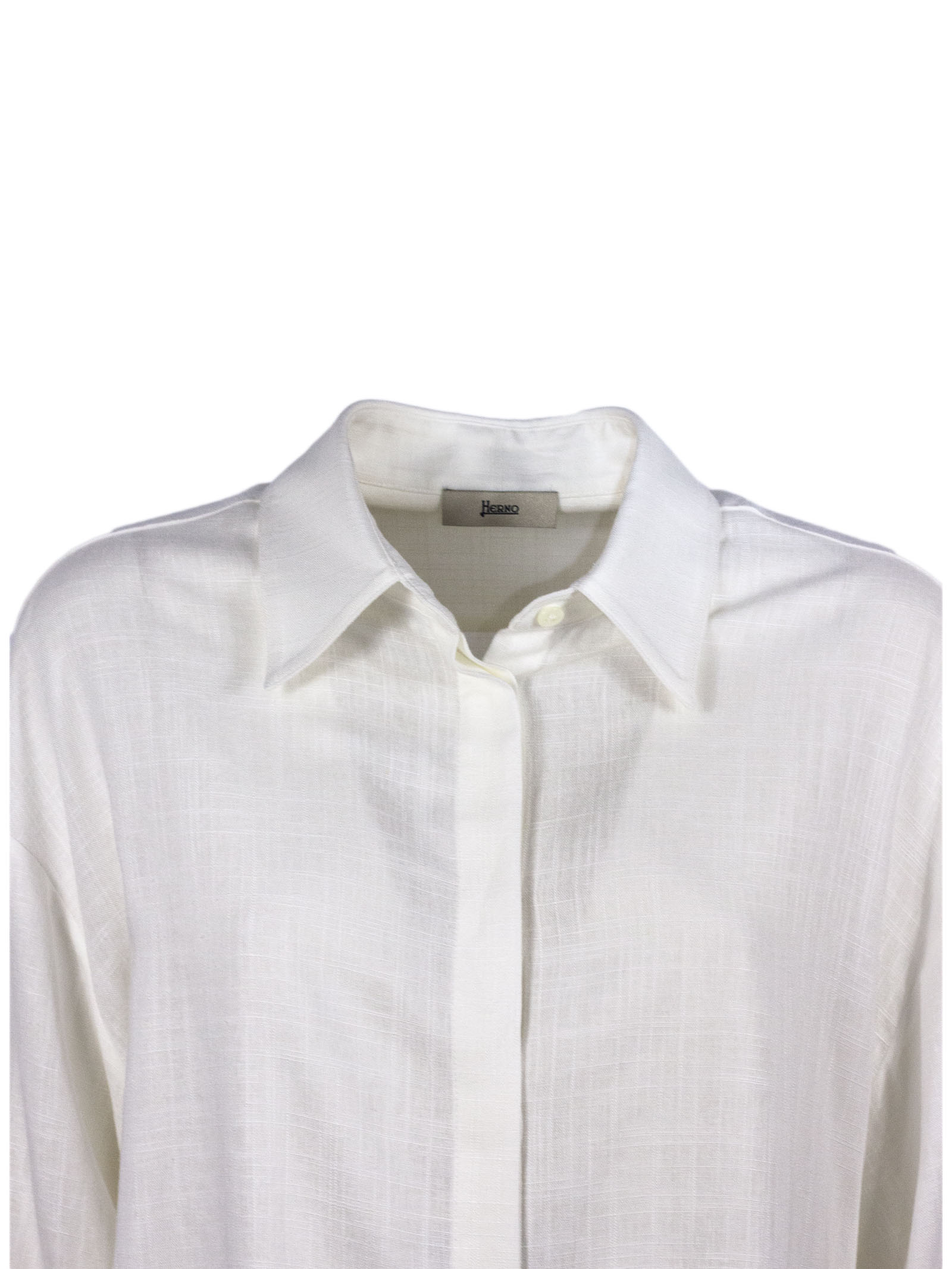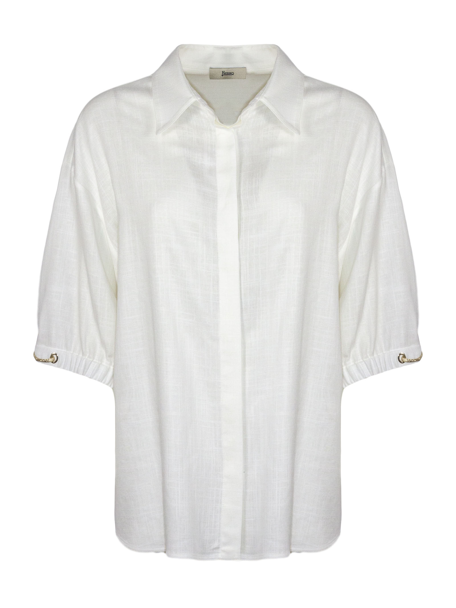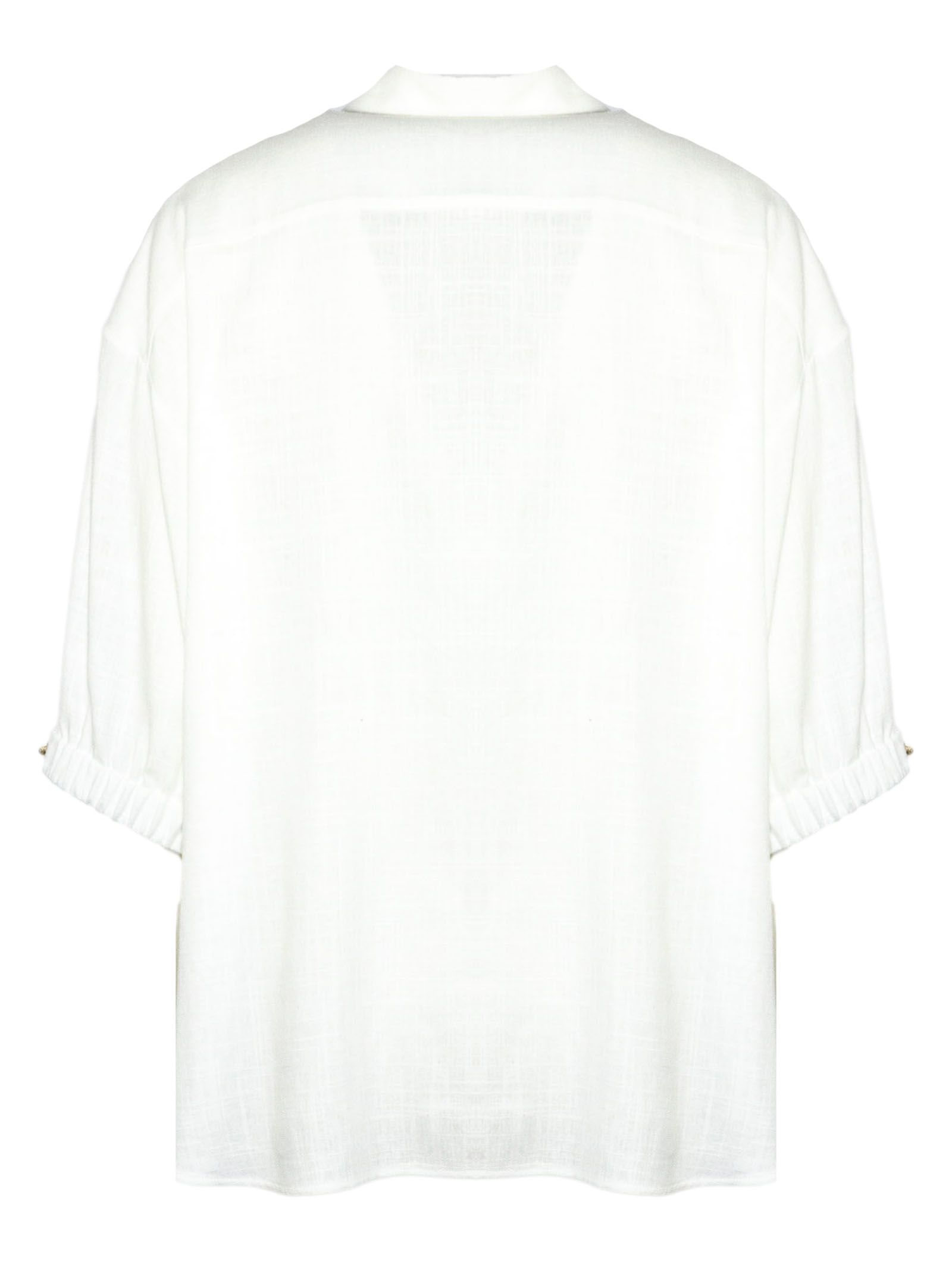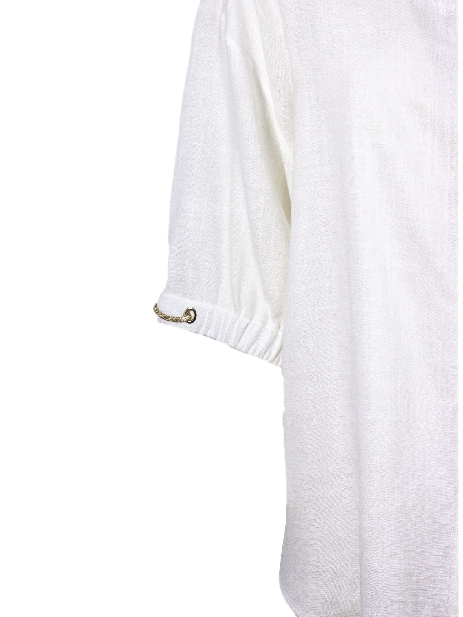Camicia a maniche corte bianca in lino e viscosa, caratterizzata da maniche a tre quarti, colletto classico, chiusura con bottoni e maniche regolabili con coulisse