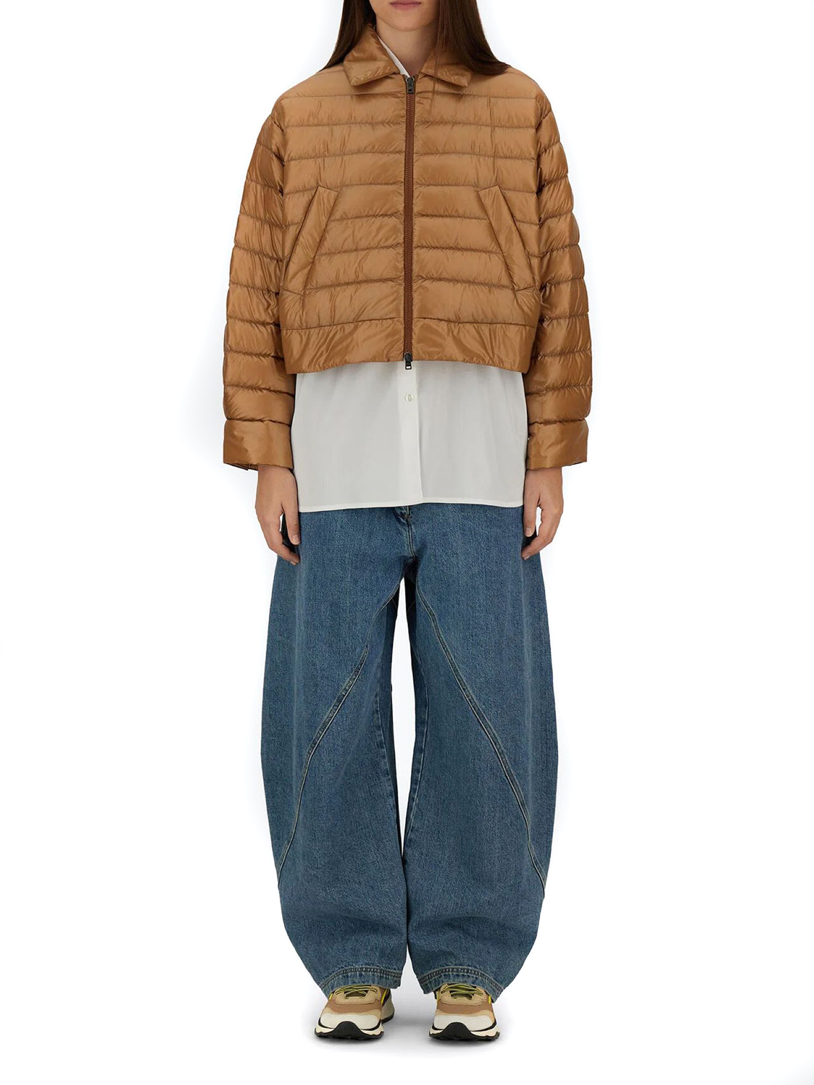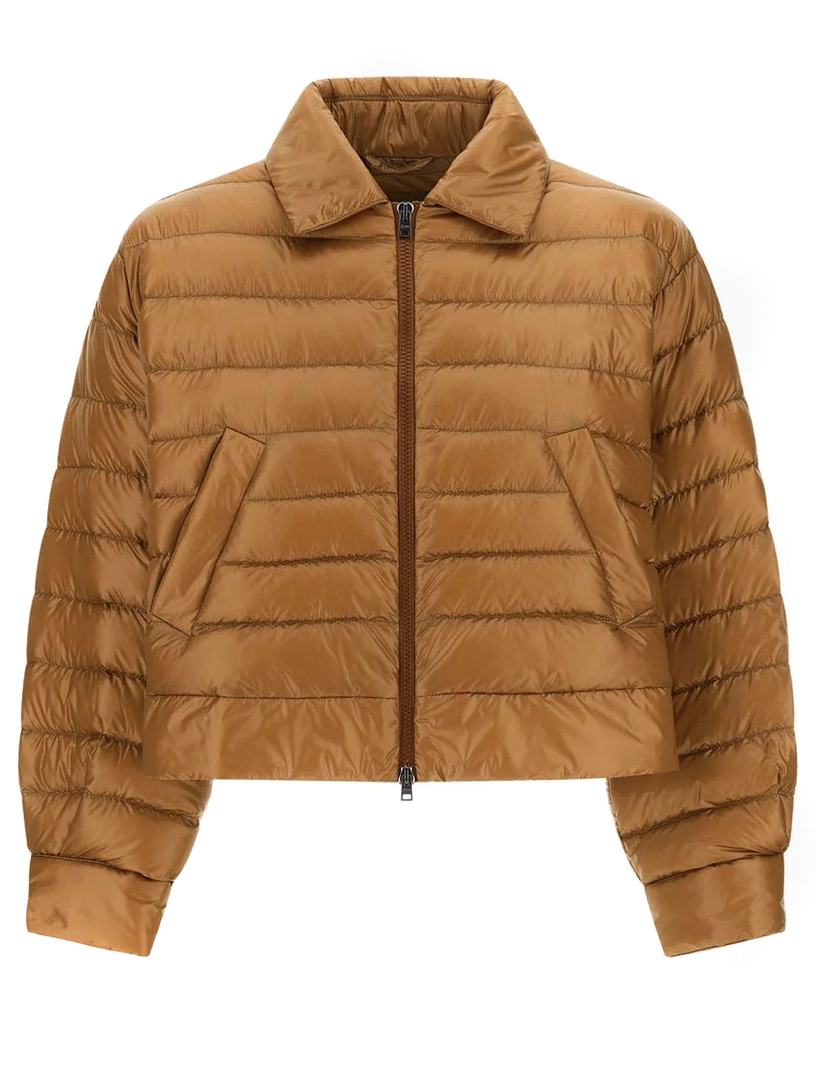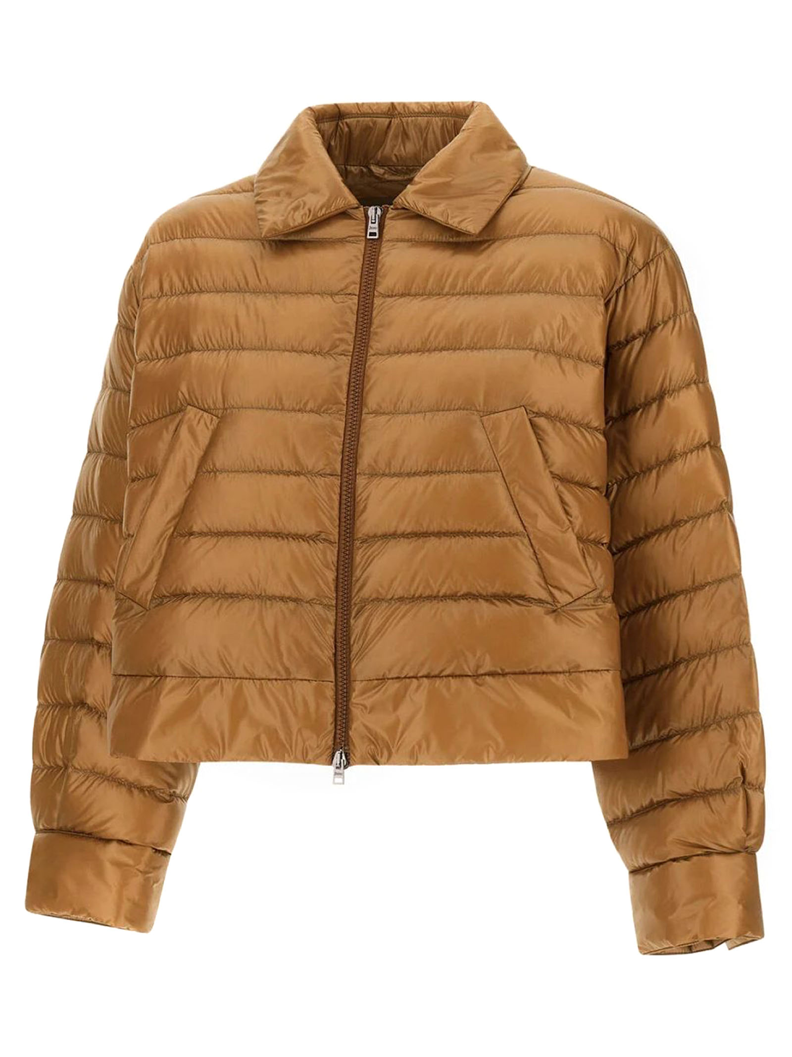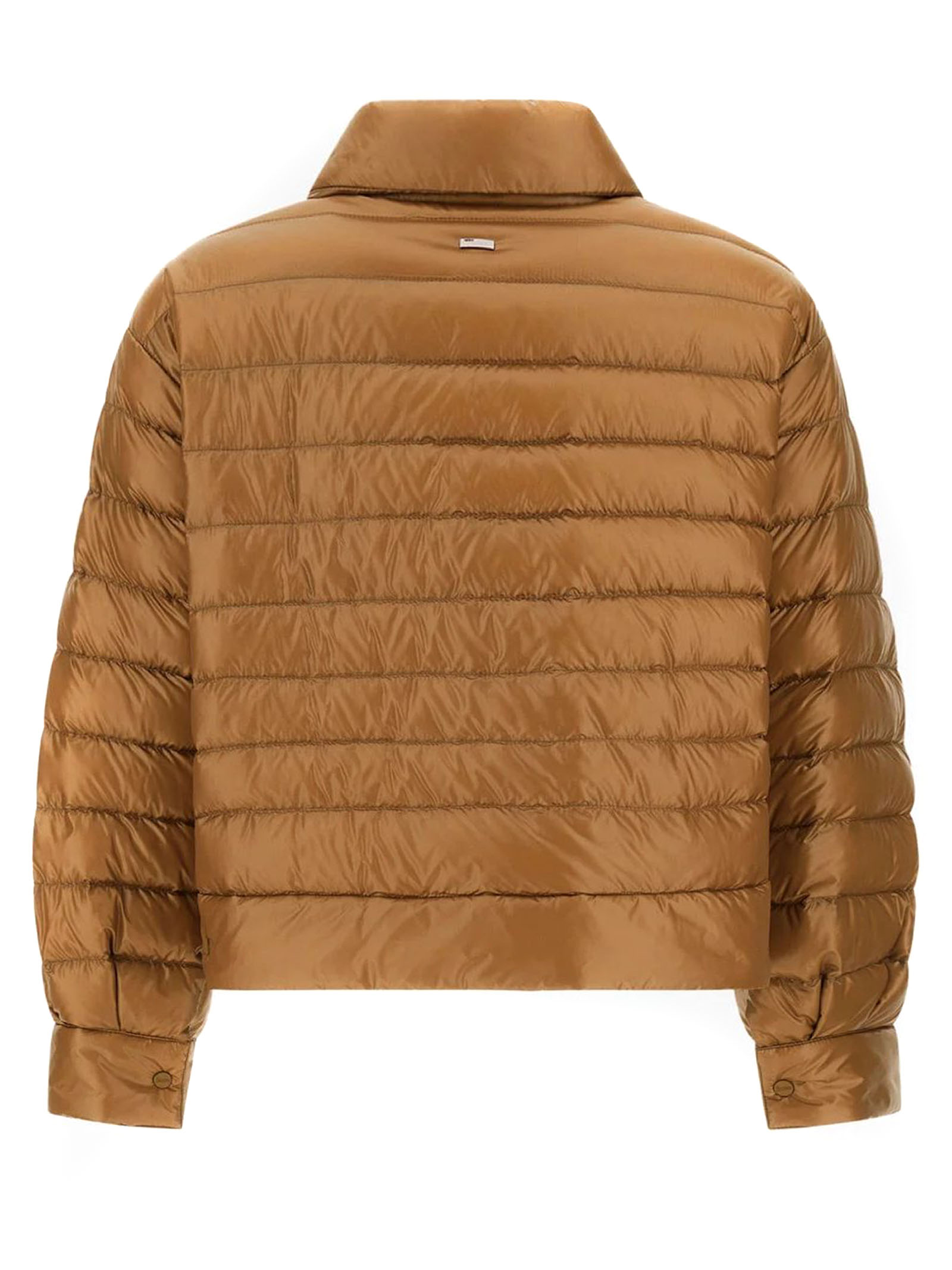 Cappa In Marrone Cammello Nylon Ultralight, Vestibilità boxy, Imbottitura in piuma, Trapuntatura a righe, Collo a camicia, Maniche lunghe, Polsi con bottone, Tasche a filetto, Logo Herno in metallo sul retro, Chiusura con zip a doppio cursore