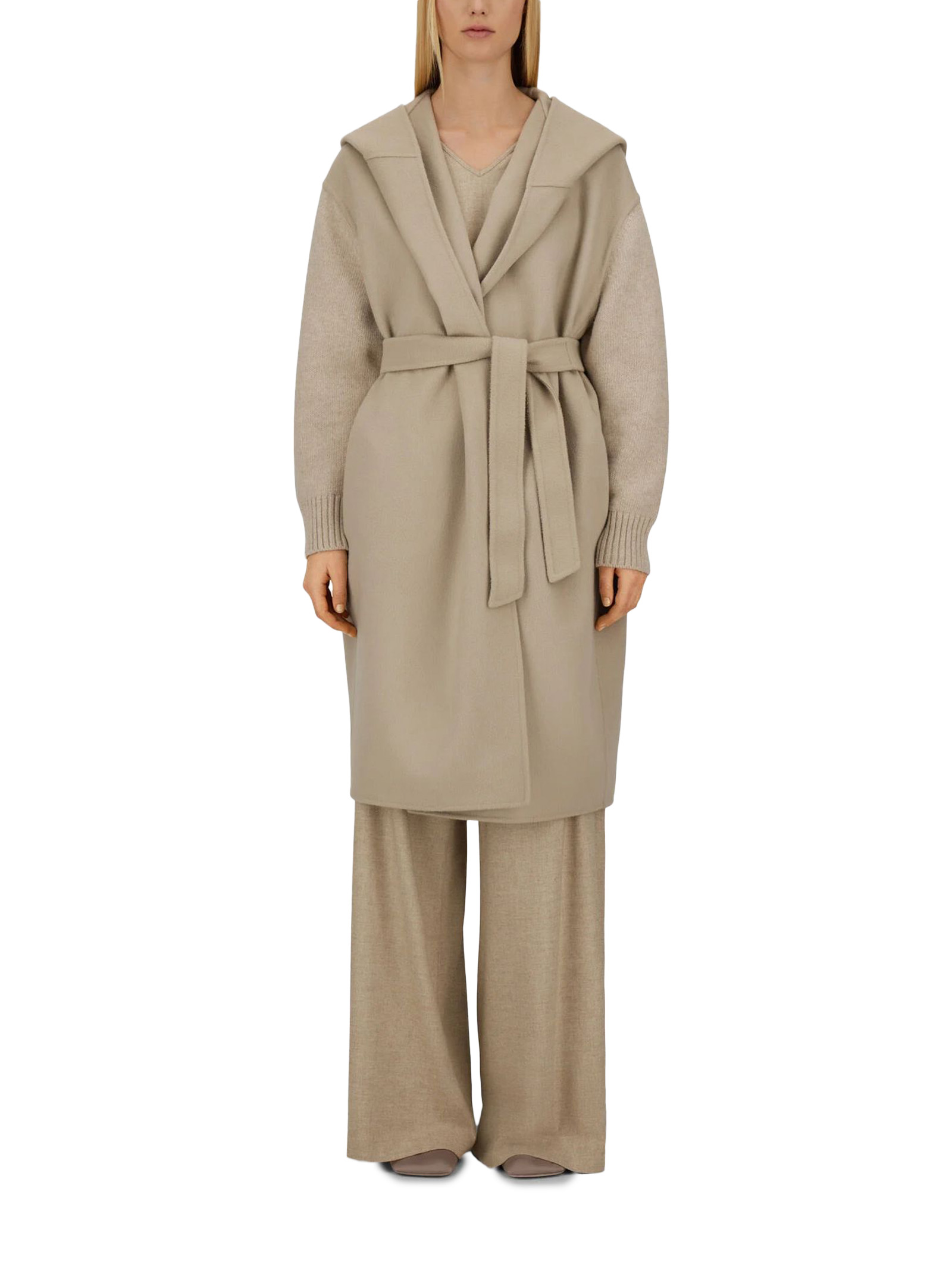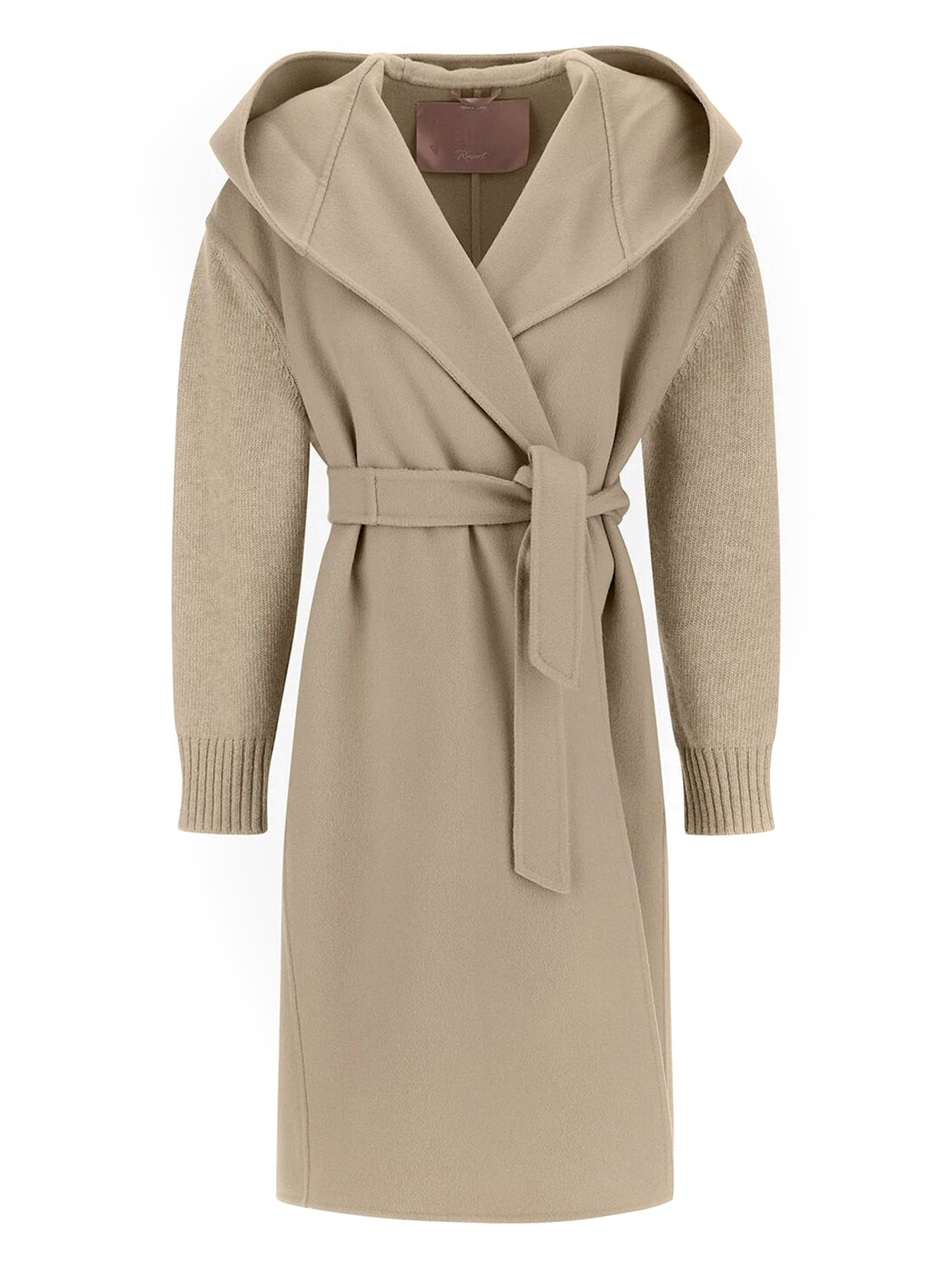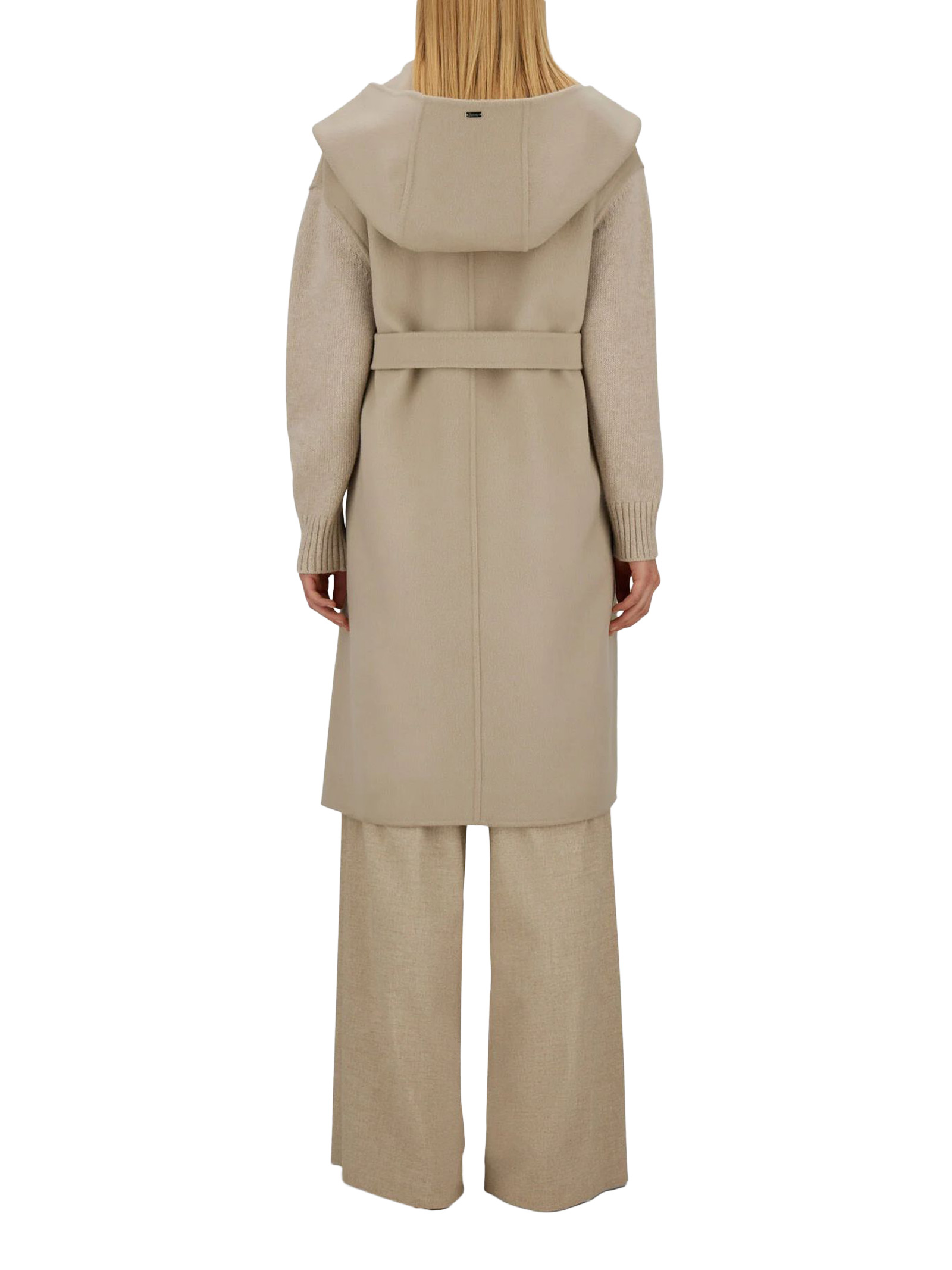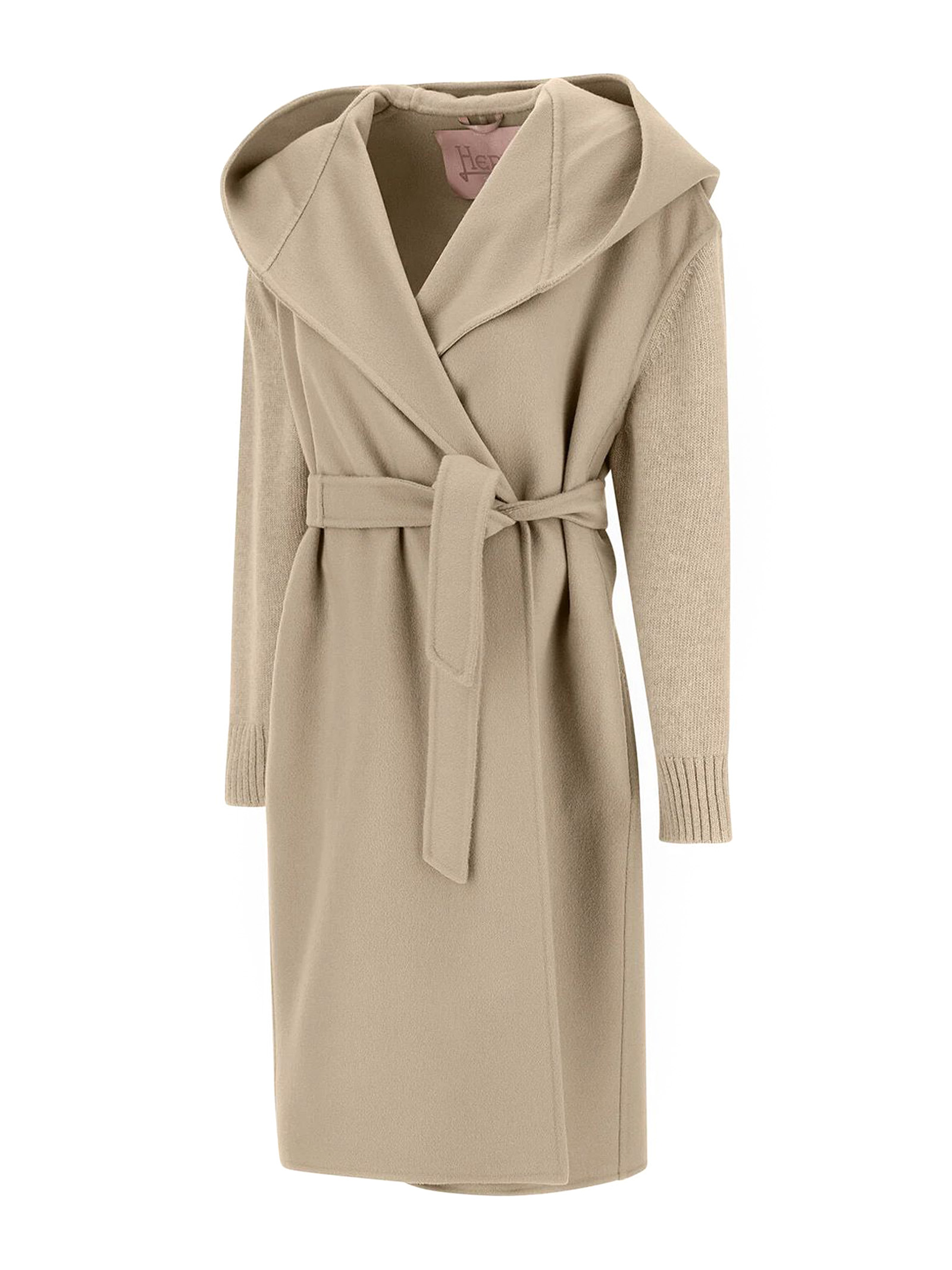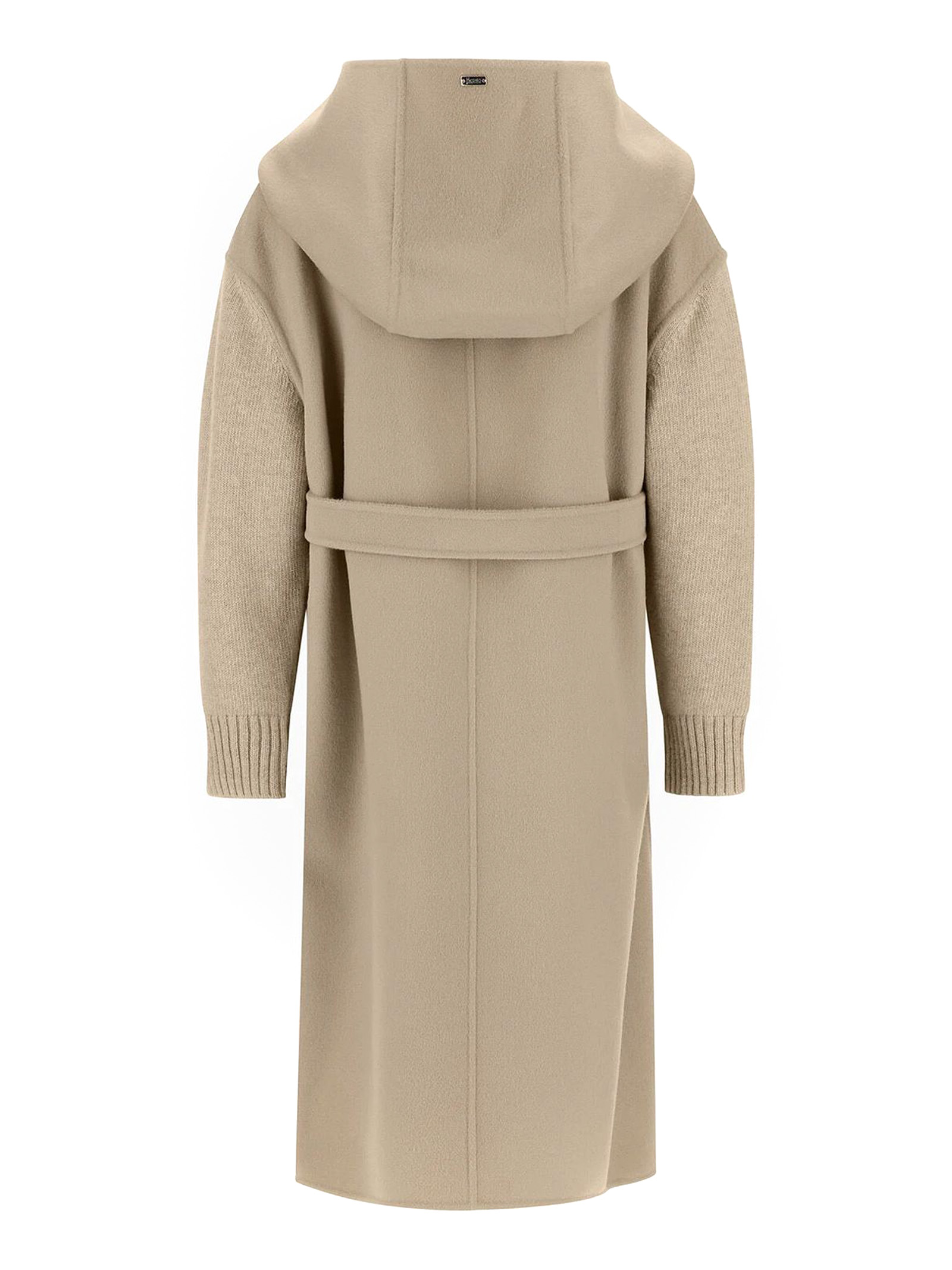 Cappotto realizzato in 100% lana doppia beige, Vestibilità regolare, Cappuccio, Maniche in maglia di lana, Lavorazione punto rasato, Finezza 5, Tasche a filetto, Logo Herno in metallo sul retro, Chiusura con cintura coordinata, Sfoderato