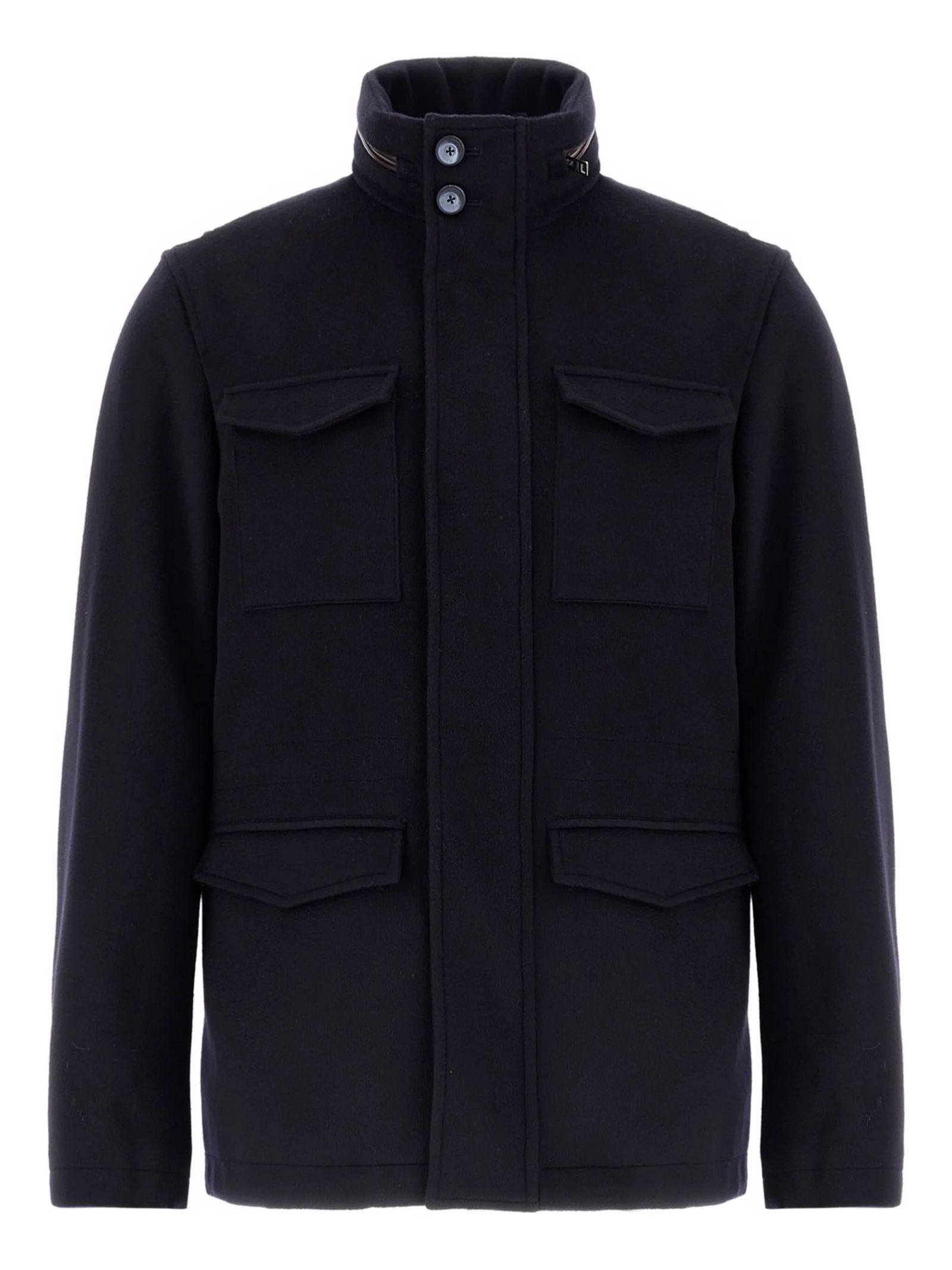 Giacca in lana e cashmere spazzolato blu, morbida al tatto e con finitura opaca, vestibilità regolare, cappuccio ripiegabile, collo alto, tasche piccole e tasche con patta, logo Herno in metallo sul retro, coulisse interna in vita, chiusura con zip e bottoni, foderata
