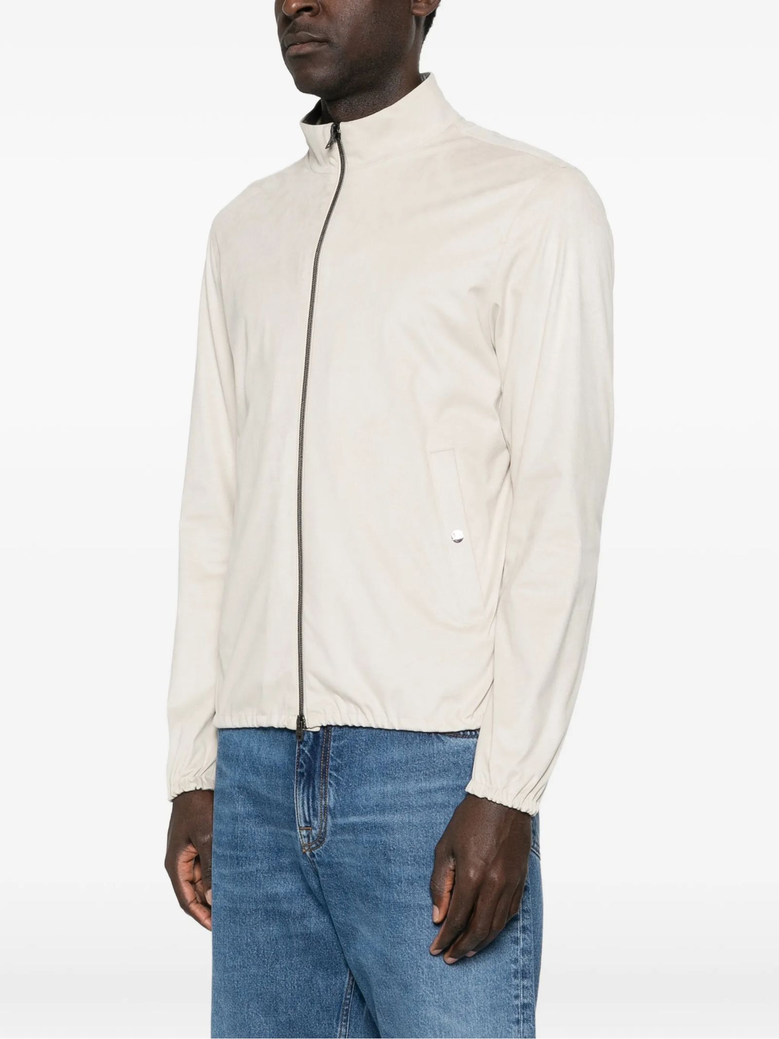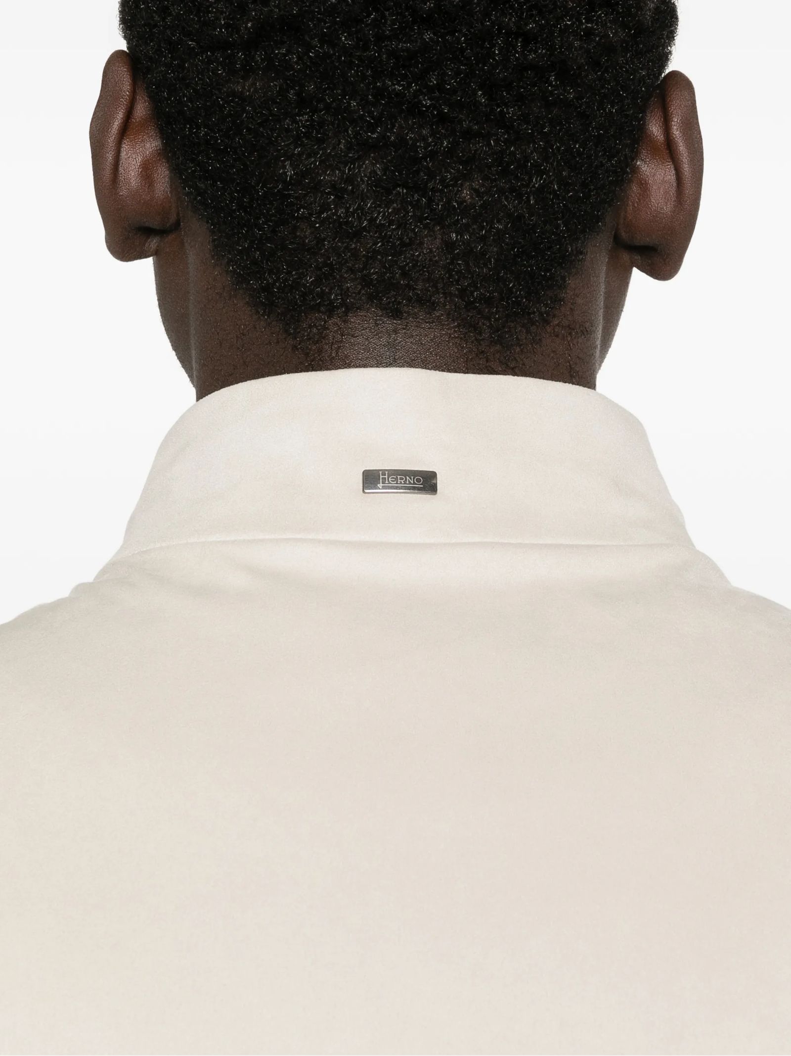 Giacca in morbida microfibra scamosciata beige, filato 50 denari dona al tessuto leggerezza, Vestibilità regolare, Collo alto, Maniche lunghe, Tasche con bottone a pressione, Logo Herno in metallo sul retro, Chiusura con zip a doppio cursore, Foderato