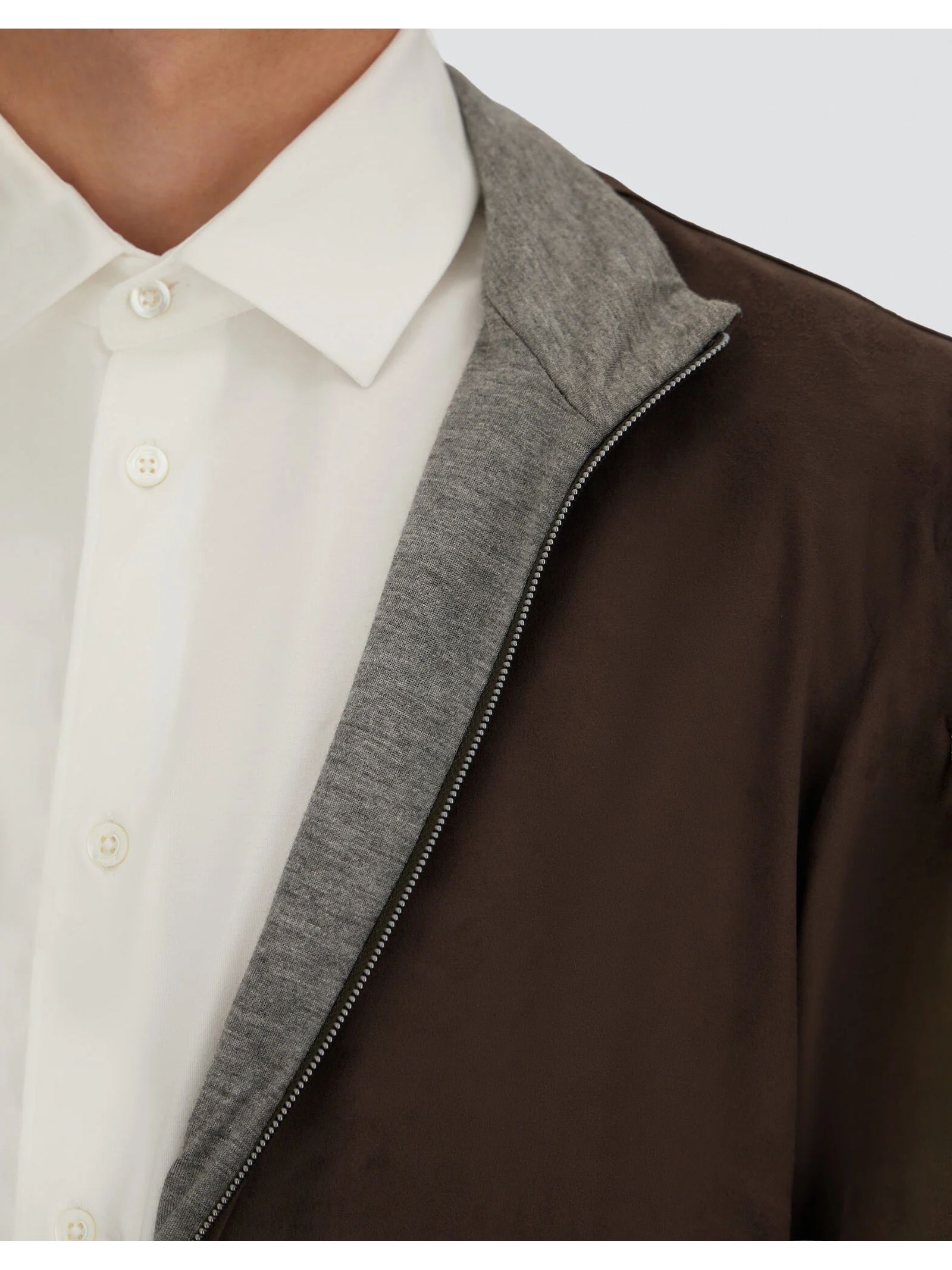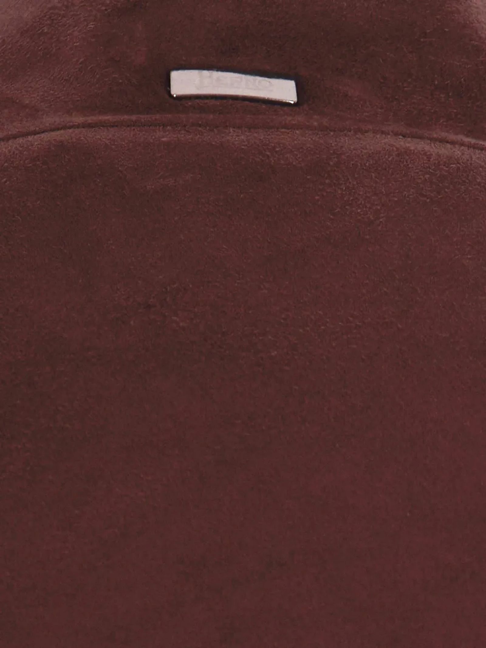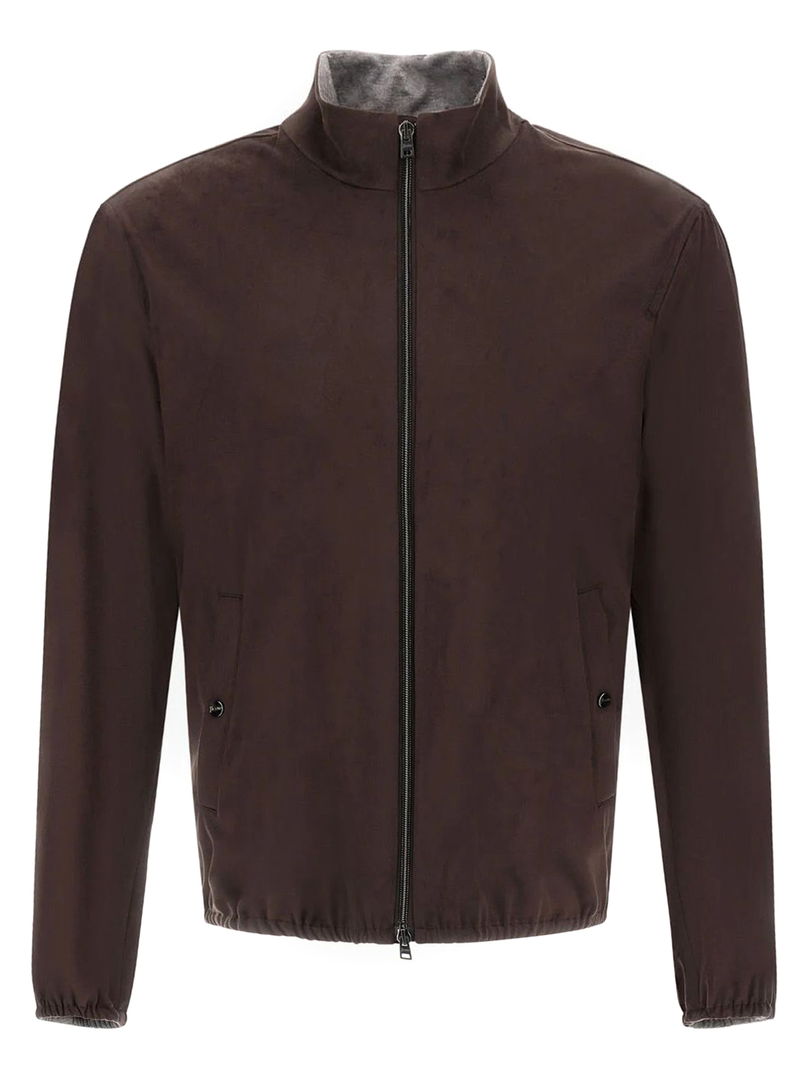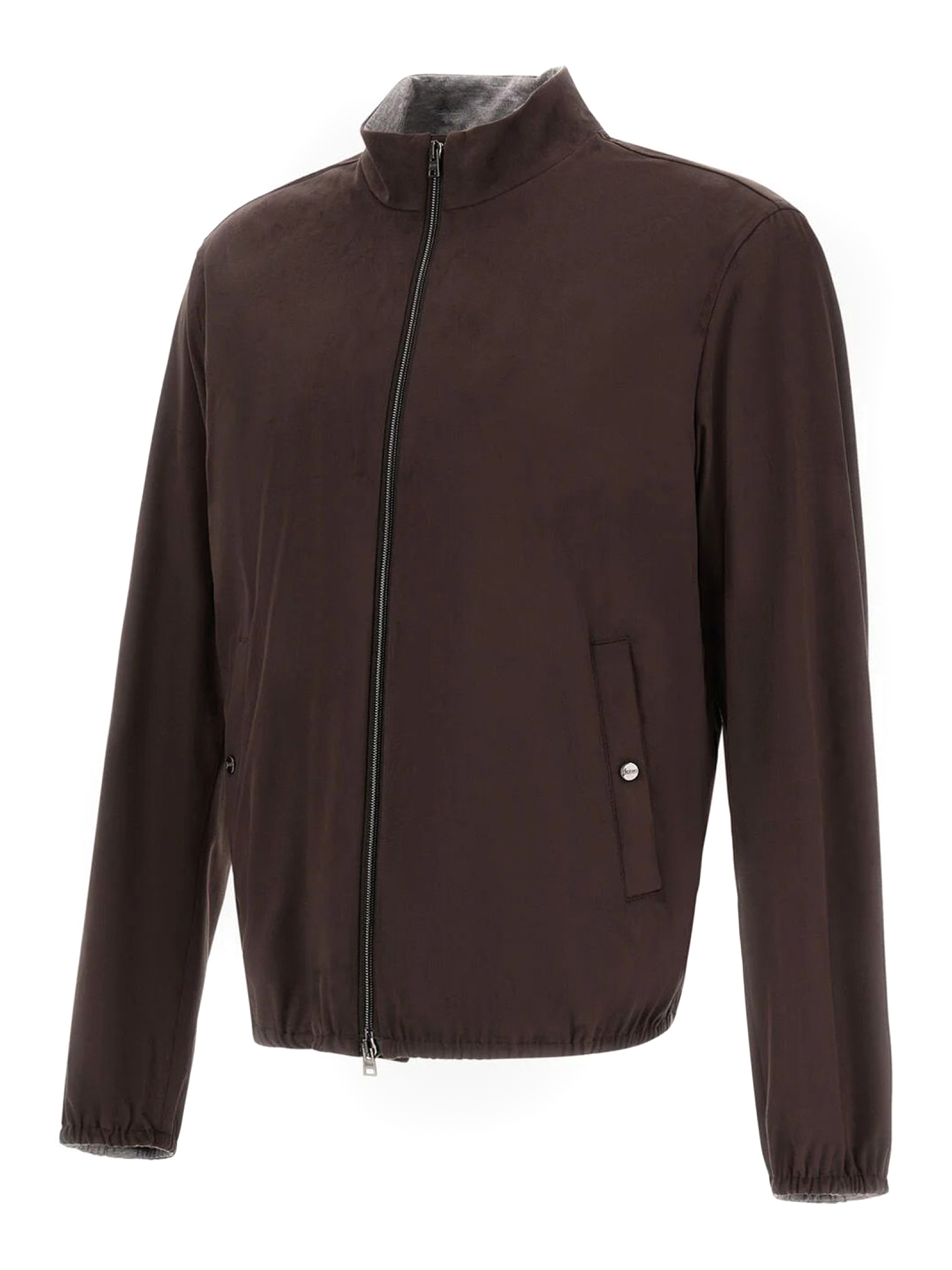 Giacca in morbida microfibra scamosciata marrone, filato 50 denari dona al tessuto leggerezza, Vestibilità regolare, Collo alto, Maniche lunghe, Tasche con bottone a pressione, Logo Herno in metallo sul retro, Chiusura con zip a doppio cursore, Foderato