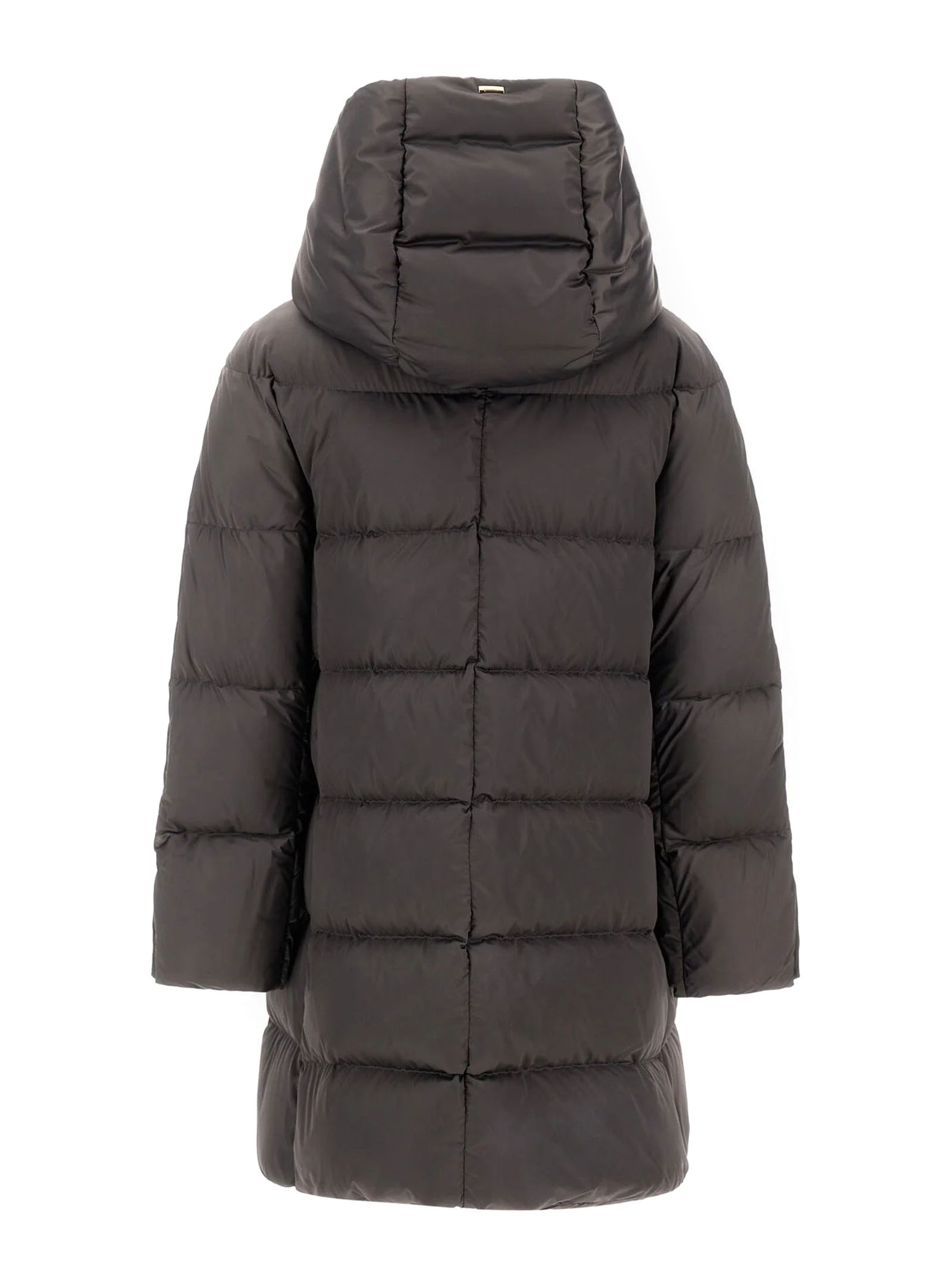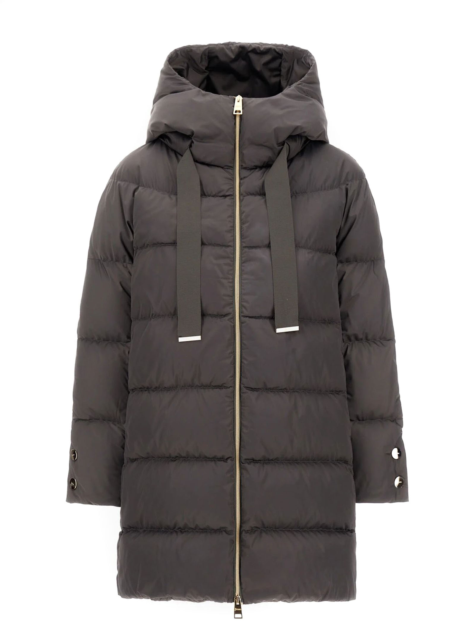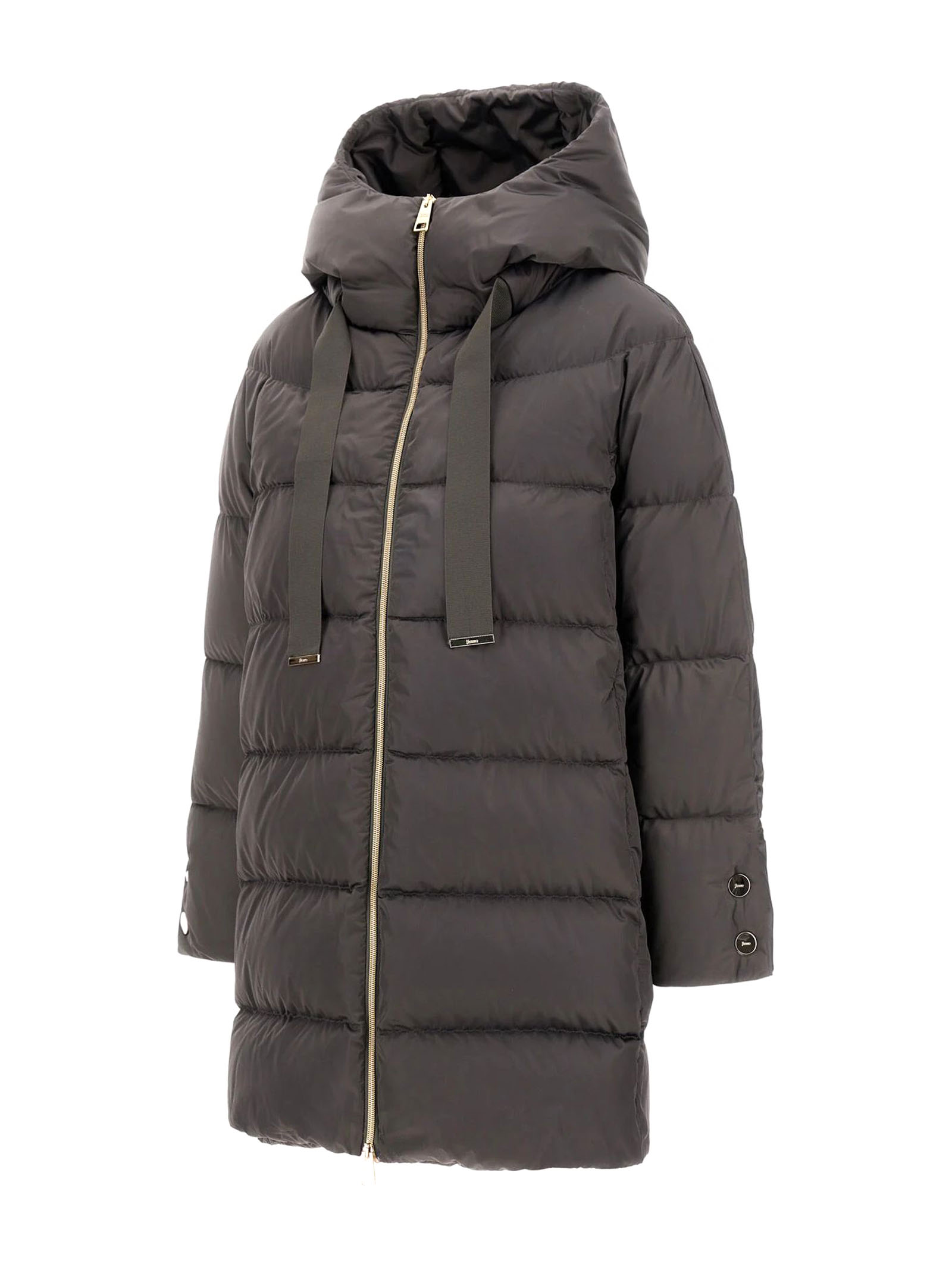 Giubbotto A-shape in raso grigio, lucido e morbido, Vestibilità regolare, Cappuccio fisso con coulisse, Chiusura con zip a doppio cursore, Polsi con bottoni a pressione, Tasche a filetto, Logo in metallo sul retro, Imbottitura in piuma