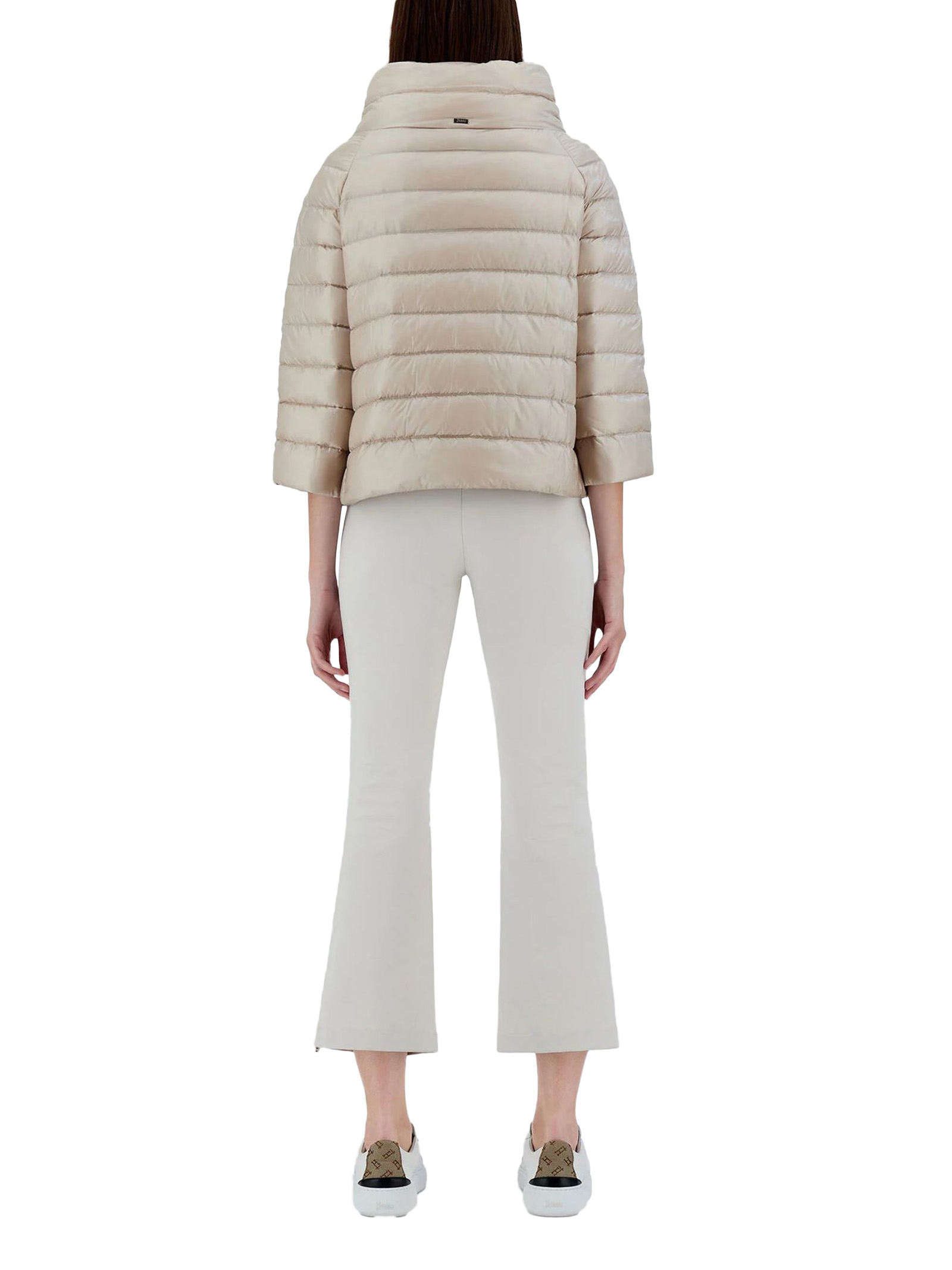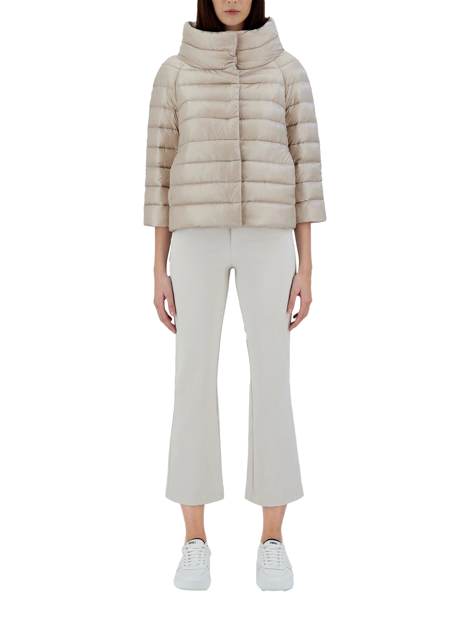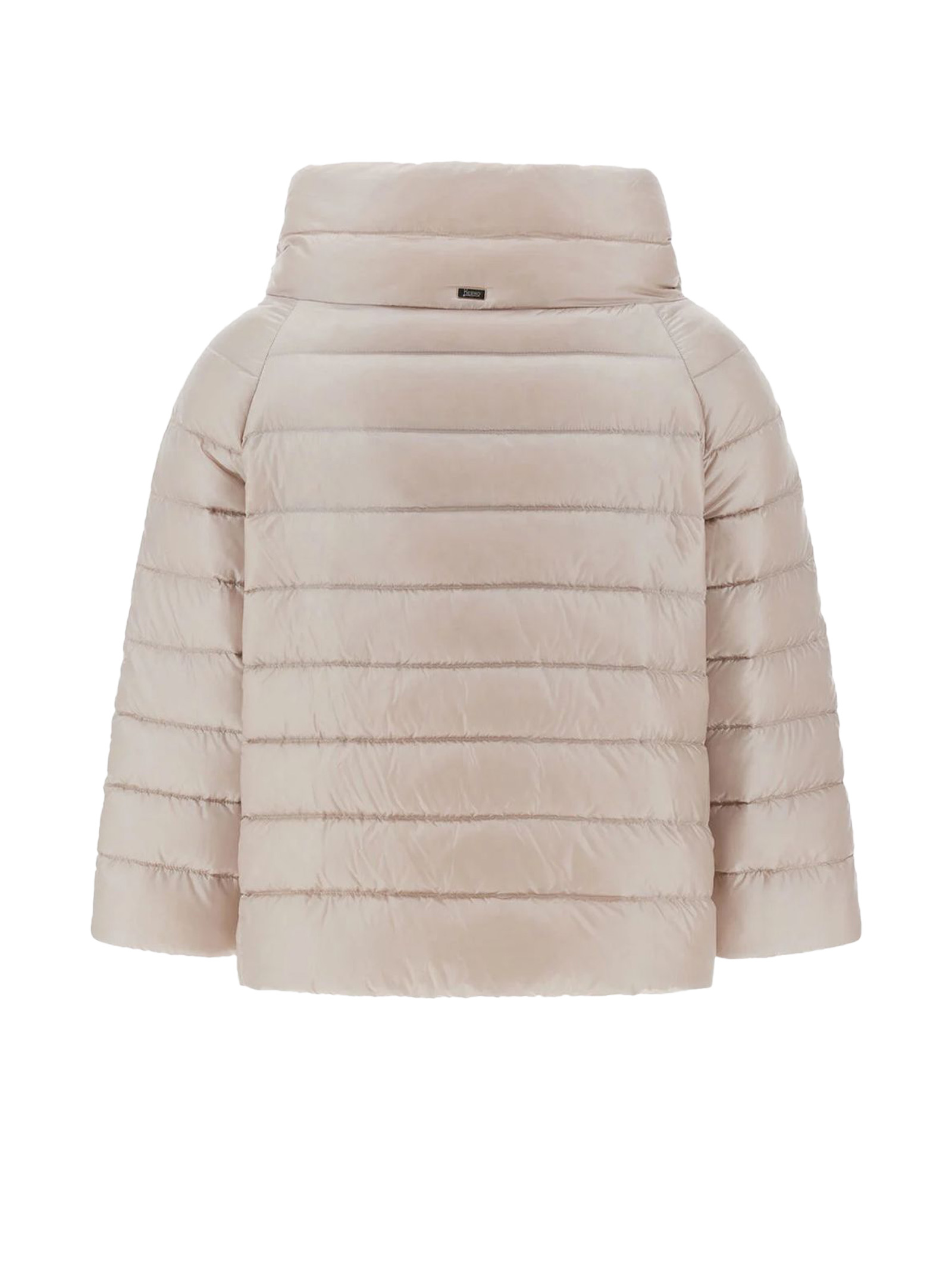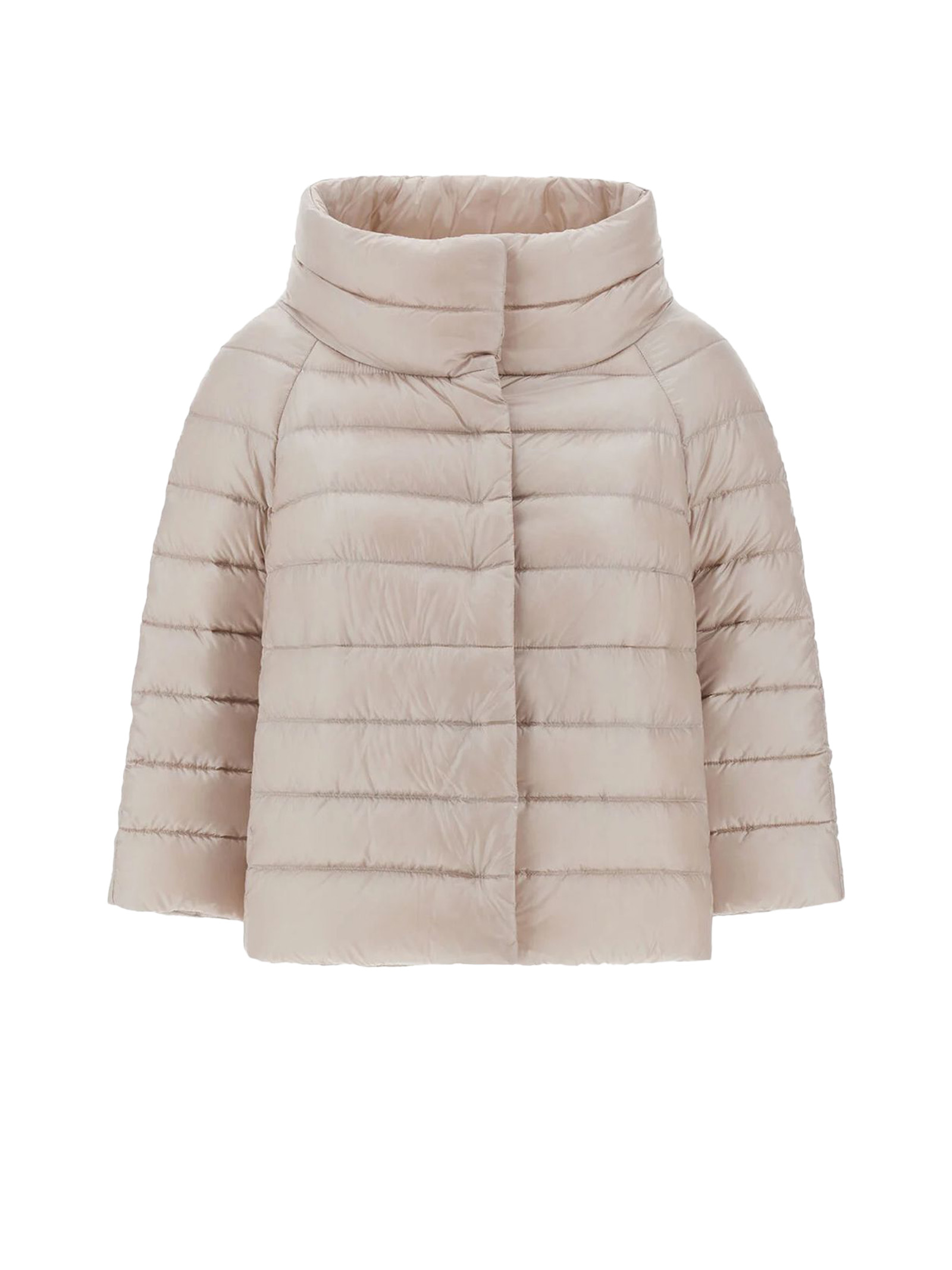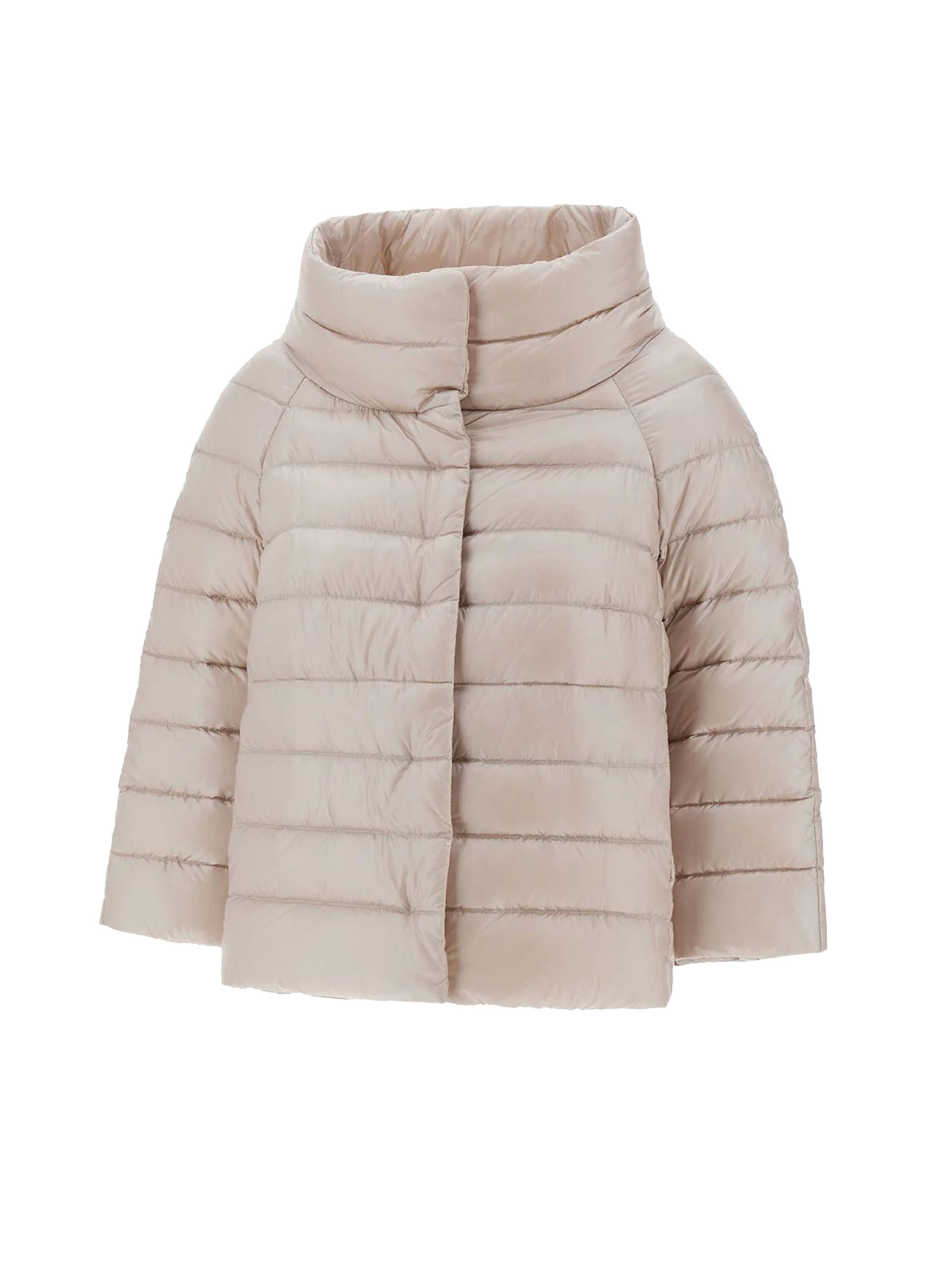 Mini cappa Sofia in Nylon Ultralight beige, Vestibilità regolare, Collo a cratere, Chiusura coperta con bottoni a pressione, Maniche a gioiello, Tasche a filetto, Imbottitura in piuma