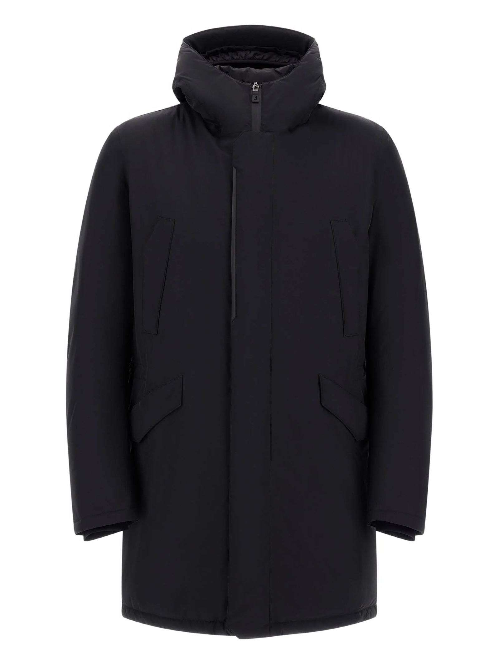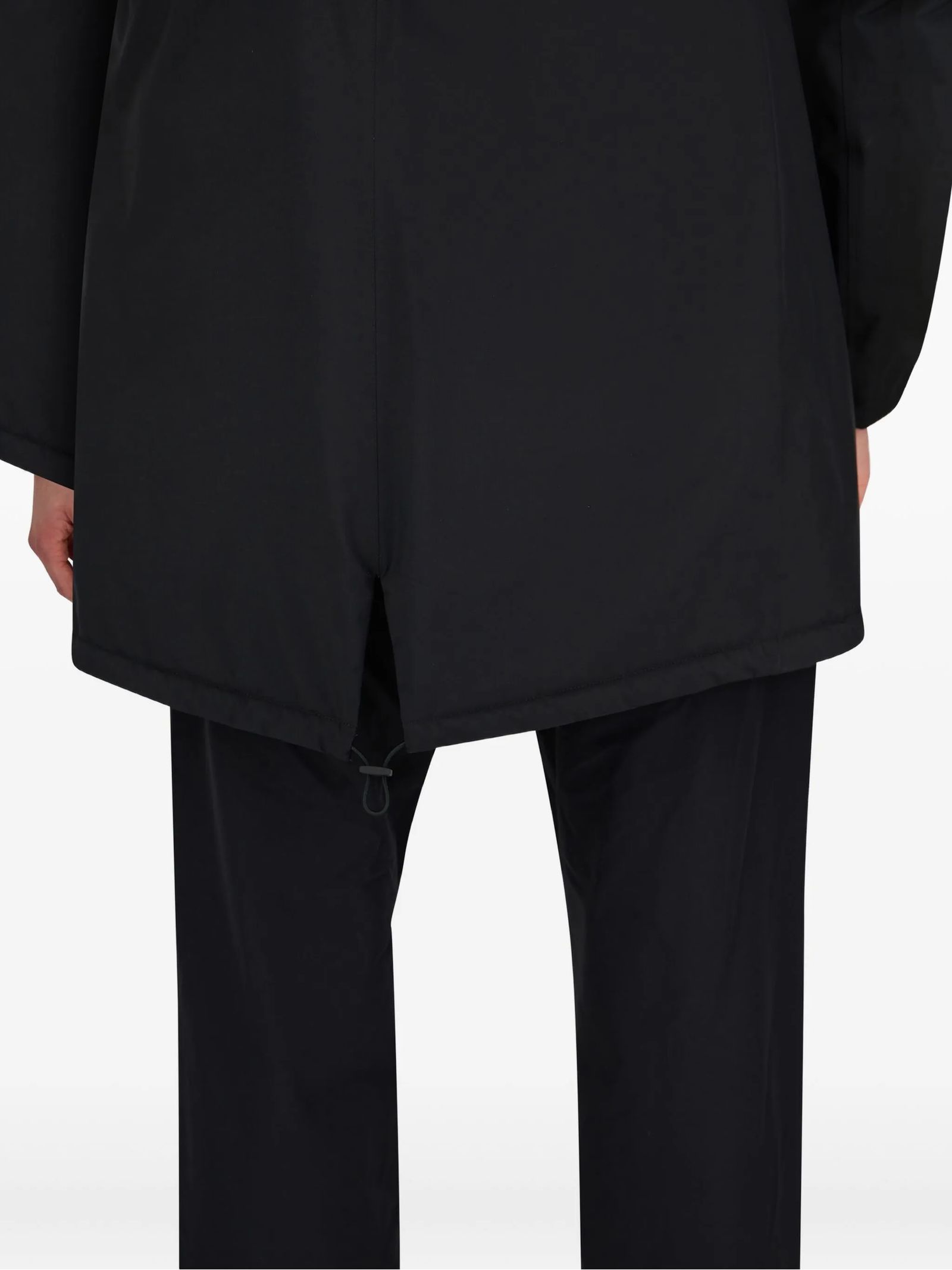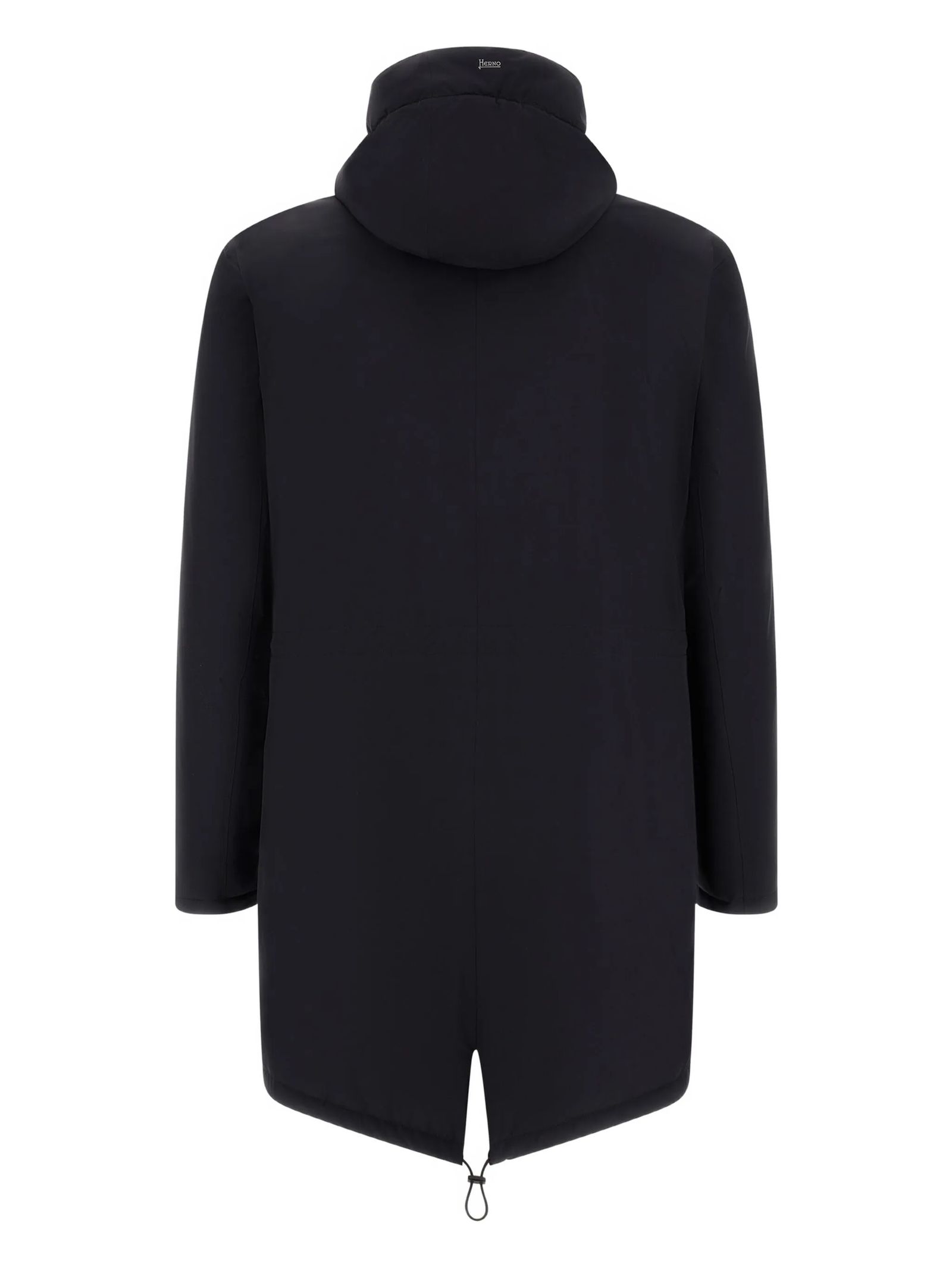 Parka nero con cappuccio, chiusura con zip, orlo con coulisse, due tasche a filetto, maniche lunghe, collo con cappuccio